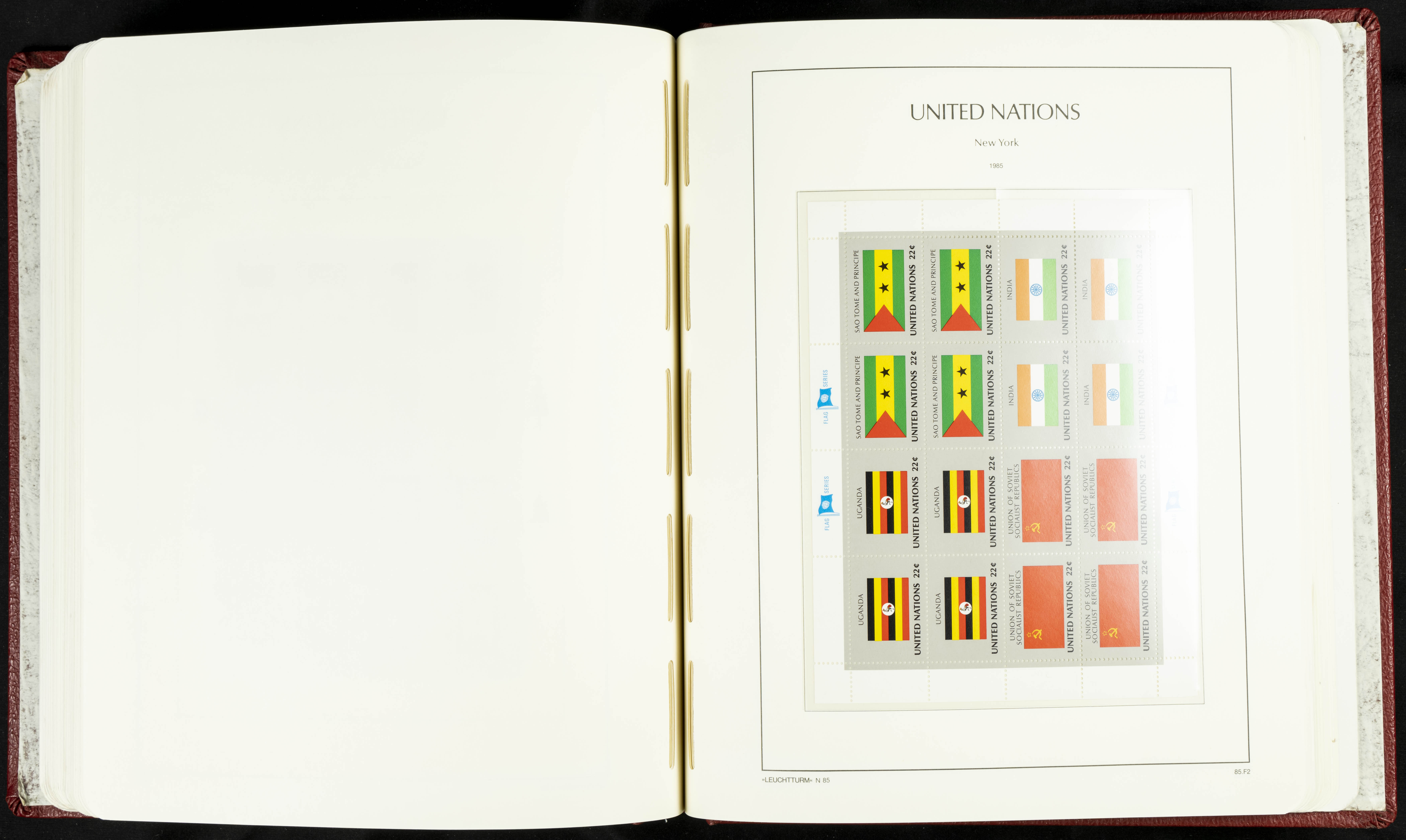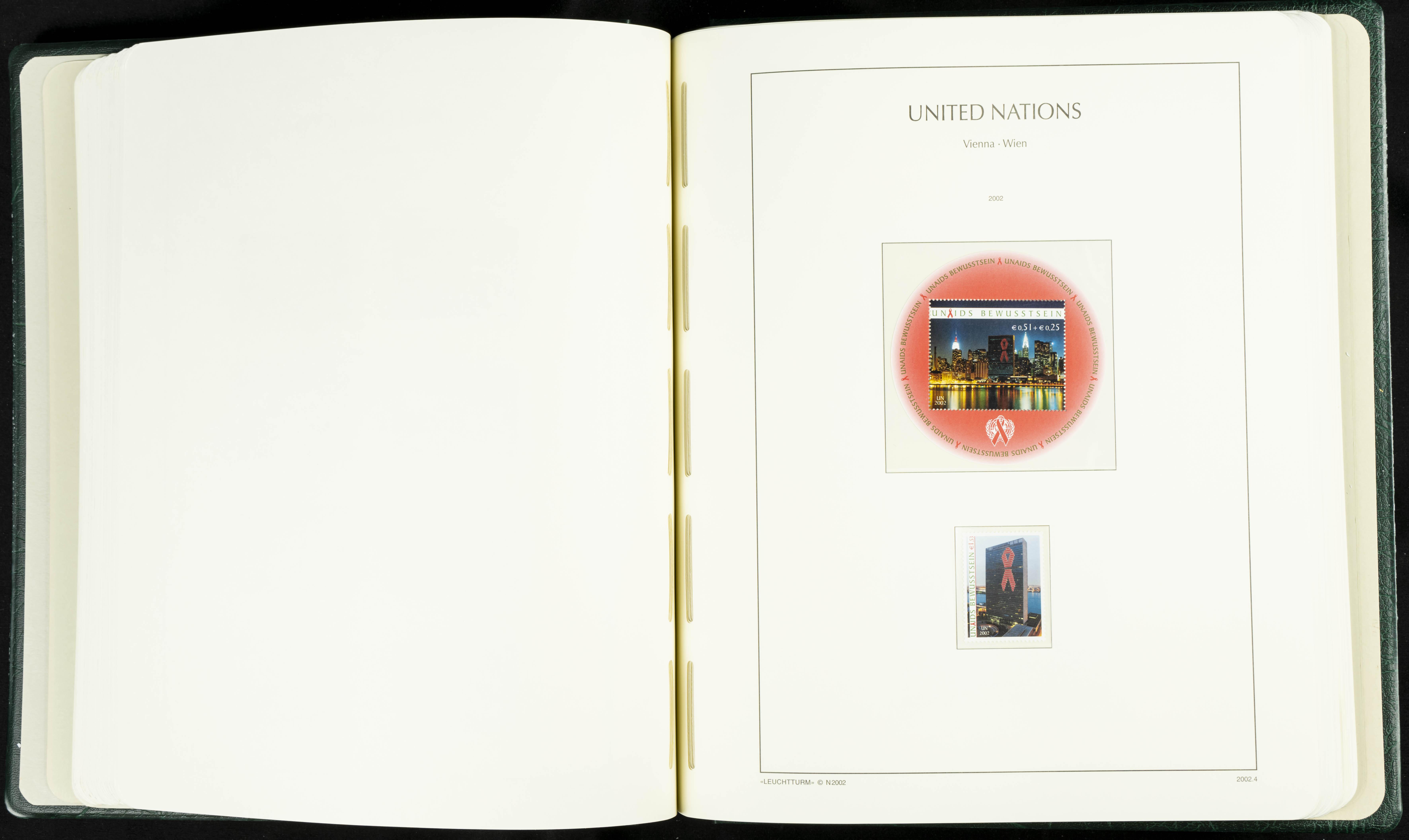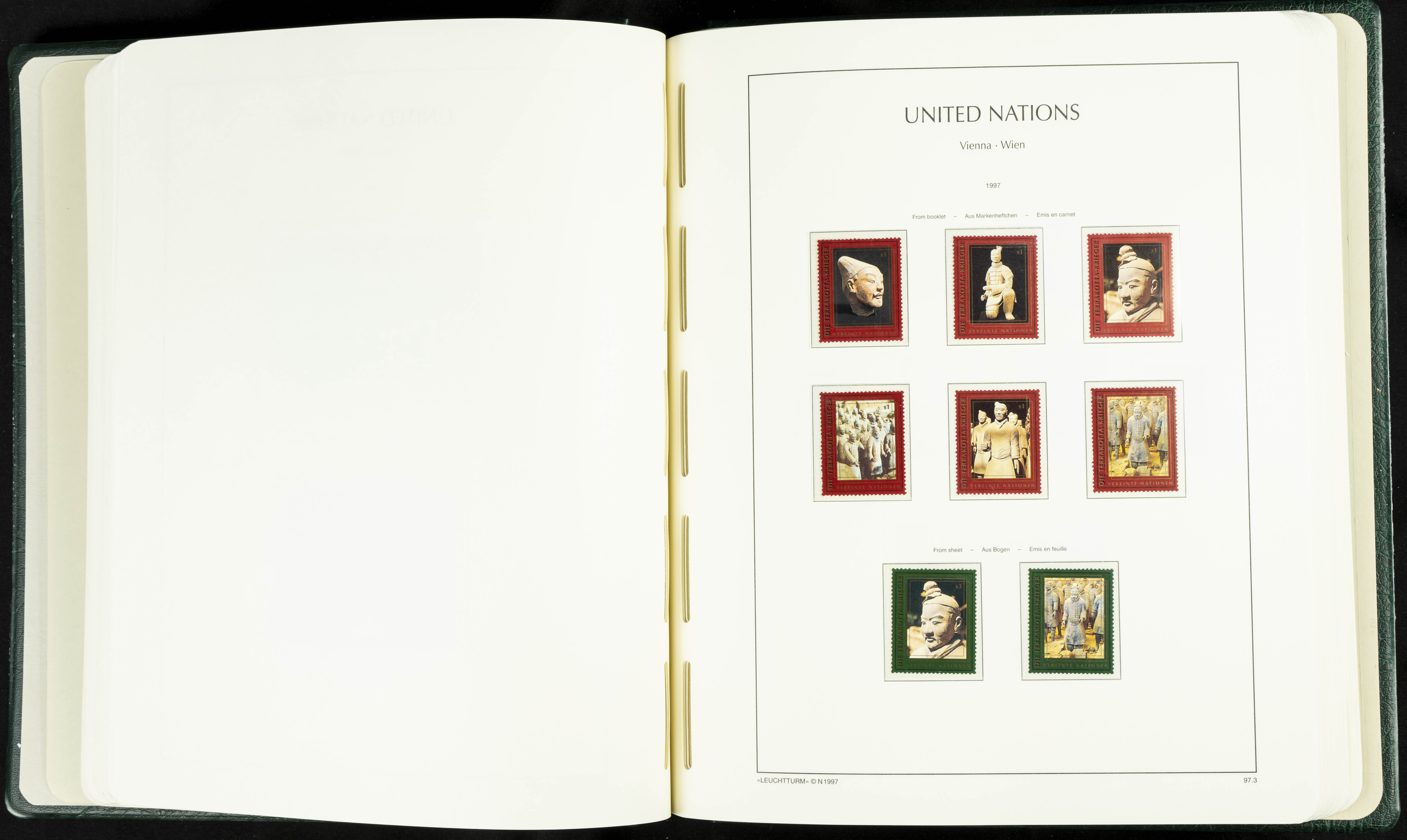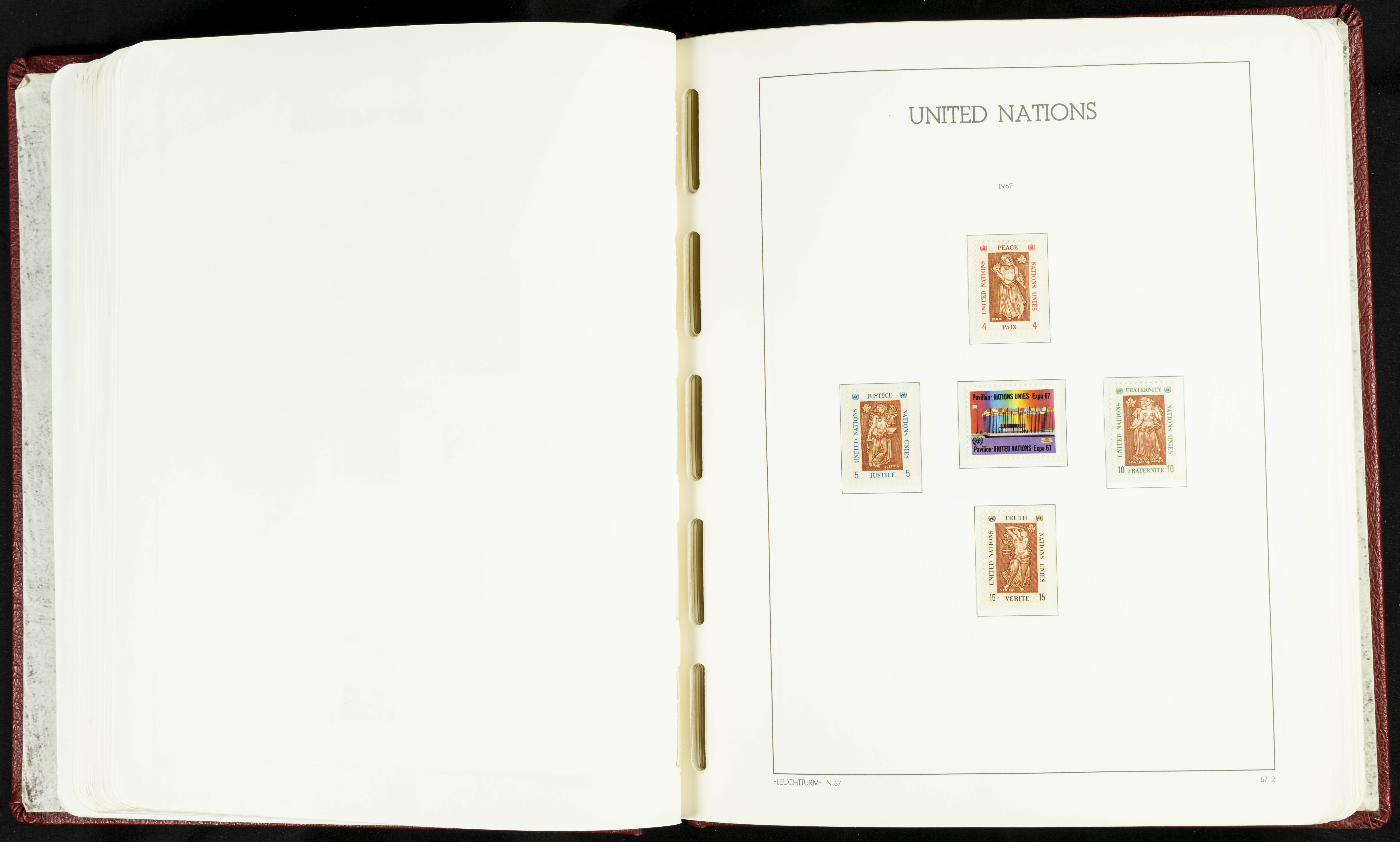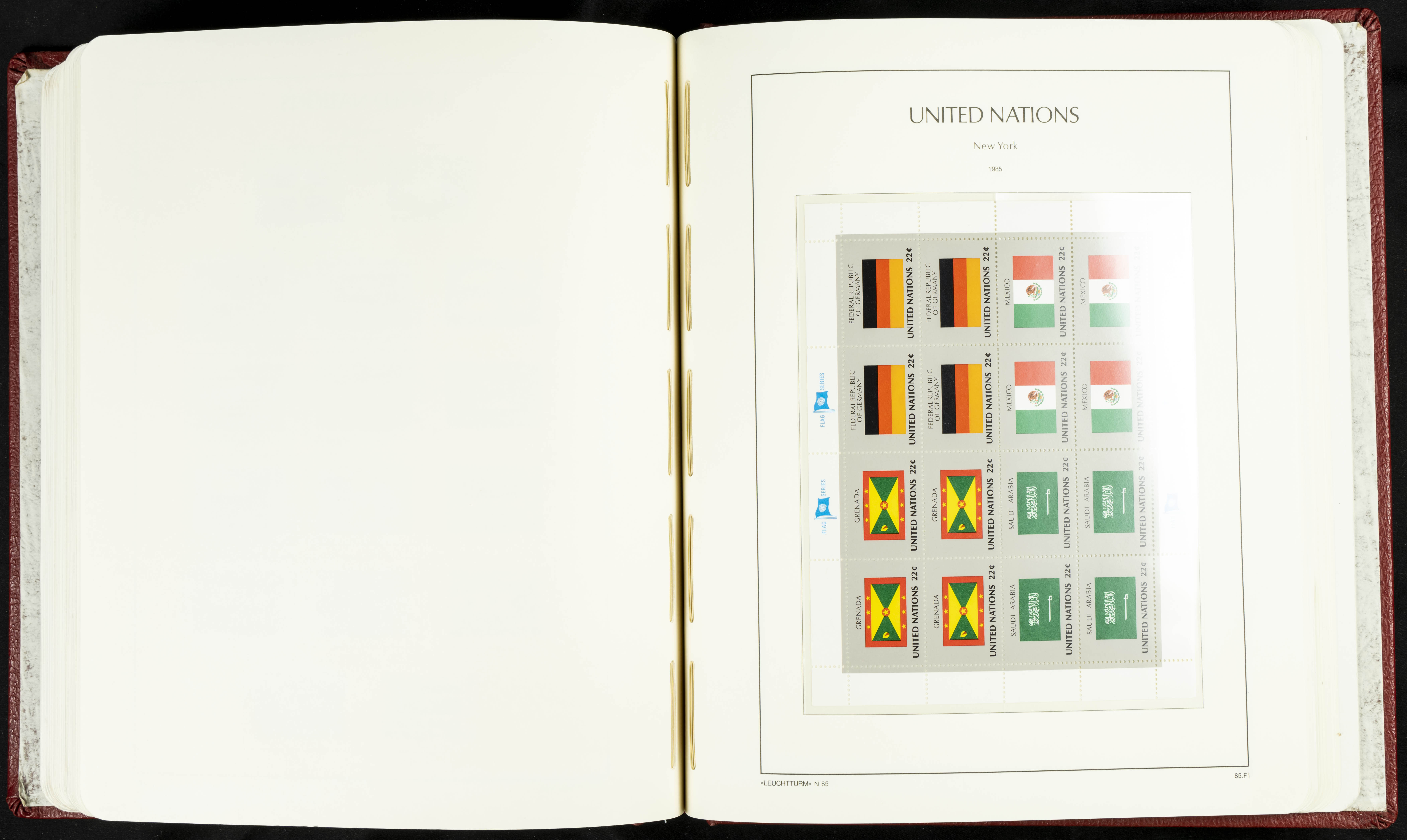 ★★(1951ca). Colección completa de Naciones Unidas (Nueva York, Ginebra y Viena) entre 1951 y 2011, en nuevo y sin fijasellos (montada en álbumes Faro). ALTO VALOR DE CATALOGO. A EXAMINAR.