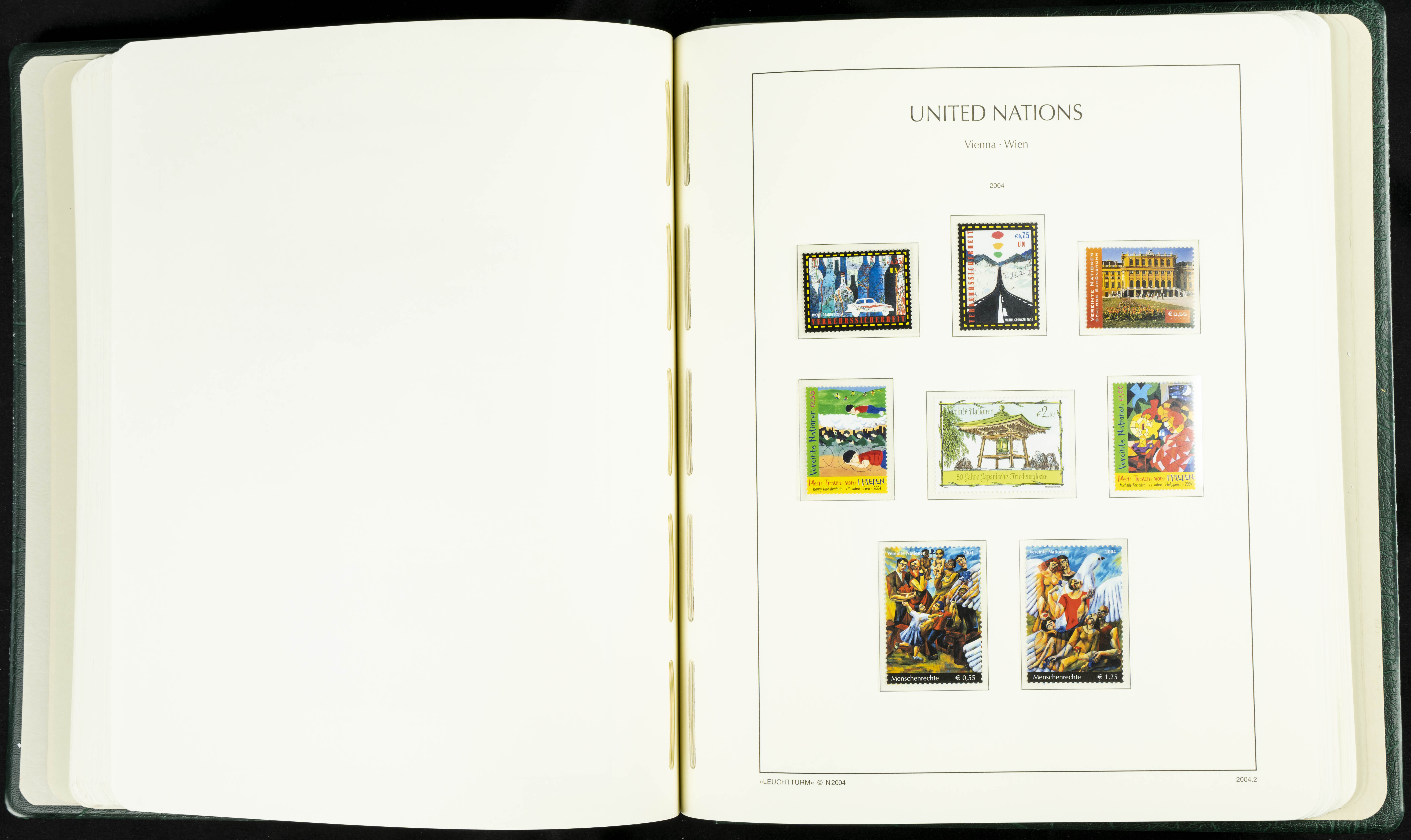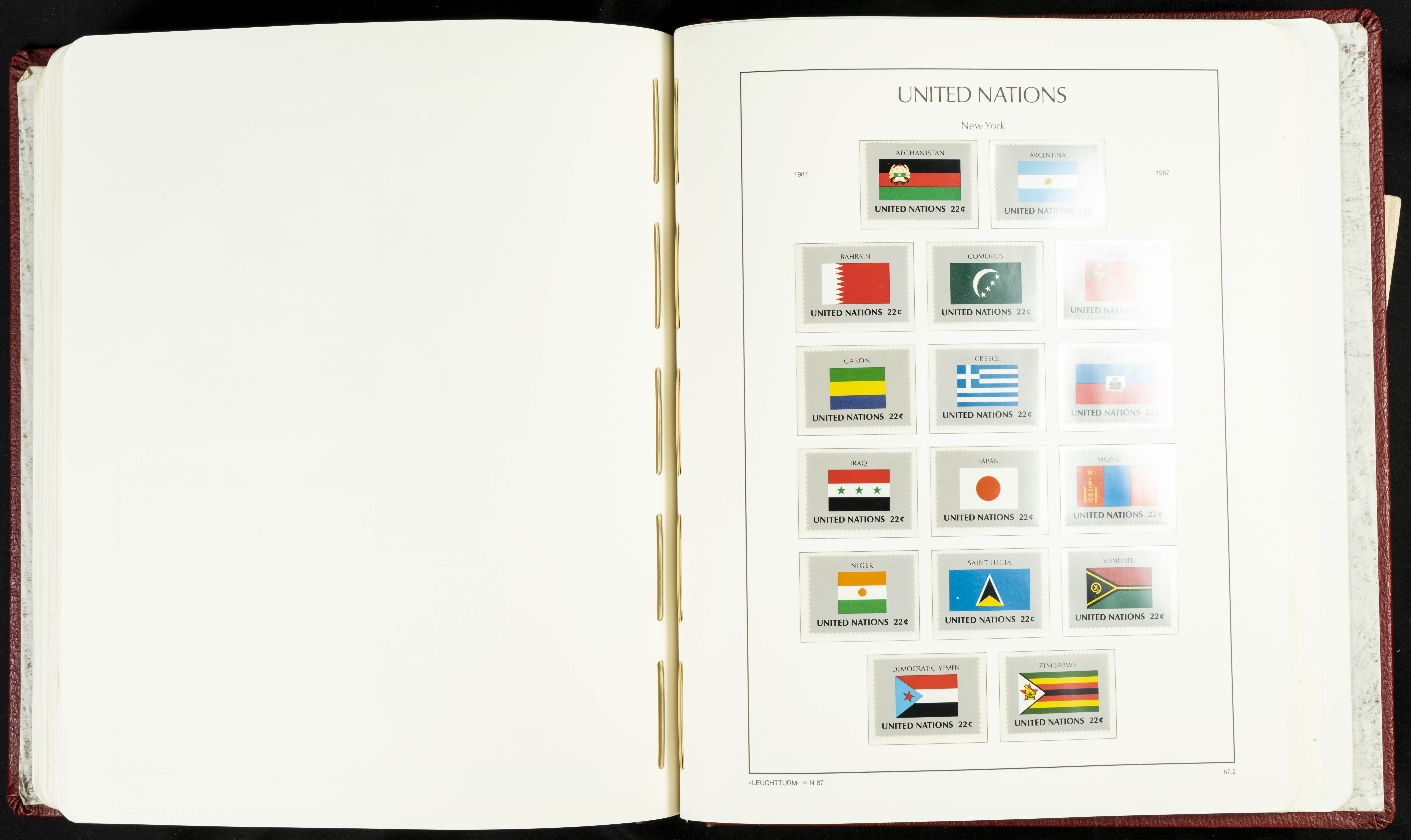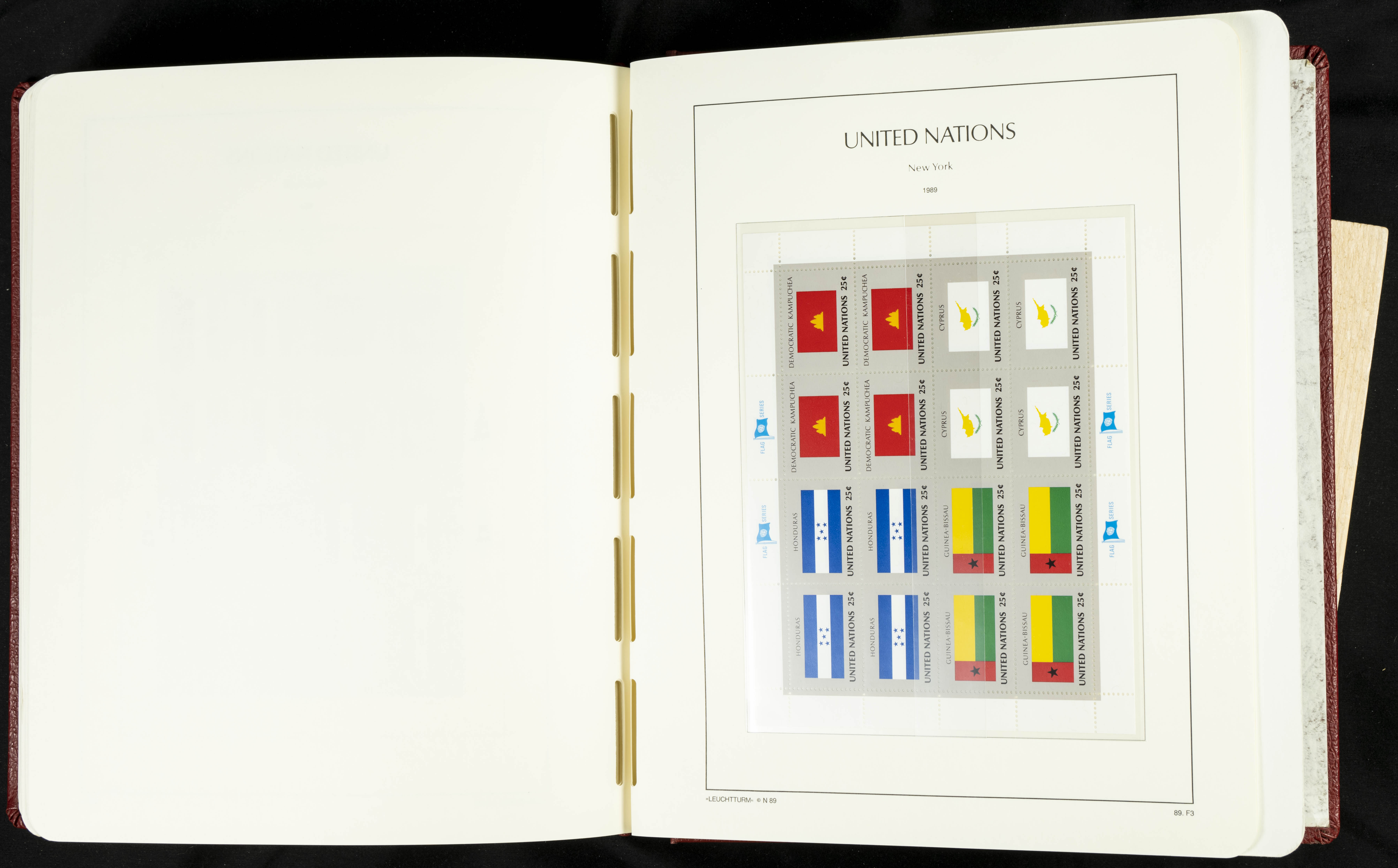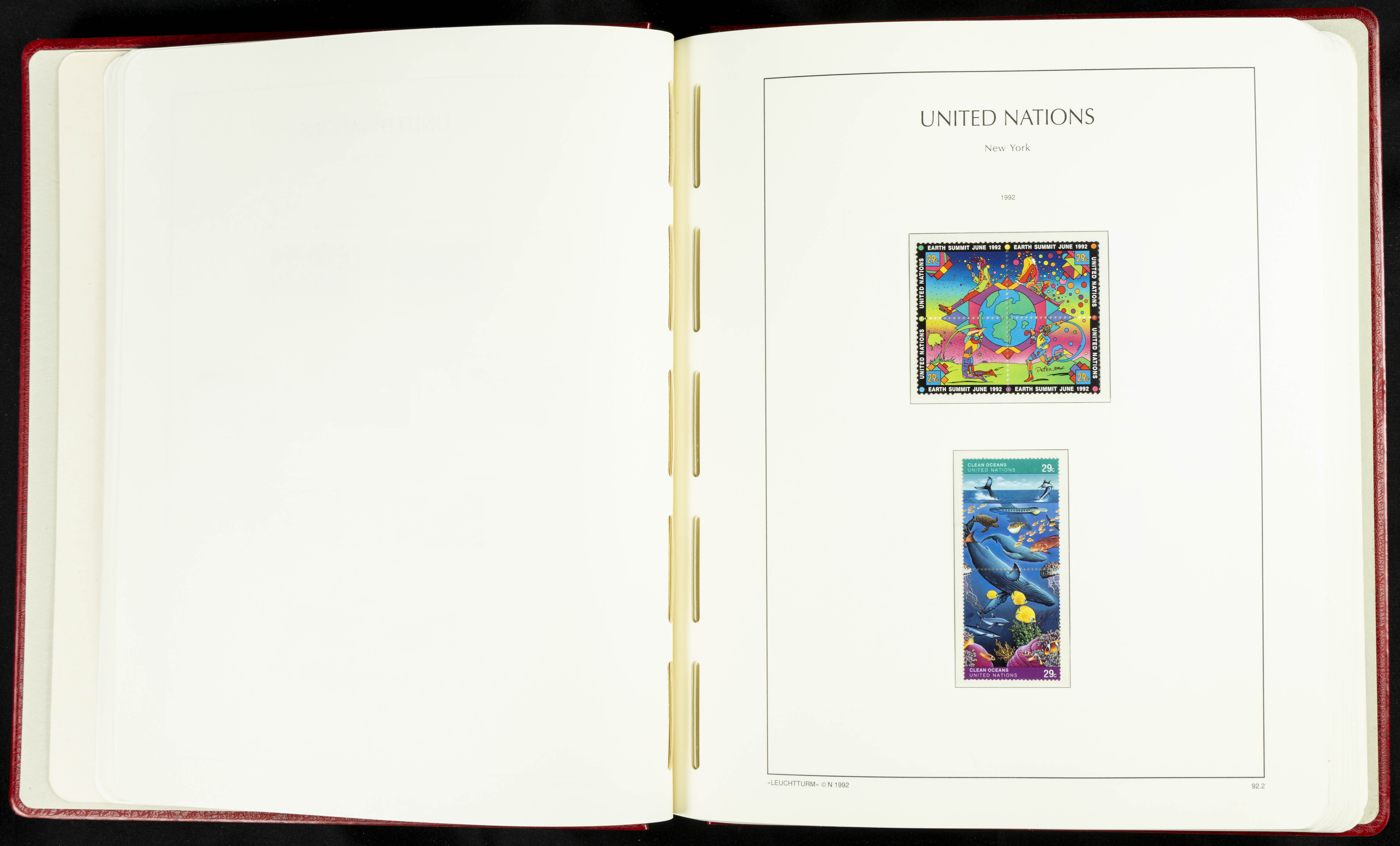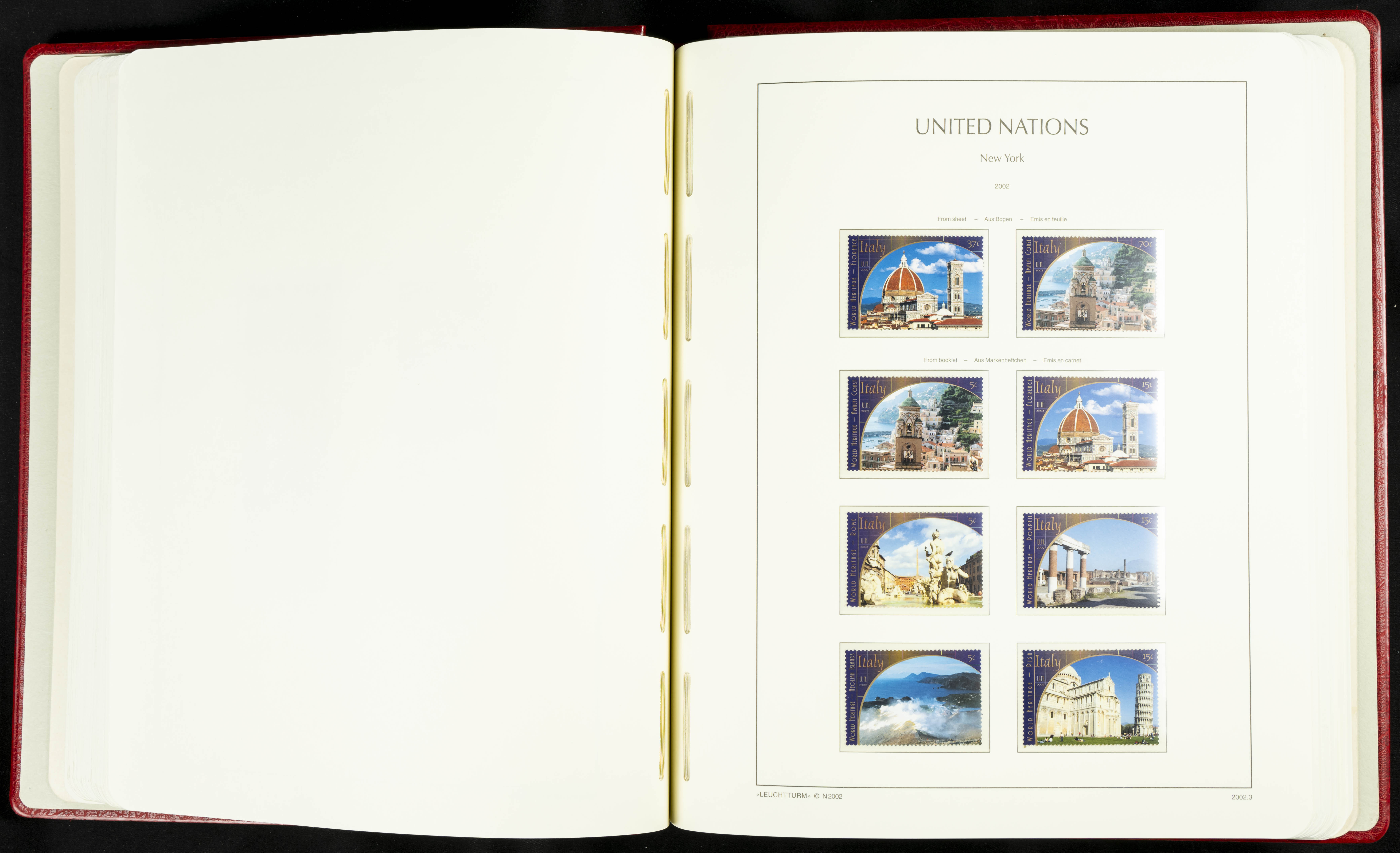 ★★(1951ca). Colección completa de Naciones Unidas (Nueva York, Ginebra y Viena) entre 1951 y 2011, en nuevo y sin fijasellos (montada en álbumes Faro). ALTO VALOR DE CATALOGO. A EXAMINAR.