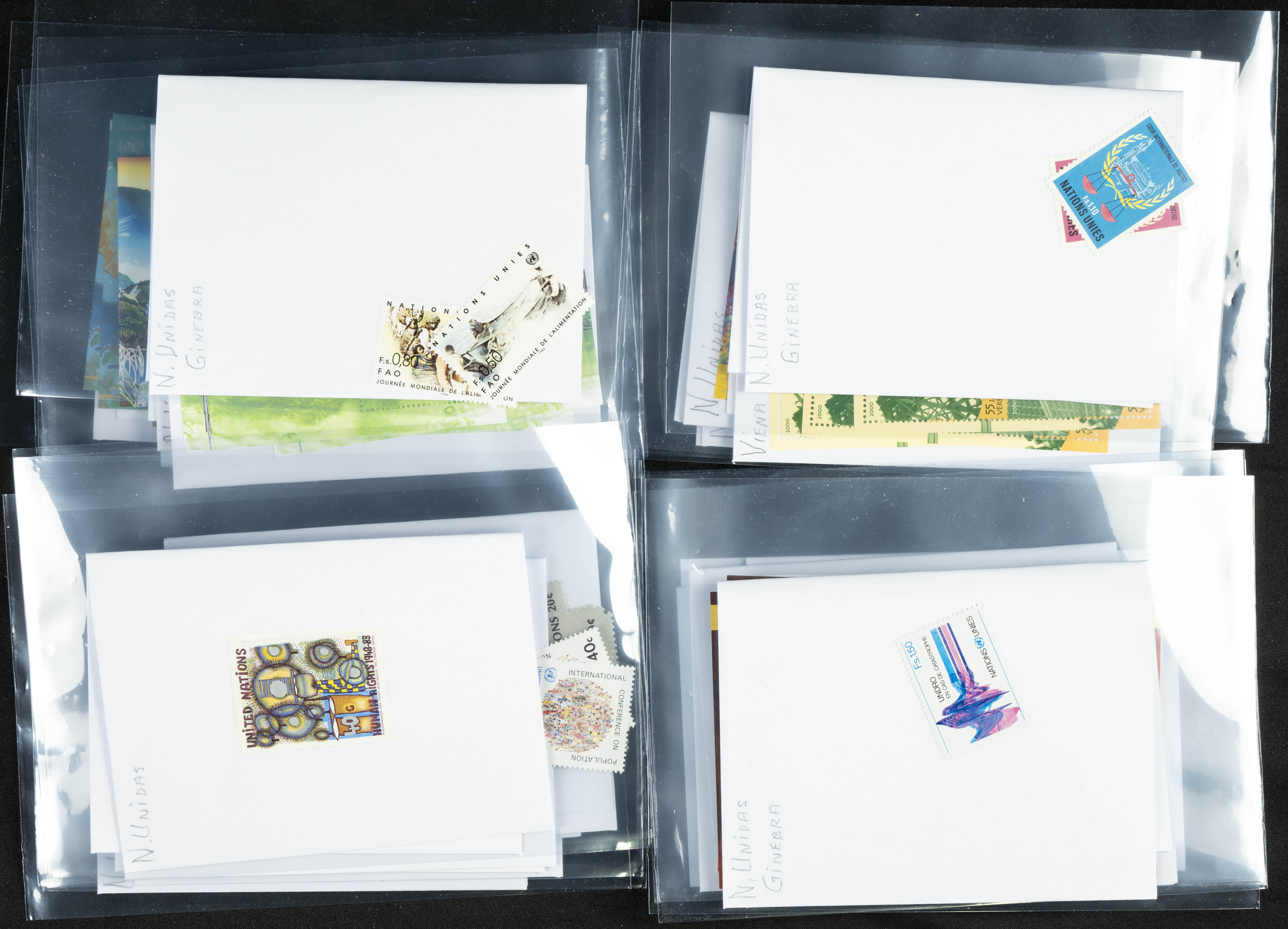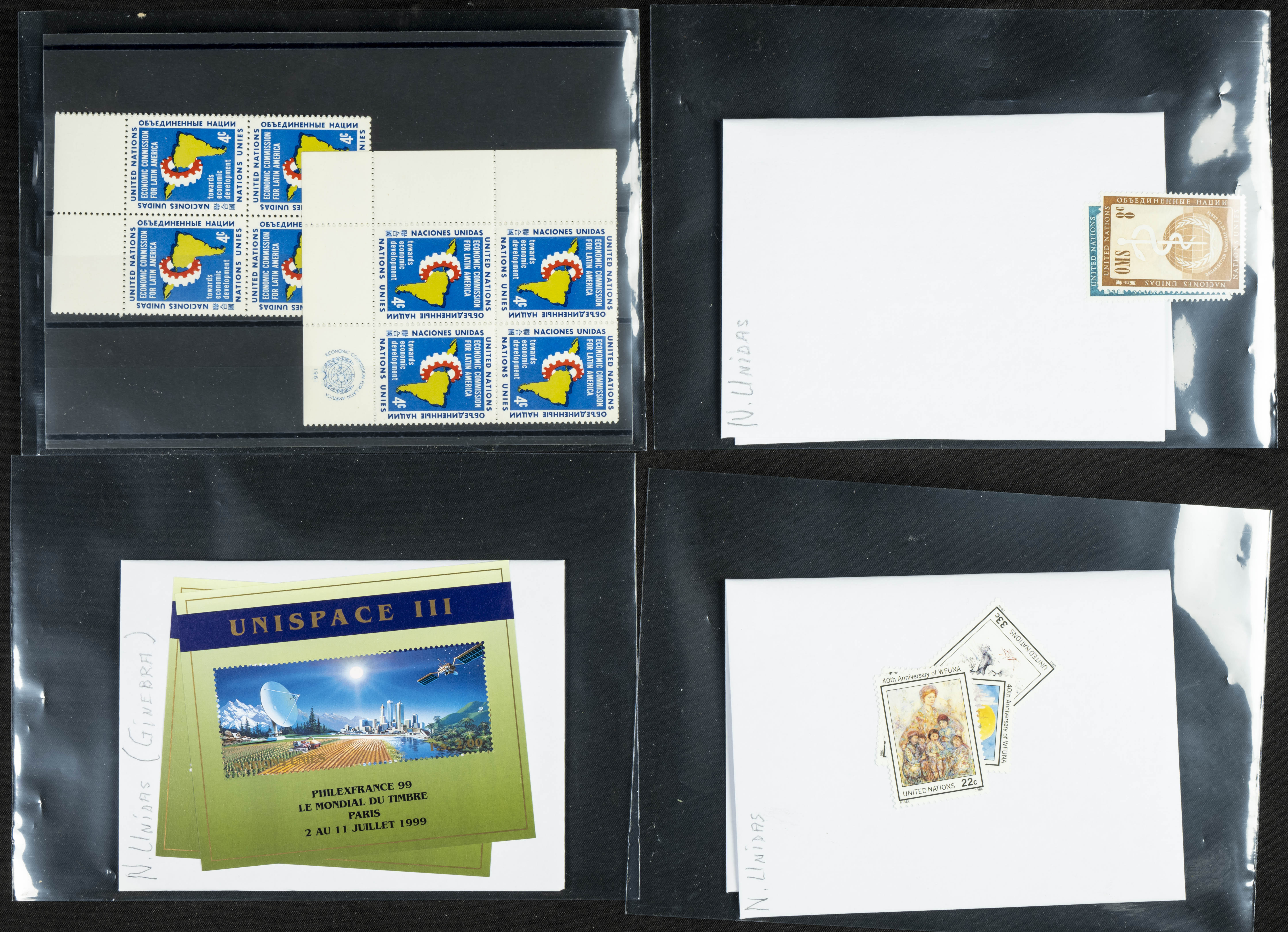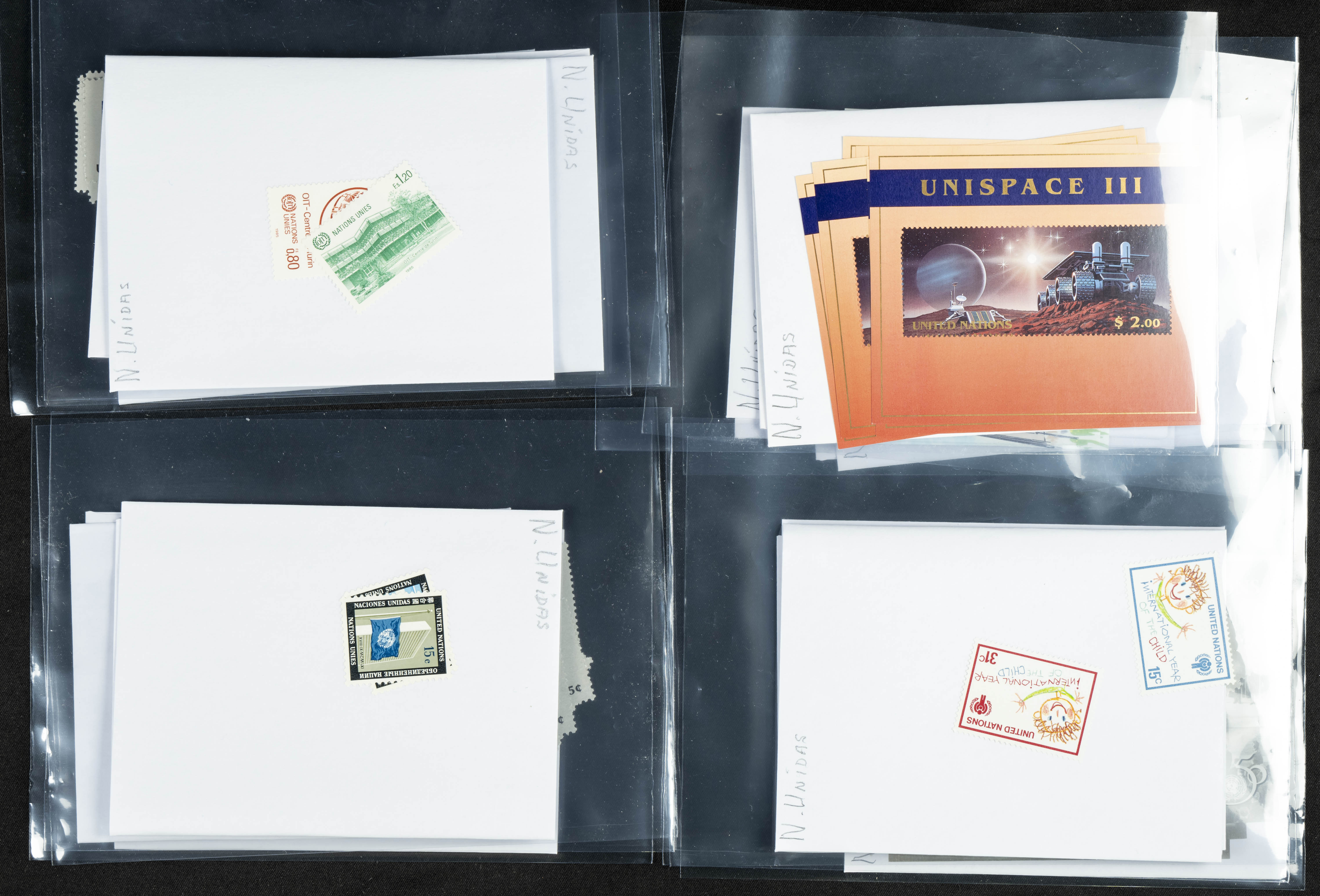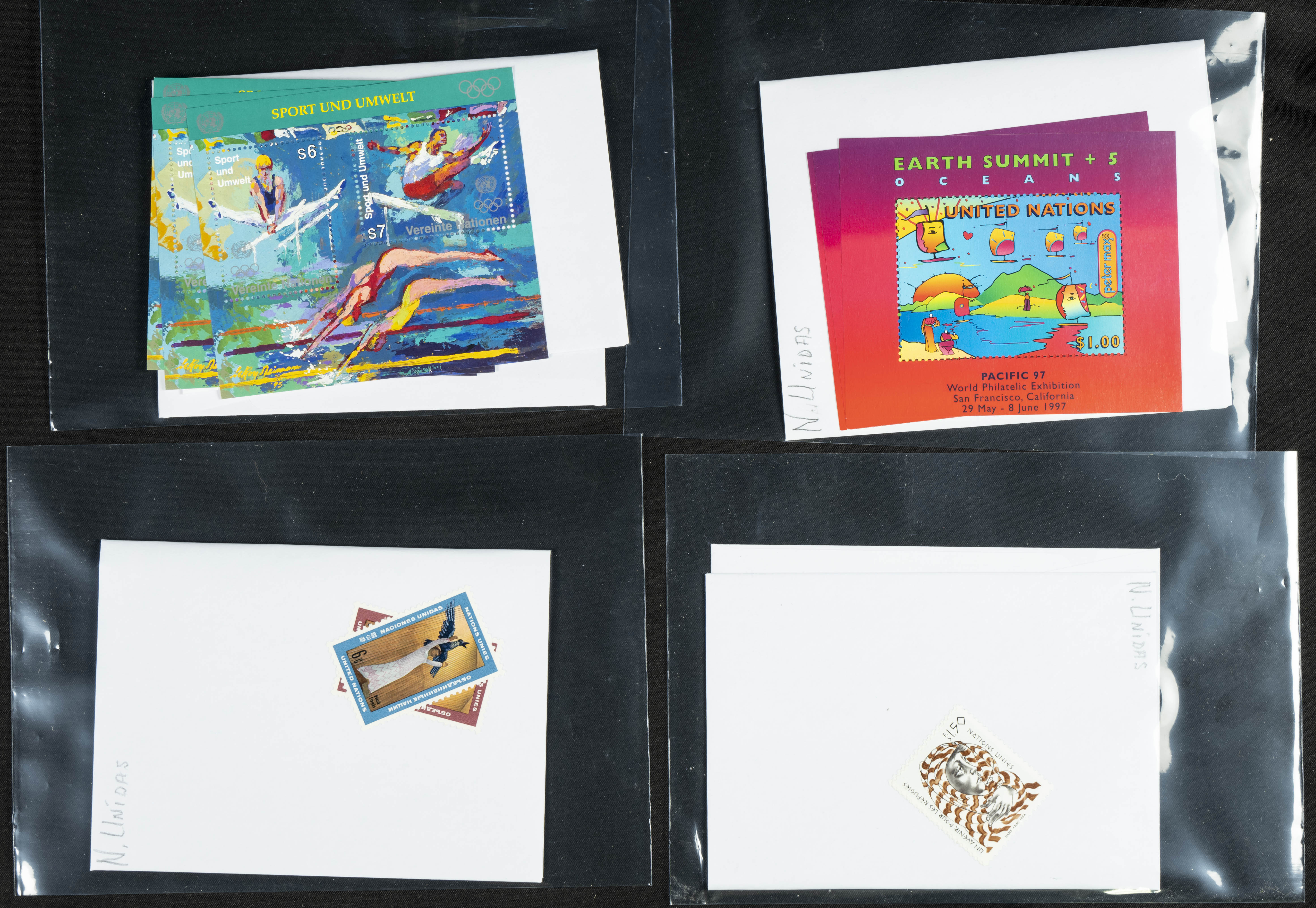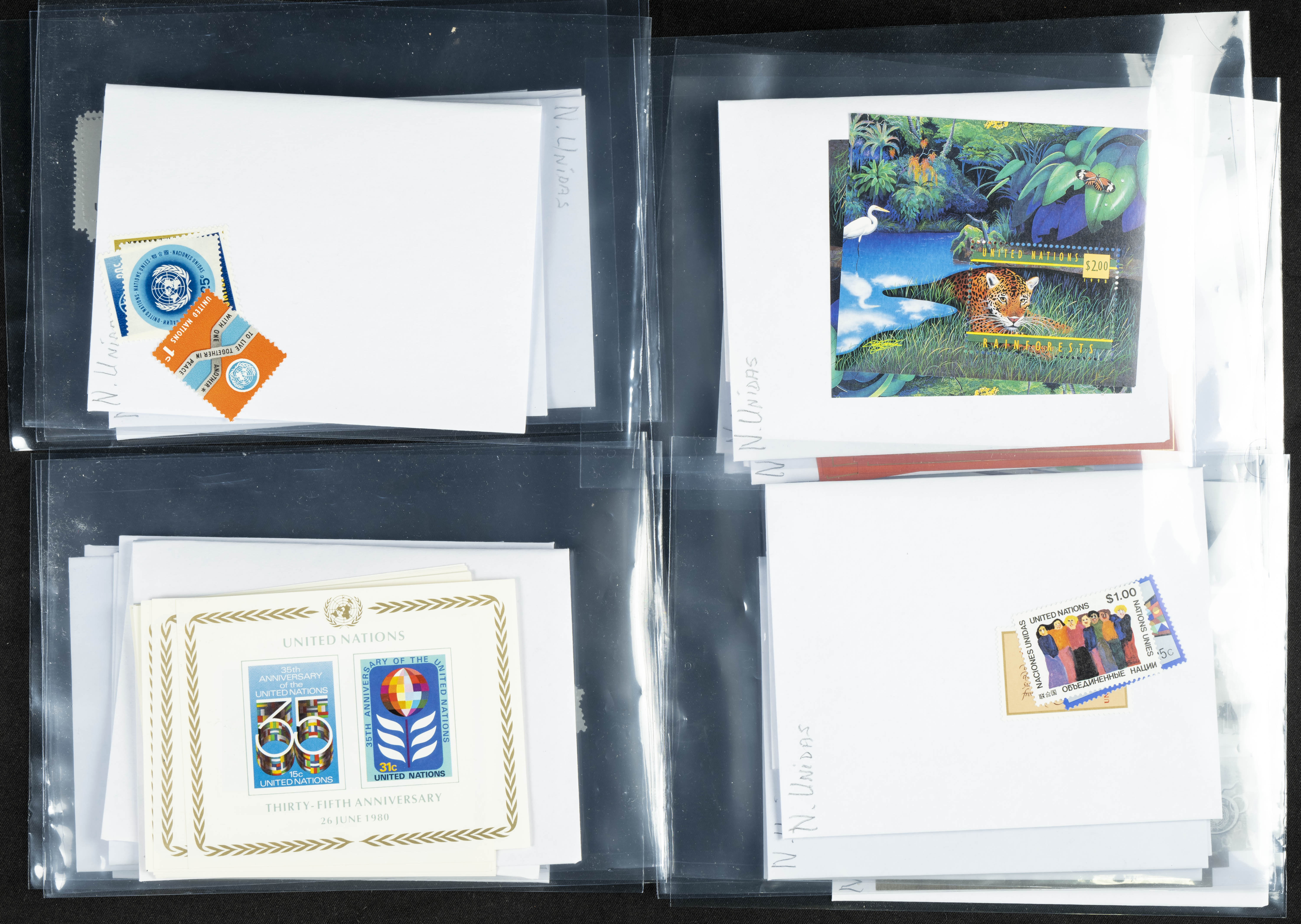 ★★(1951ca). Interesante conjunto-stock de Naciones Unidas (Nueva York, Ginebra y Viena) entre 1951 y 1997, en nuevo y con numerosas repeticiones en algunas series (hasta ciento sesenta series en algún caso), incluye hojas bloque y minihojas, además de varios cientos de Sobres de Primer Día. ALTISIMO VALOR DE CATALOGO. A EXAMINAR.
