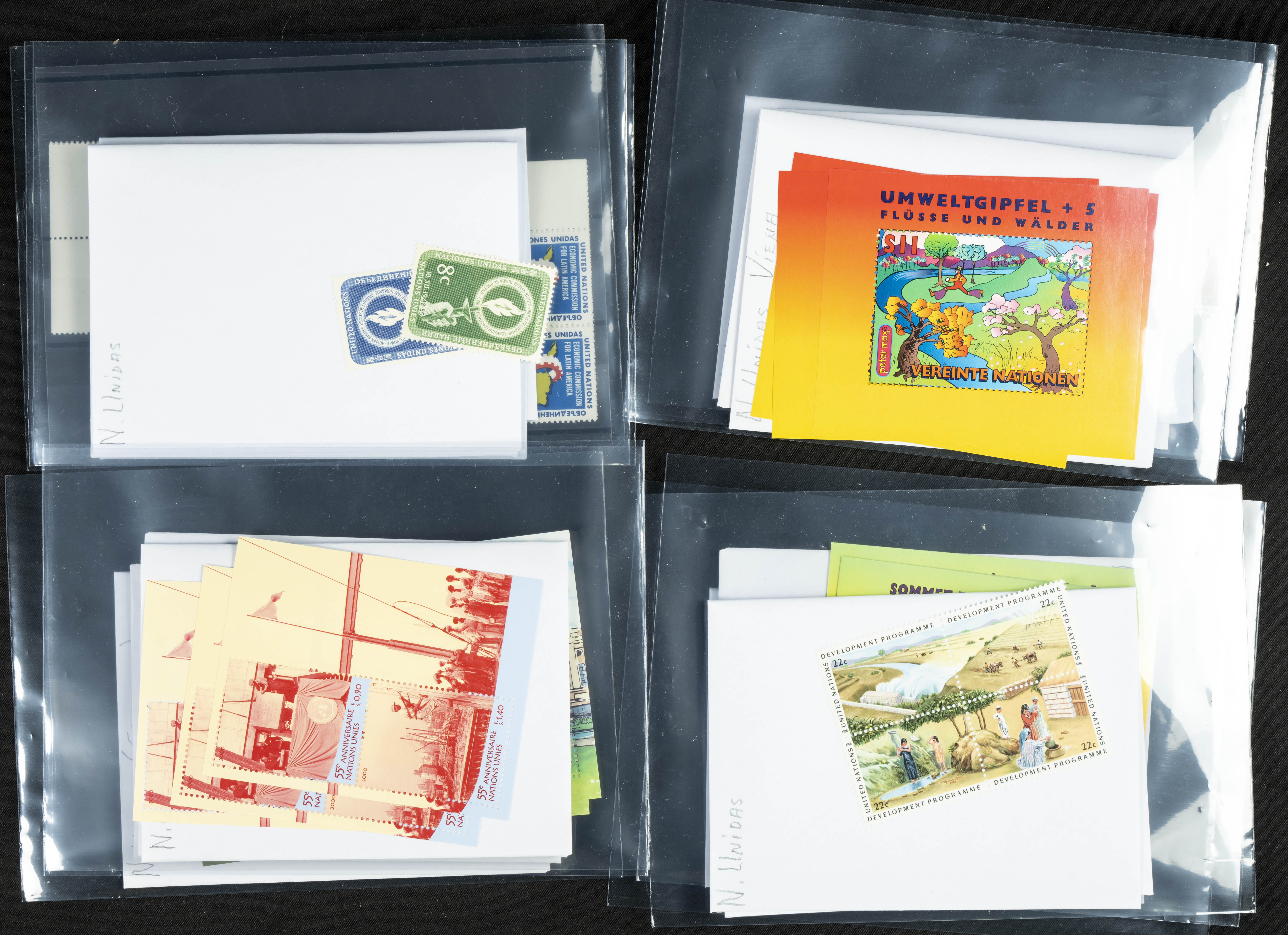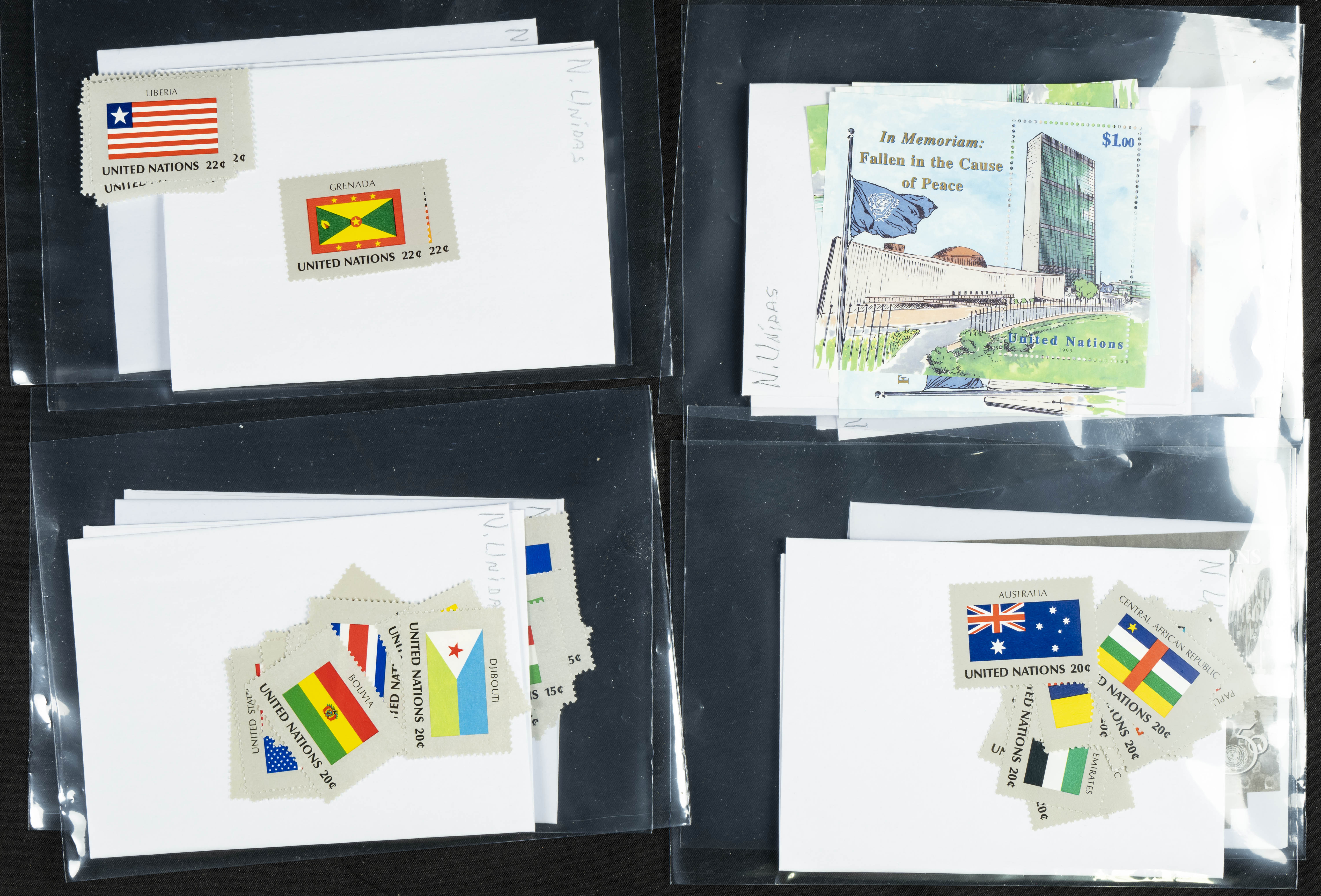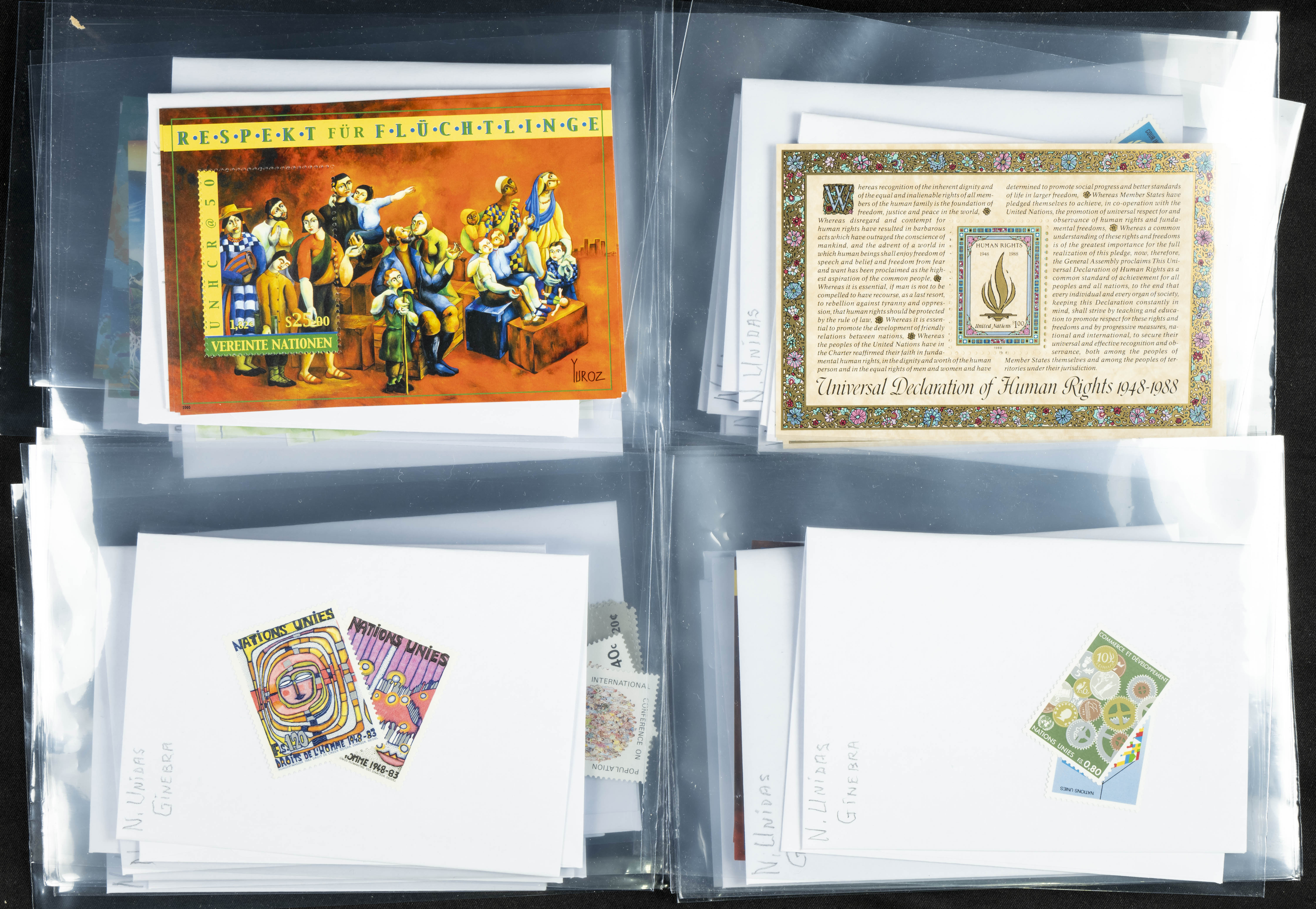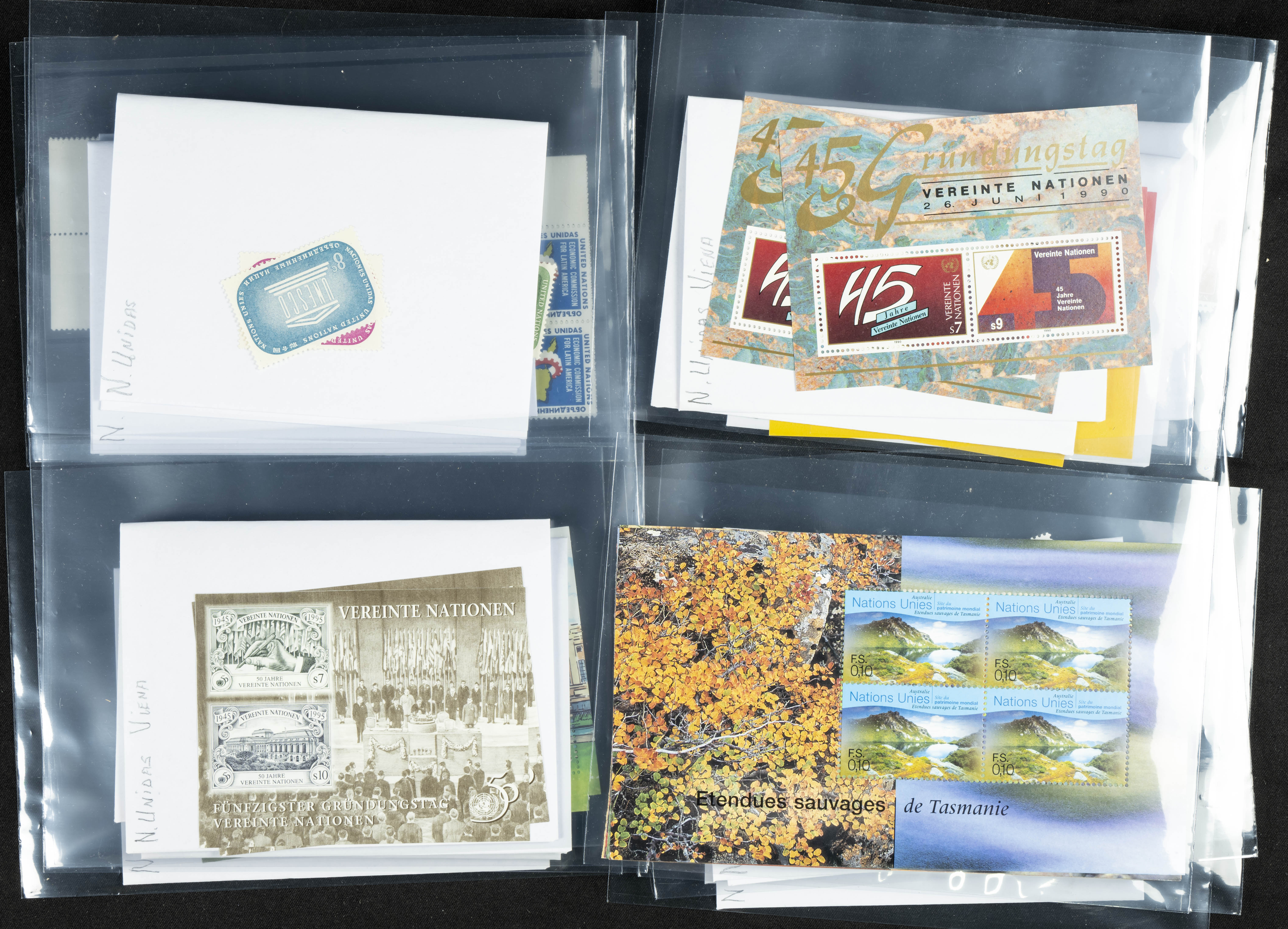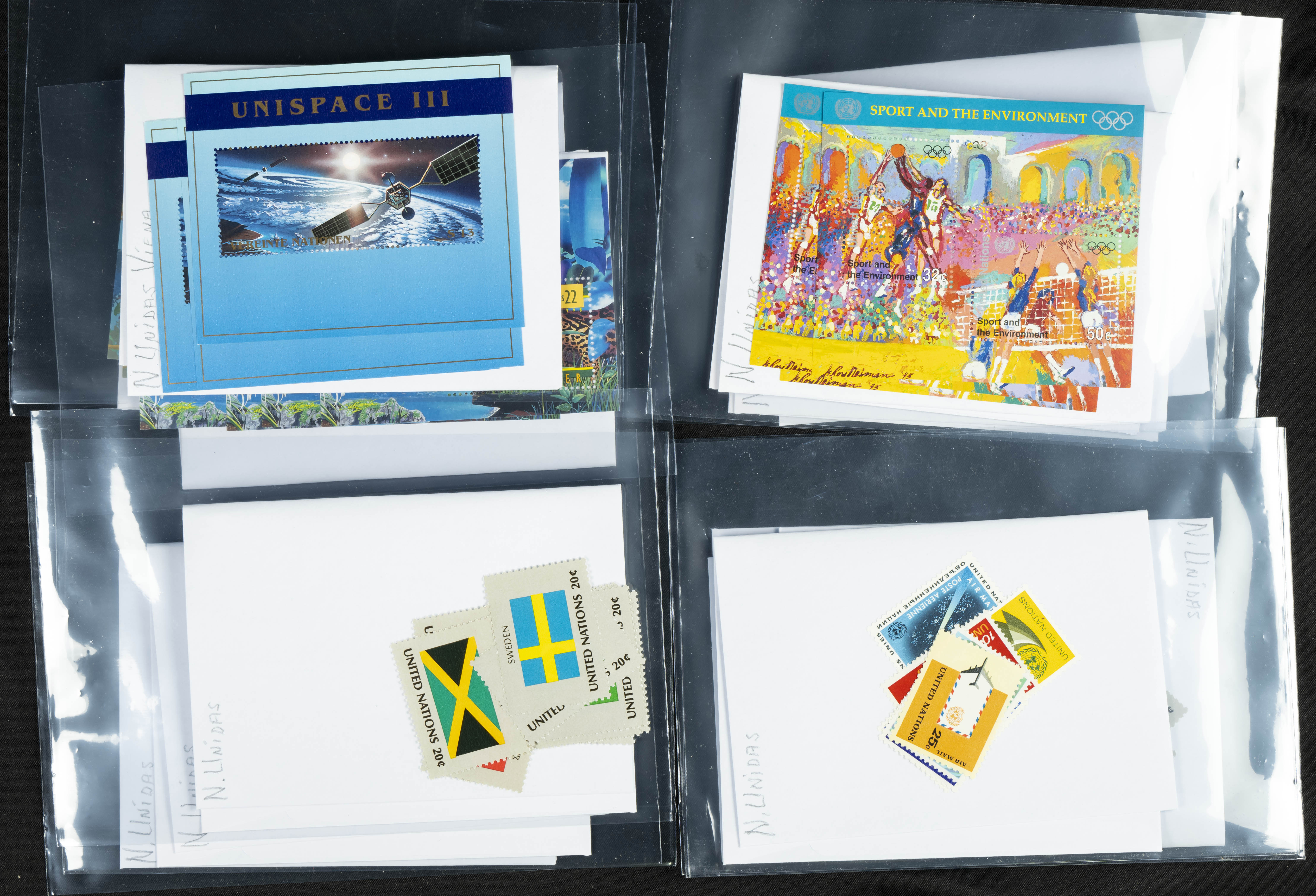 ★★(1951ca). Interesante conjunto-stock de Naciones Unidas (Nueva York, Ginebra y Viena) entre 1951 y 1997, en nuevo y con numerosas repeticiones en algunas series (hasta ciento sesenta series en algún caso), incluye hojas bloque y minihojas, además de varios cientos de Sobres de Primer Día. ALTISIMO VALOR DE CATALOGO. A EXAMINAR.