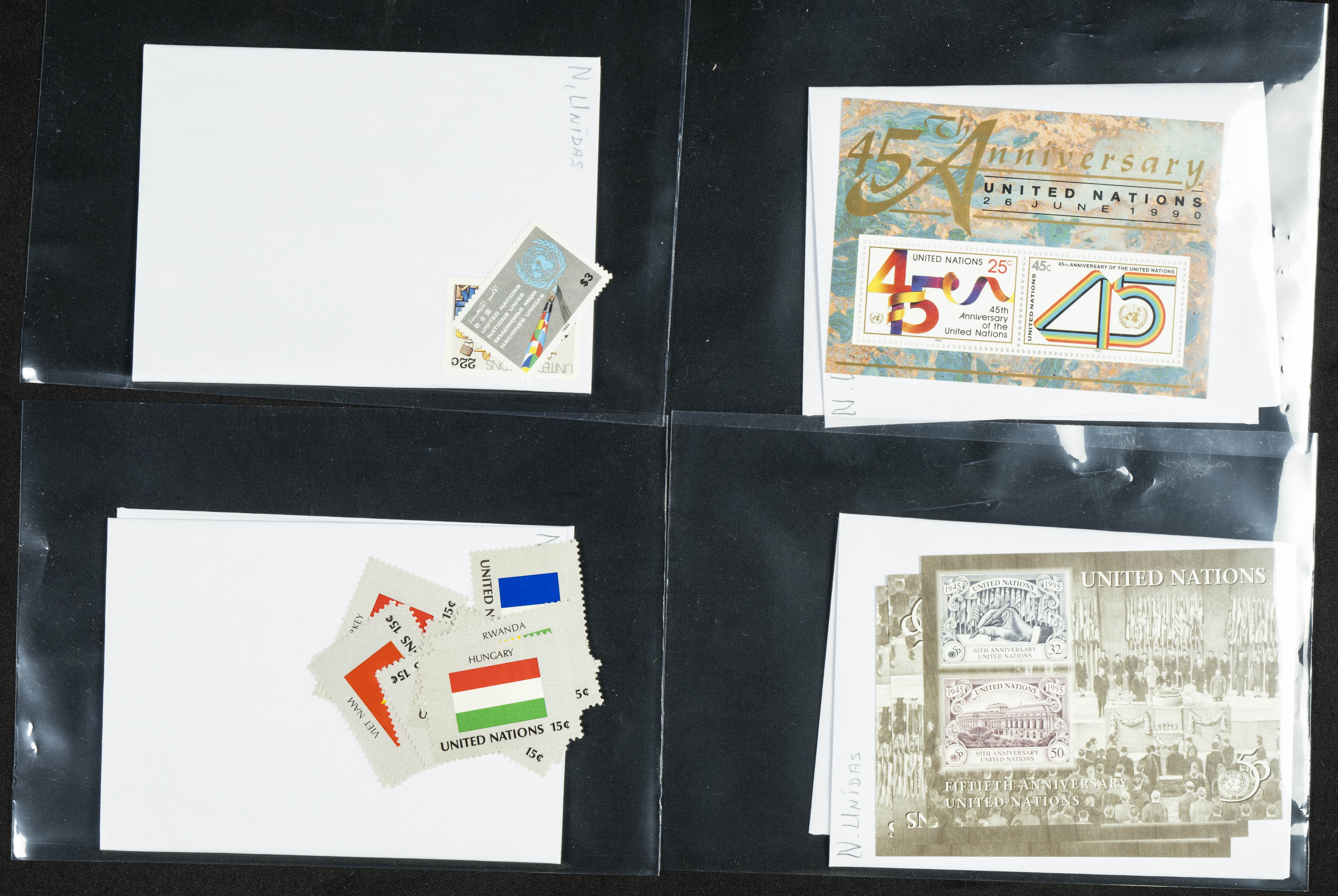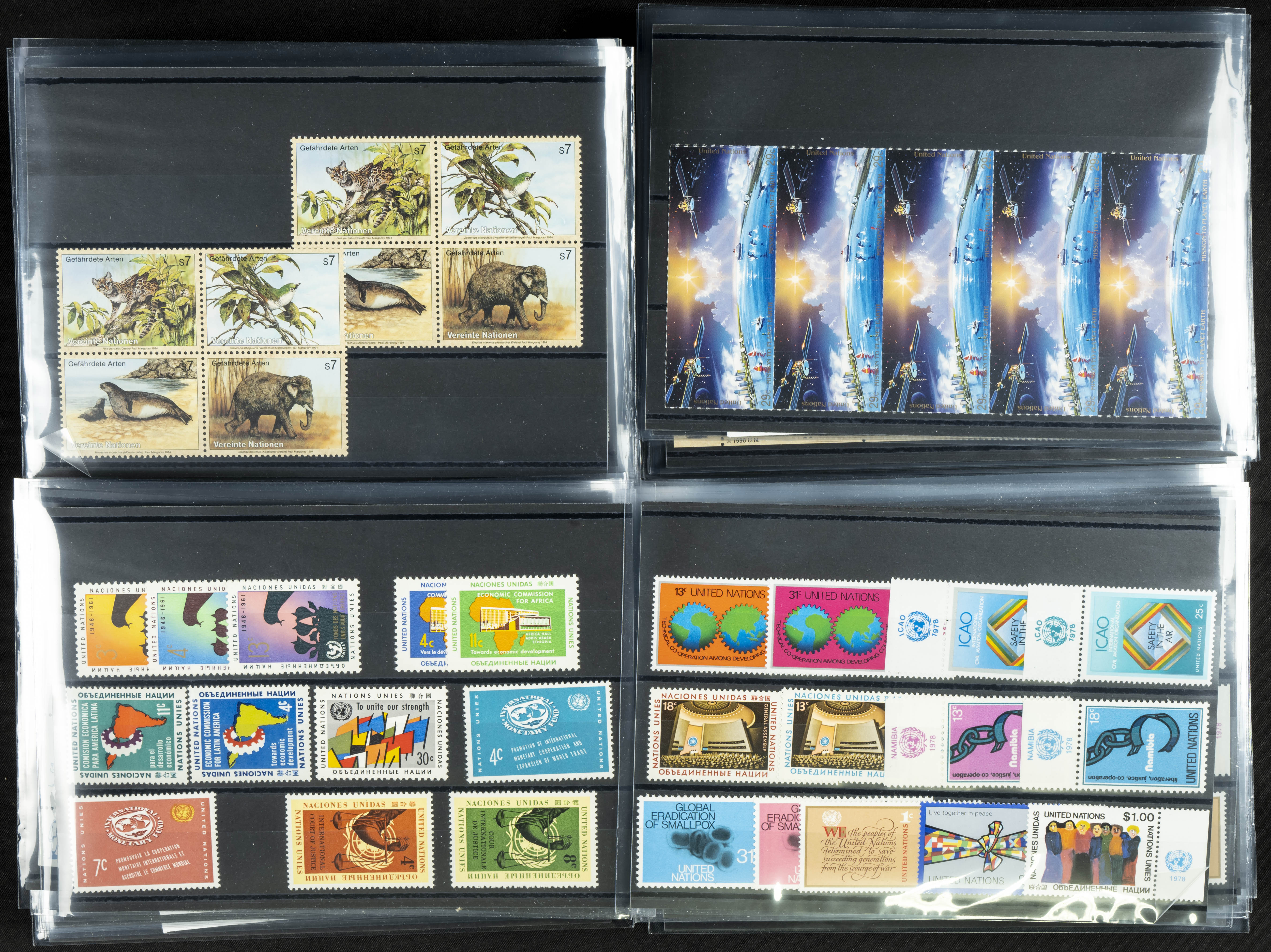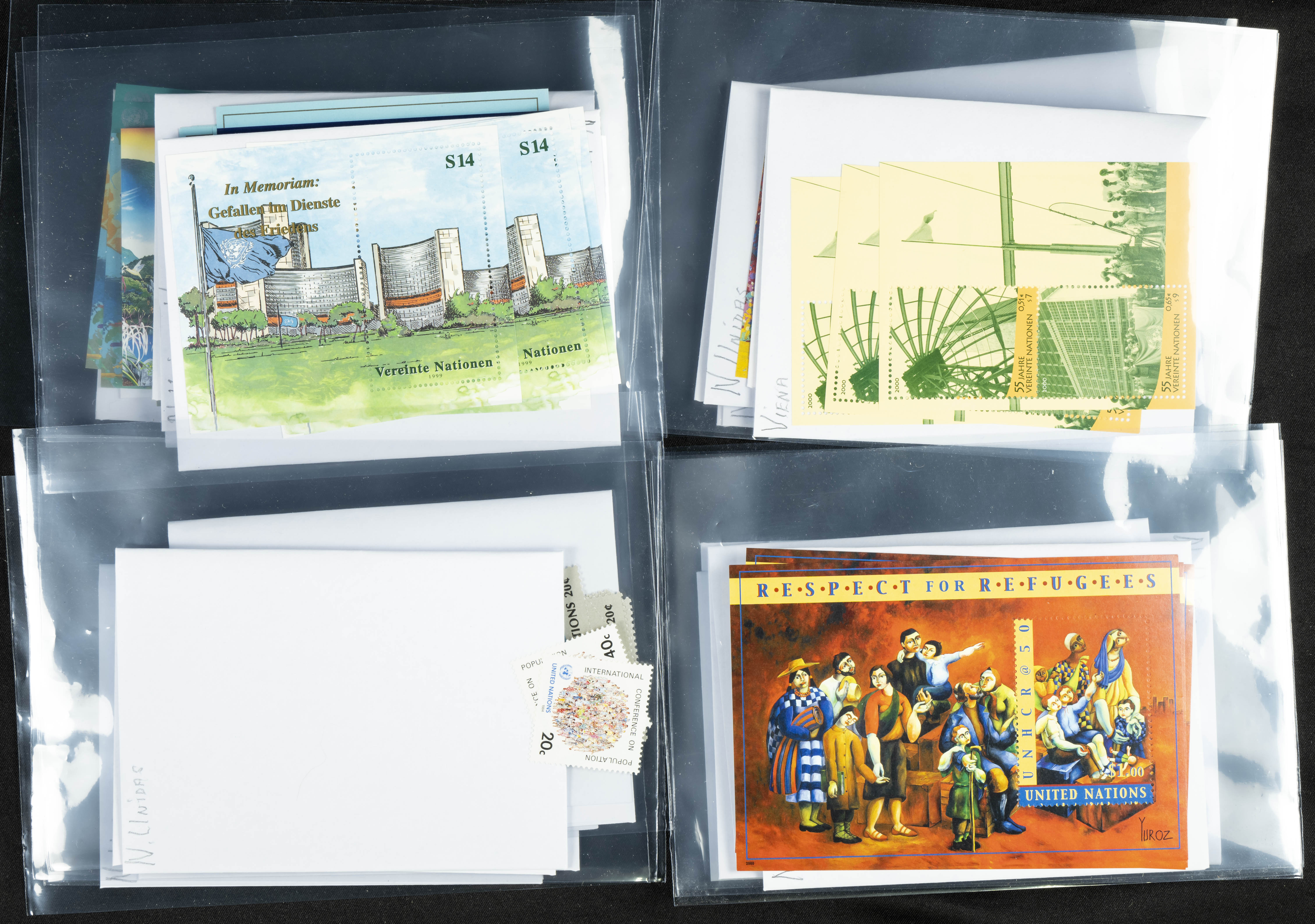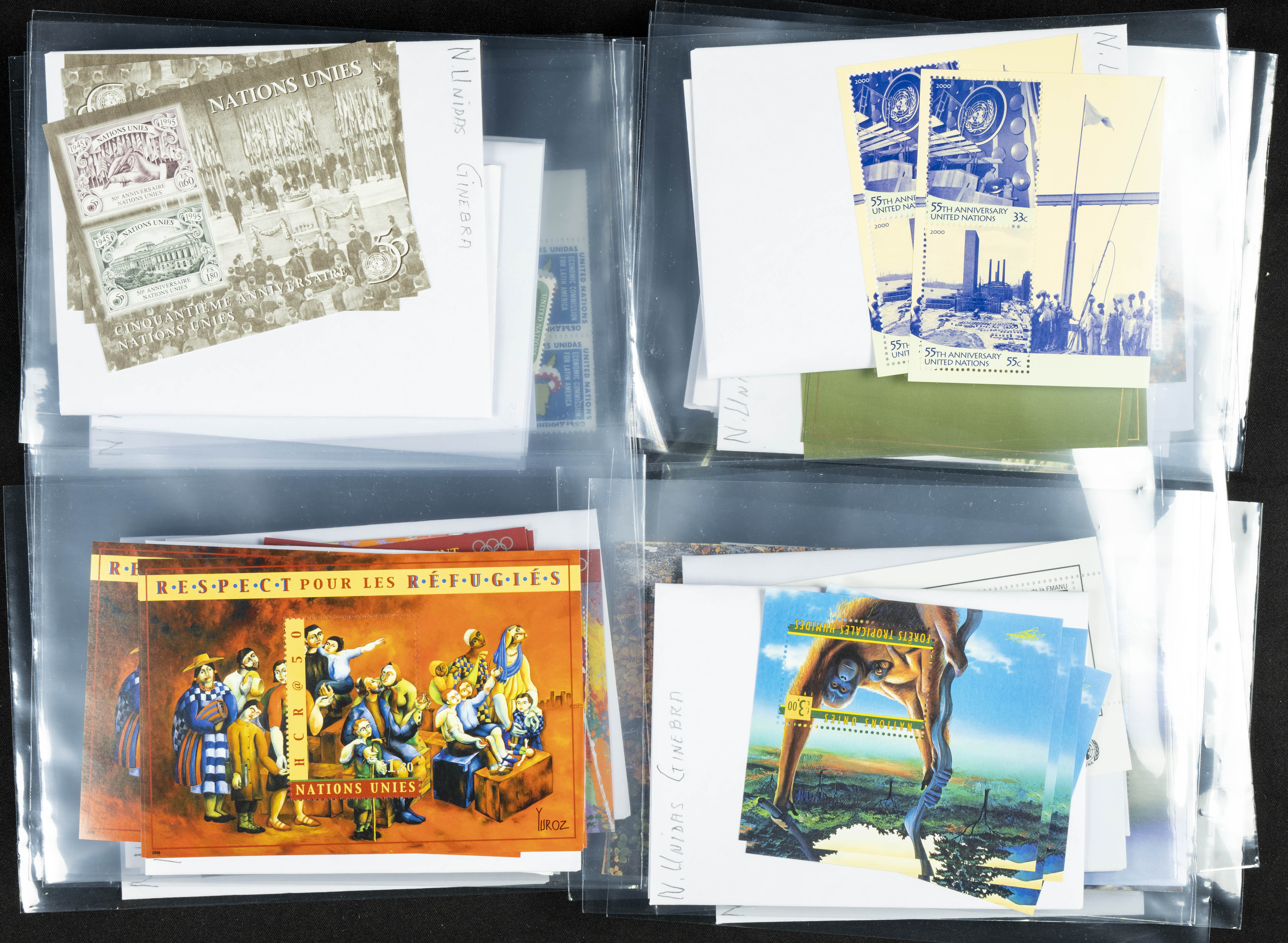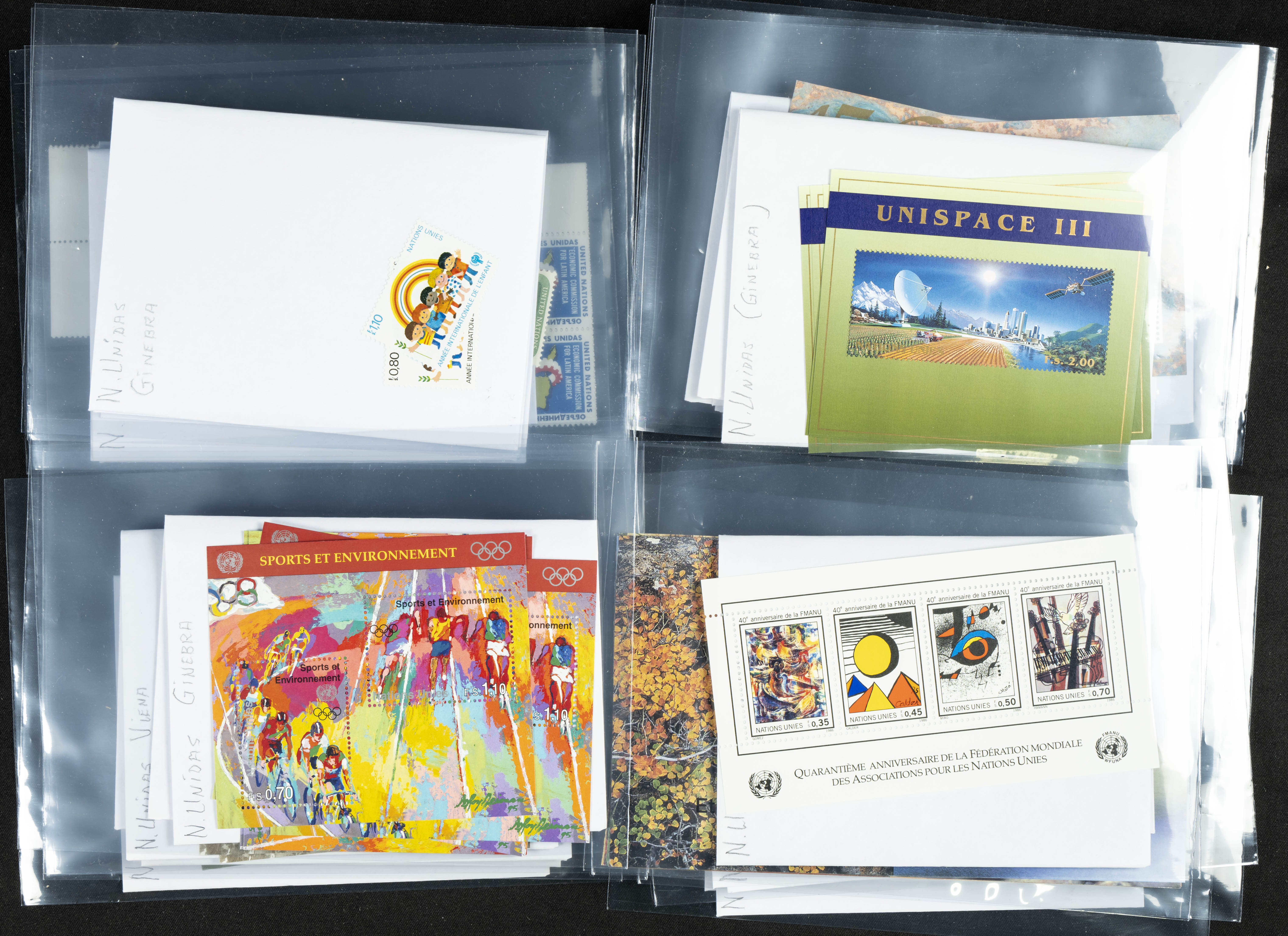 ★★(1951ca). Interesante conjunto-stock de Naciones Unidas (Nueva York, Ginebra y Viena) entre 1951 y 1997, en nuevo y con numerosas repeticiones en algunas series (hasta ciento sesenta series en algún caso), incluye hojas bloque y minihojas, además de varios cientos de Sobres de Primer Día. ALTISIMO VALOR DE CATALOGO. A EXAMINAR.