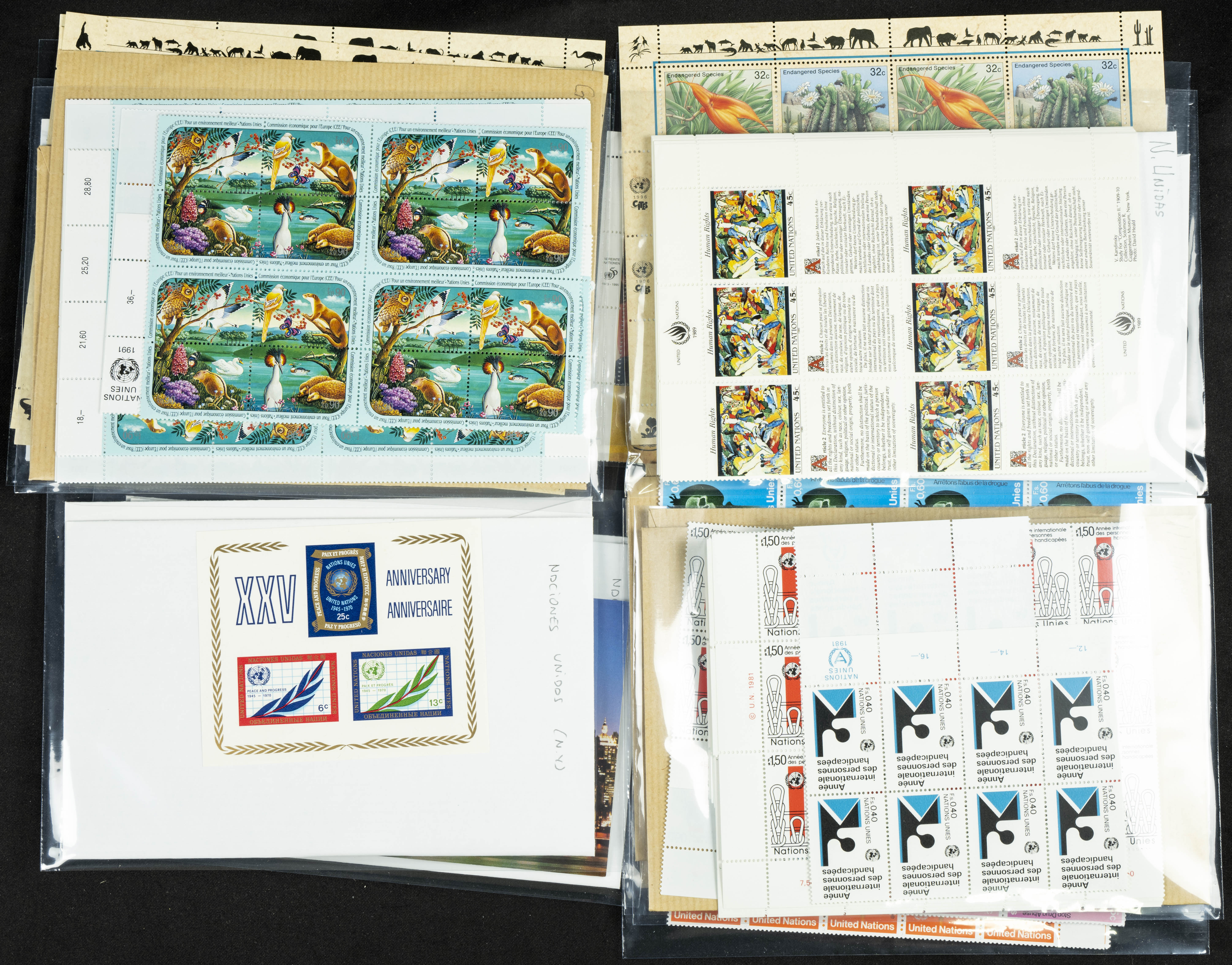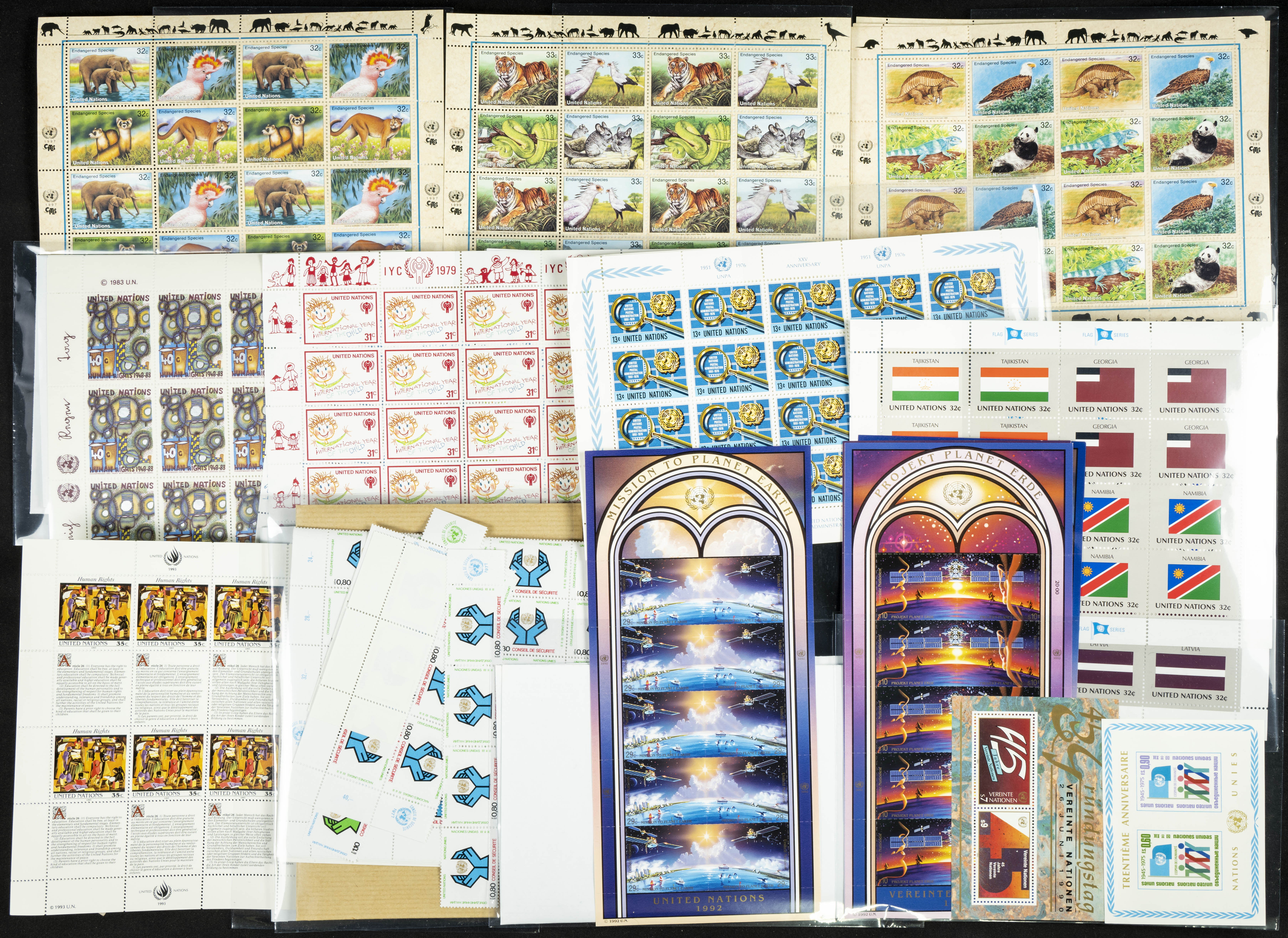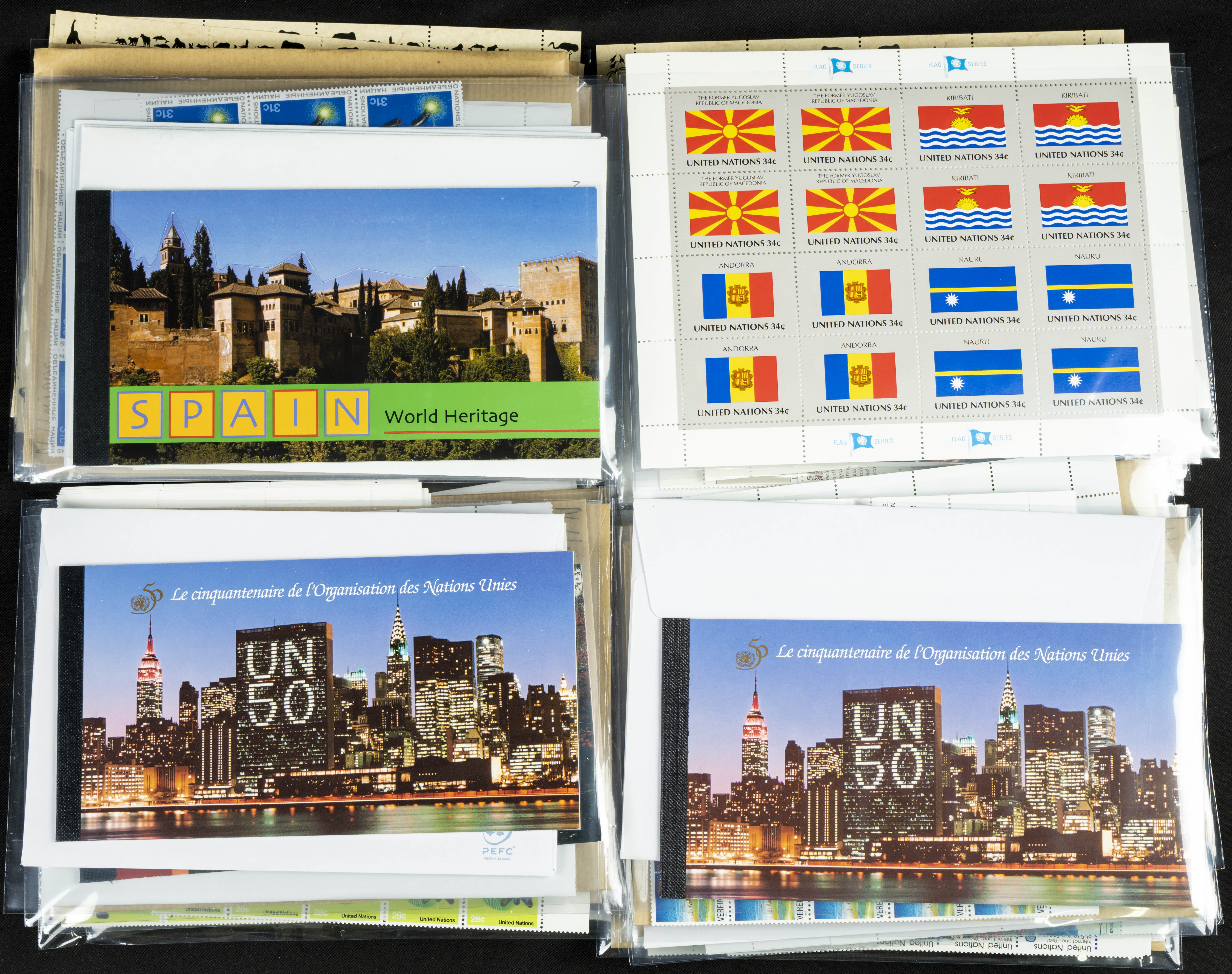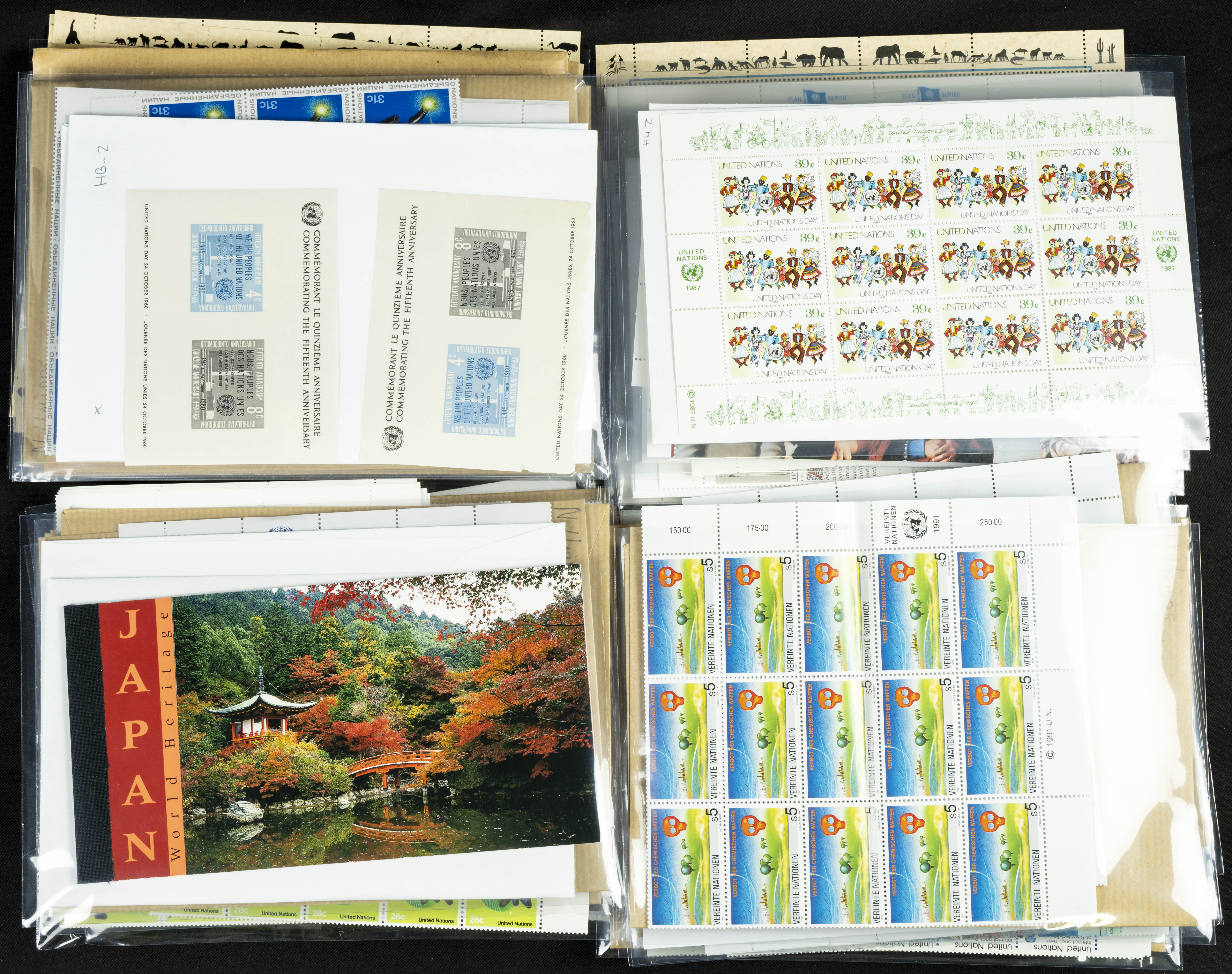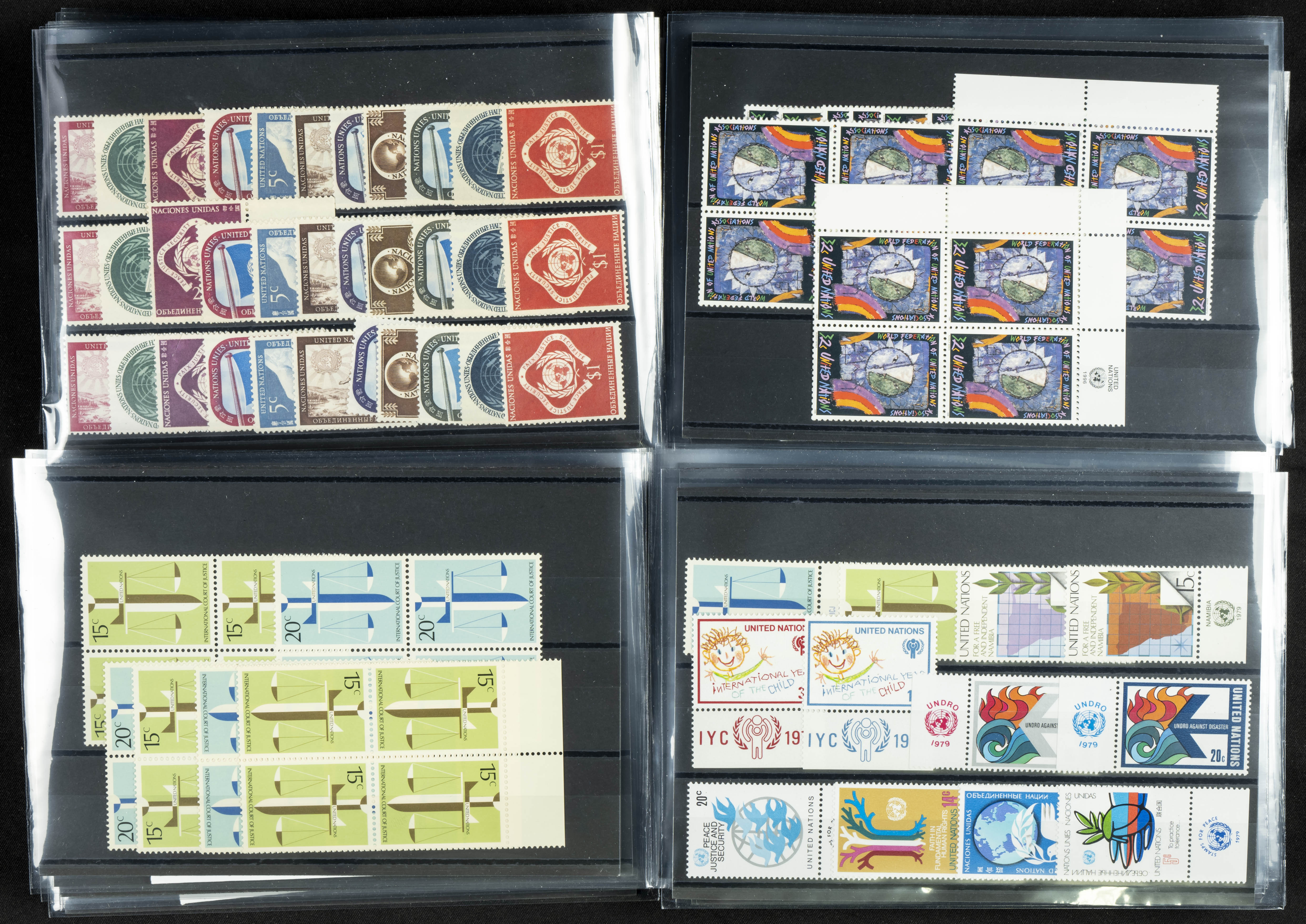 ★★(1951ca). Interesante conjunto-stock de Naciones Unidas (Nueva York, Ginebra y Viena) entre 1951 y 1997, en nuevo y con numerosas repeticiones en algunas series (hasta ciento sesenta series en algún caso), incluye hojas bloque y minihojas, además de varios cientos de Sobres de Primer Día. ALTISIMO VALOR DE CATALOGO. A EXAMINAR.