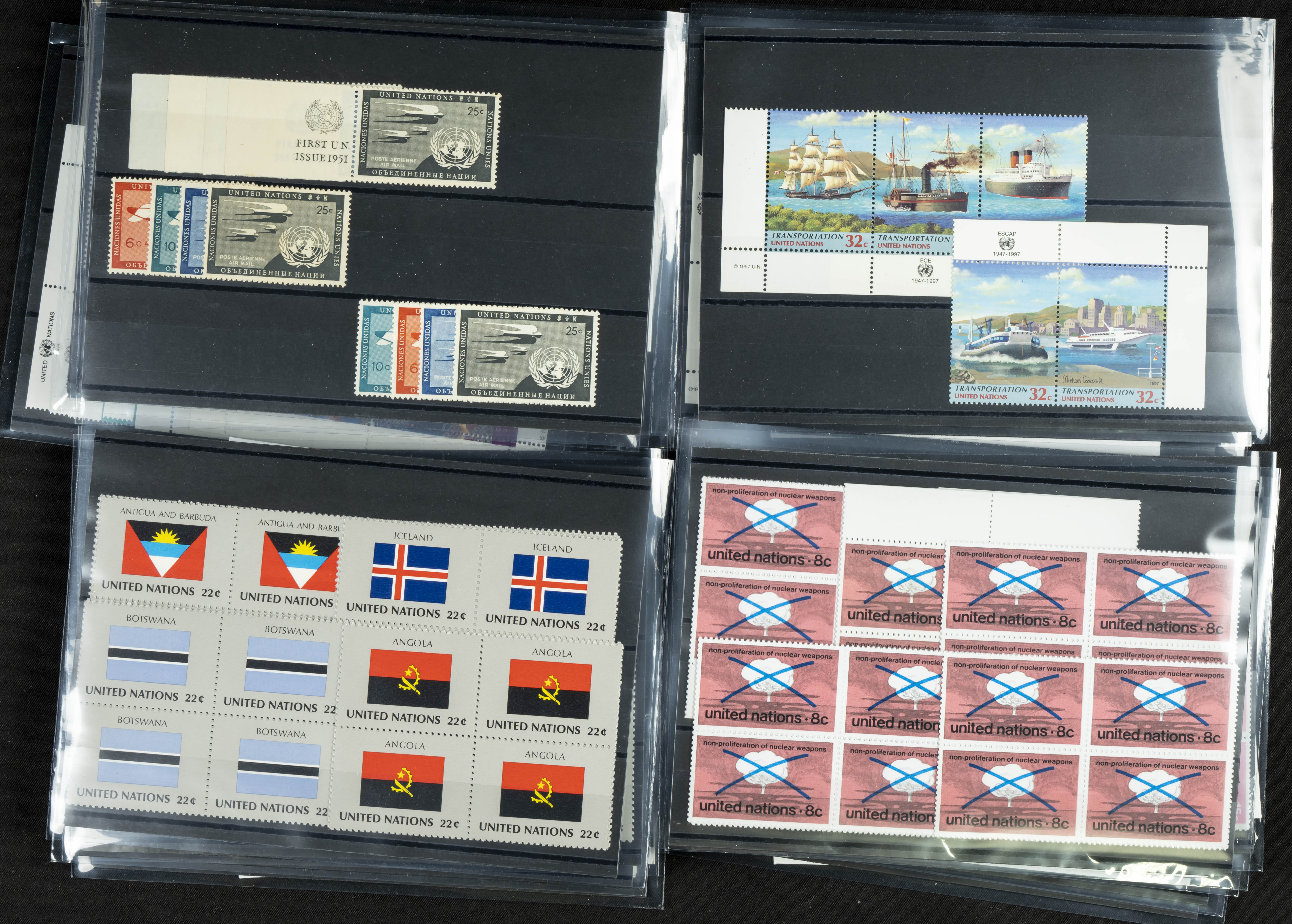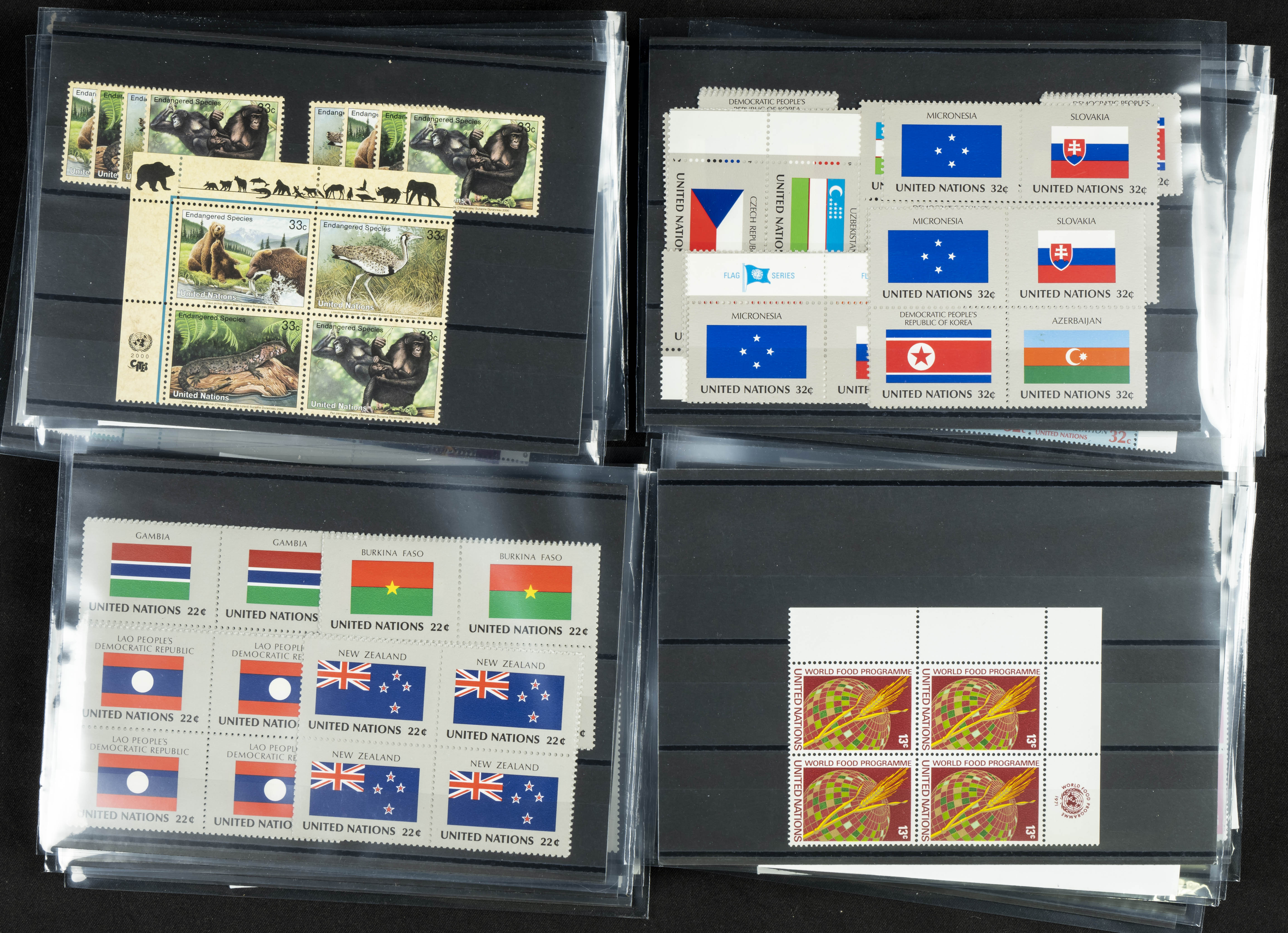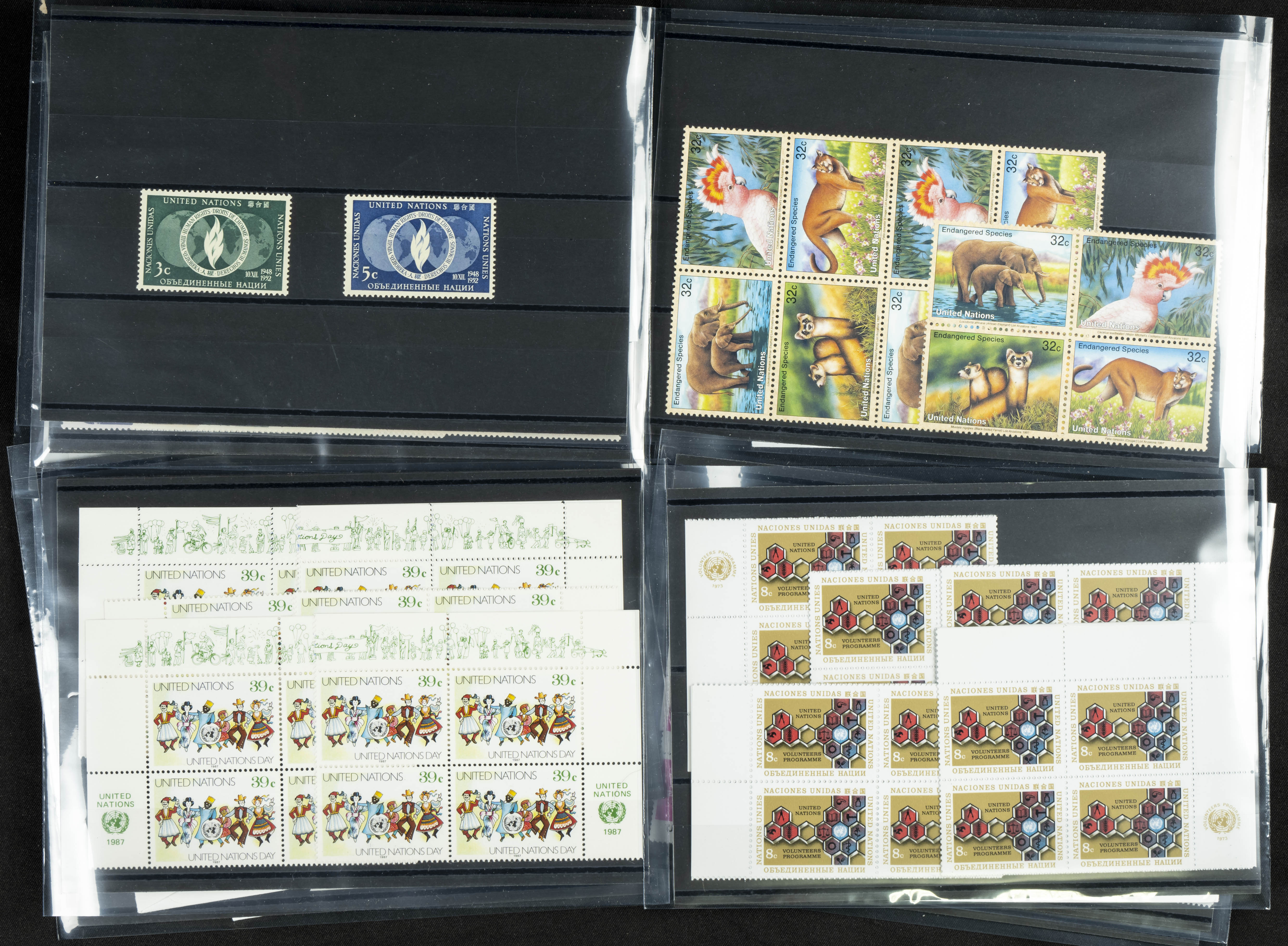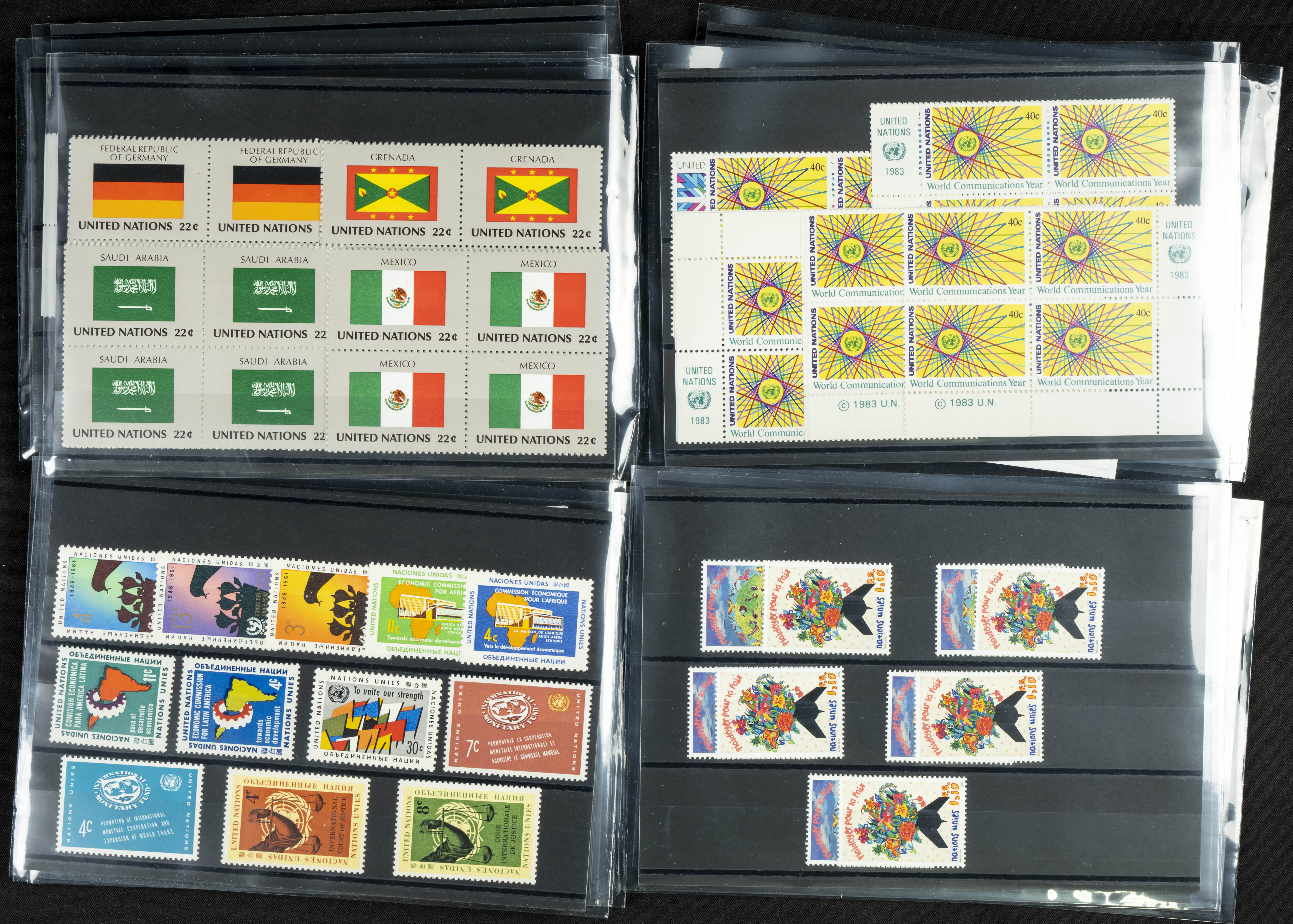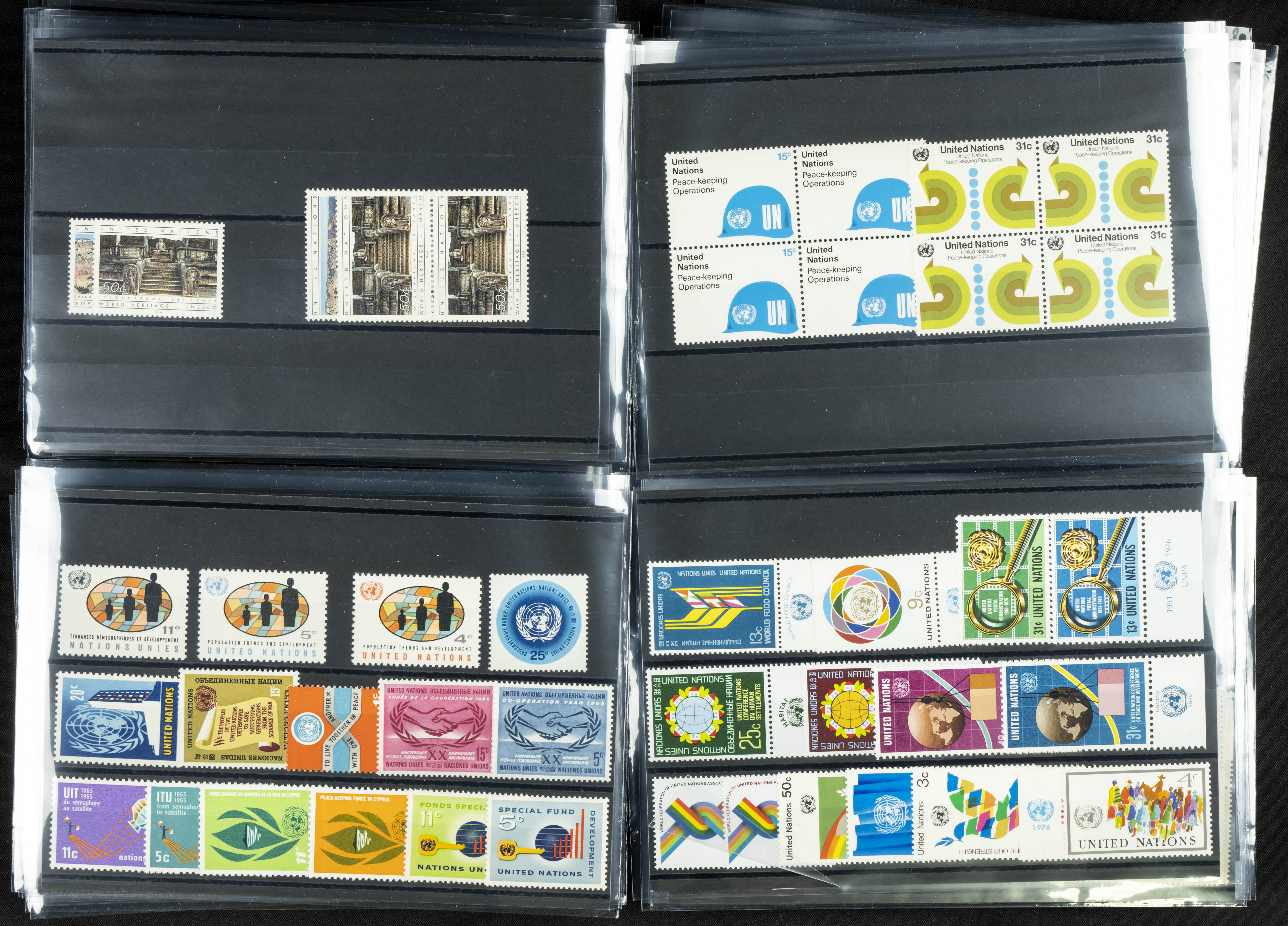 ★★(1951ca). Interesante conjunto-stock de Naciones Unidas (Nueva York, Ginebra y Viena) entre 1951 y 1997, en nuevo y con numerosas repeticiones en algunas series (hasta ciento sesenta series en algún caso), incluye hojas bloque y minihojas, además de varios cientos de Sobres de Primer Día. ALTISIMO VALOR DE CATALOGO. A EXAMINAR.