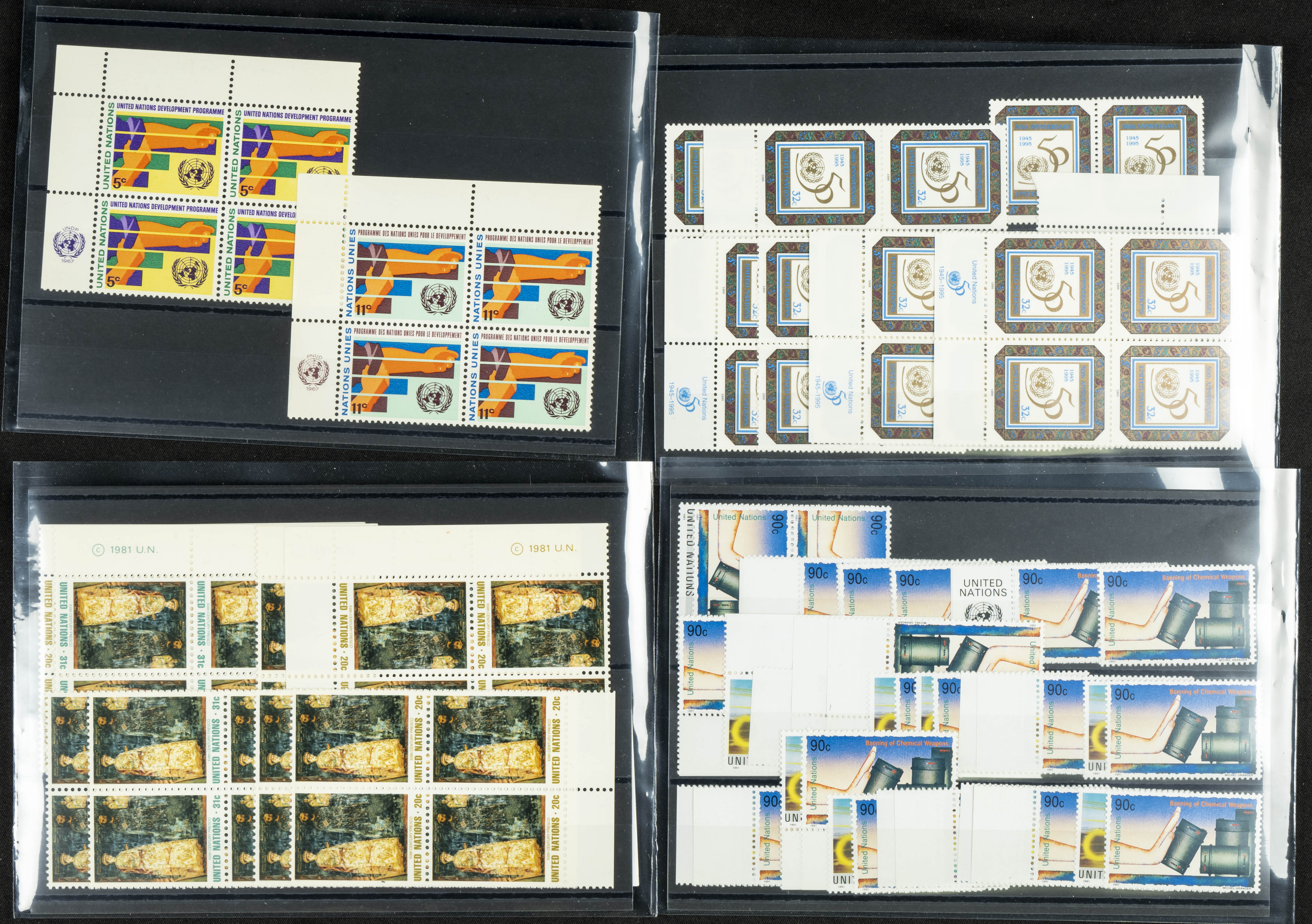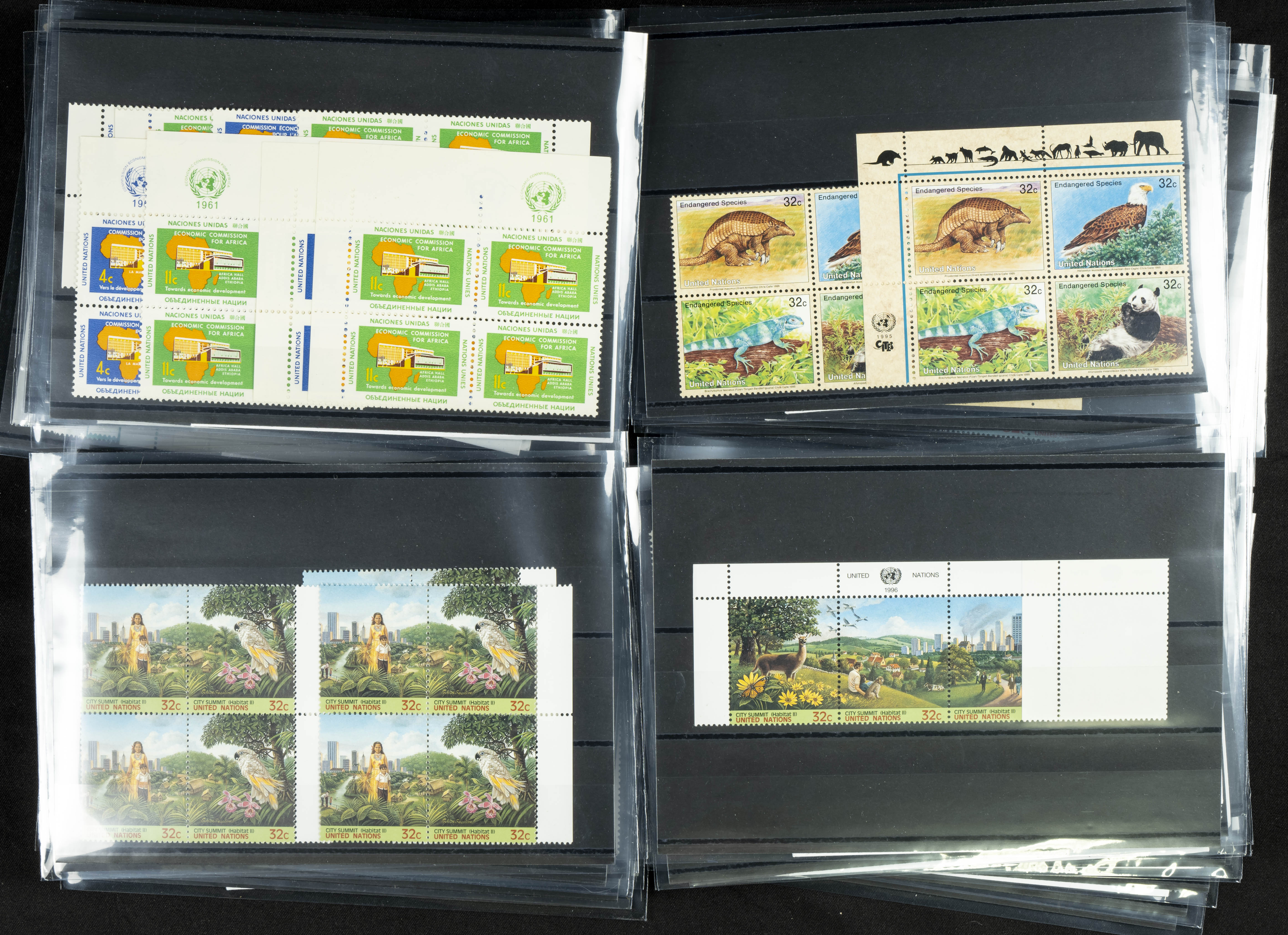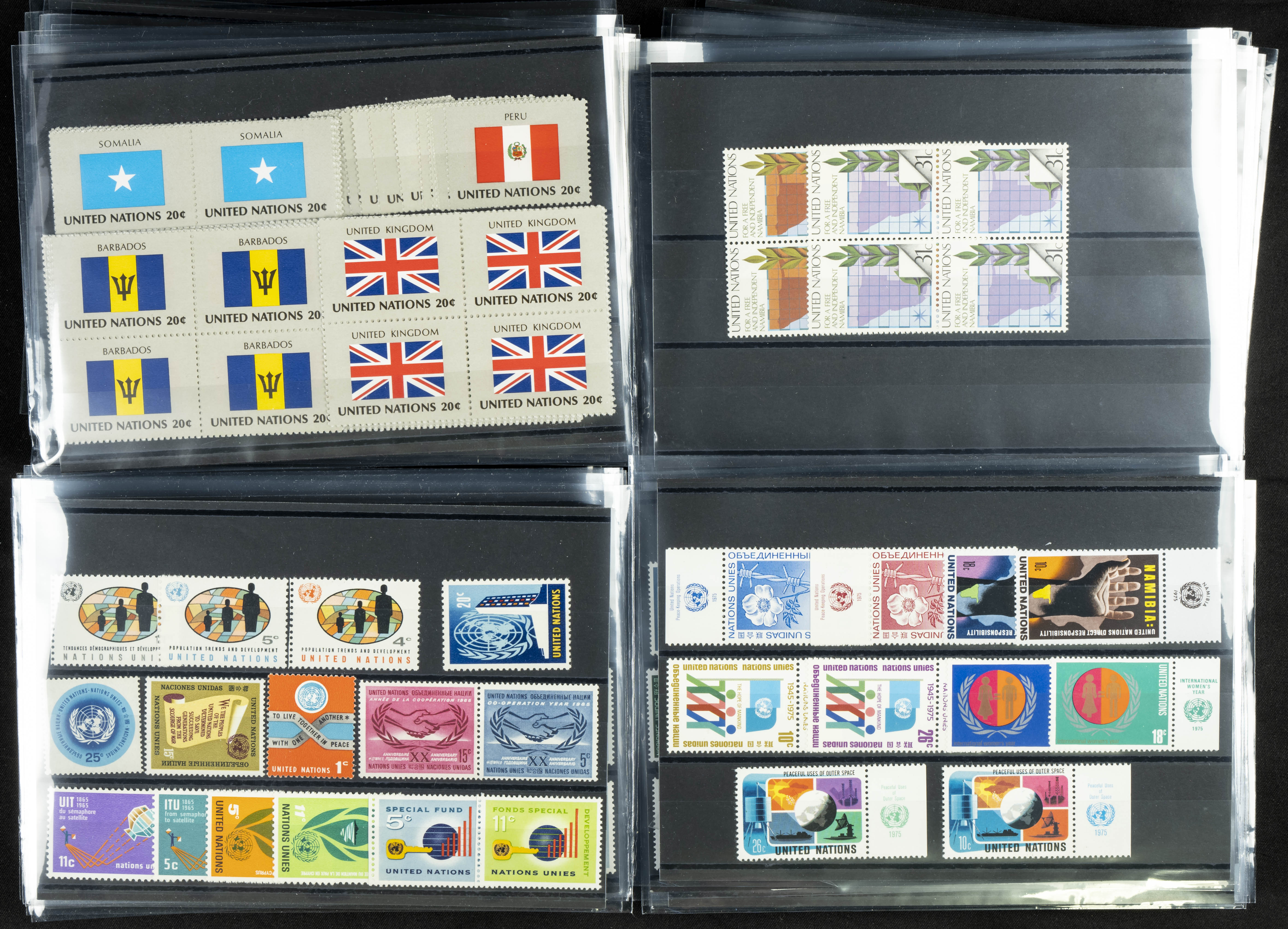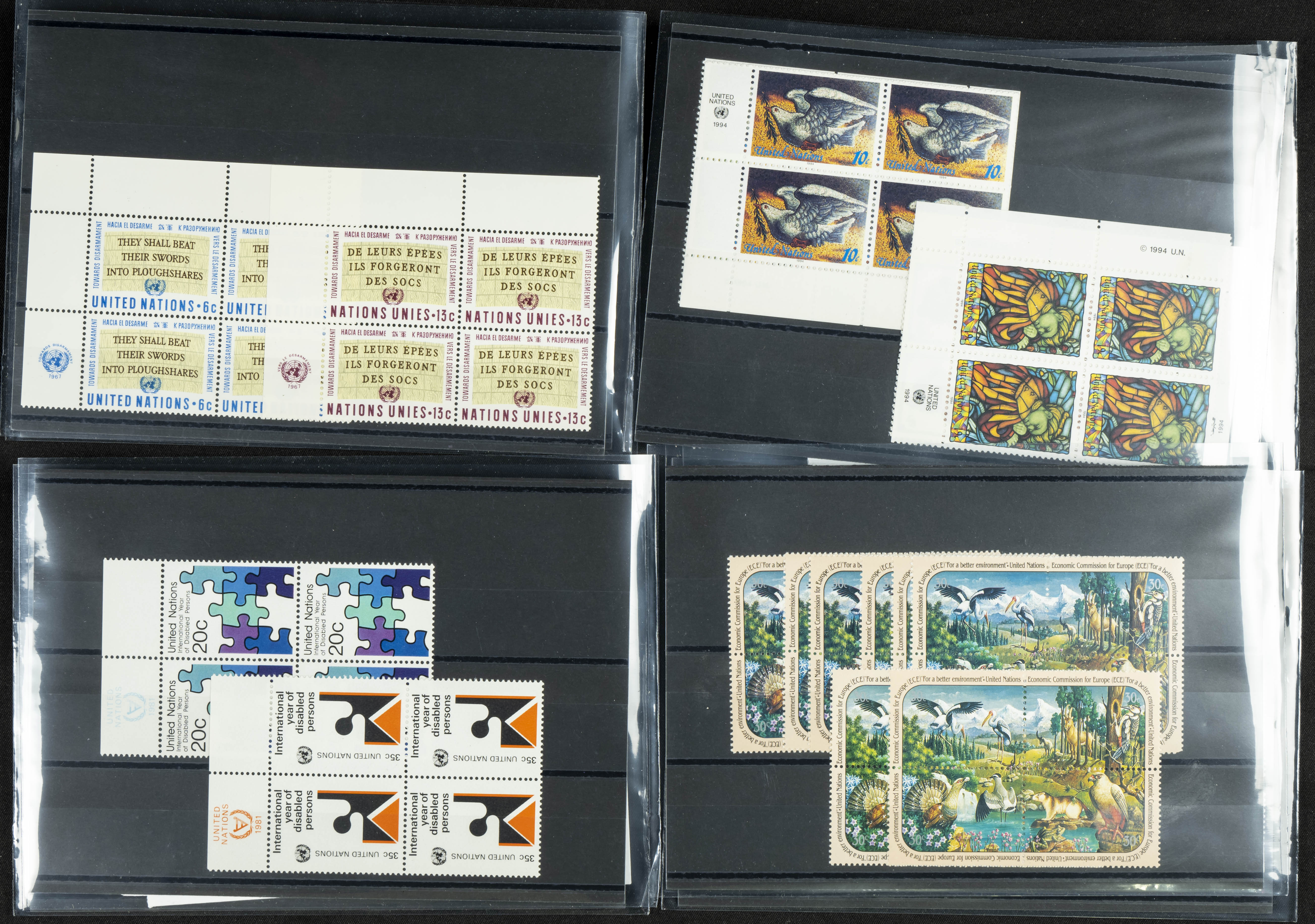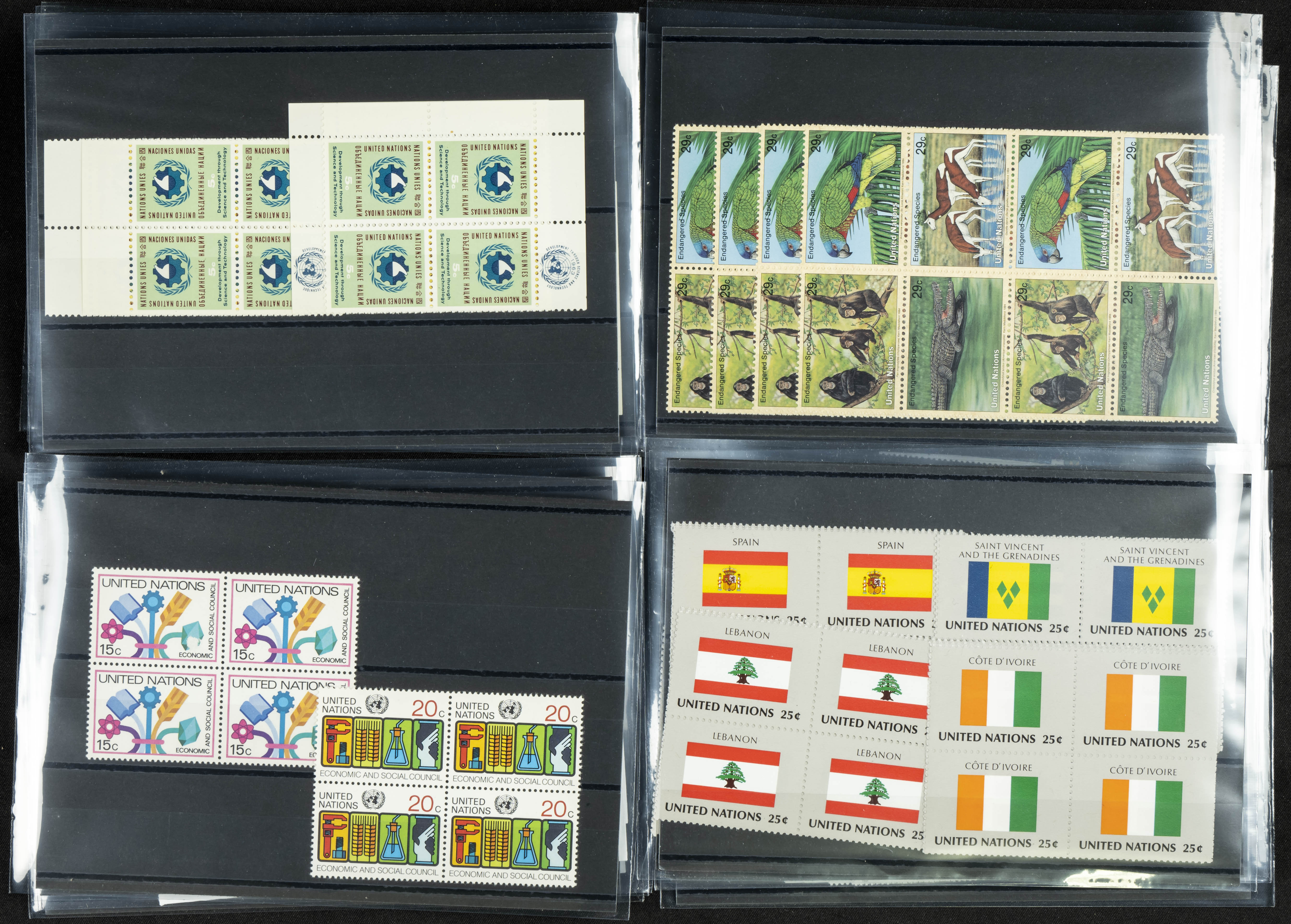 ★★(1951ca). Interesante conjunto-stock de Naciones Unidas (Nueva York, Ginebra y Viena) entre 1951 y 1997, en nuevo y con numerosas repeticiones en algunas series (hasta ciento sesenta series en algún caso), incluye hojas bloque y minihojas, además de varios cientos de Sobres de Primer Día. ALTISIMO VALOR DE CATALOGO. A EXAMINAR.