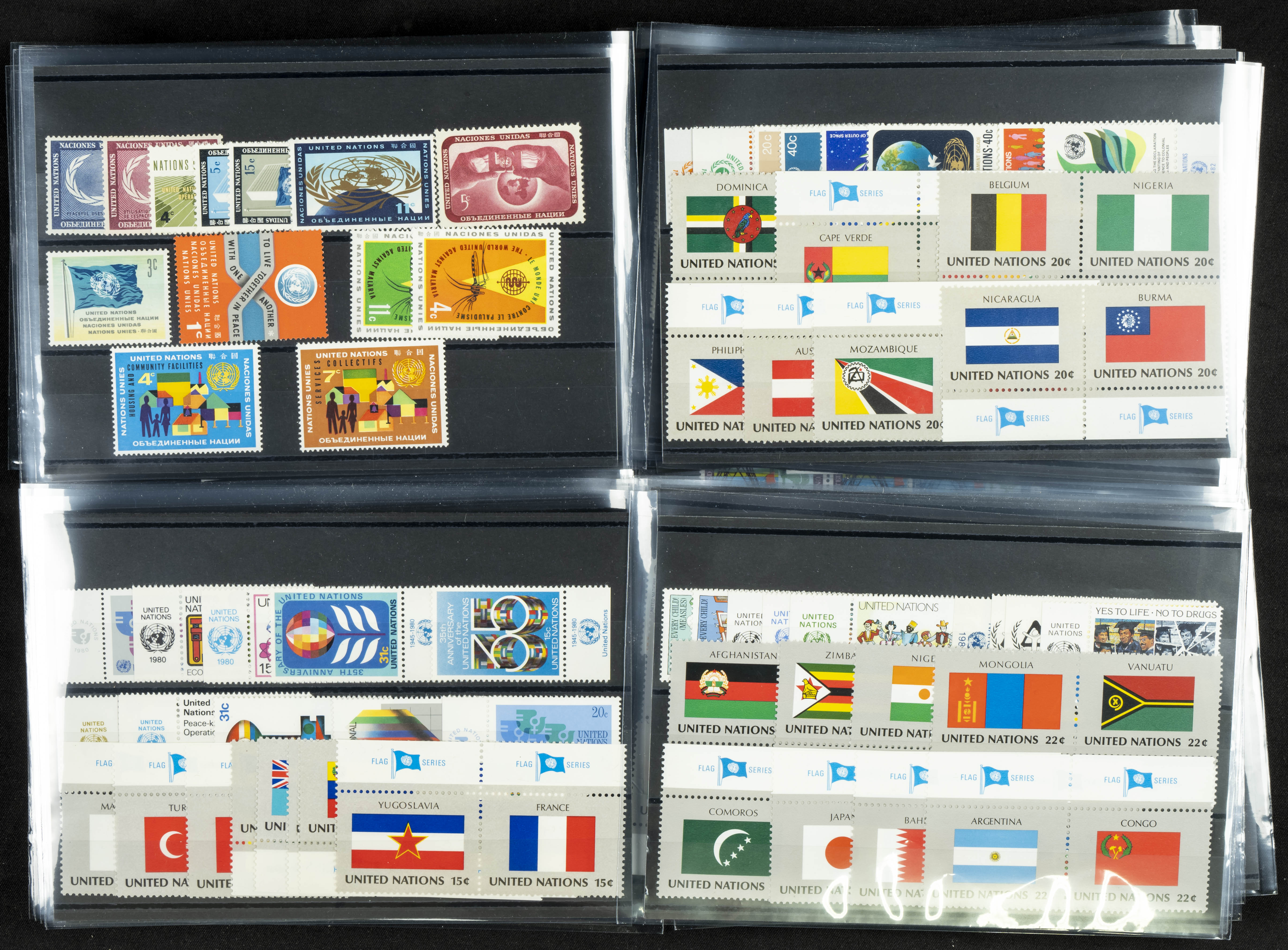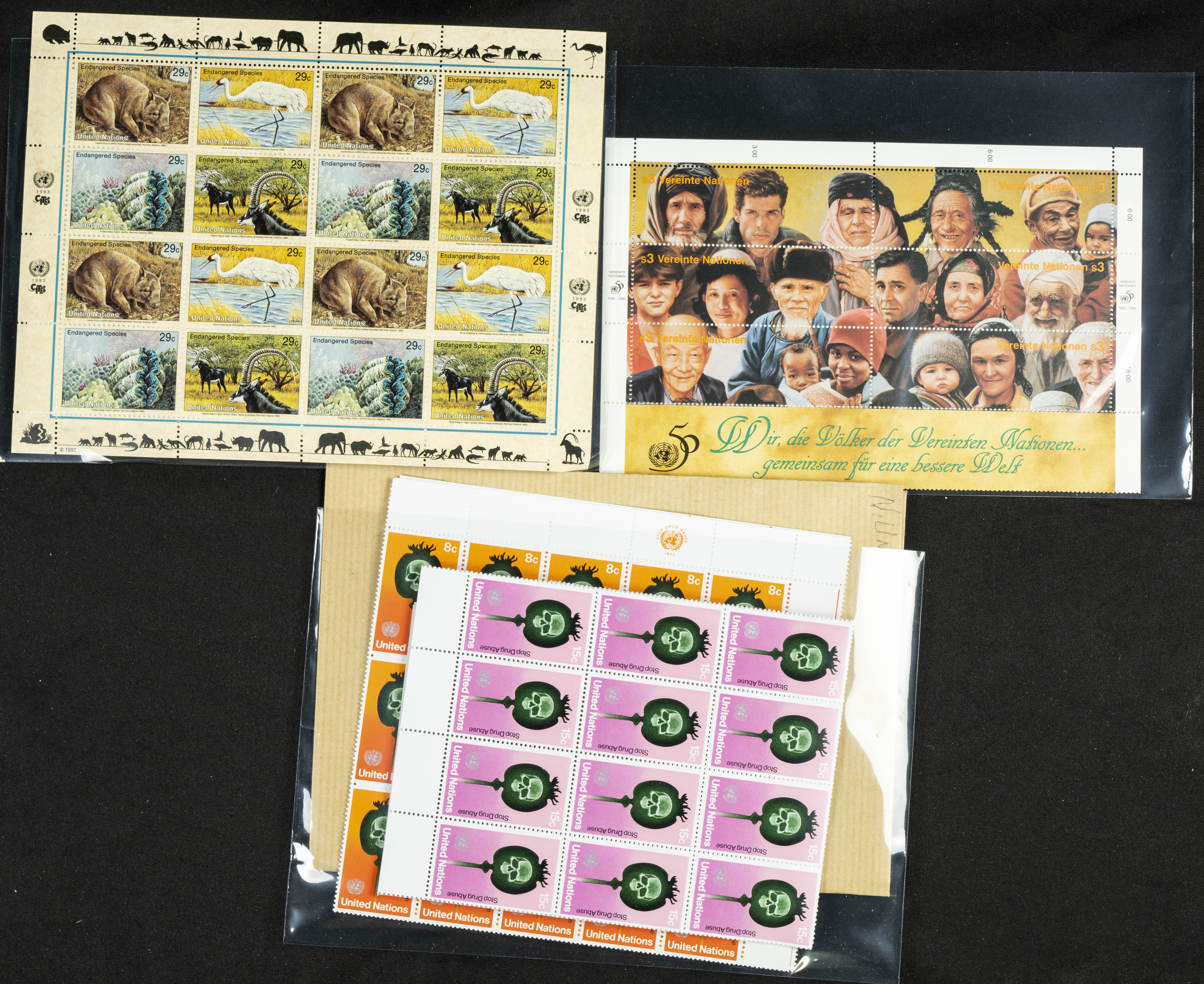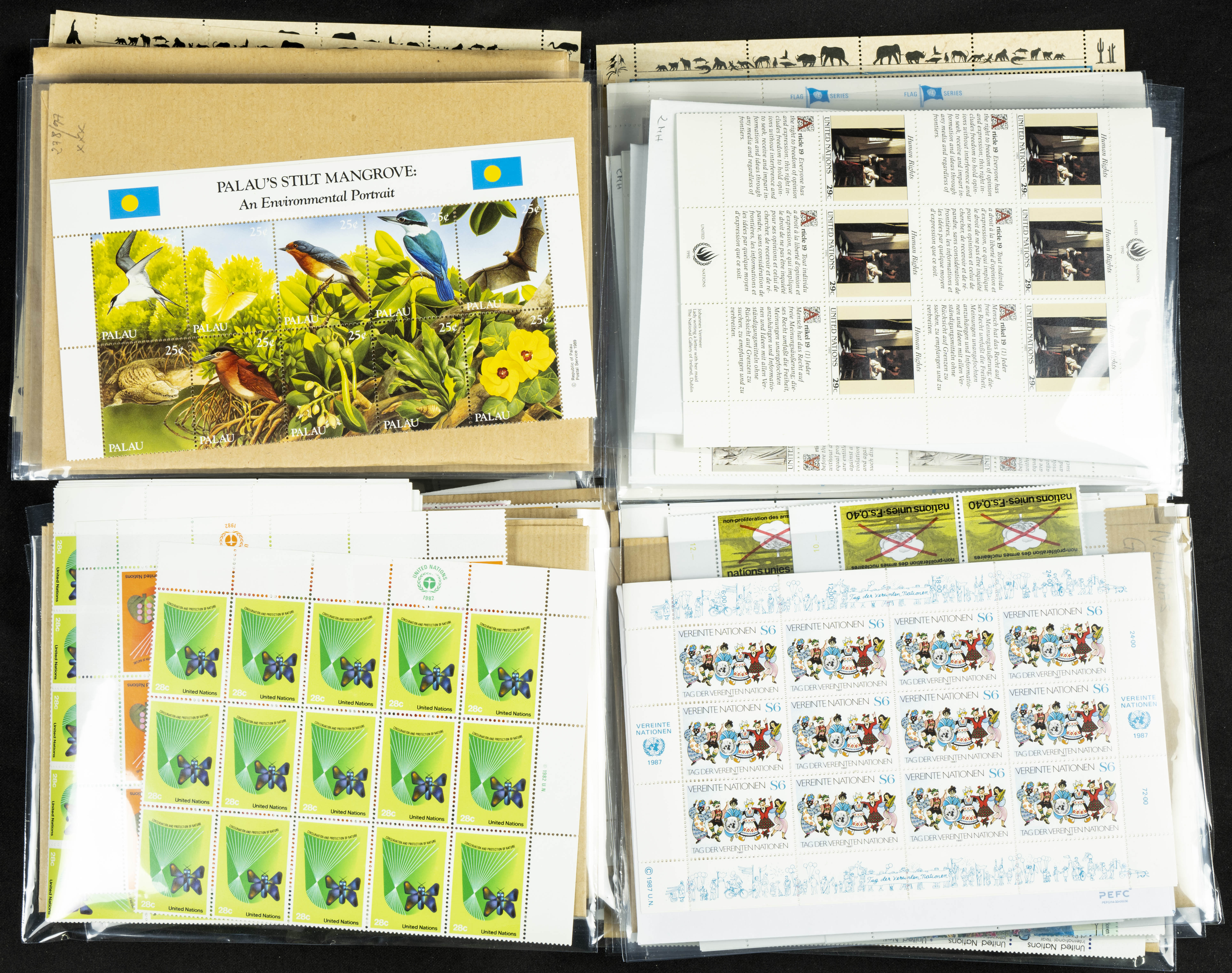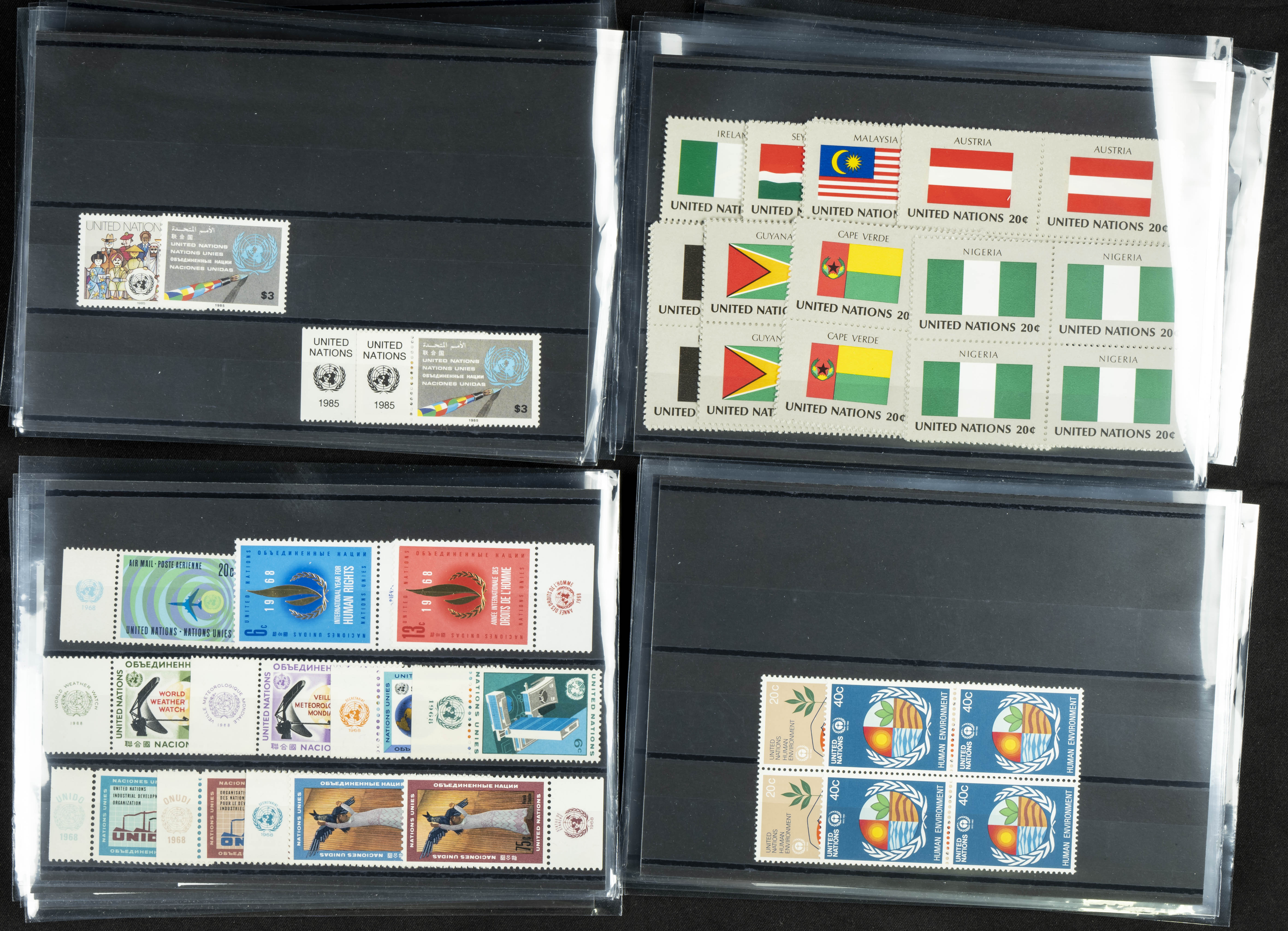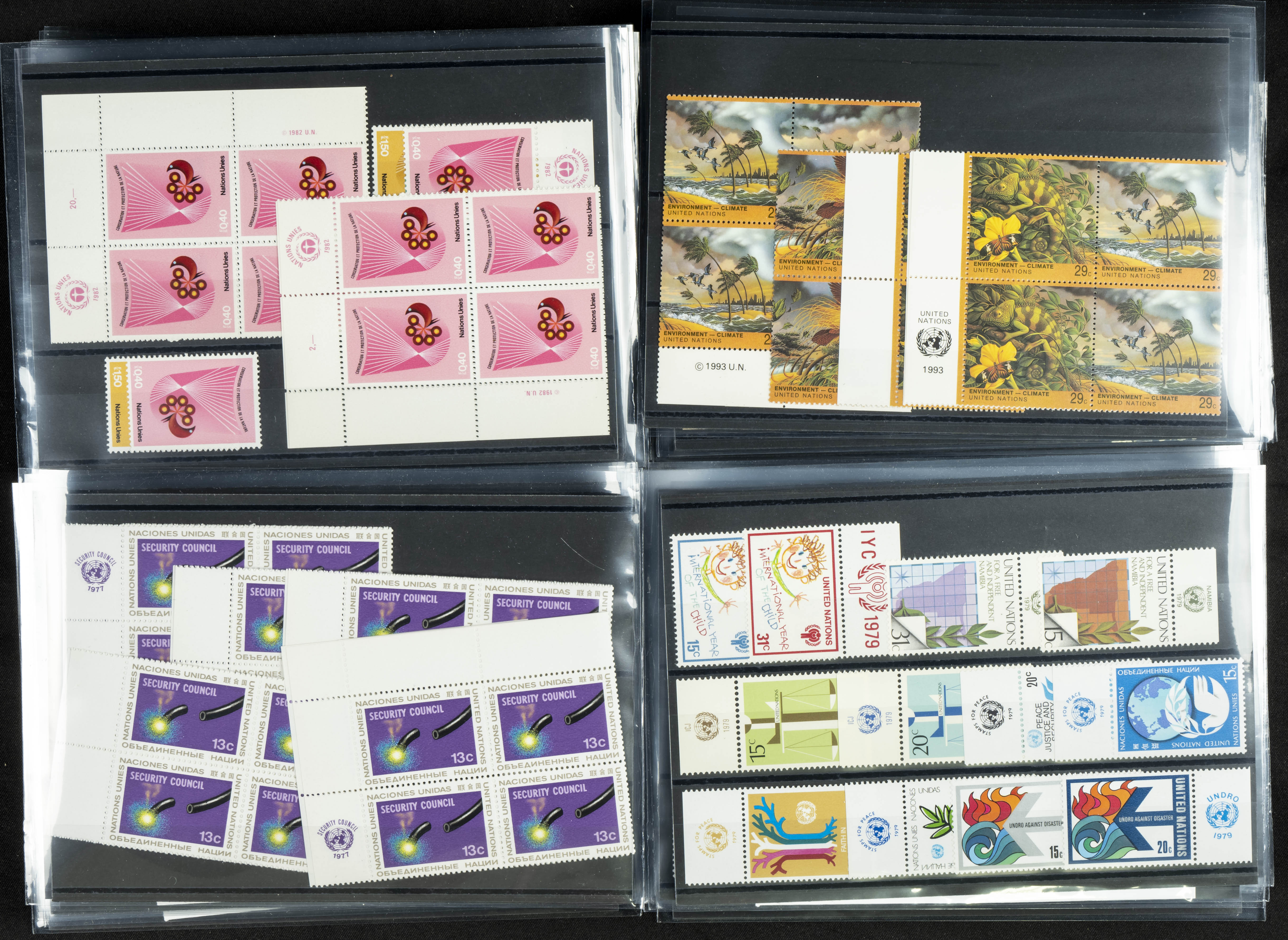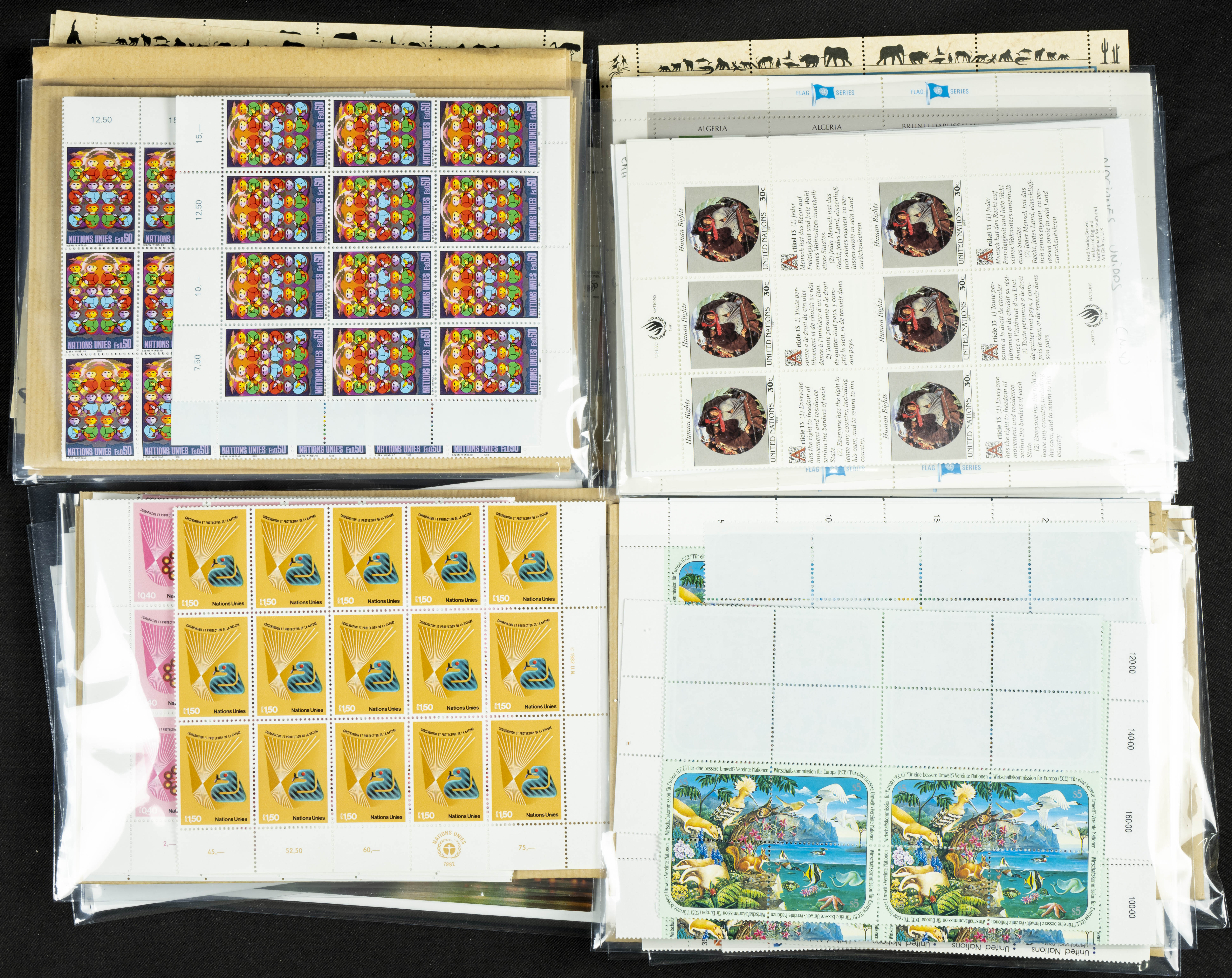 ★★(1951ca). Interesante conjunto-stock de Naciones Unidas (Nueva York, Ginebra y Viena) entre 1951 y 1997, en nuevo y con numerosas repeticiones en algunas series (hasta ciento sesenta series en algún caso), incluye hojas bloque y minihojas, además de varios cientos de Sobres de Primer Día. ALTISIMO VALOR DE CATALOGO. A EXAMINAR.