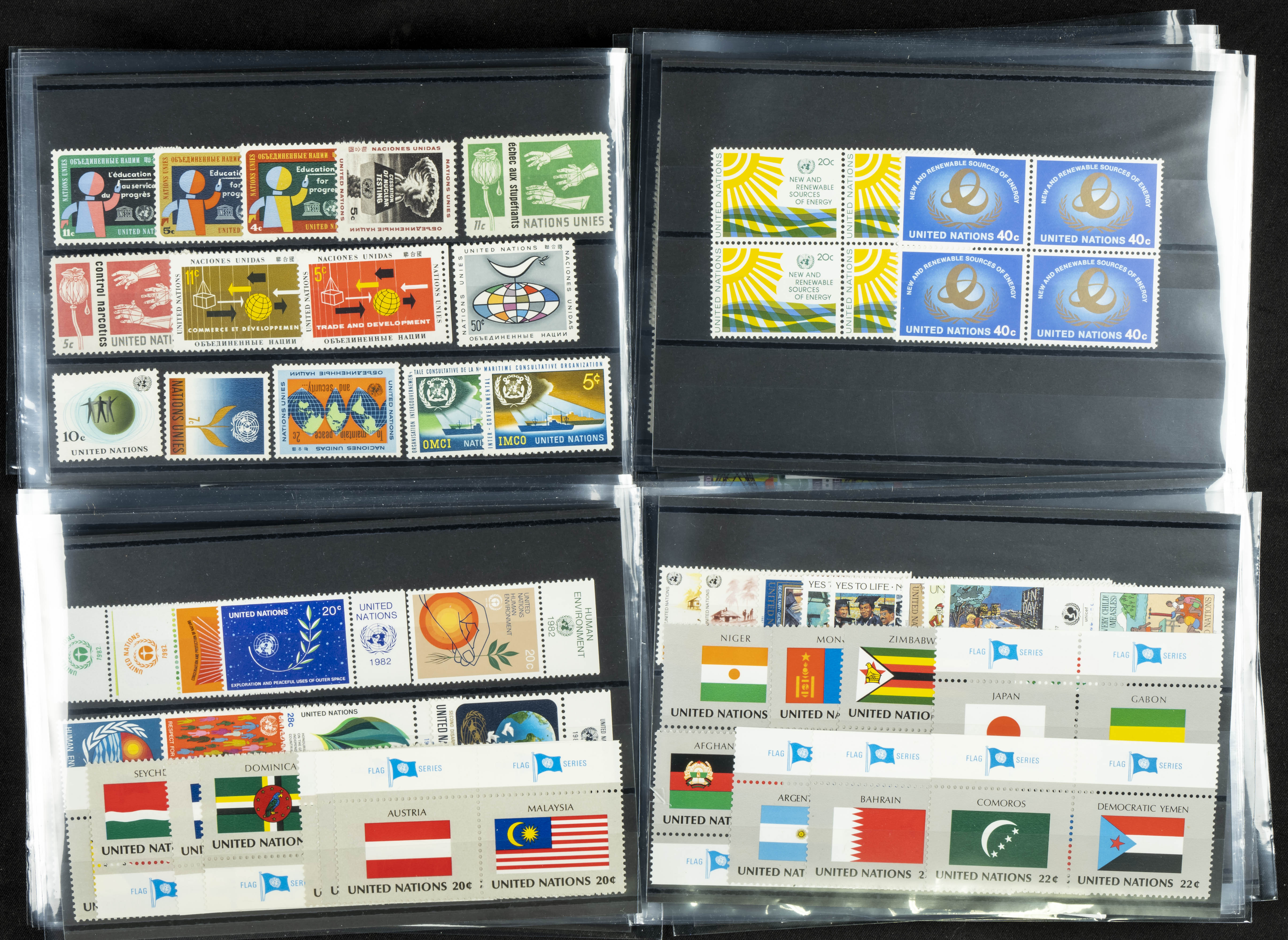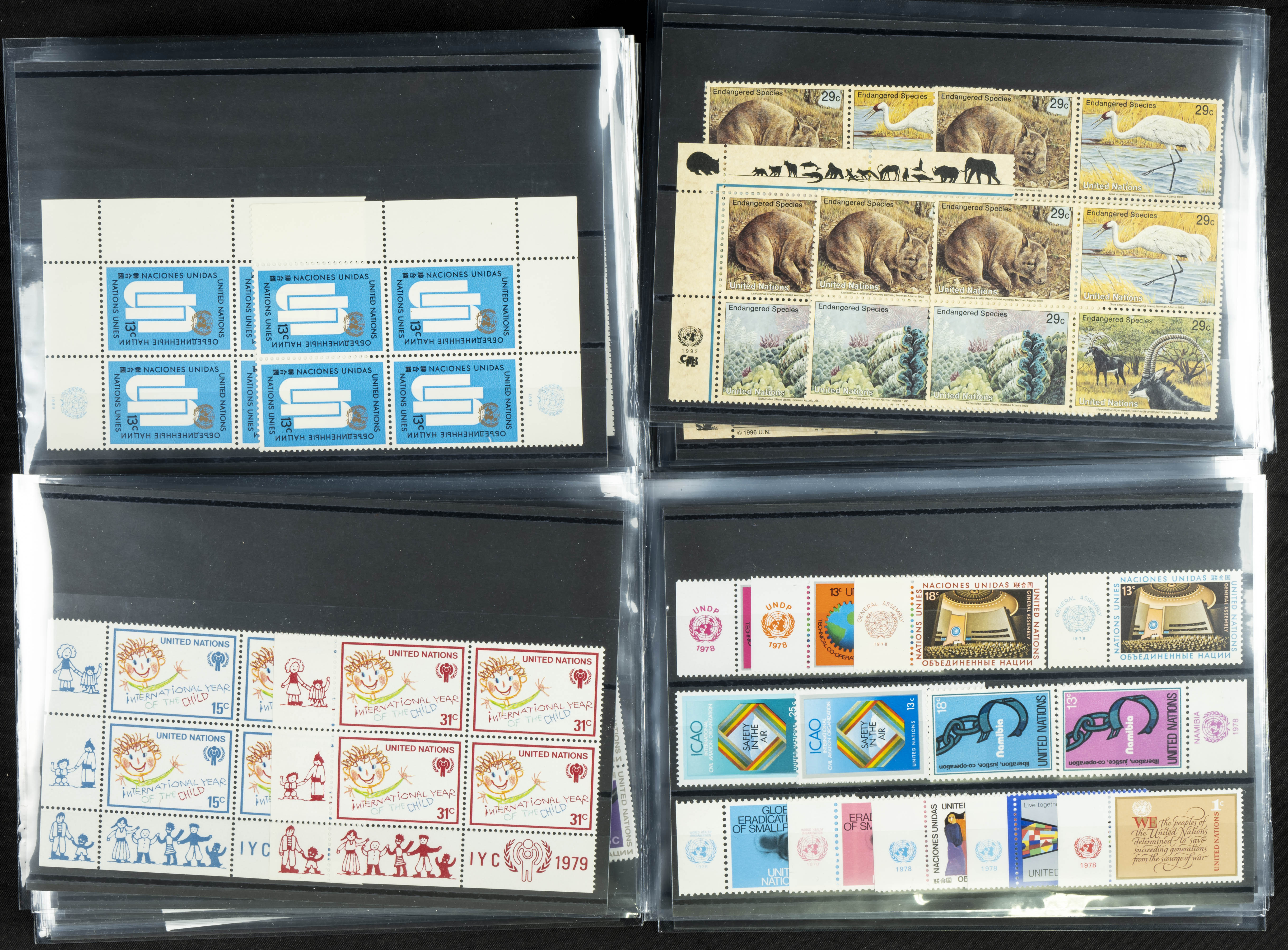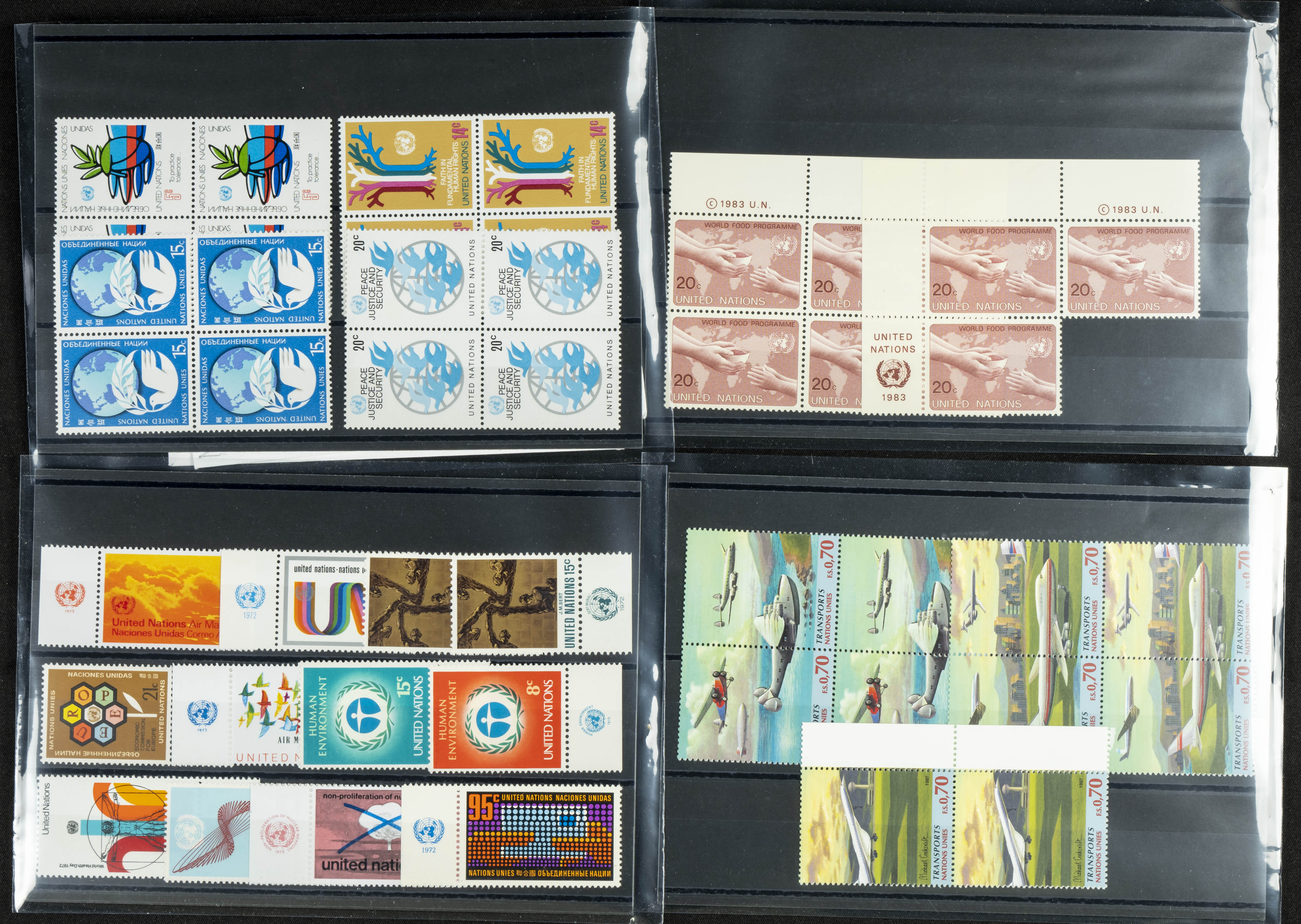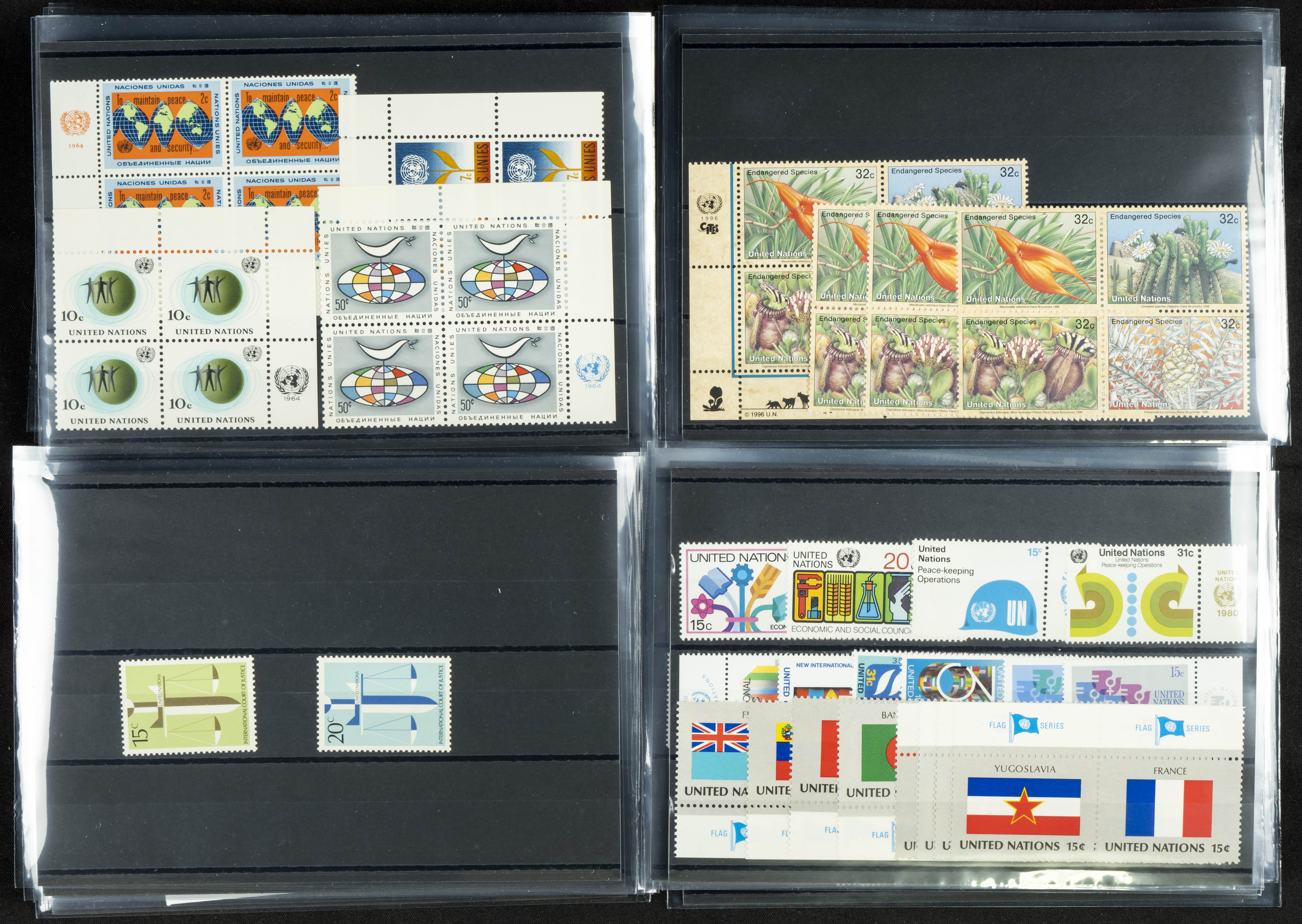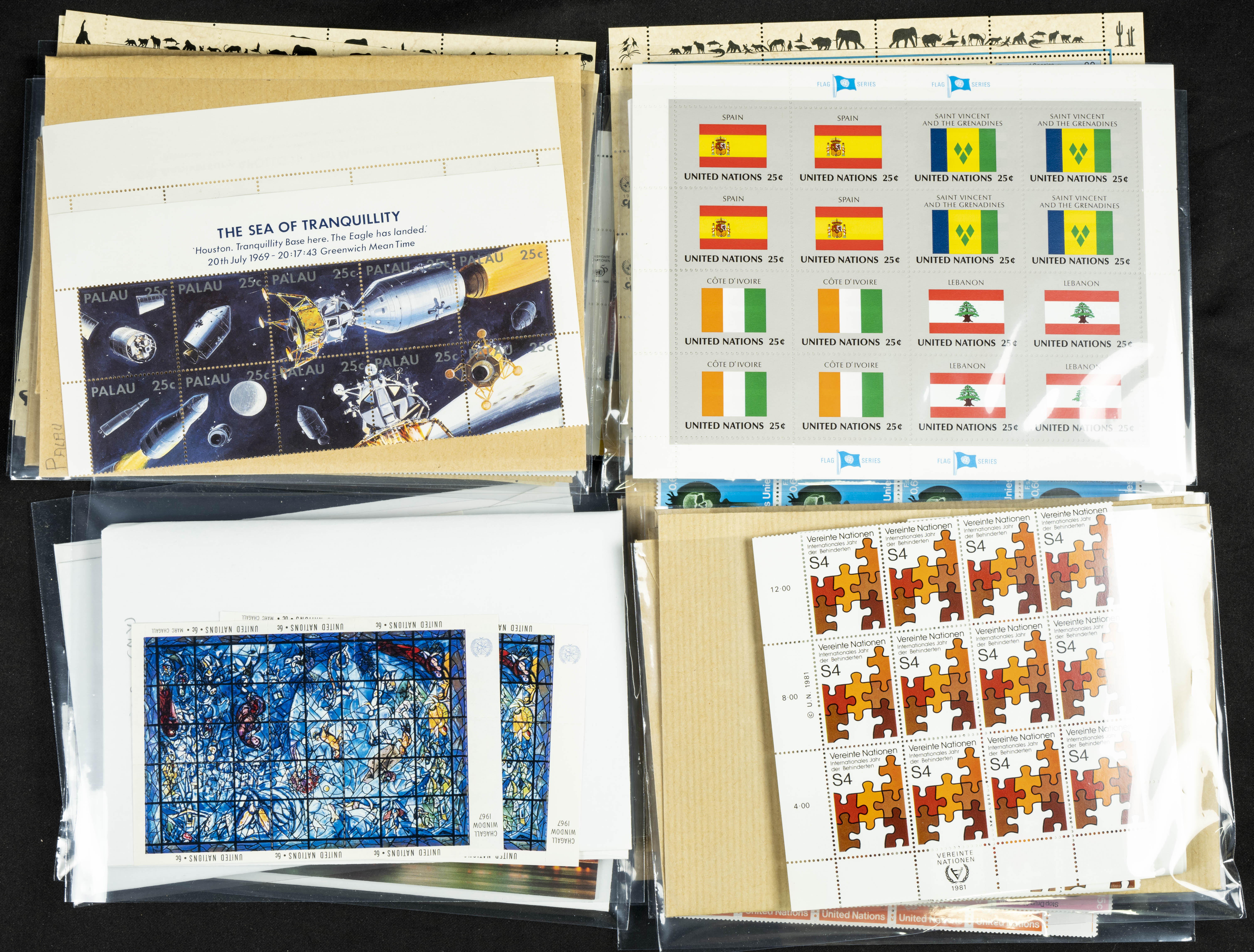 ★★(1951ca). Interesante conjunto-stock de Naciones Unidas (Nueva York, Ginebra y Viena) entre 1951 y 1997, en nuevo y con numerosas repeticiones en algunas series (hasta ciento sesenta series en algún caso), incluye hojas bloque y minihojas, además de varios cientos de Sobres de Primer Día. ALTISIMO VALOR DE CATALOGO. A EXAMINAR.