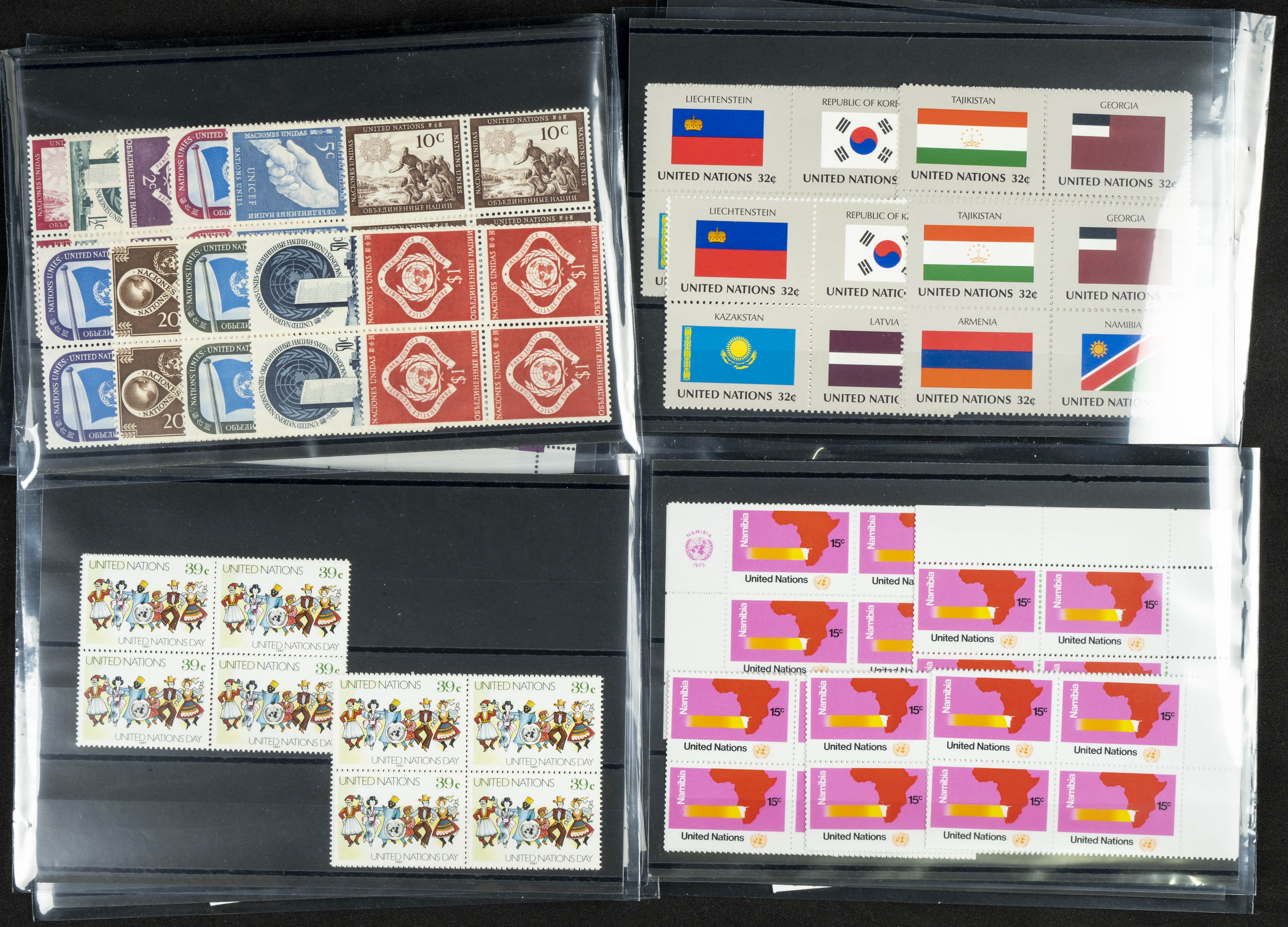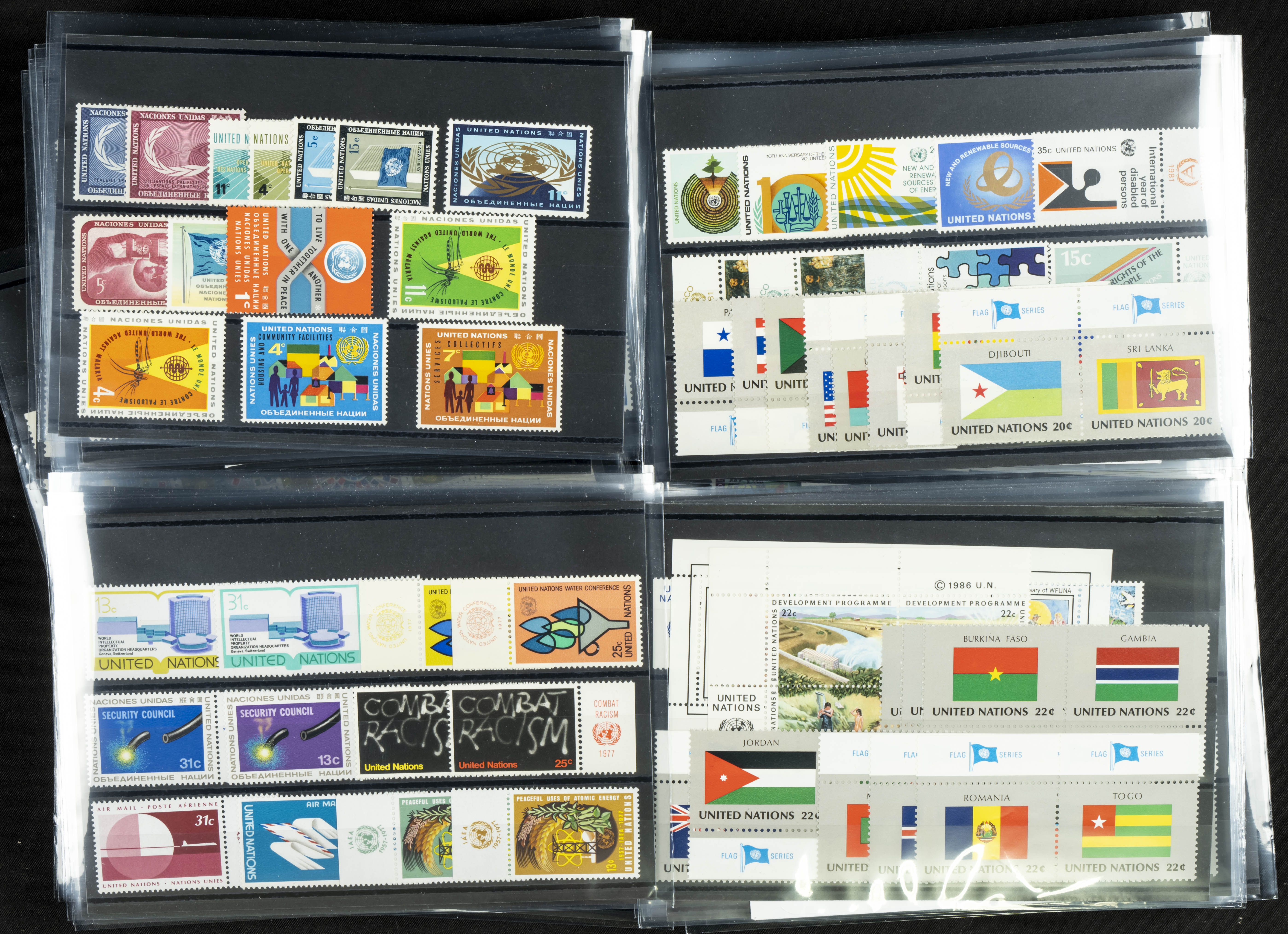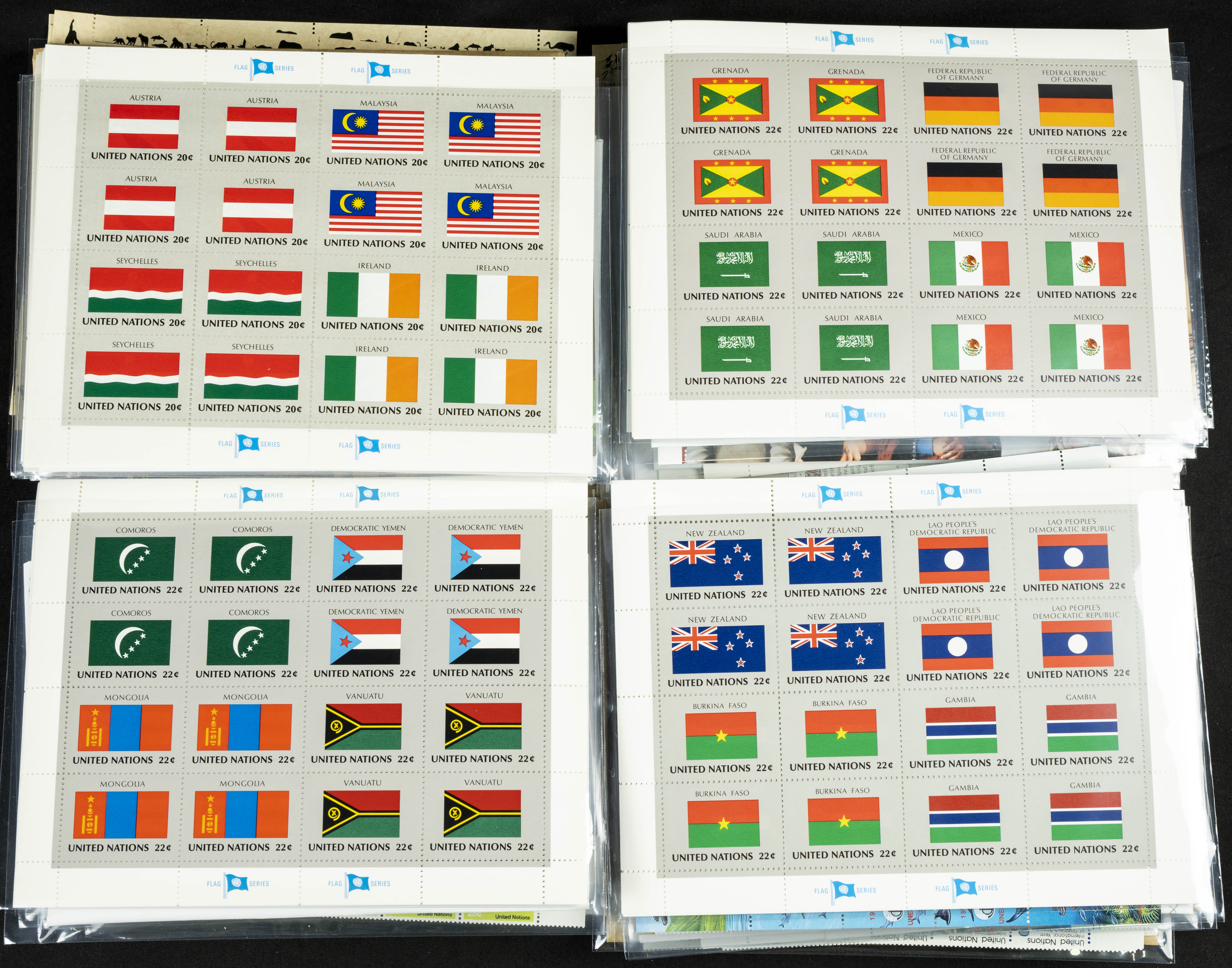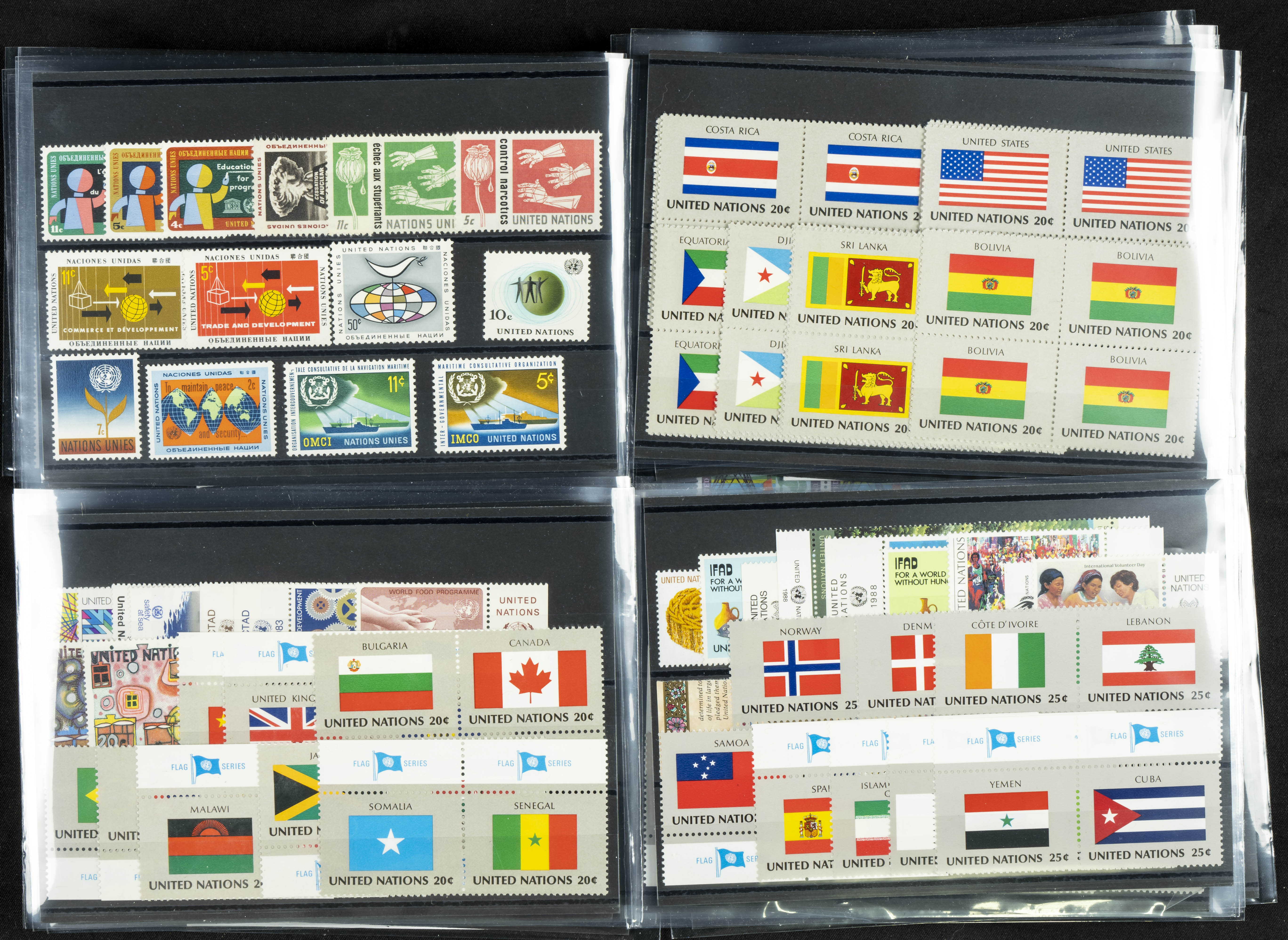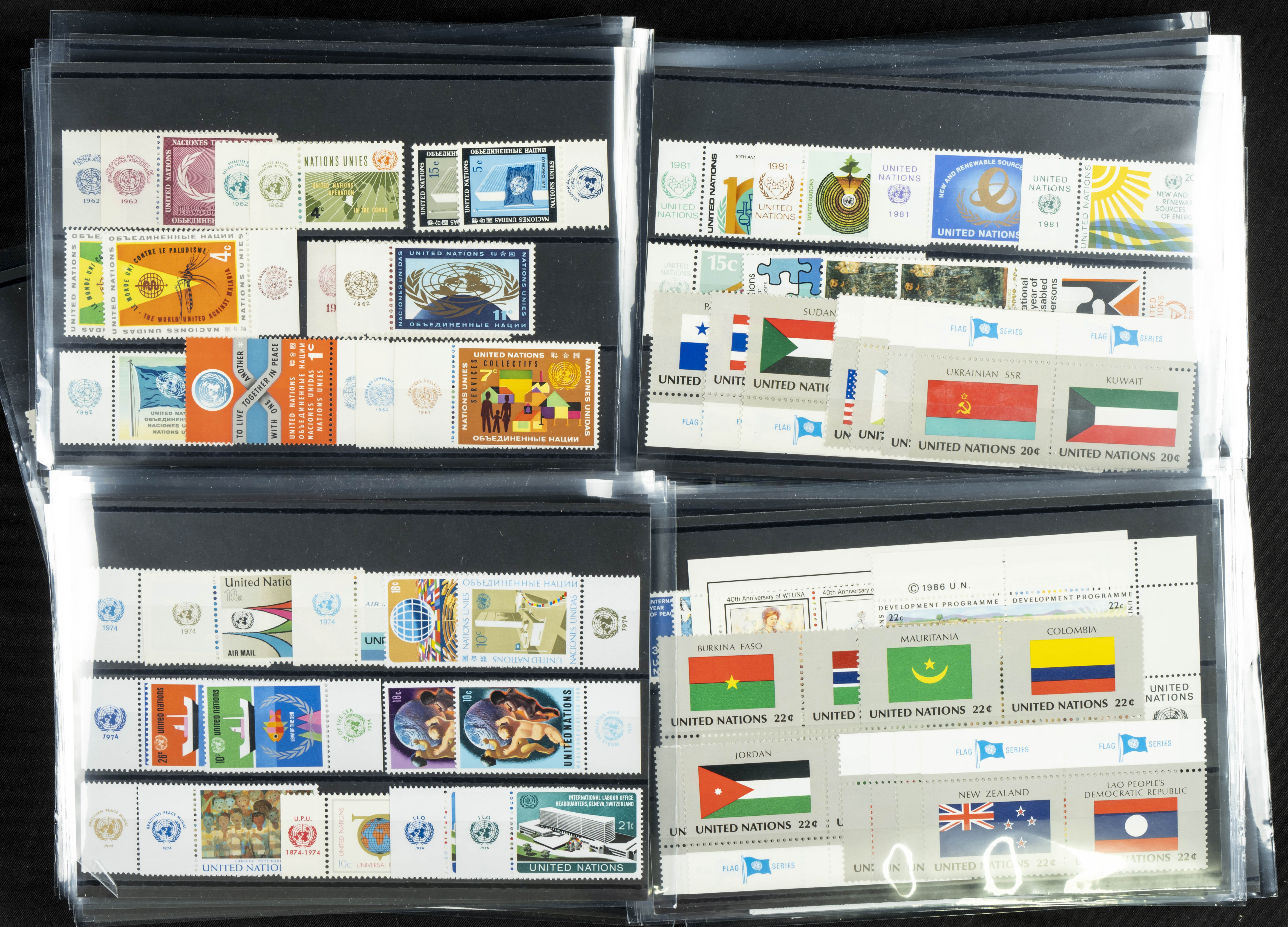 ★★(1951ca). Interesante conjunto-stock de Naciones Unidas (Nueva York, Ginebra y Viena) entre 1951 y 1997, en nuevo y con numerosas repeticiones en algunas series (hasta ciento sesenta series en algún caso), incluye hojas bloque y minihojas, además de varios cientos de Sobres de Primer Día. ALTISIMO VALOR DE CATALOGO. A EXAMINAR.