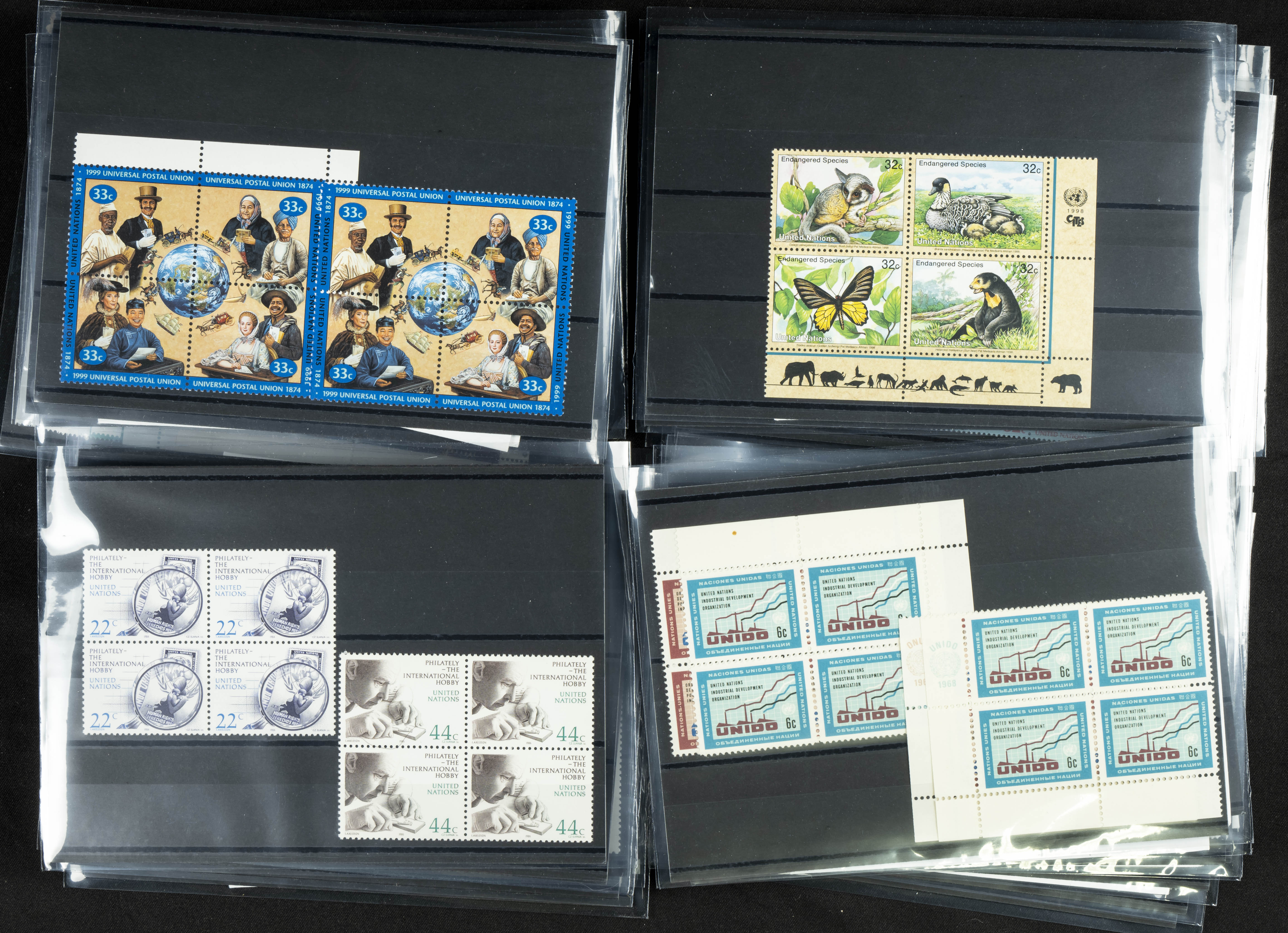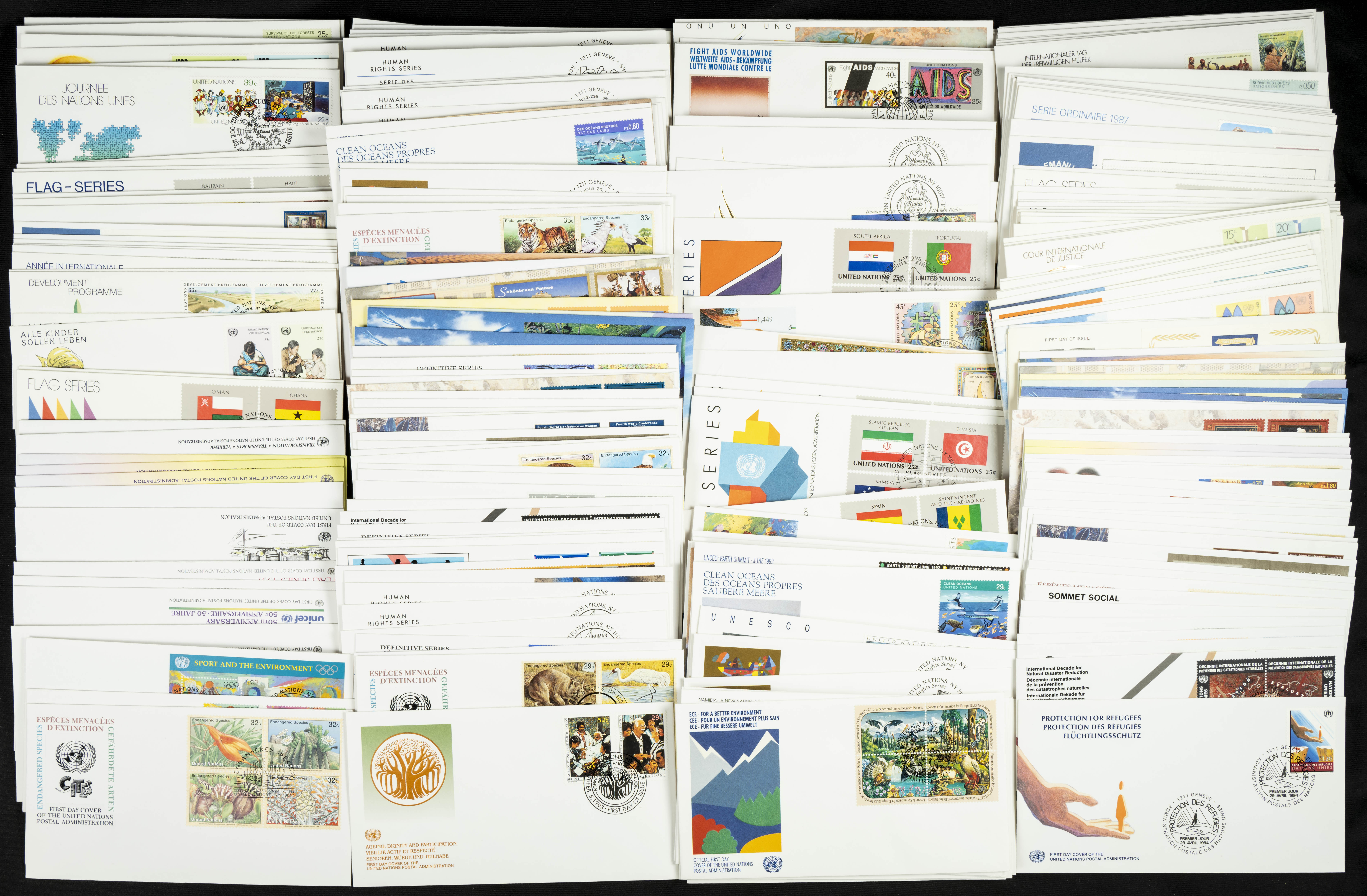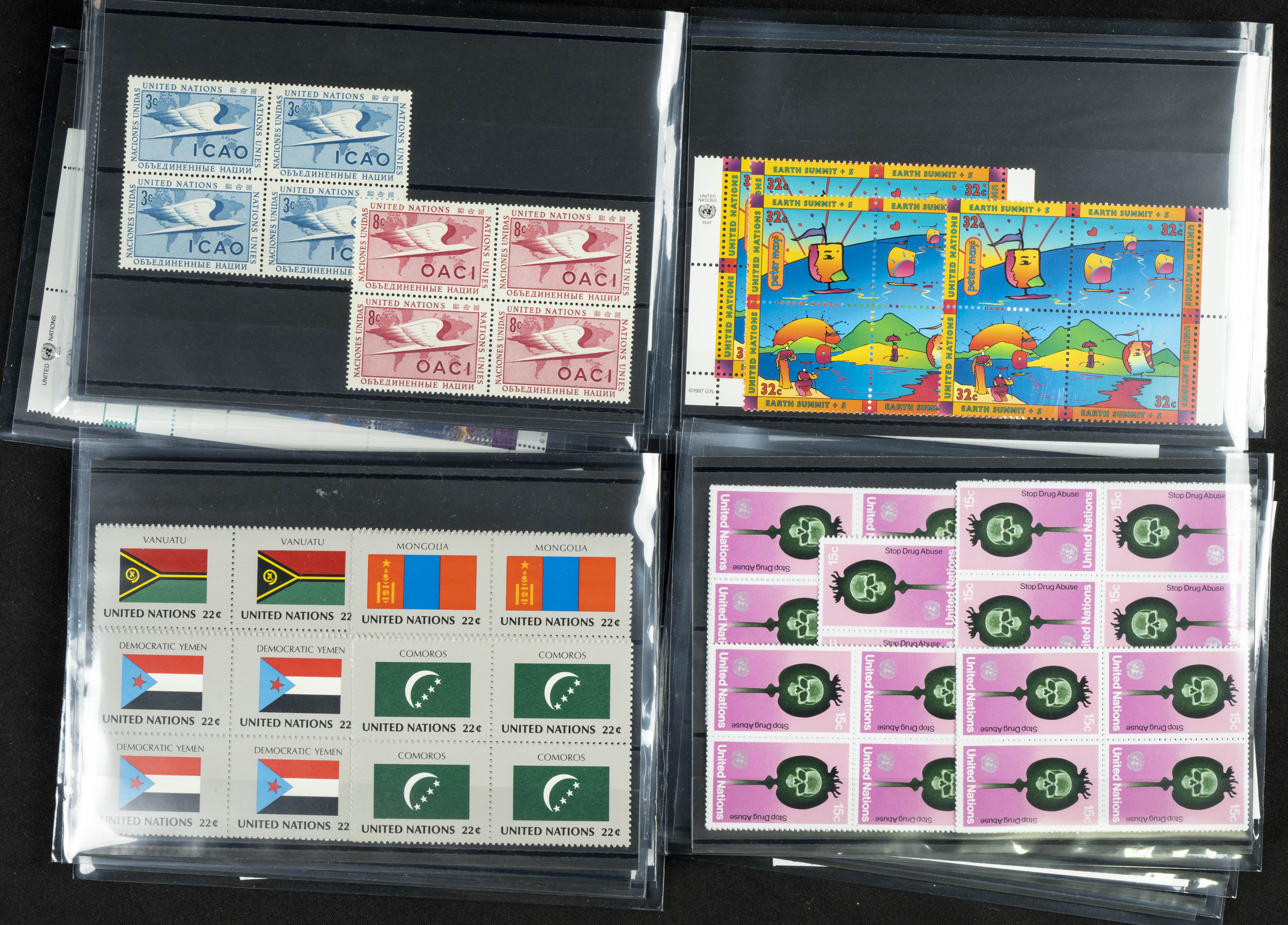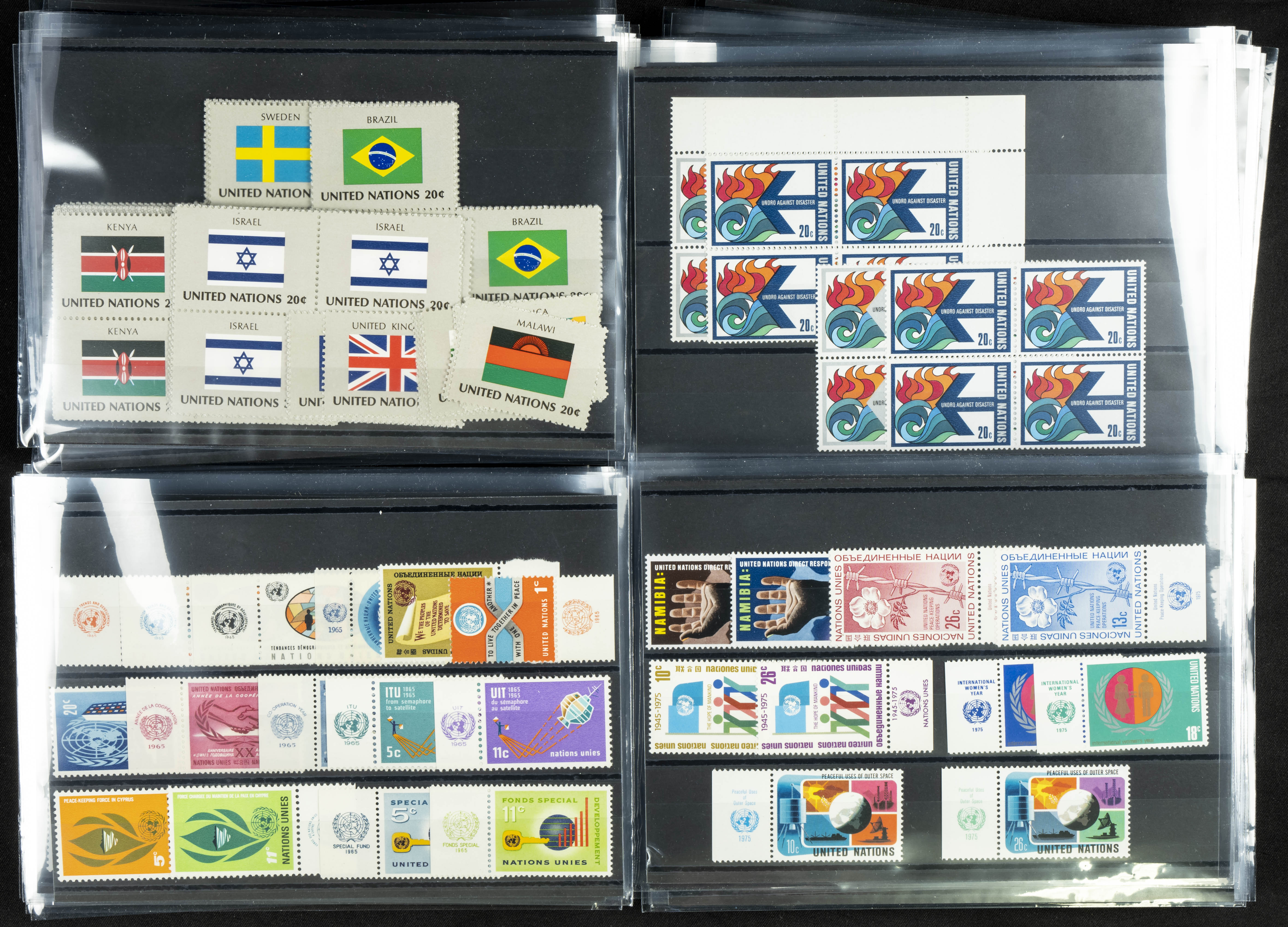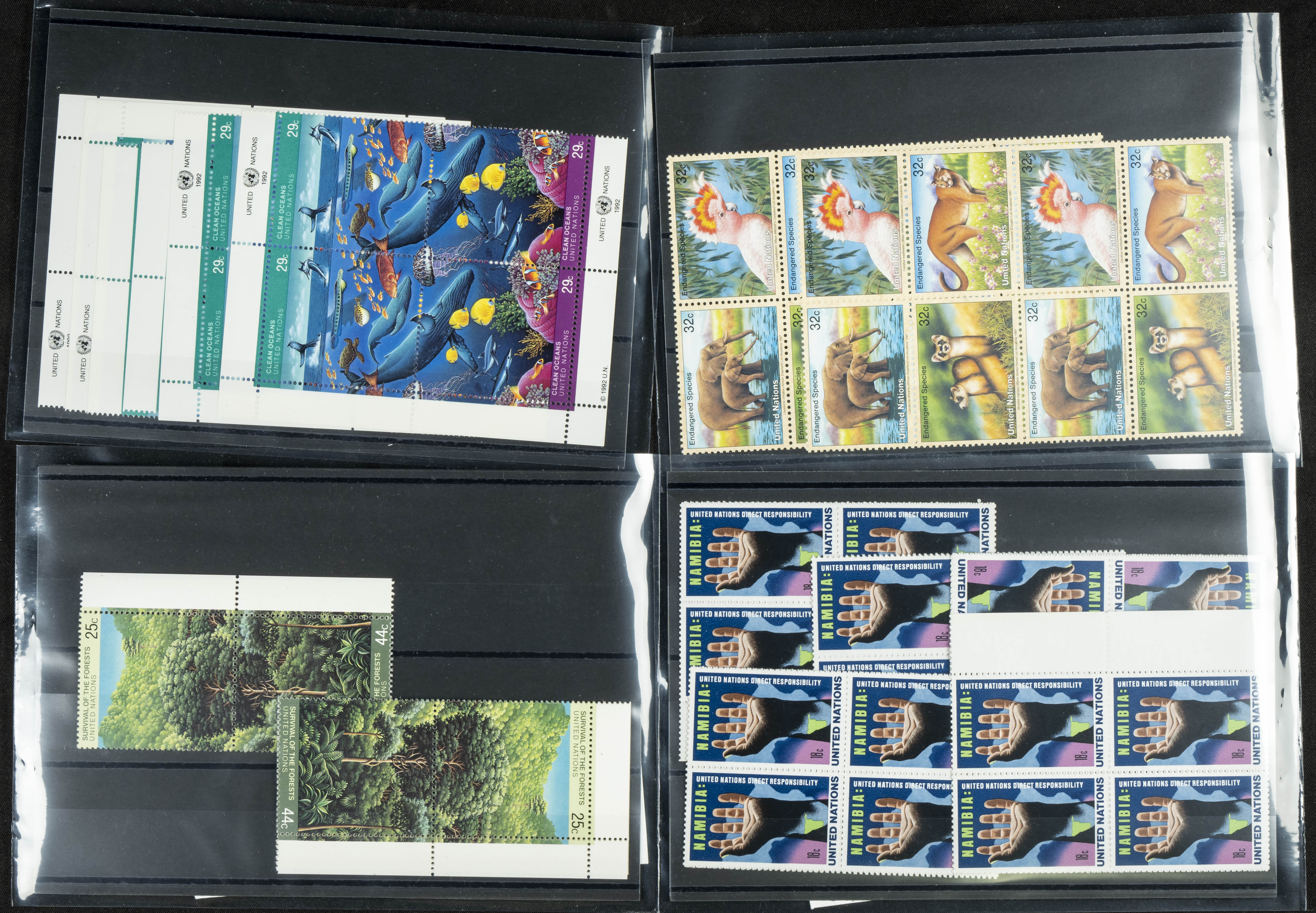 ★★(1951ca). Interesante conjunto-stock de Naciones Unidas (Nueva York, Ginebra y Viena) entre 1951 y 1997, en nuevo y con numerosas repeticiones en algunas series (hasta ciento sesenta series en algún caso), incluye hojas bloque y minihojas, además de varios cientos de Sobres de Primer Día. ALTISIMO VALOR DE CATALOGO. A EXAMINAR.
