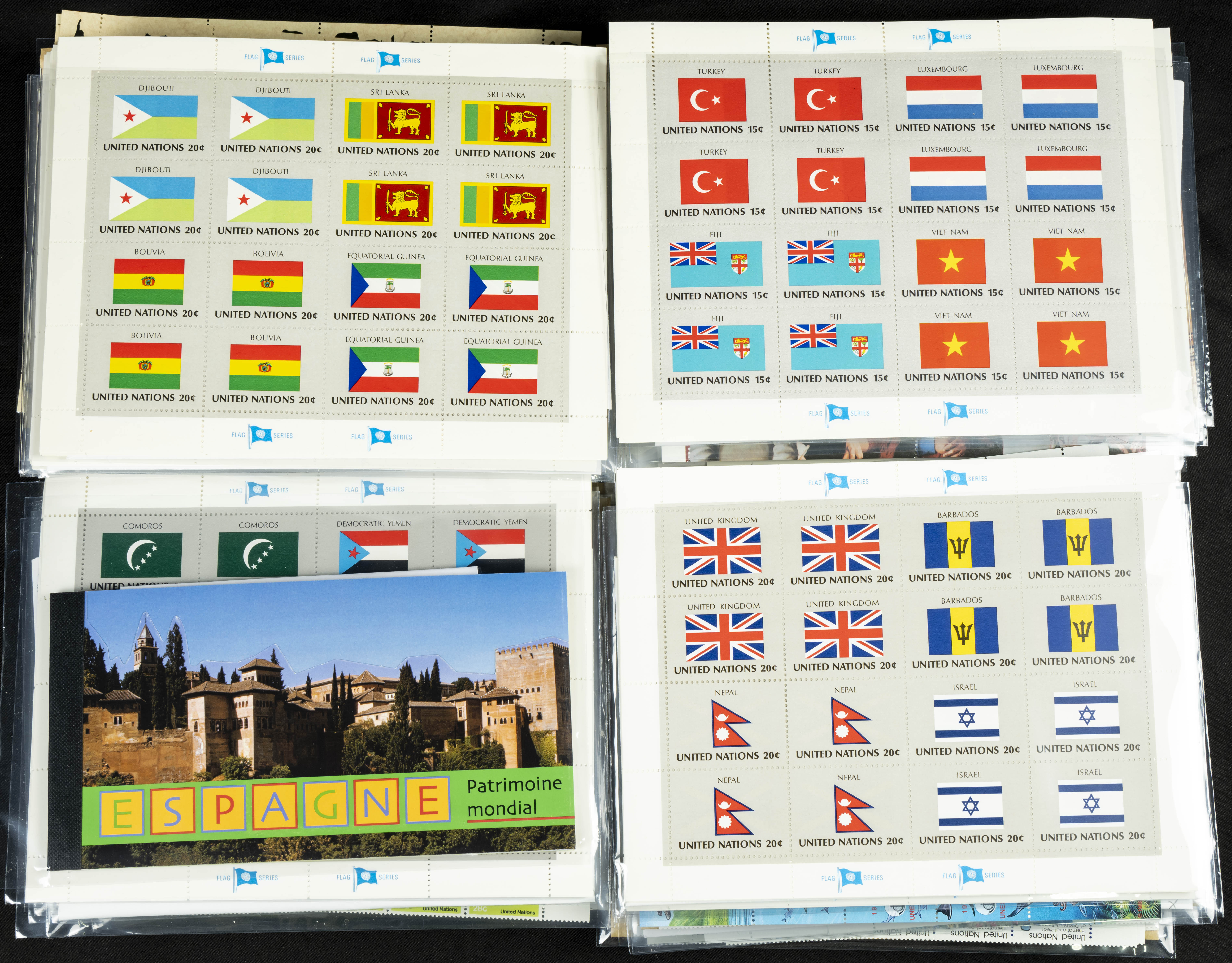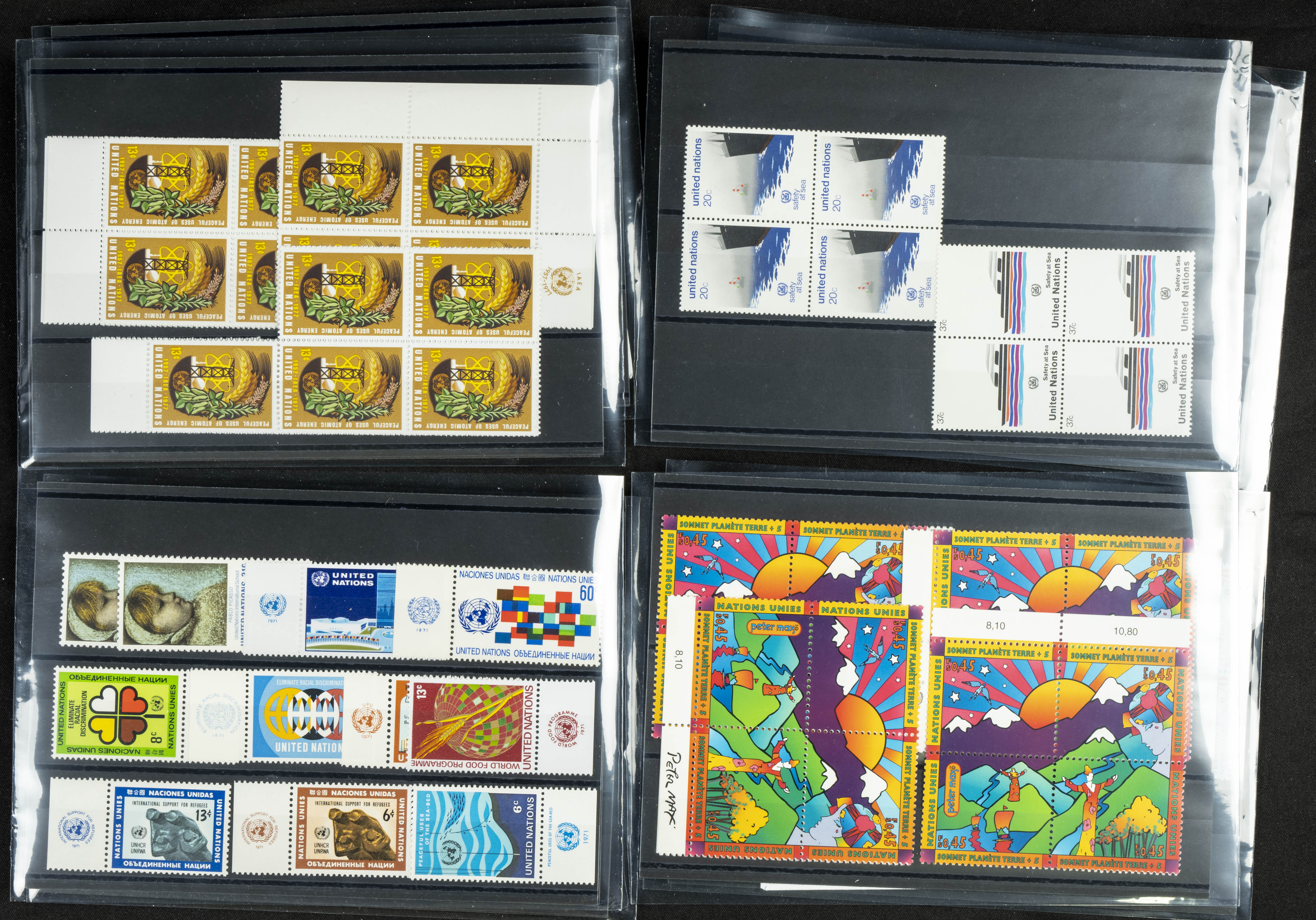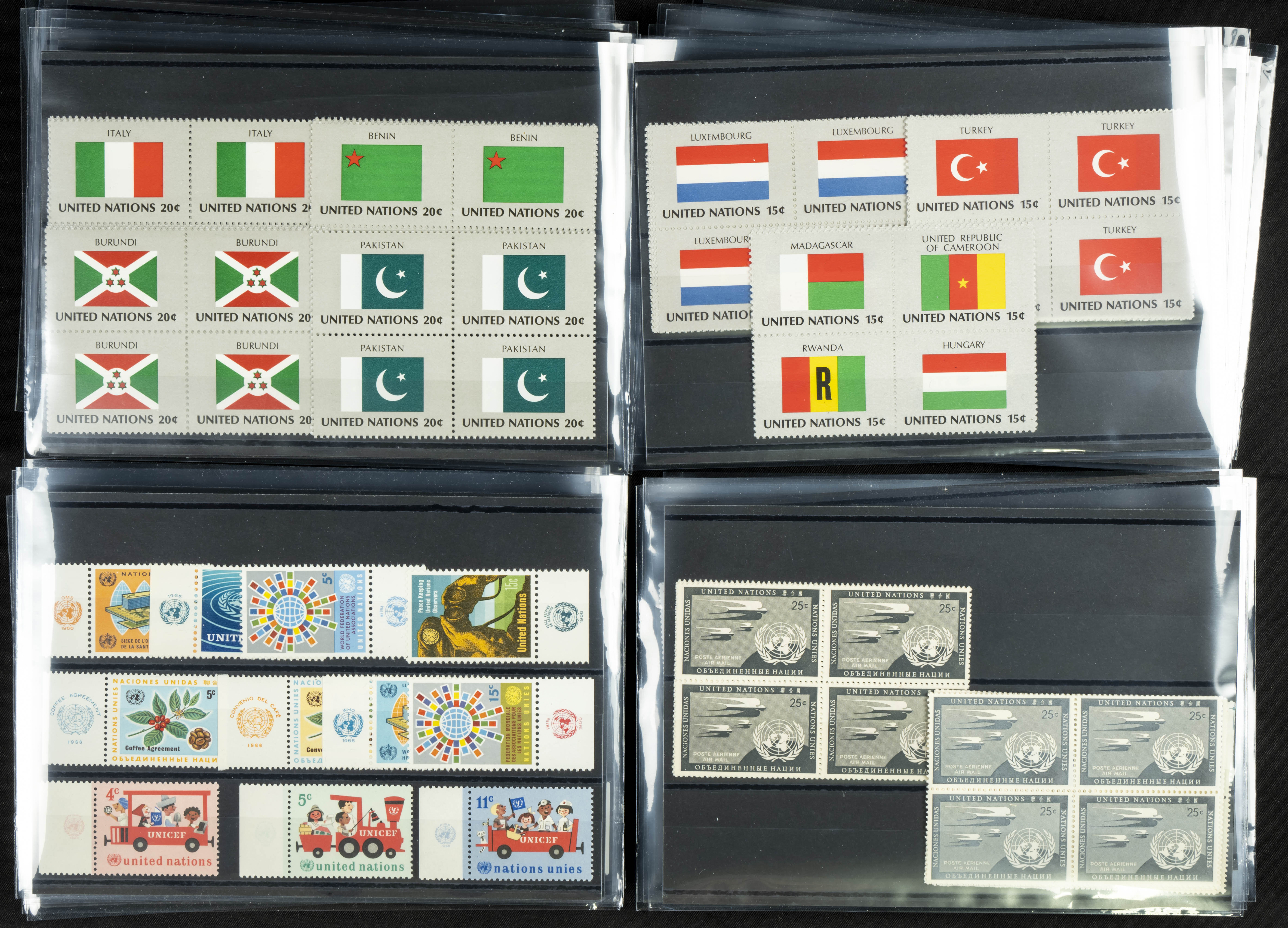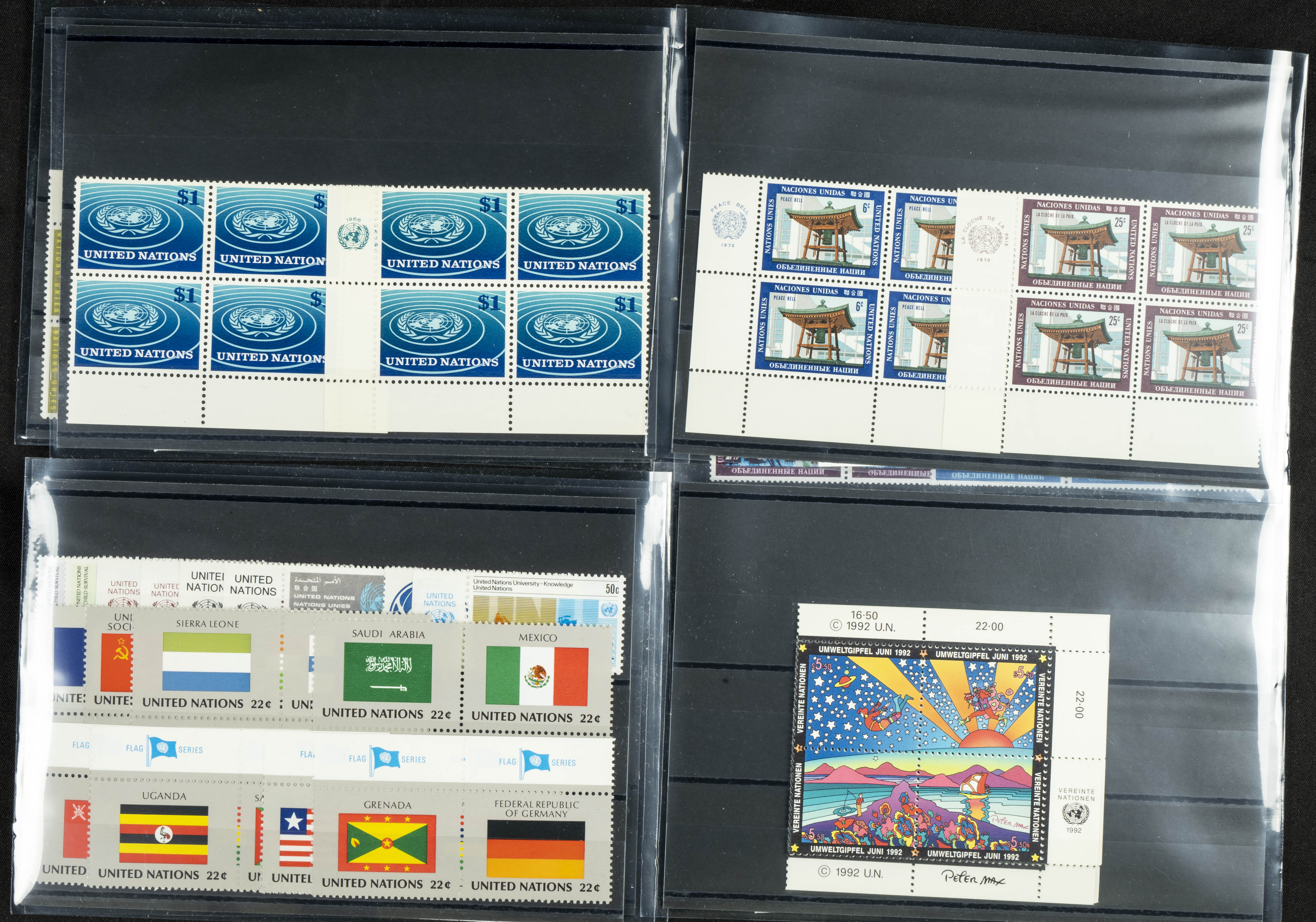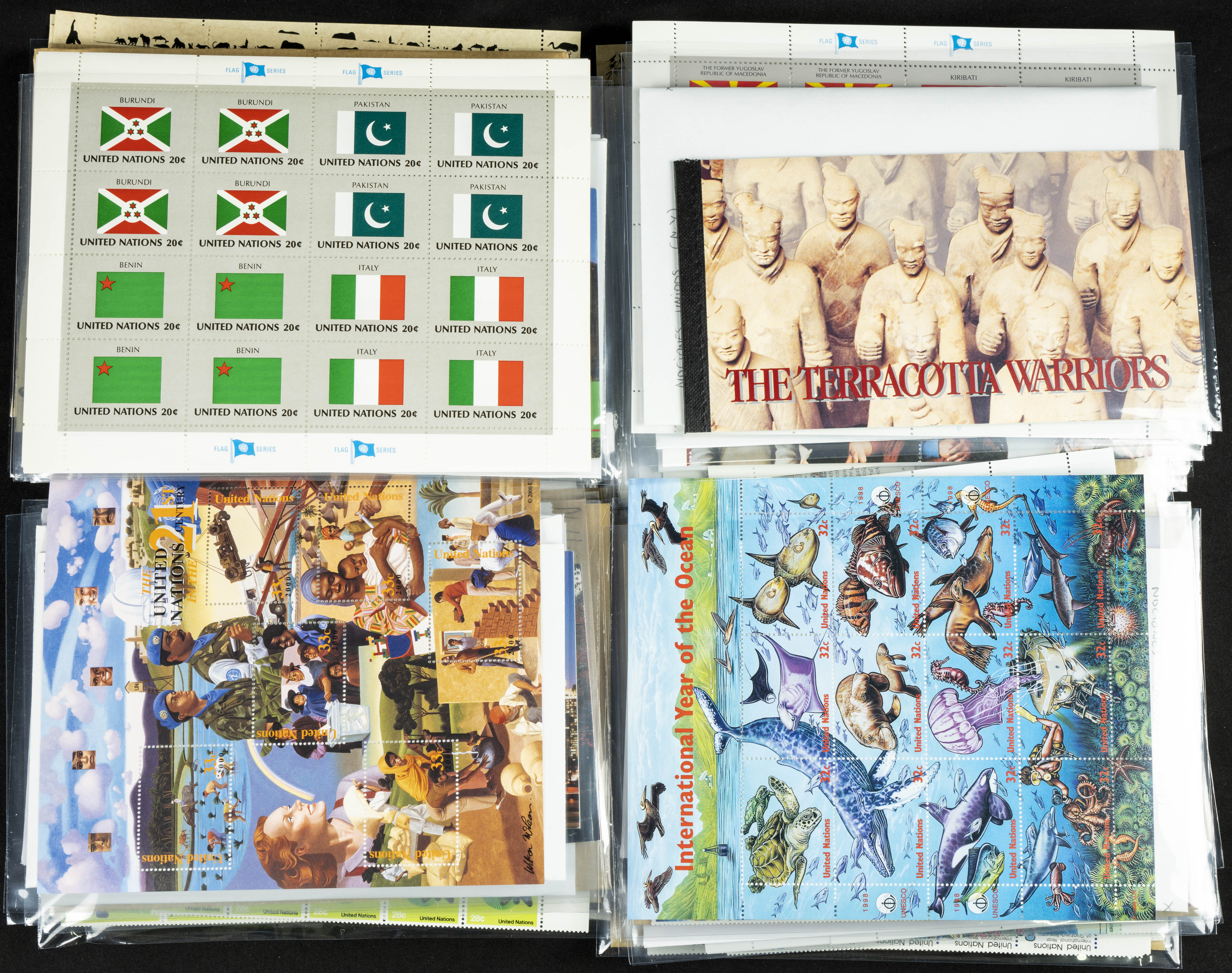 ★★(1951ca). Interesante conjunto-stock de Naciones Unidas (Nueva York, Ginebra y Viena) entre 1951 y 1997, en nuevo y con numerosas repeticiones en algunas series (hasta ciento sesenta series en algún caso), incluye hojas bloque y minihojas, además de varios cientos de Sobres de Primer Día. ALTISIMO VALOR DE CATALOGO. A EXAMINAR.