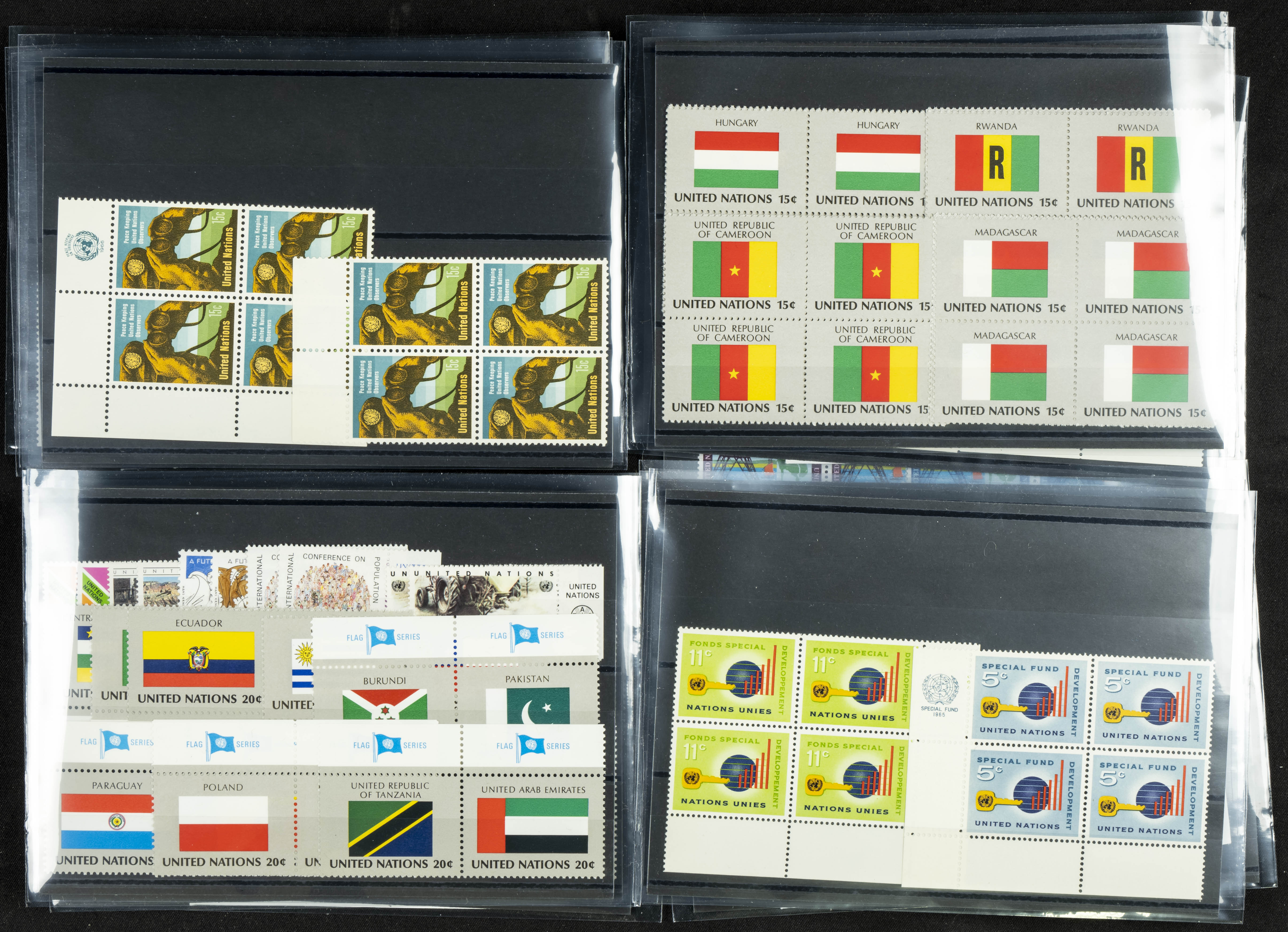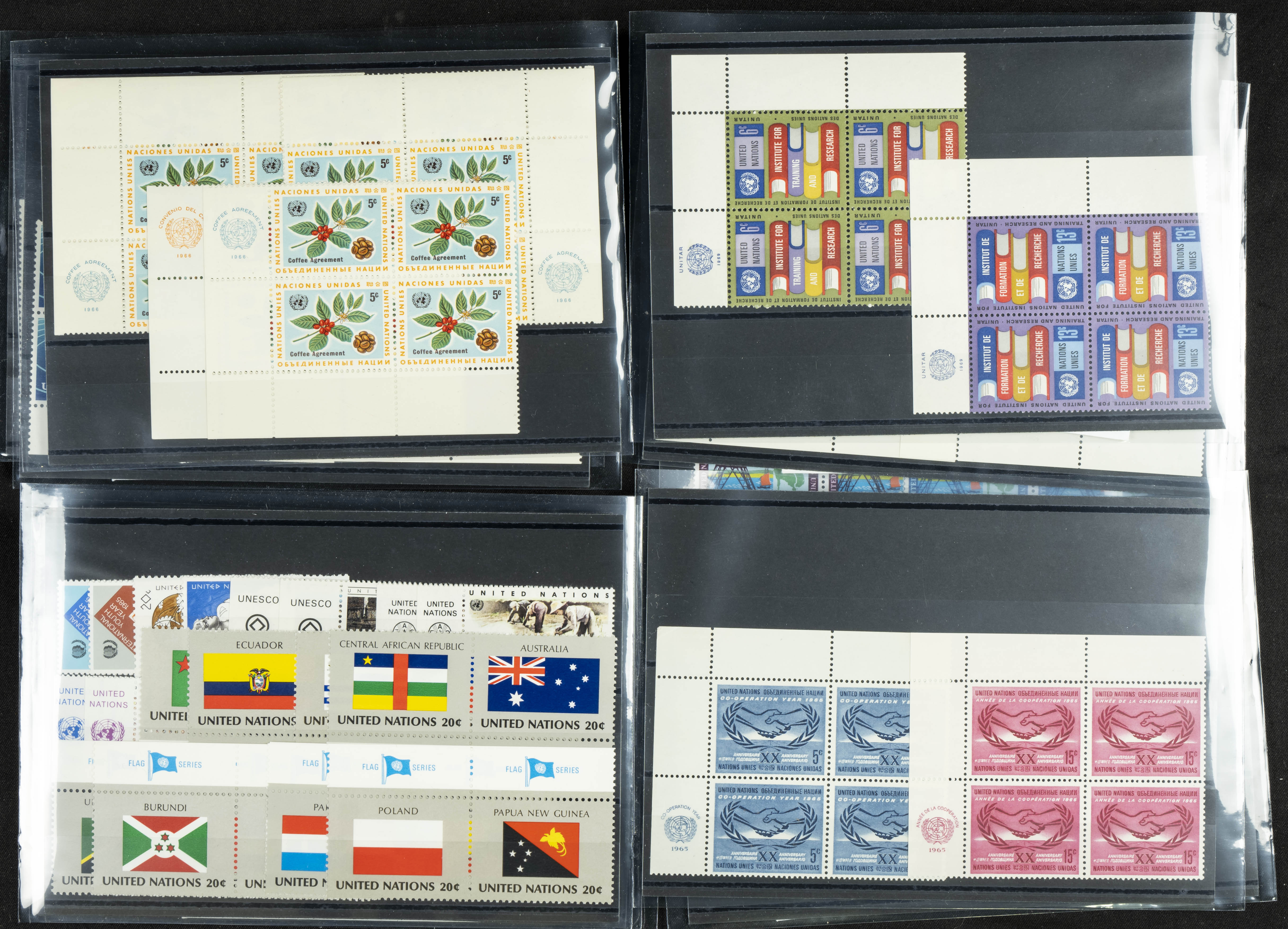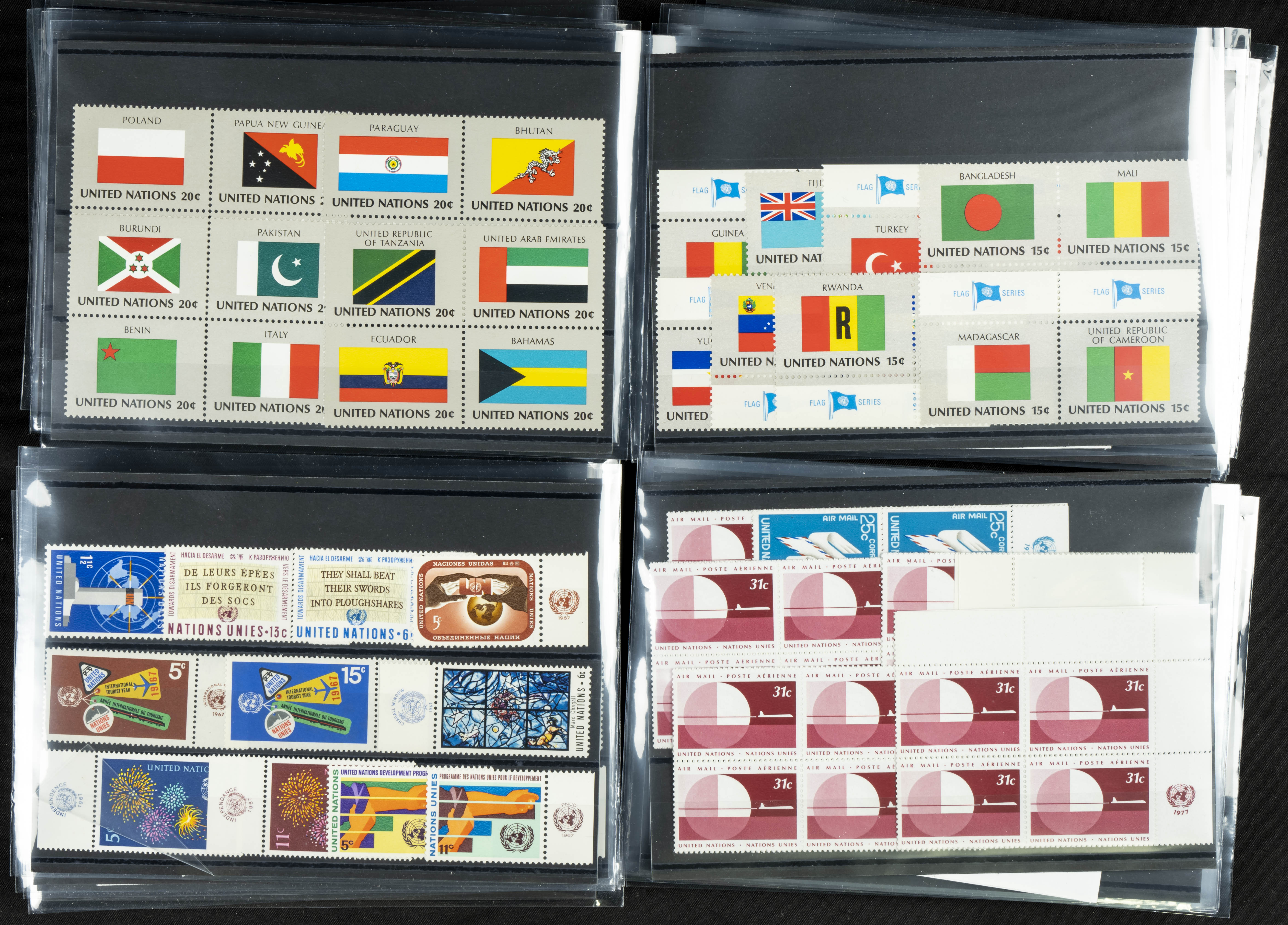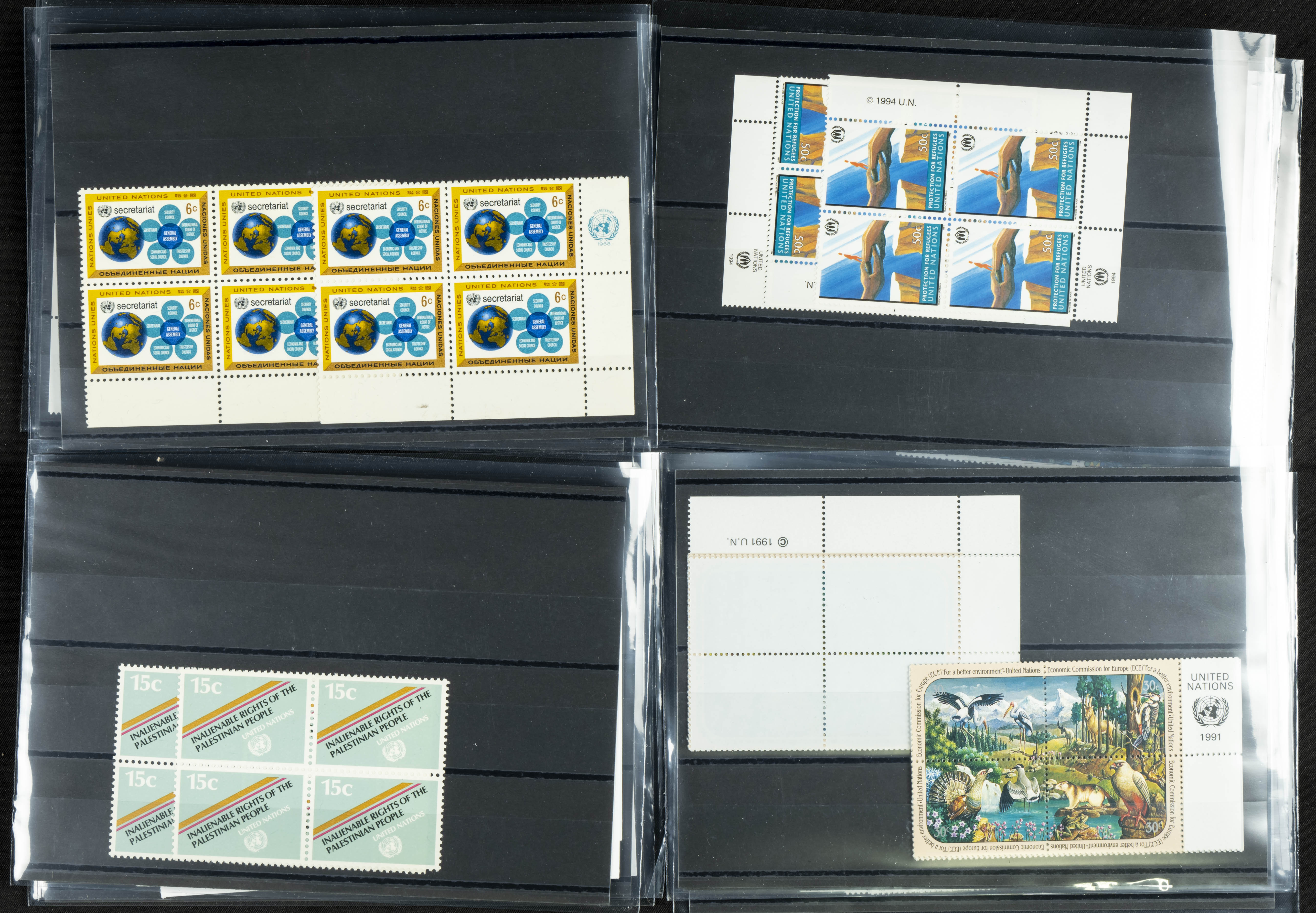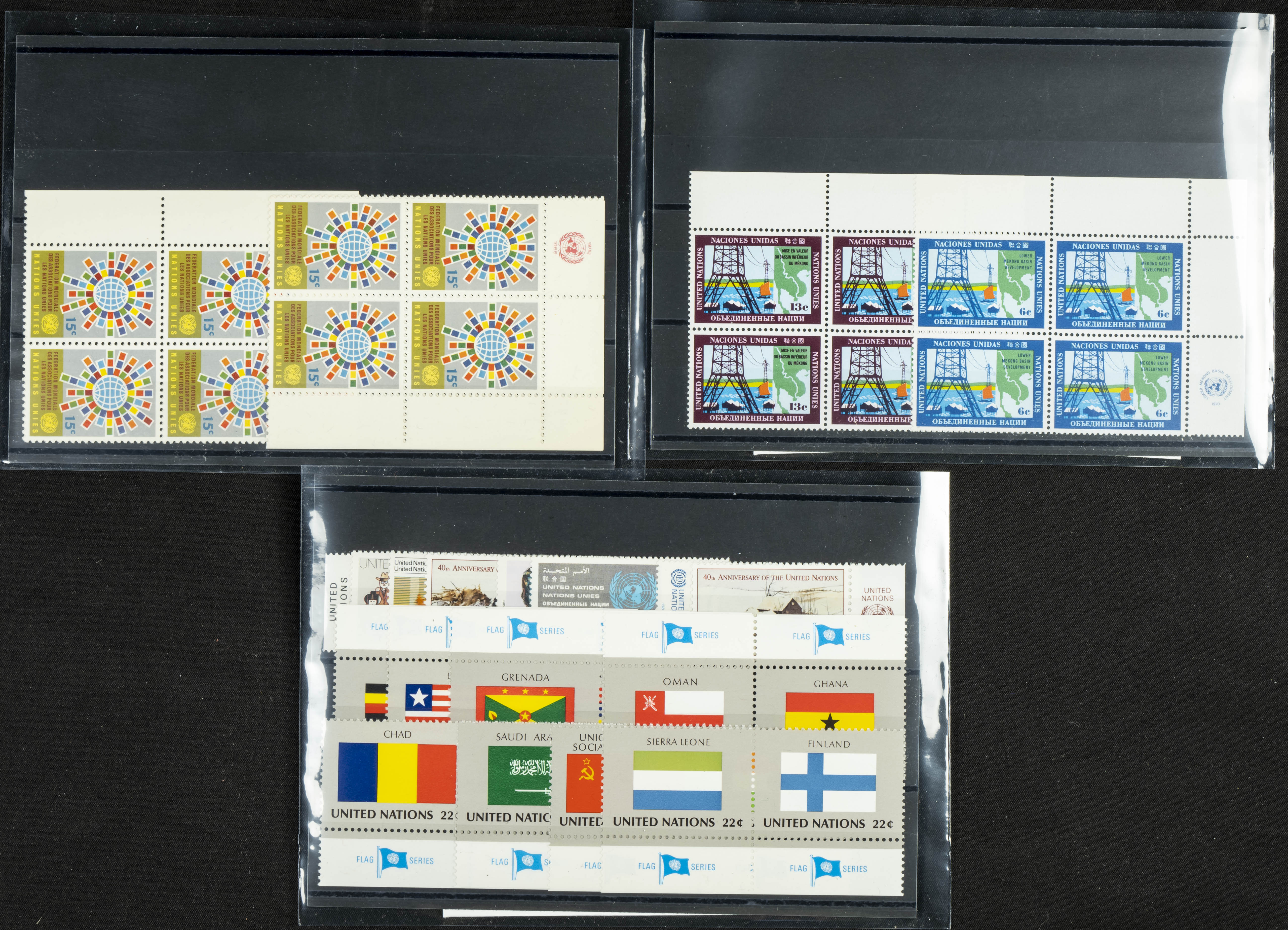 ★★(1951ca). Interesante conjunto-stock de Naciones Unidas (Nueva York, Ginebra y Viena) entre 1951 y 1997, en nuevo y con numerosas repeticiones en algunas series (hasta ciento sesenta series en algún caso), incluye hojas bloque y minihojas, además de varios cientos de Sobres de Primer Día. ALTISIMO VALOR DE CATALOGO. A EXAMINAR.