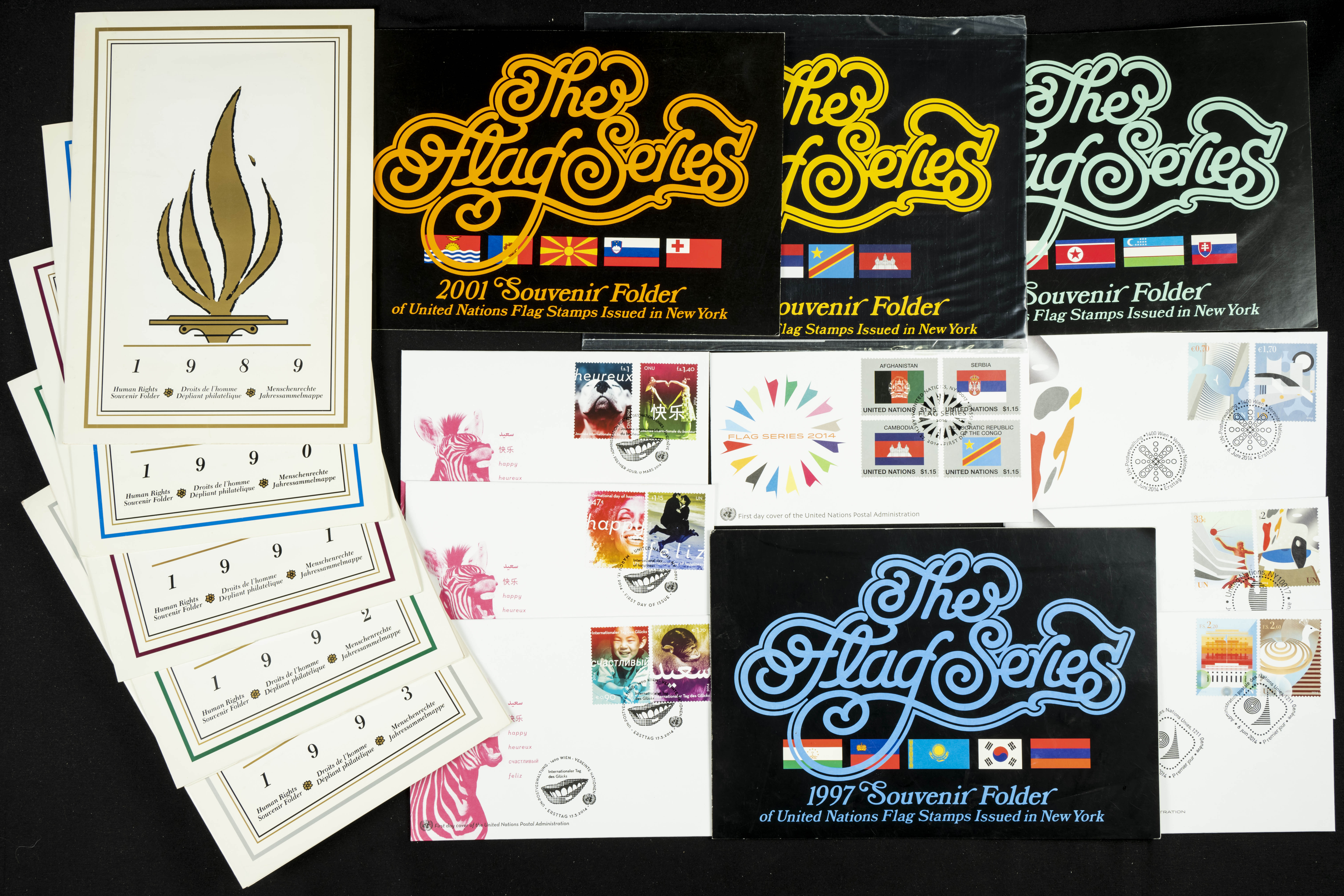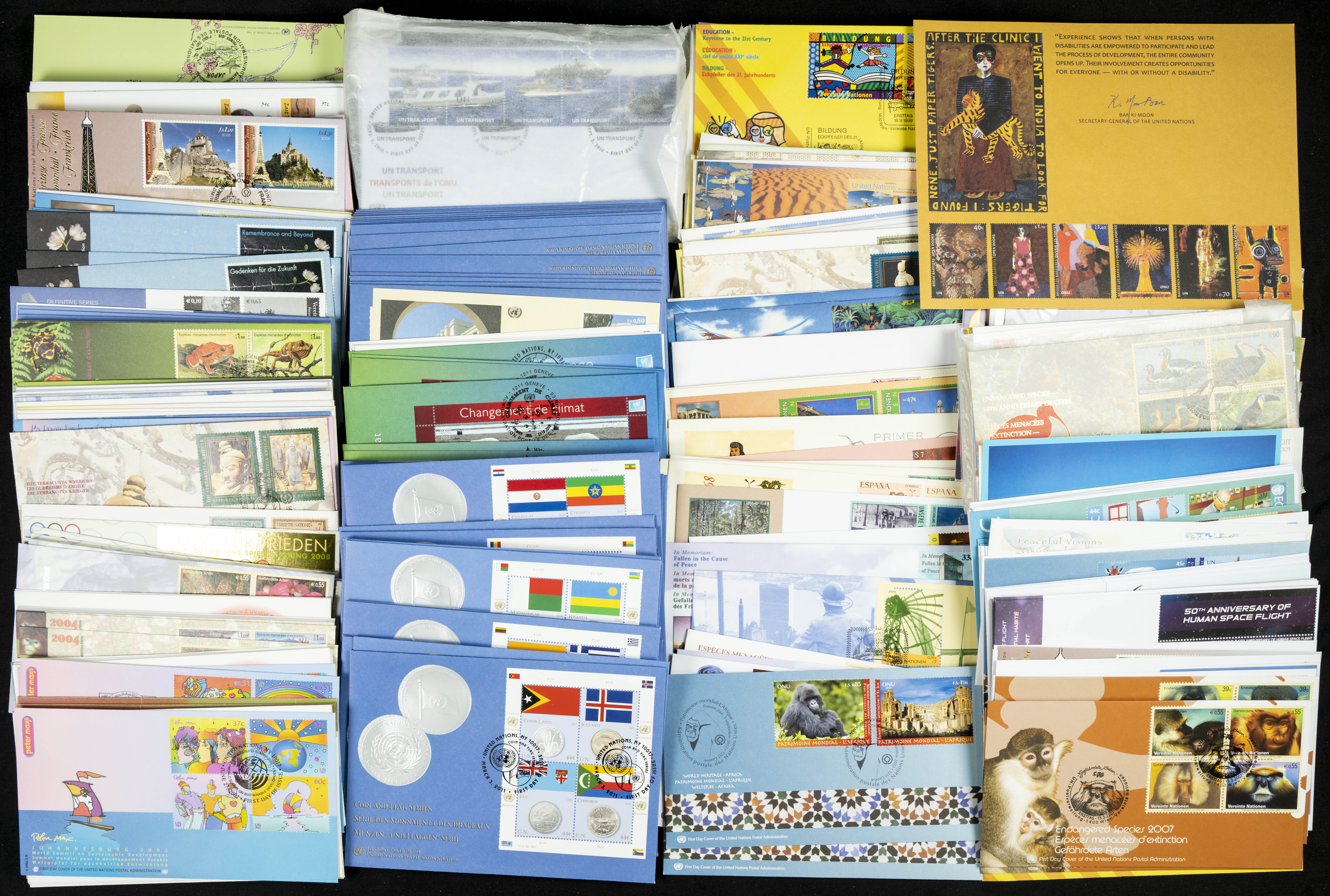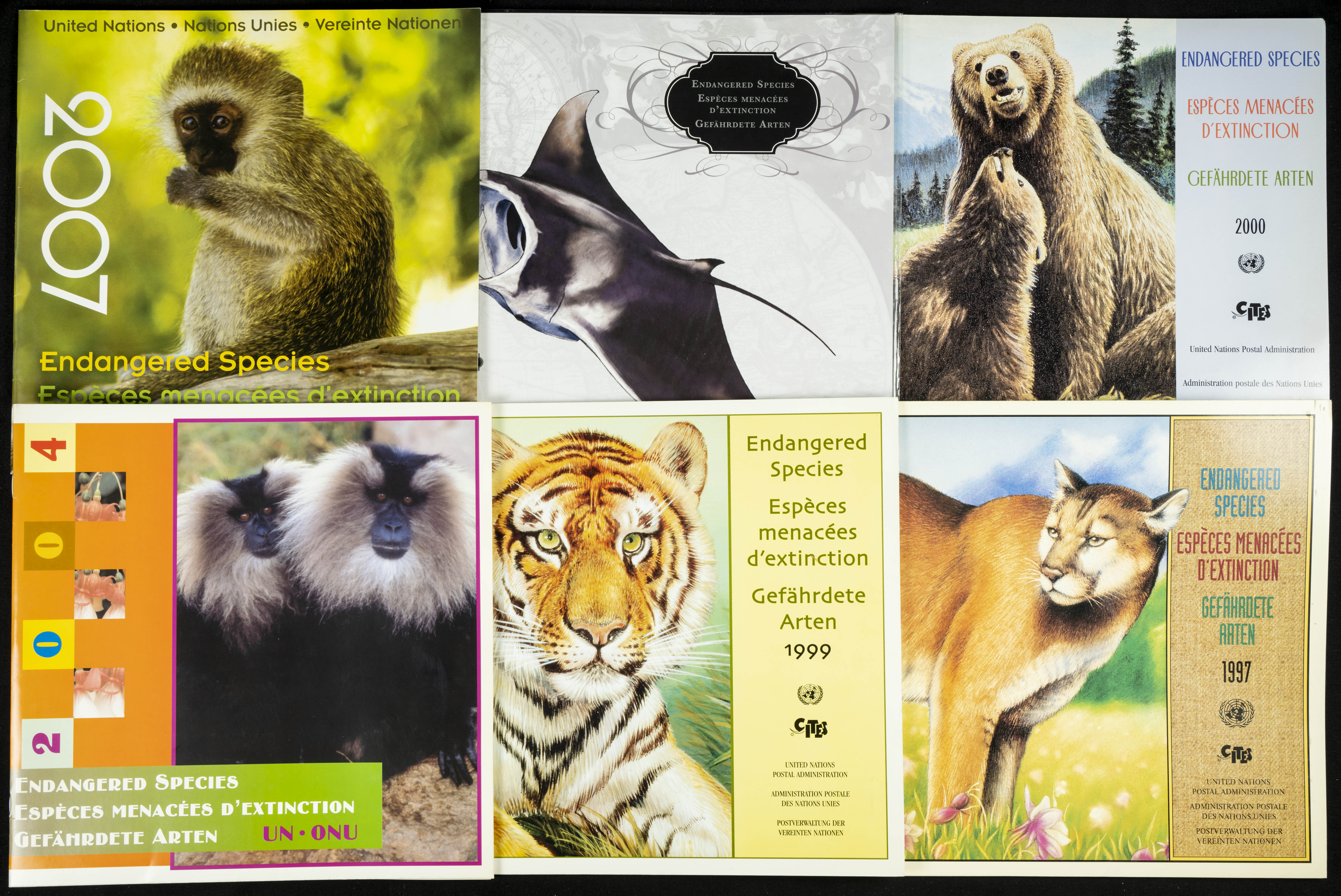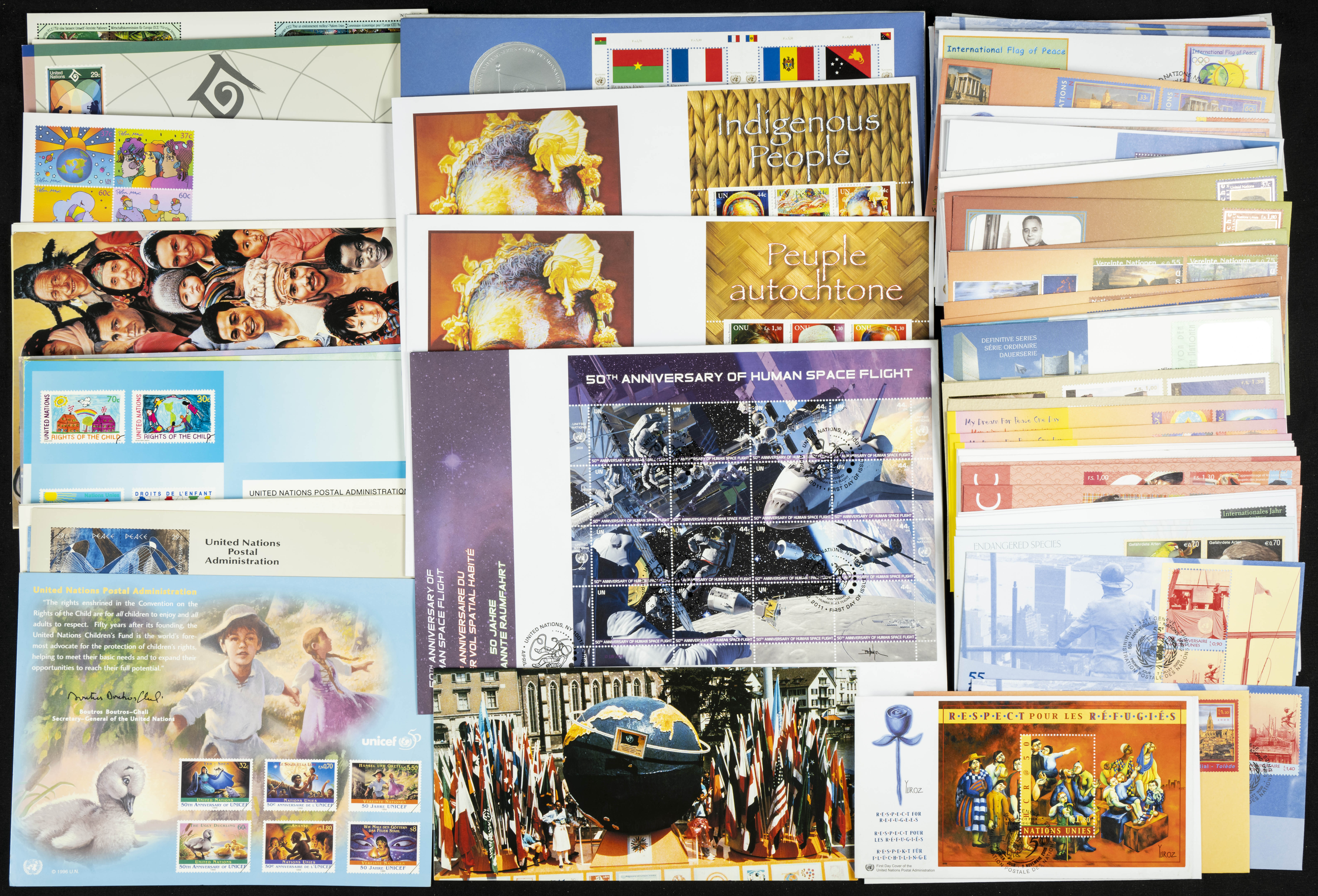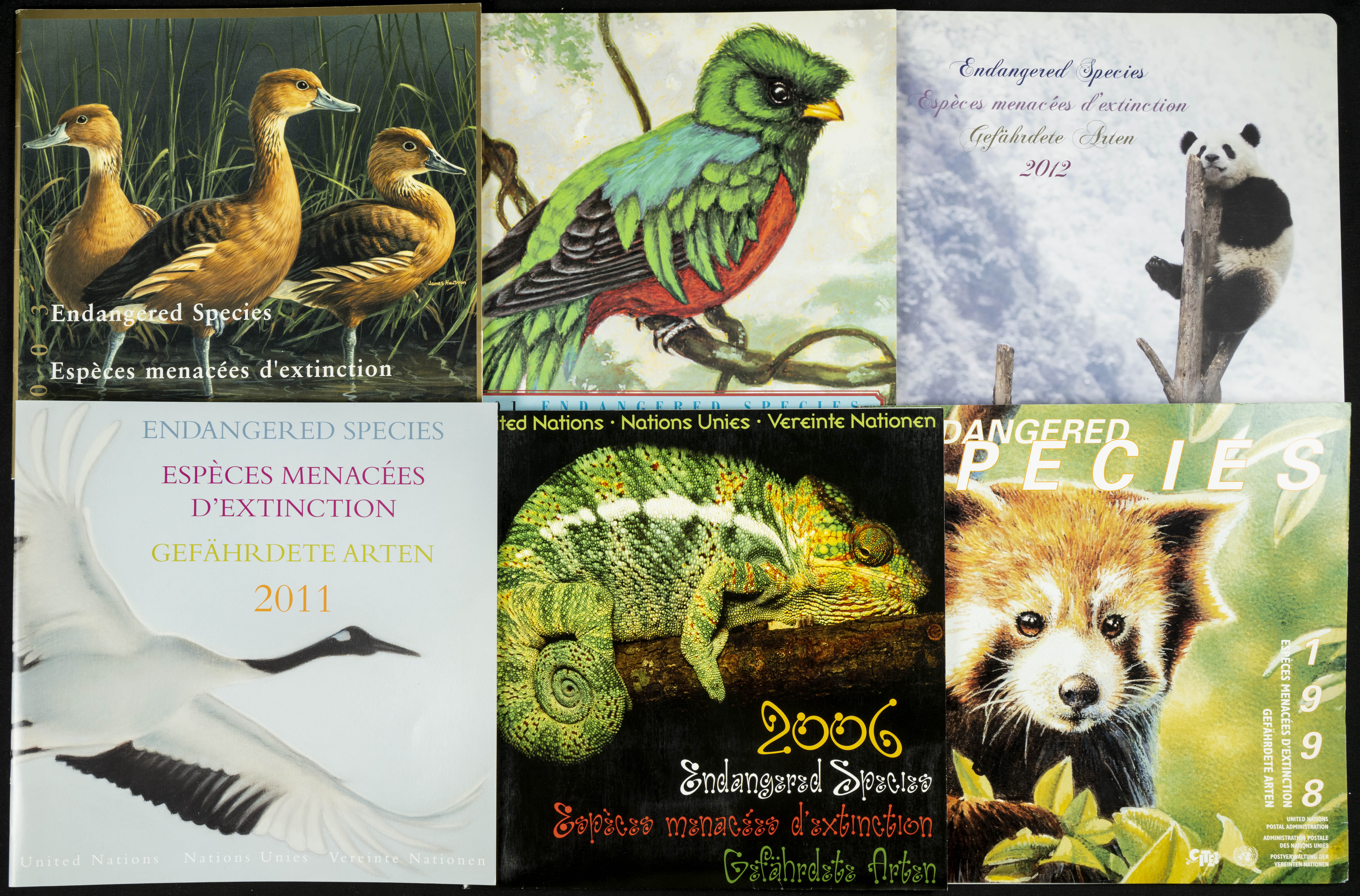 ★★/(1994ca). Conjunto de series completas y sobres de Primer Día de Naciones Unidas entre 1994 y 2012, incluye las oficinas de Ginebra y Viena, además de los libros de Especies en Peligro de Extinción y tarjetas conmemorativas. ALTO VALOR DE CATALOGO. A EXAMINAR