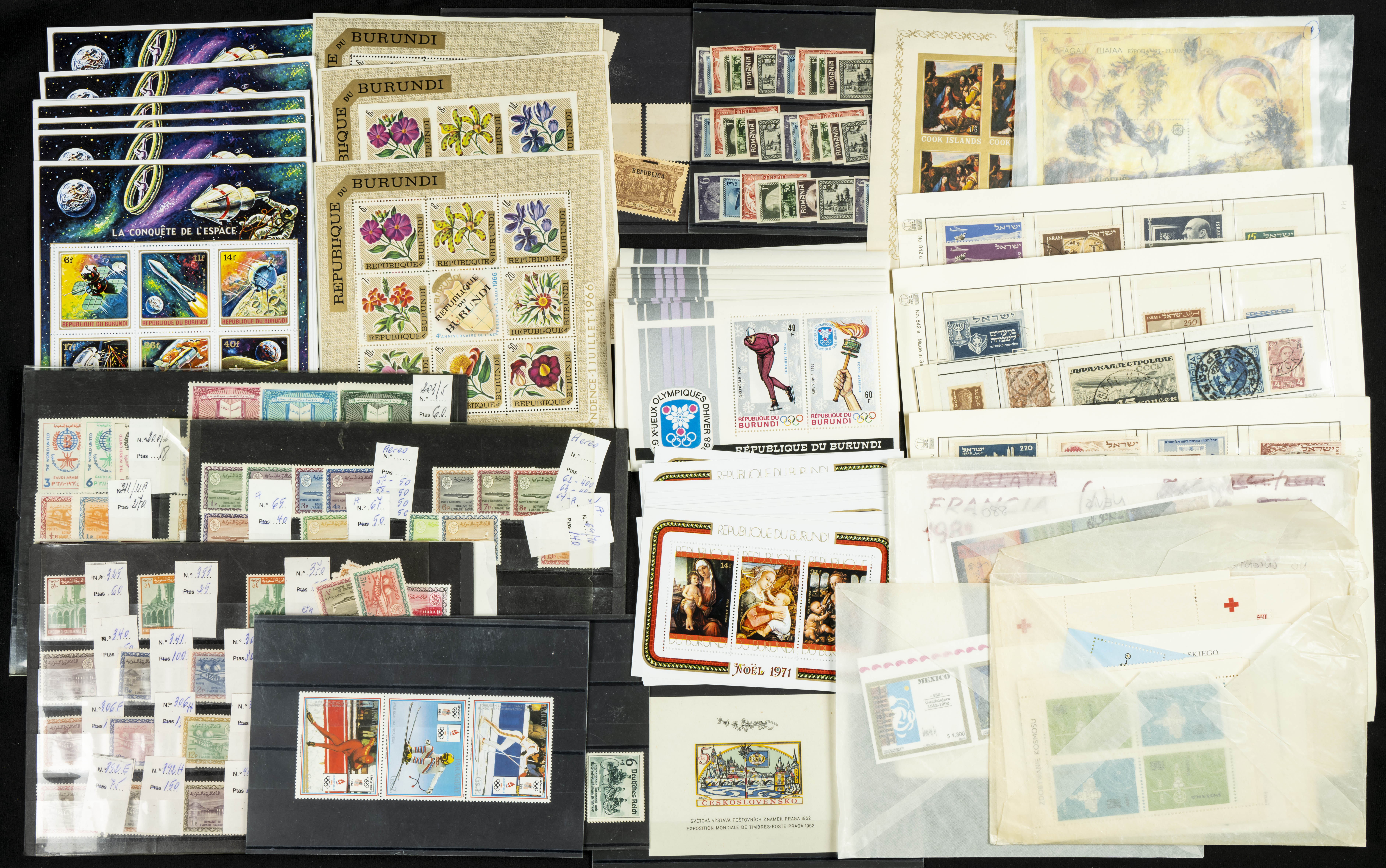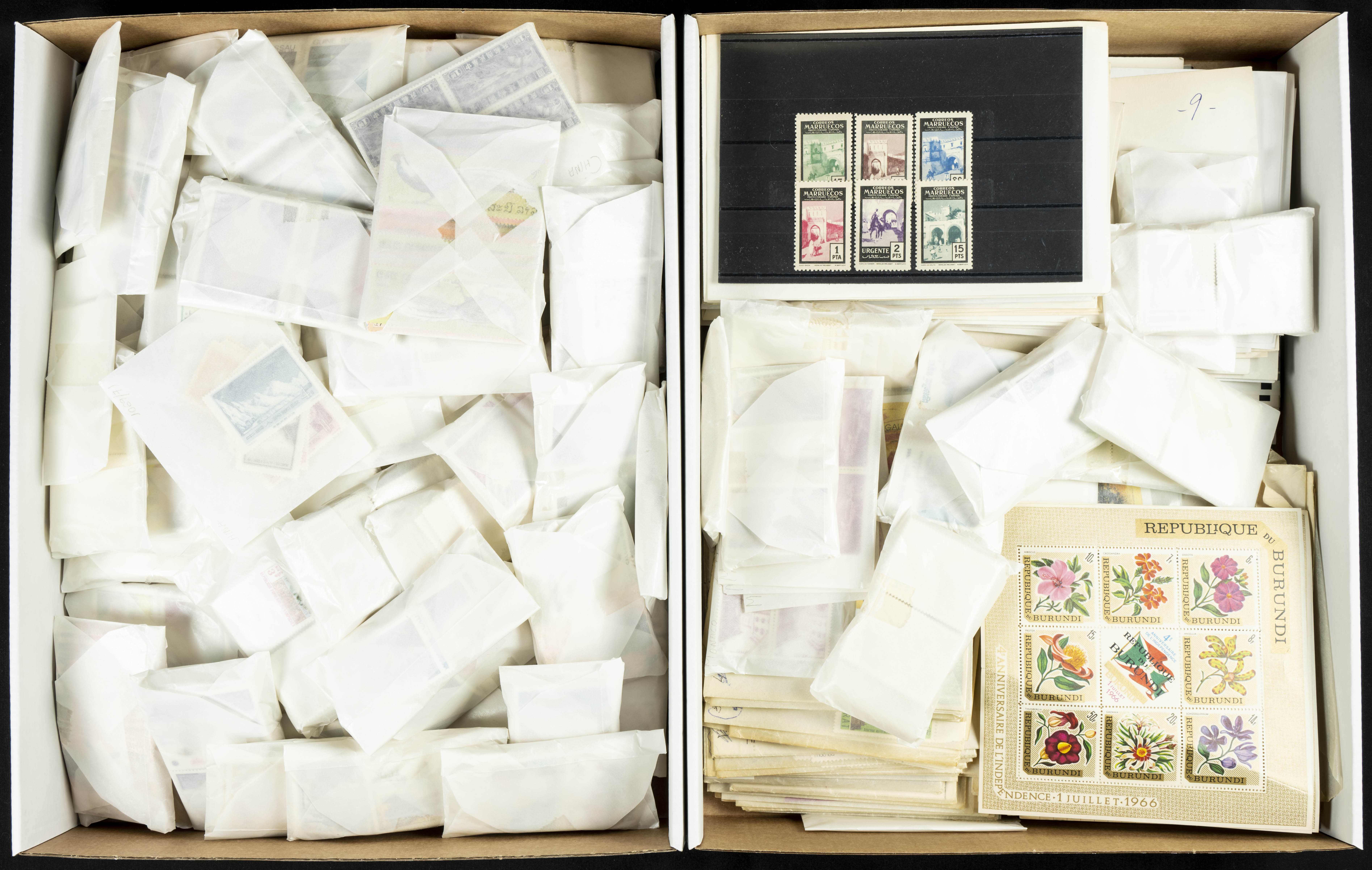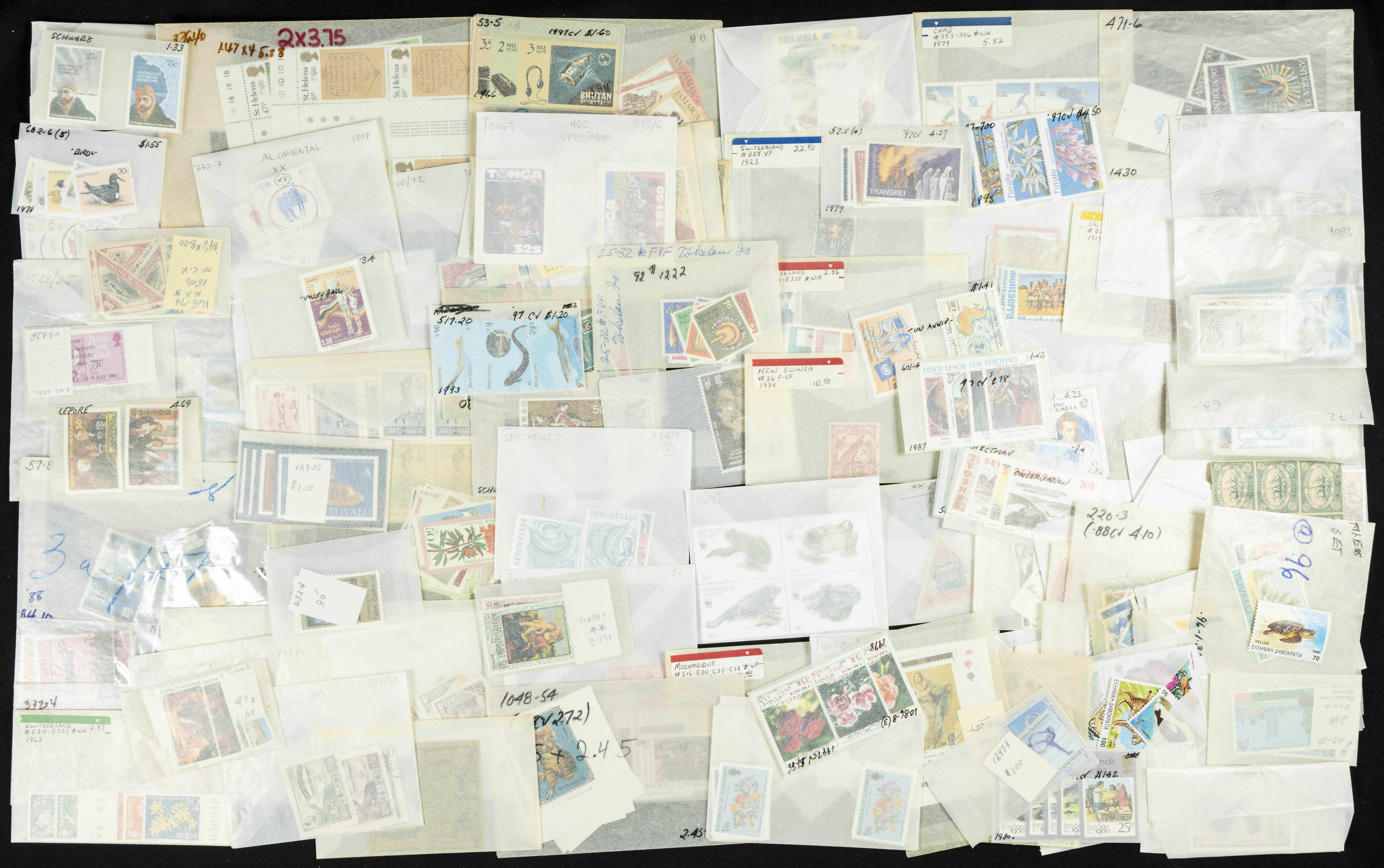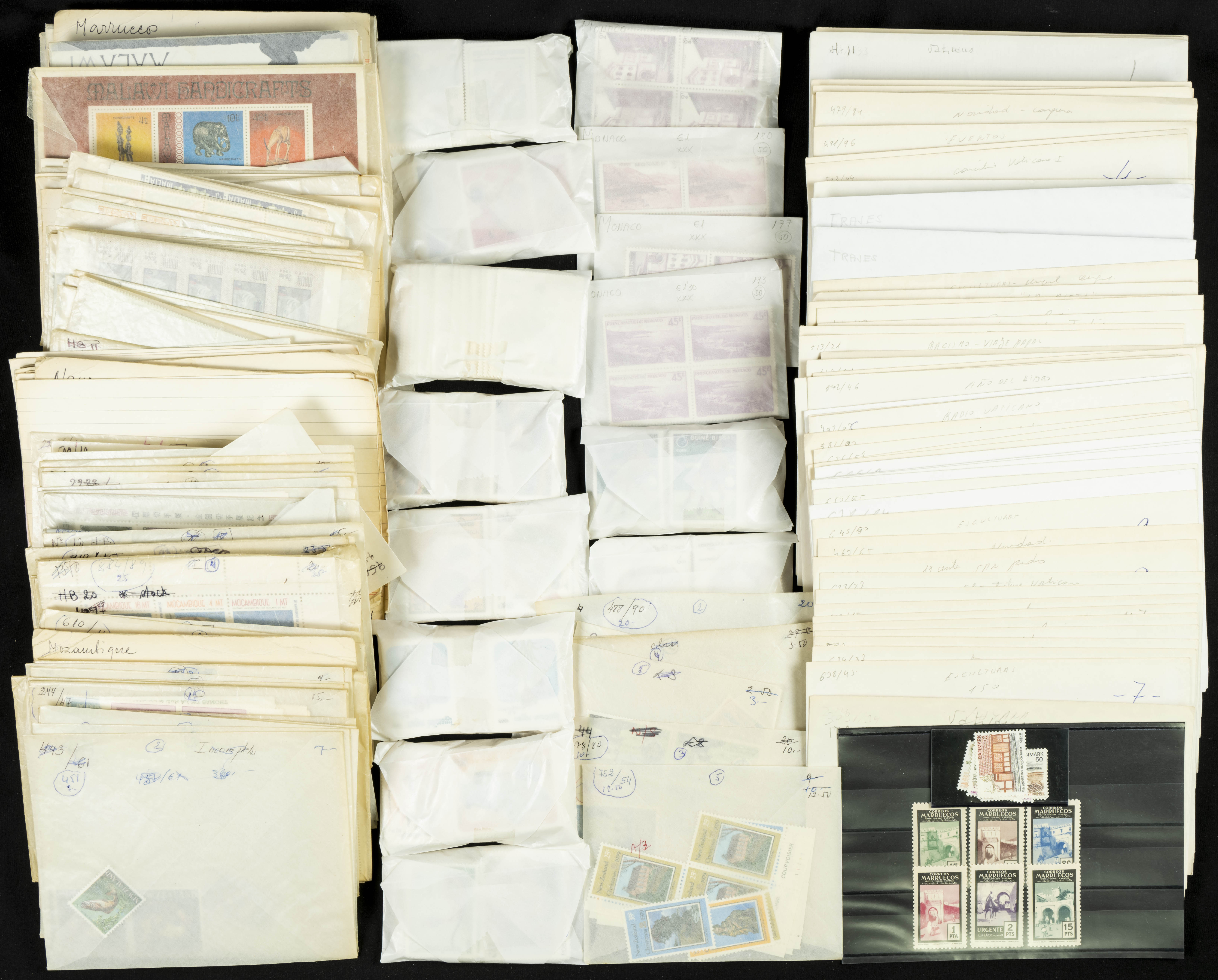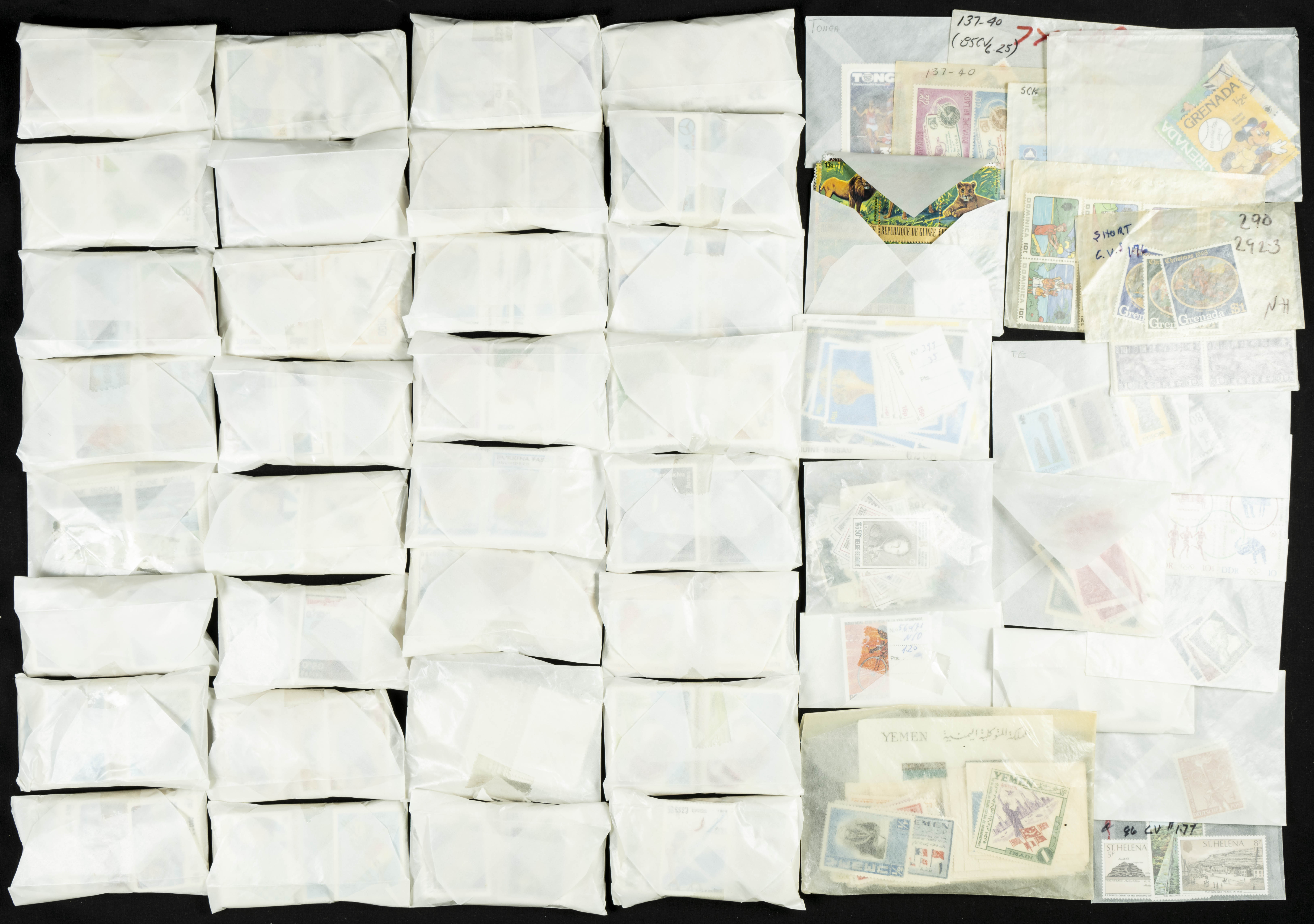 ★★/(1950ca). Interesante conjunto de miles de sellos, series completas y hojas bloque de diversos países, generalmente entre 1940 y 1980, en nuevo (alguna usada) y la mayoría series temáticas y una parte organizada en sobres. ALTO VALOR DE CATALOGO. A EXAMINAR.