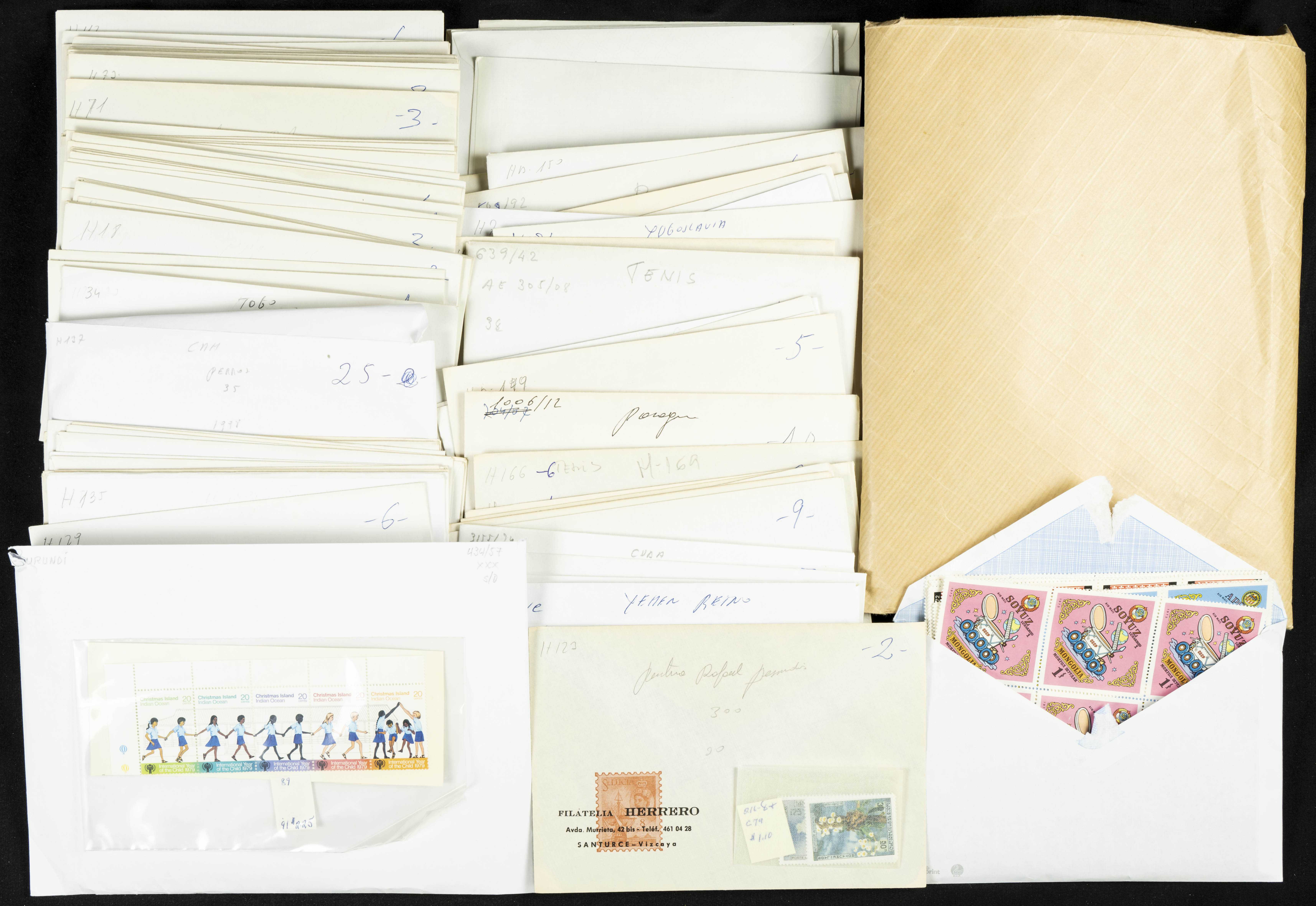 ★★(1970ca). Conjunto de cientos de series completas y hojas bloque de diversos países, la mayoría de los años setenta y ochenta, en nuevo y con algunas repeticiones, una gran parte organizado en sobres. ALTO VALOR DE CATALOGO. A EXAMINAR.