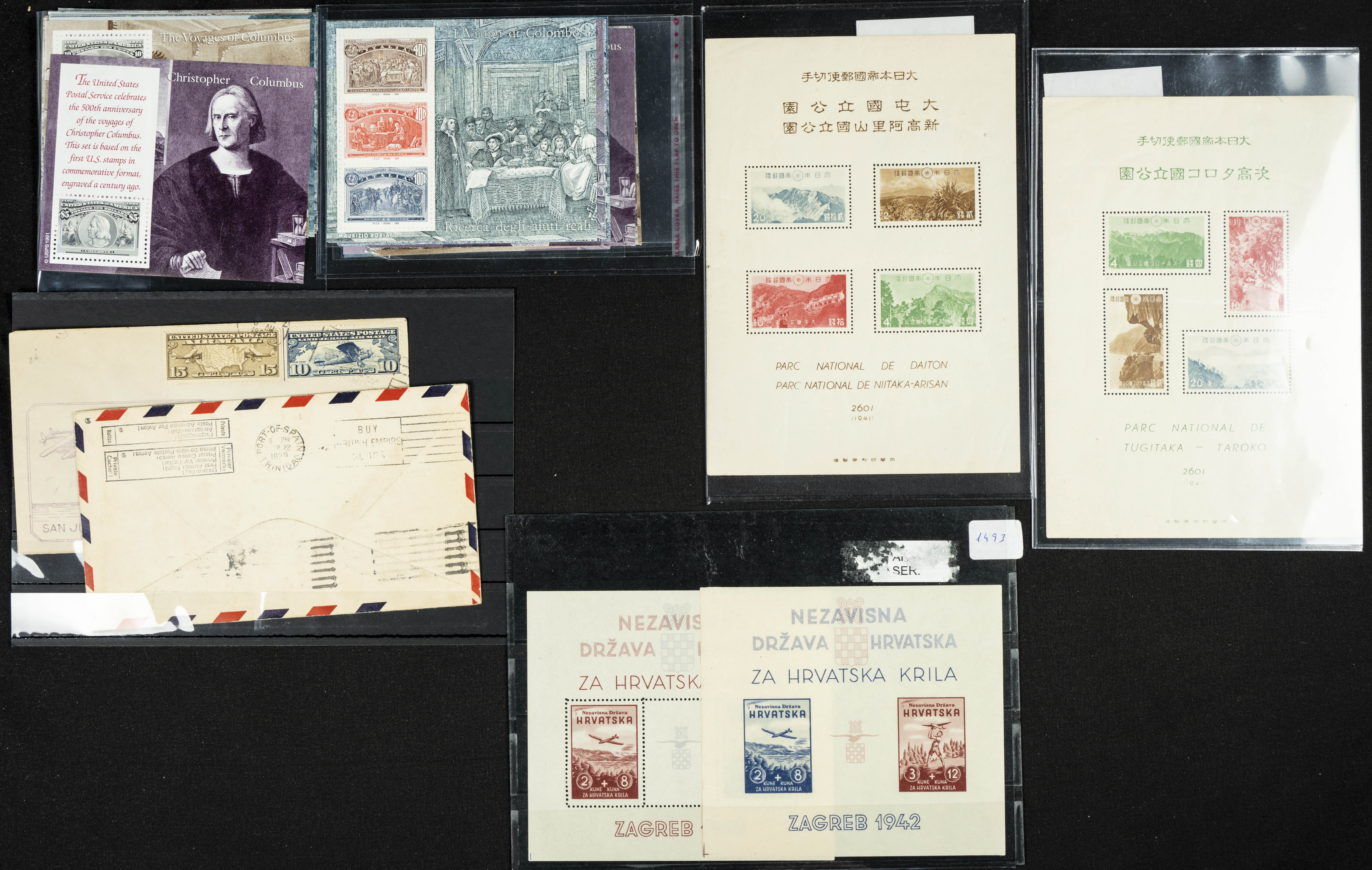★★/★(1992ca). Conjunto de dos juegos completos de hojas bloque de 1992 de España, Italia, USA y Portugal, en nuevo e incluyendo dos hojas bloque de Parques Nacionales de Japón 1941 nuevas, dos cartas de Estados Unidos con marca del vuelo San Juan-Paramaribo (Carabela) y dos hojitas de Croacia. A EXAMINAR. Yvert 2020: +677 Euros