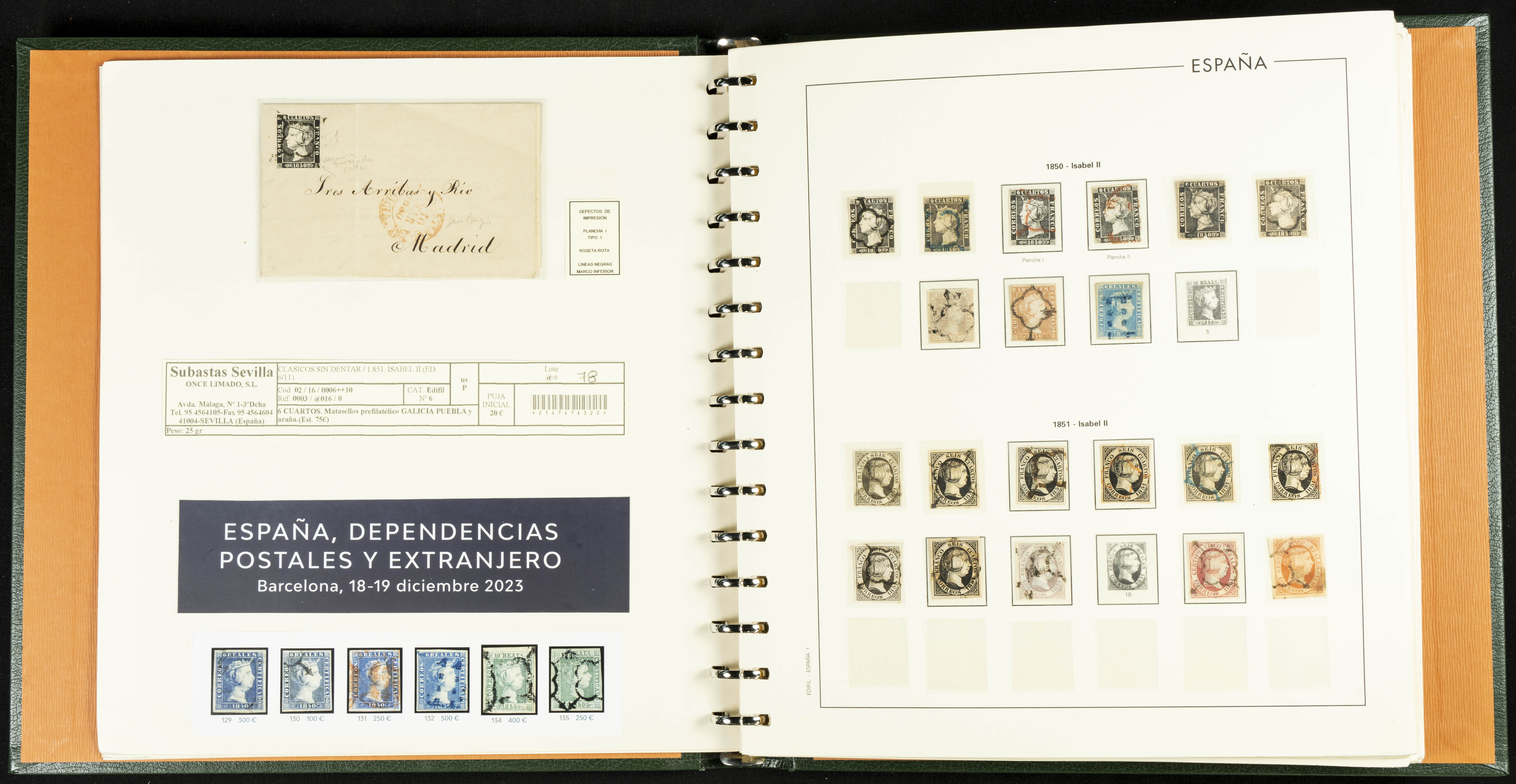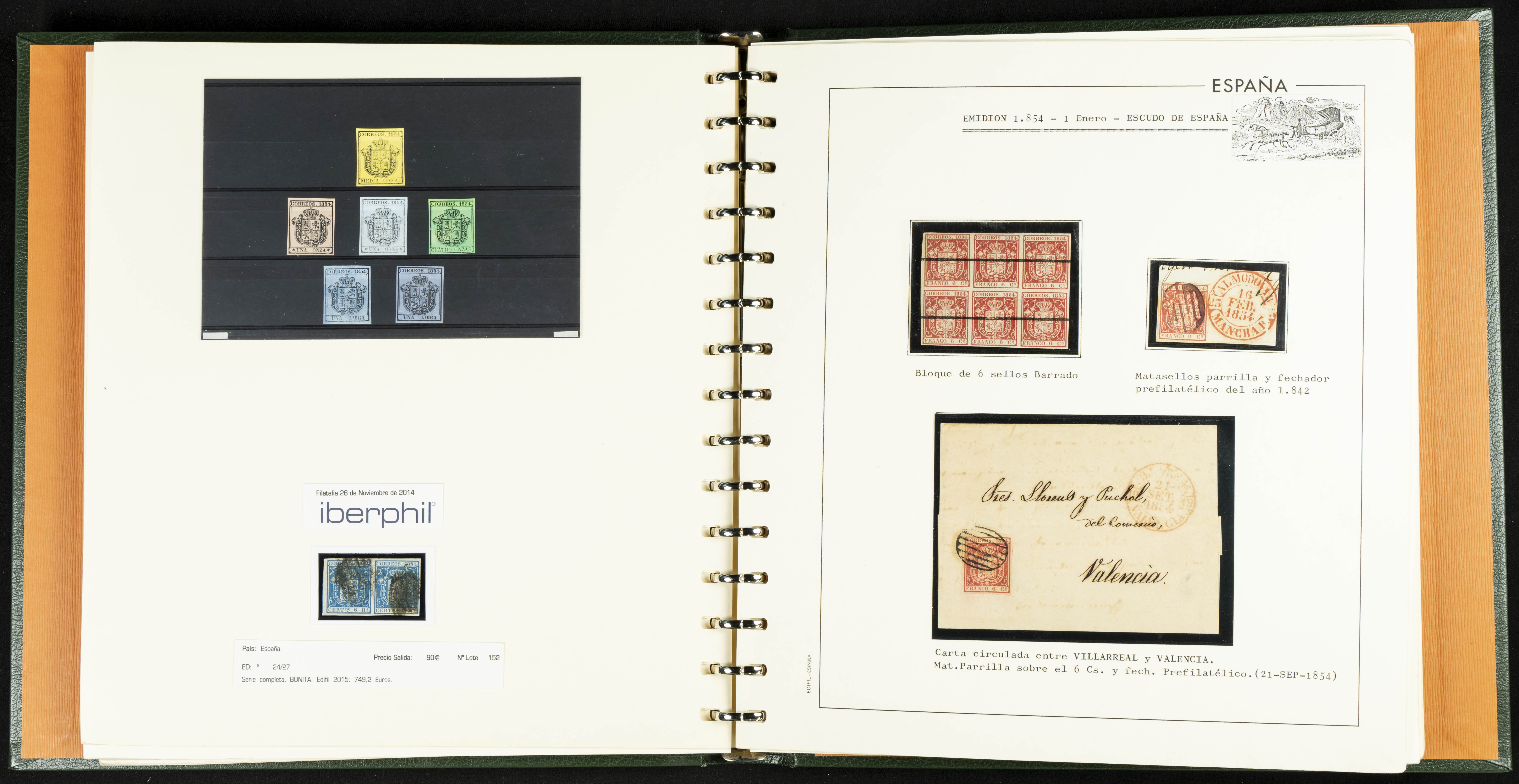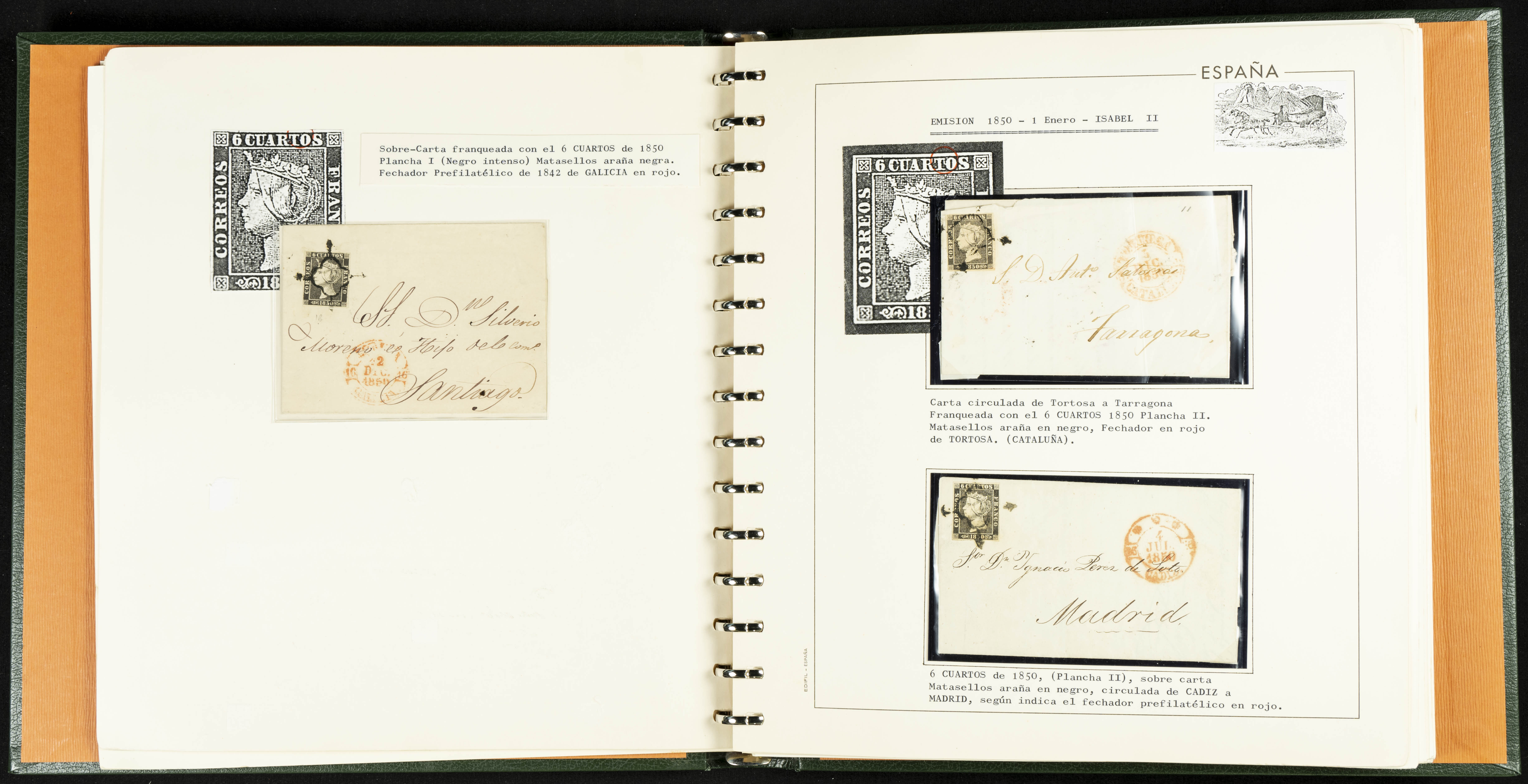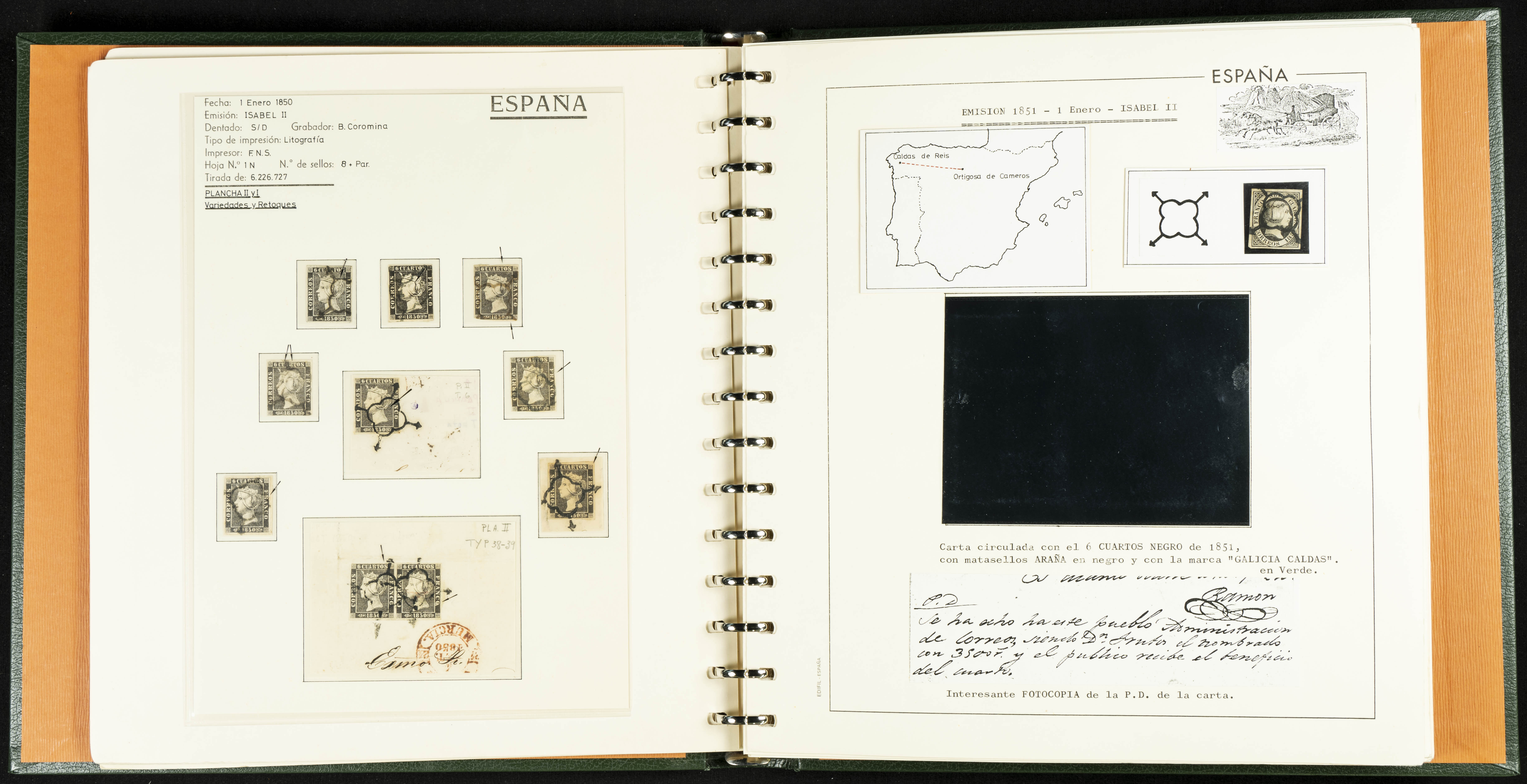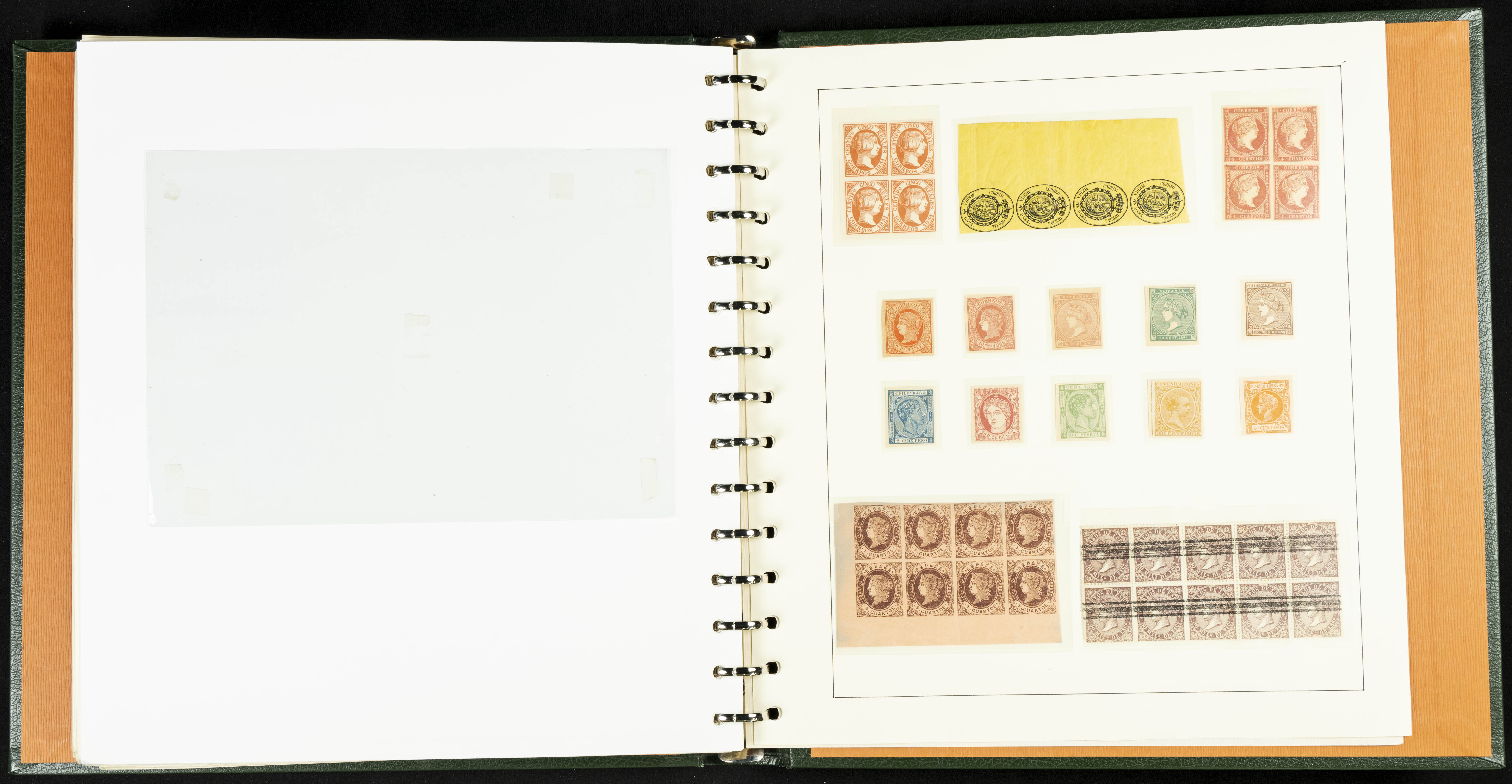 (★)/(1850ca). Espectacular conjunto de sellos clásicos entre 1850 y 1898, en nuevo y usado e incluyendo numerosos matasellos especiales, fragmentos, cartas, bloques, variedades, etc, además de algún sello falso para estudio, destacando el 6 reales de 1850 con matasello "11" limado, 5 reales de 1851, pareja del 6 reales de 1854 (Escudo), bloque de seis de Correo Oficial en nuevo, varios 19 cuartos nuevos y usados entre 1860 y 1868, series completas de 1862 y 1864 nuevas, series completas de 1865 usadas, serie completa de Pelón nueva, etc. ALTISIMO VALOR DE CATALOGO. IMPRESCINDIBLE EXAMINAR.