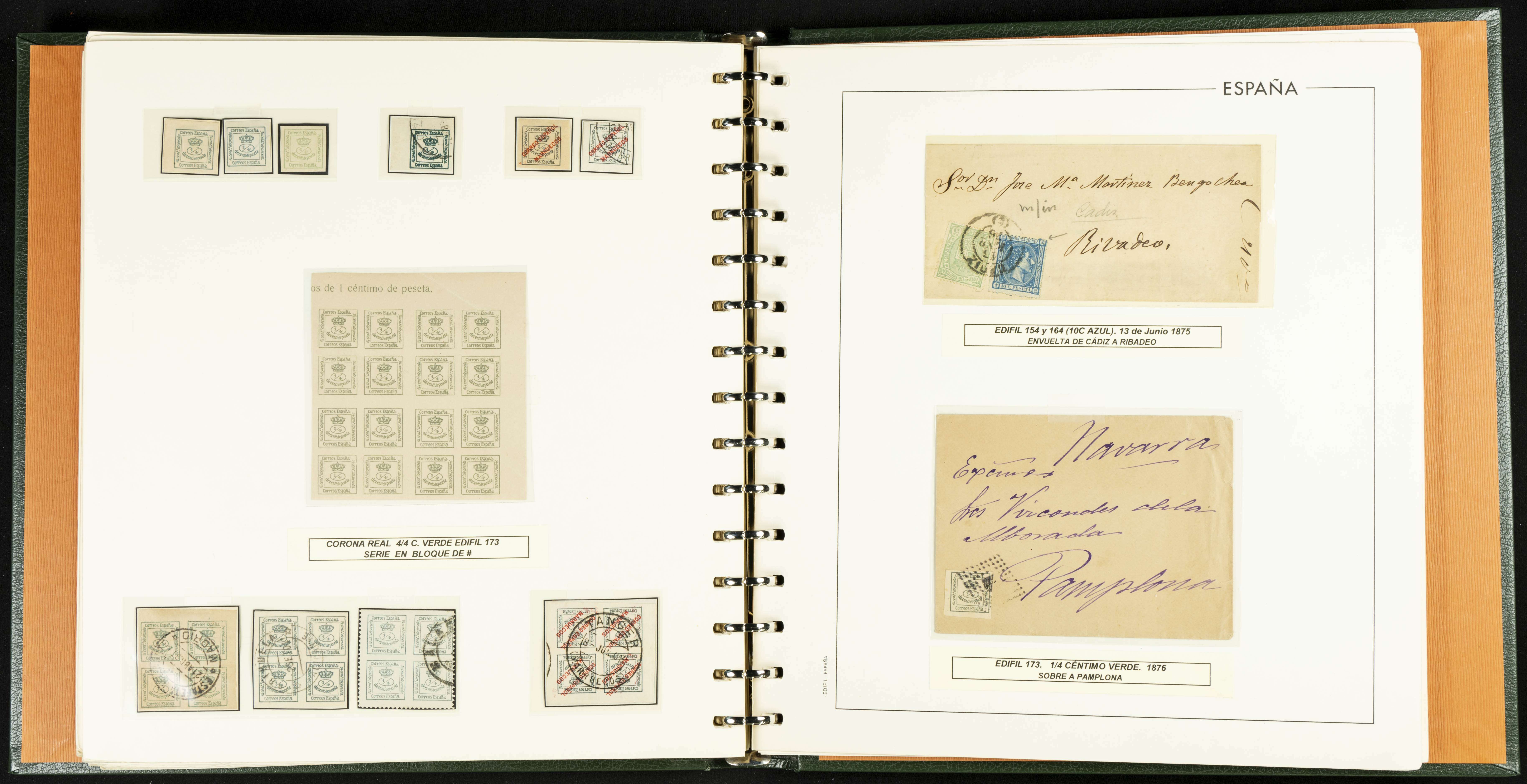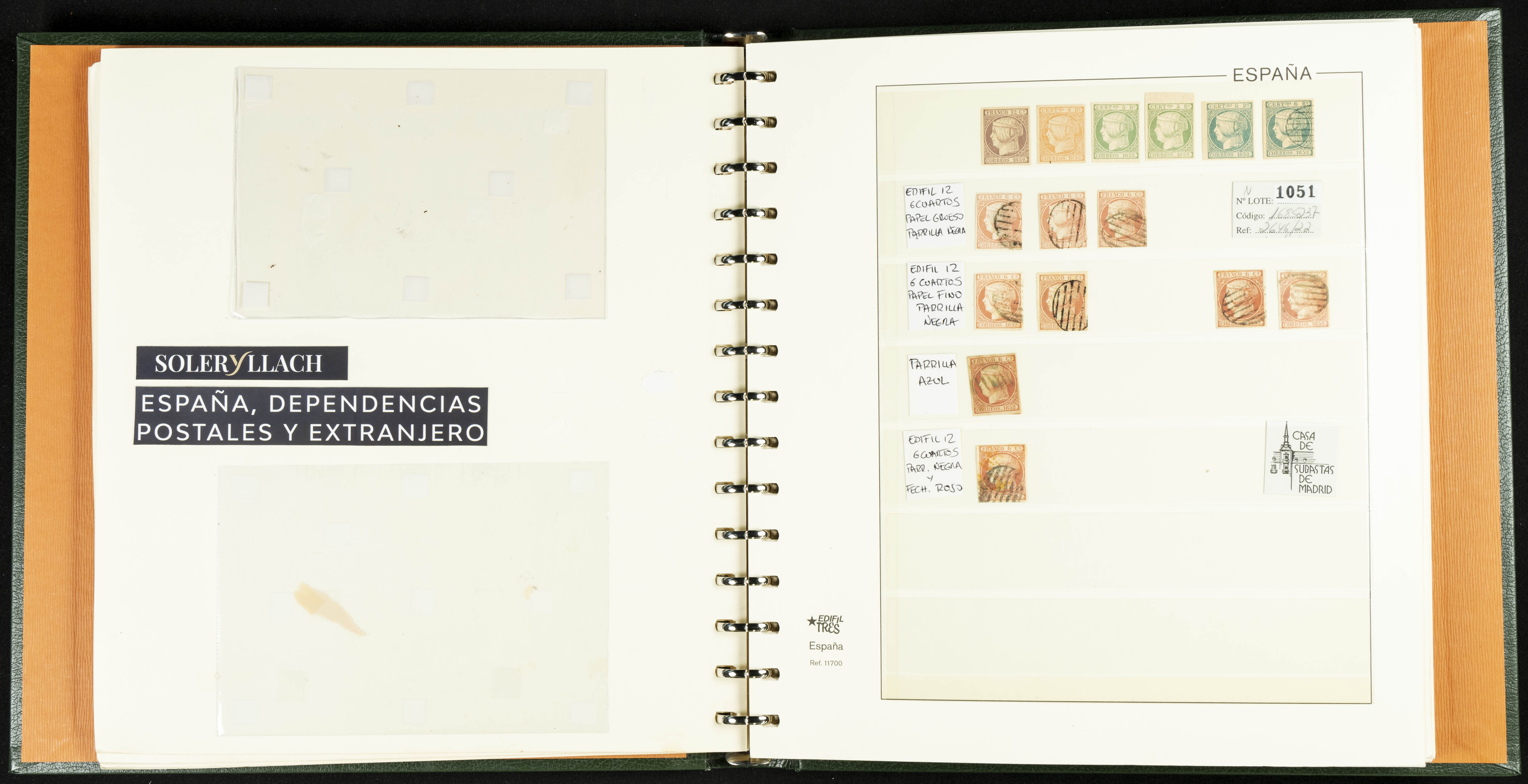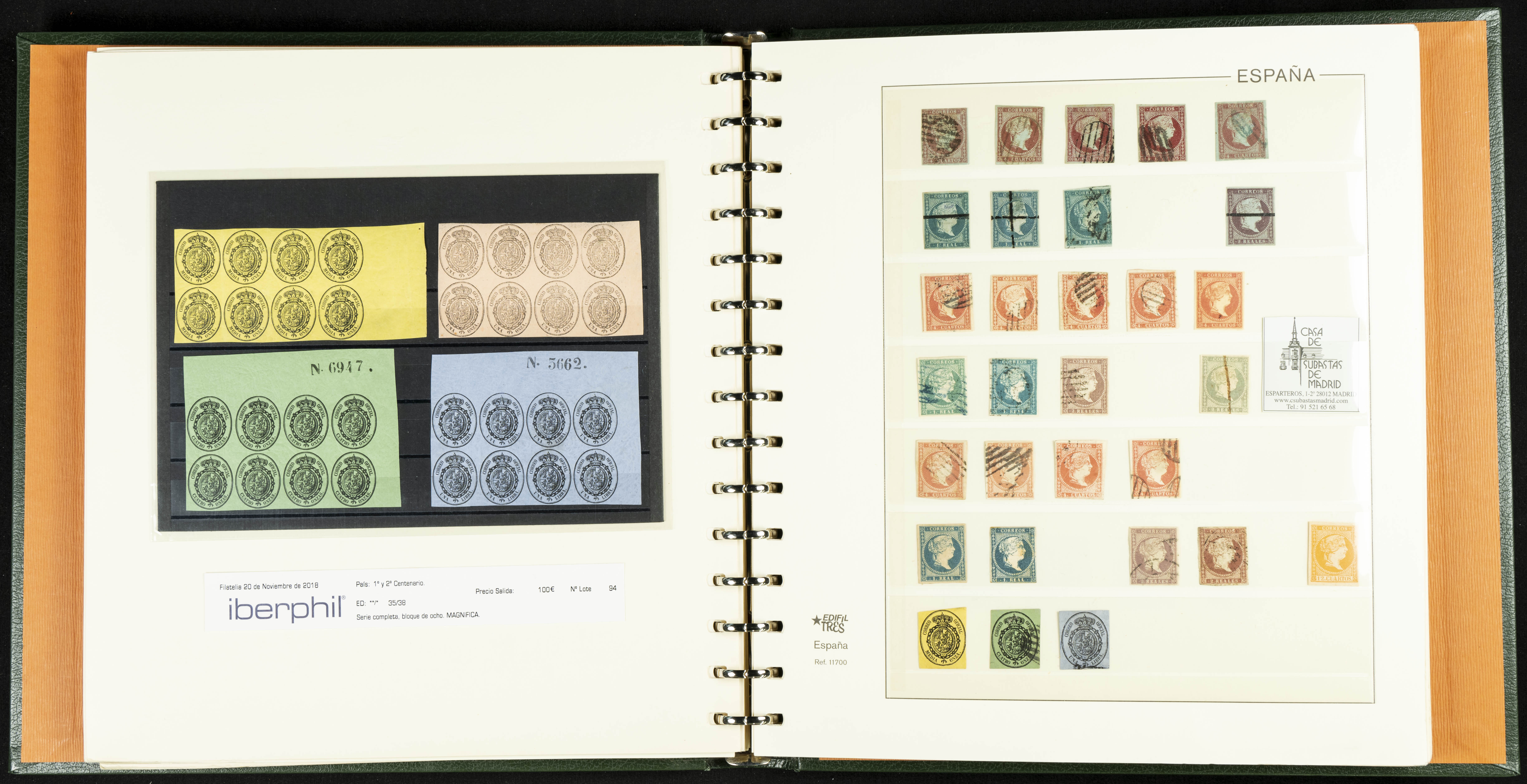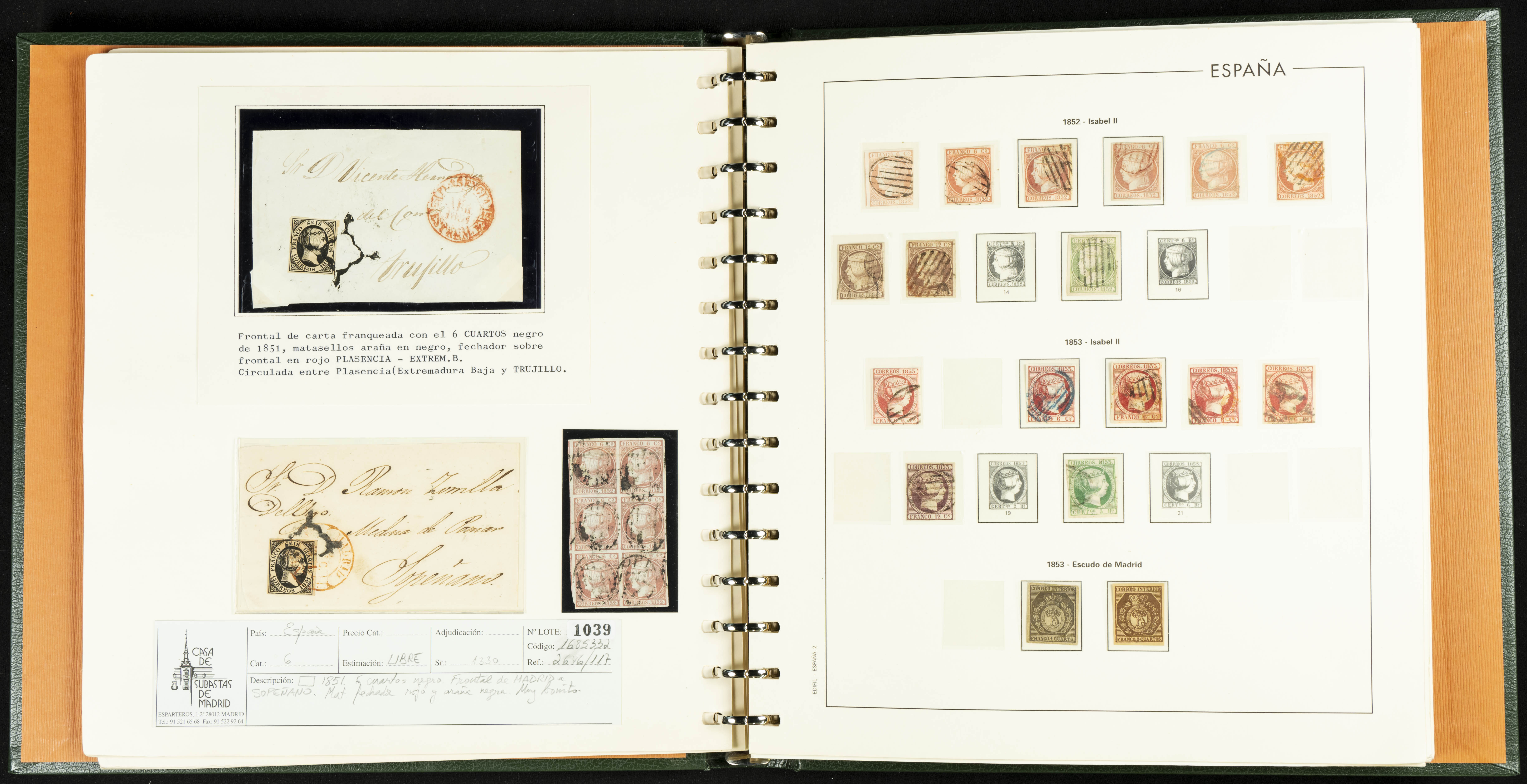 (★)/(1850ca). Espectacular conjunto de sellos clásicos entre 1850 y 1898, en nuevo y usado e incluyendo numerosos matasellos especiales, fragmentos, cartas, bloques, variedades, etc, además de algún sello falso para estudio, destacando el 6 reales de 1850 con matasello "11" limado, 5 reales de 1851, pareja del 6 reales de 1854 (Escudo), bloque de seis de Correo Oficial en nuevo, varios 19 cuartos nuevos y usados entre 1860 y 1868, series completas de 1862 y 1864 nuevas, series completas de 1865 usadas, serie completa de Pelón nueva, etc. ALTISIMO VALOR DE CATALOGO. IMPRESCINDIBLE EXAMINAR.