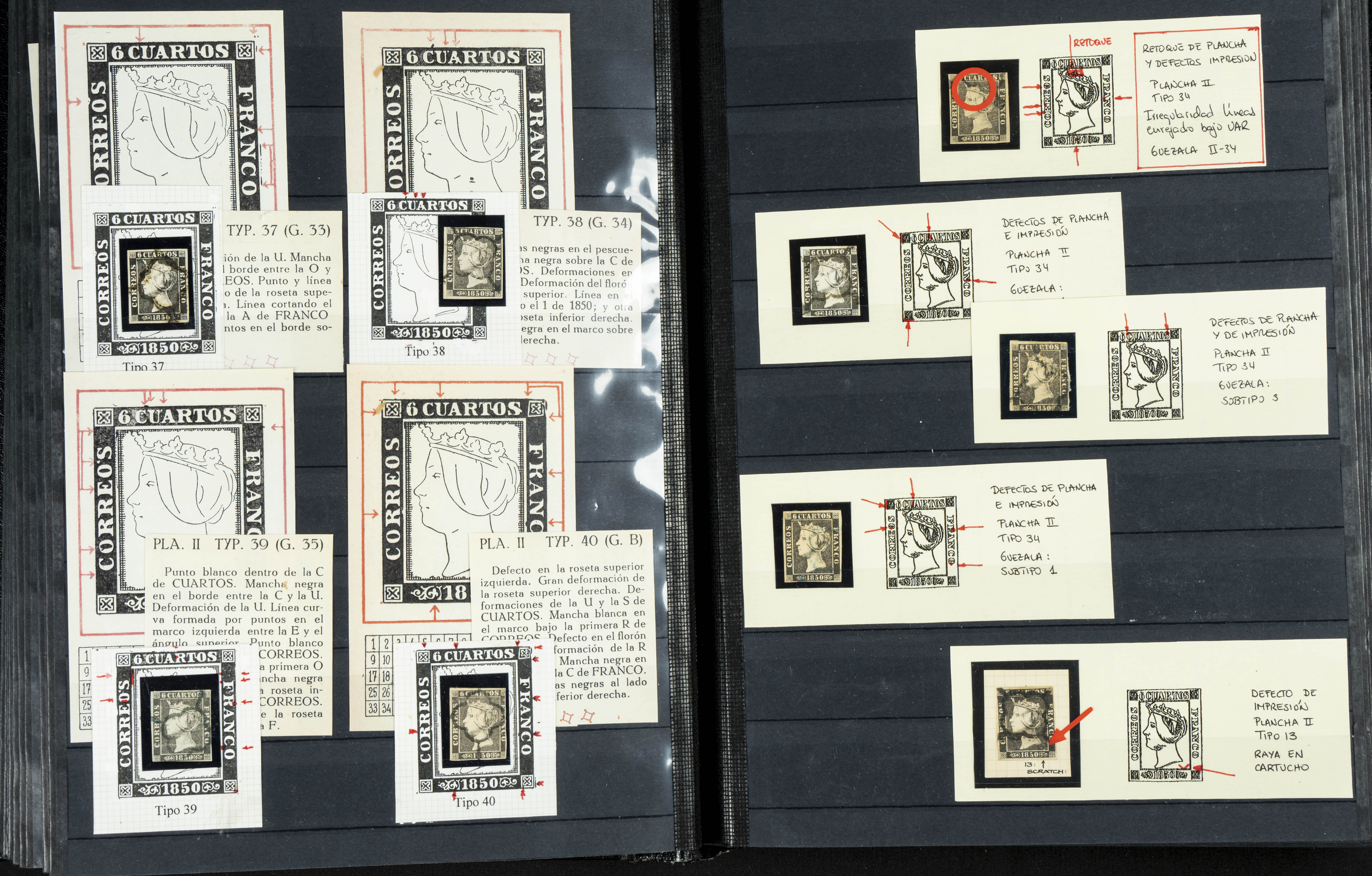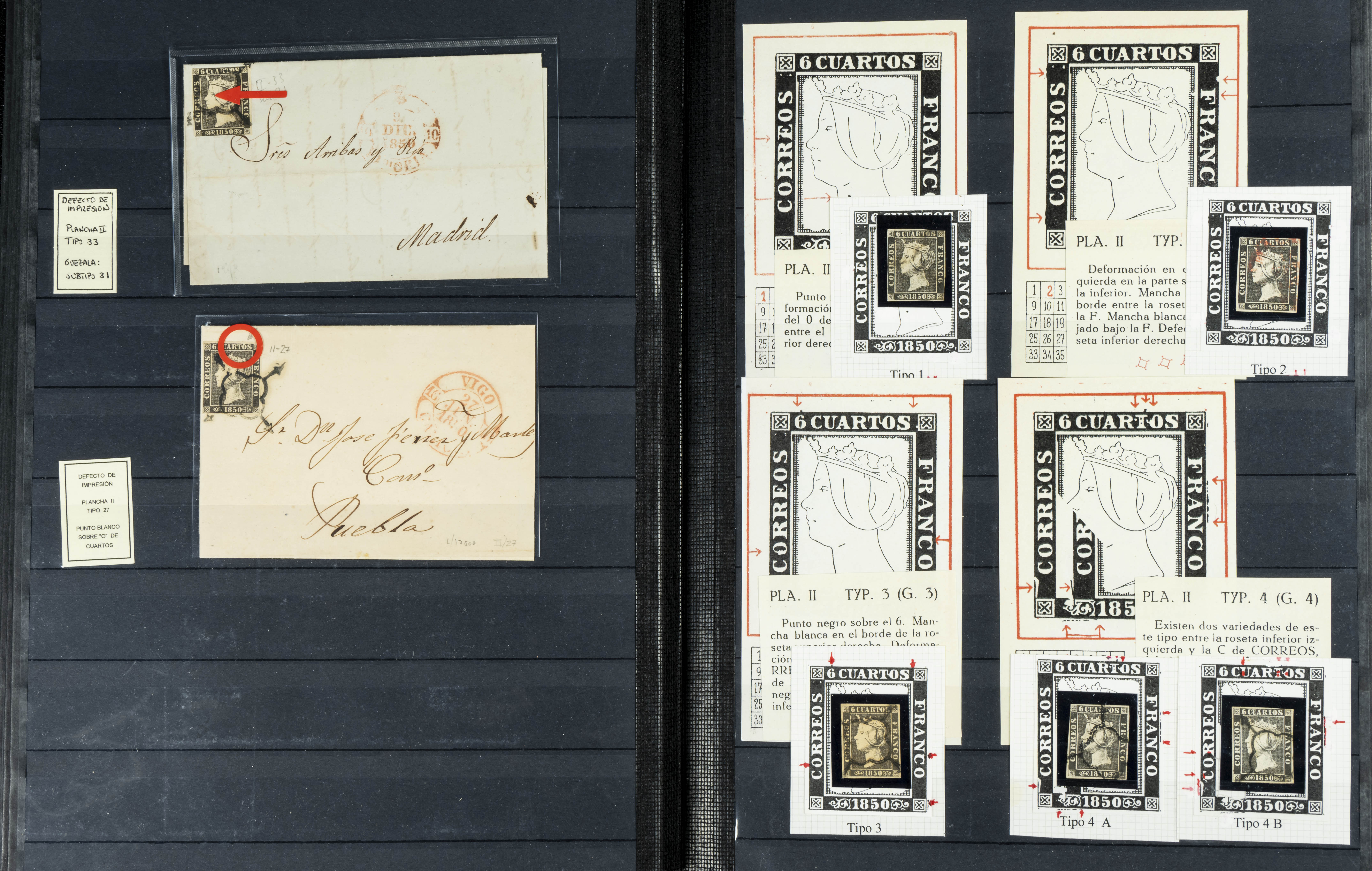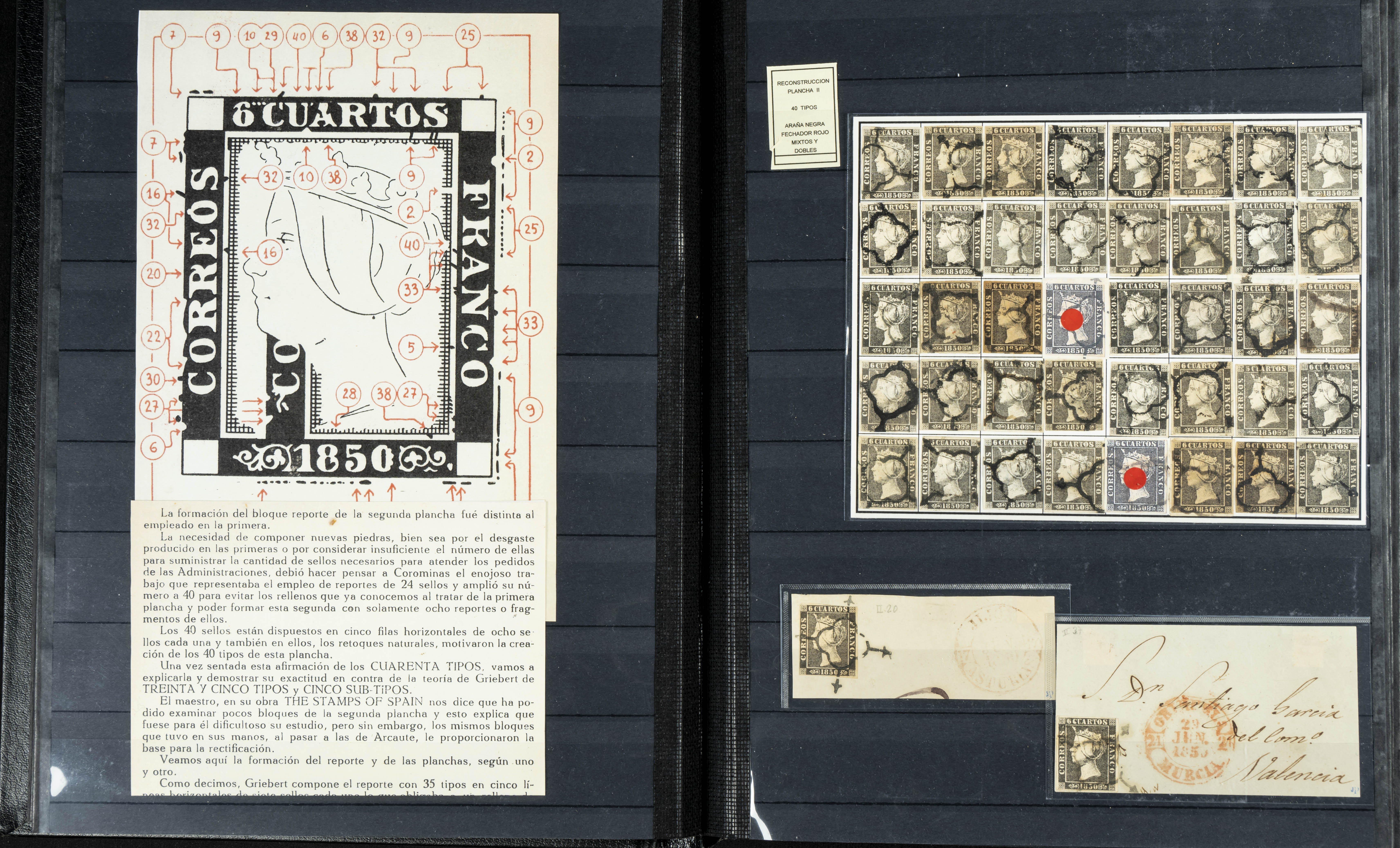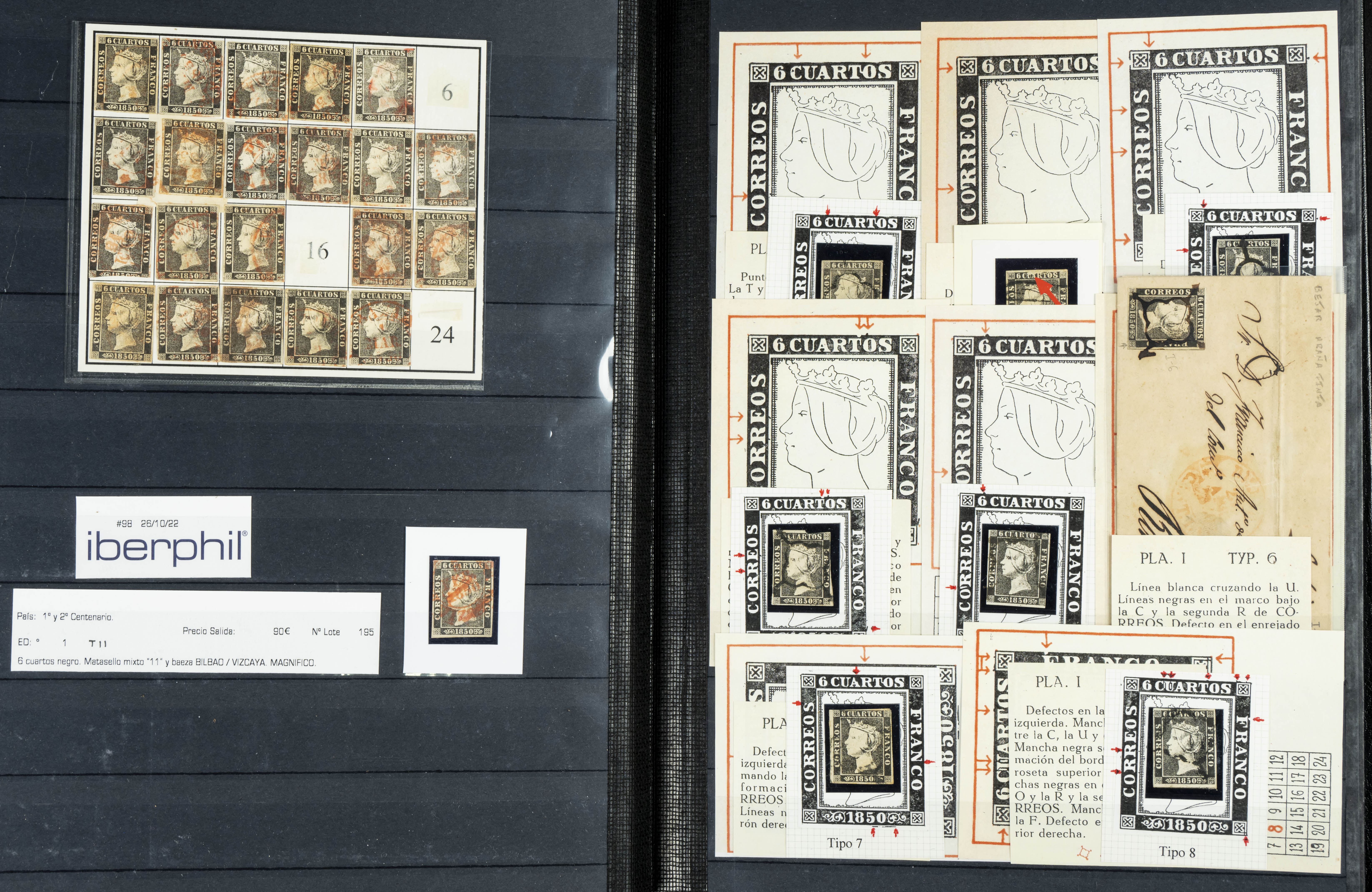 1, 1A. 1850. Interesante conjunto de más de doscientos ochenta sellos del 6 cuartos negro de 1850, en usado y algunos con matasello baeza y otros, incluye un intento de reconstrucción de la Plancha I (faltan tres sellos) con baeza, ocho con araña, dos reconstrucciones de la Plancha II (una a falta de dos sellos) con matasello araña y decenas de variedades de cliché con dibujos de las mismas, además de alguna carta. IMPRESCINDIBLE EXAMINAR.