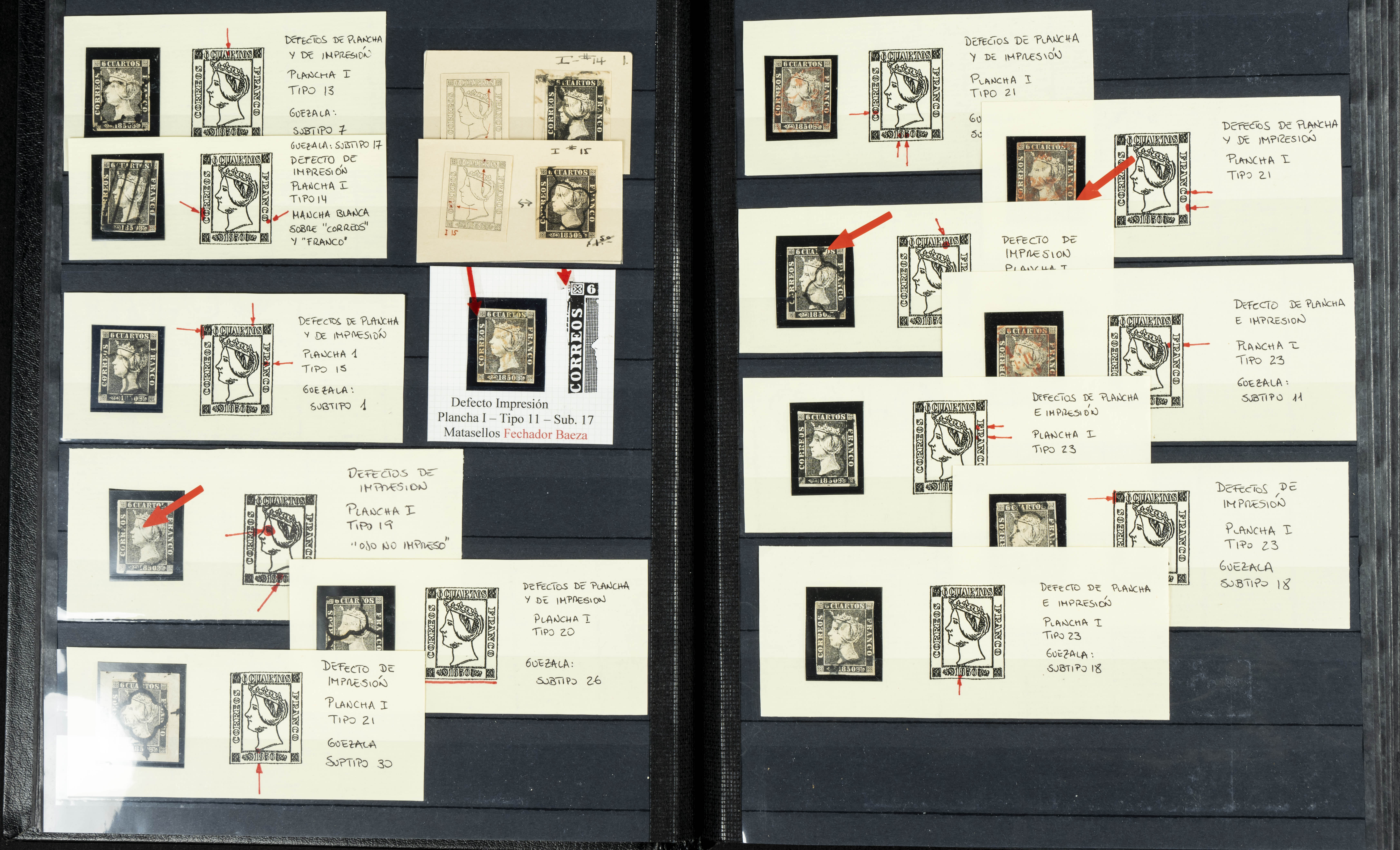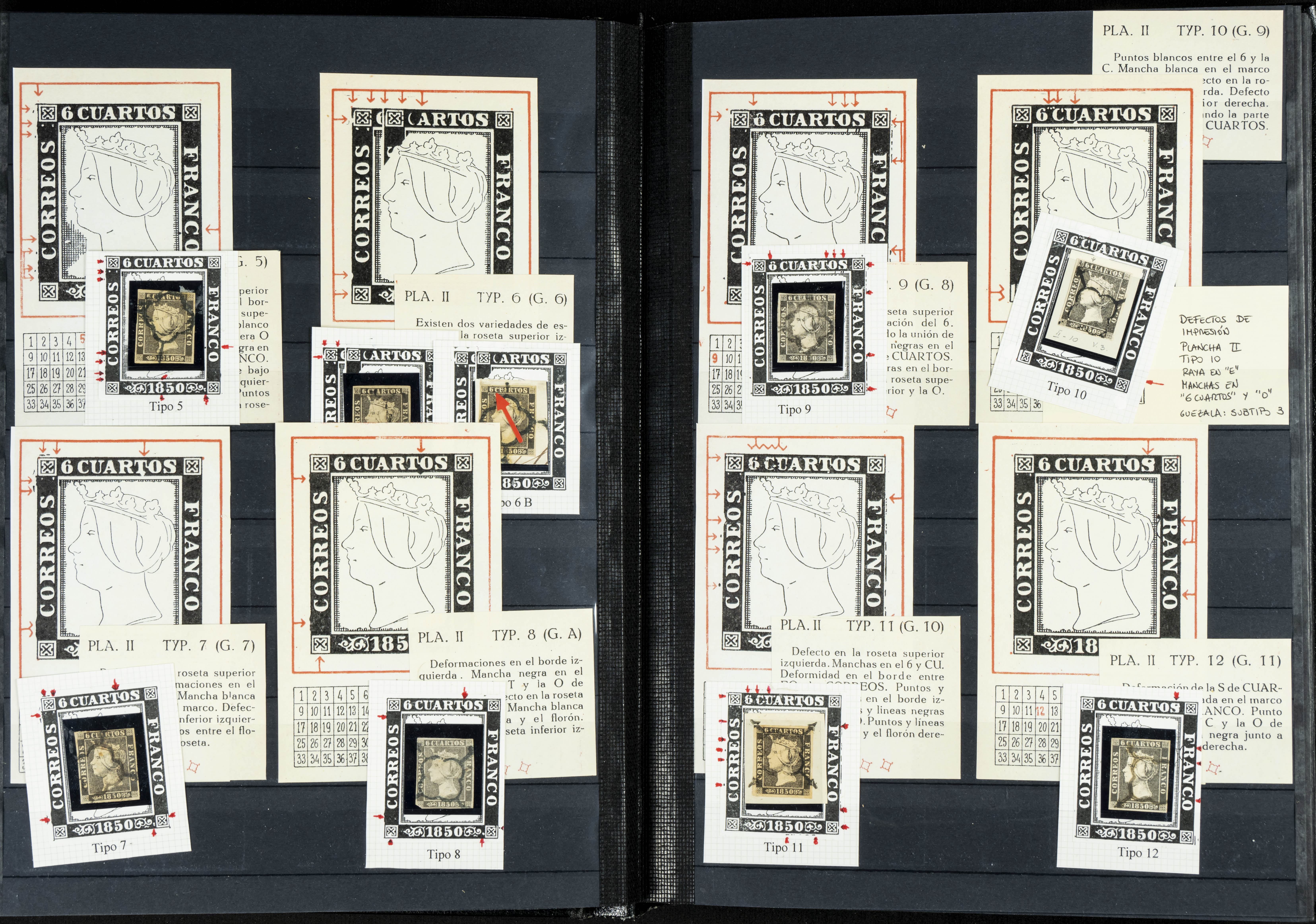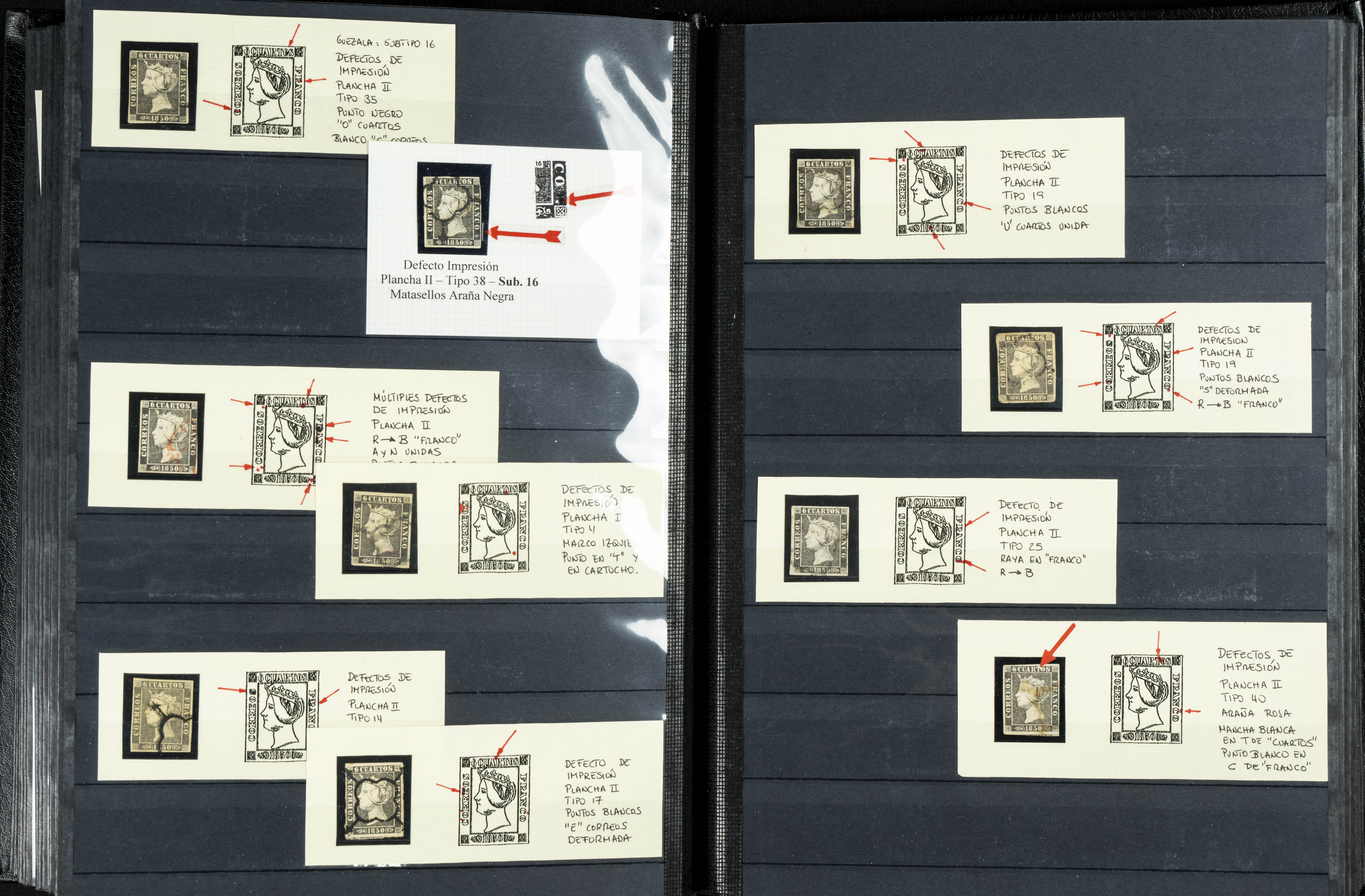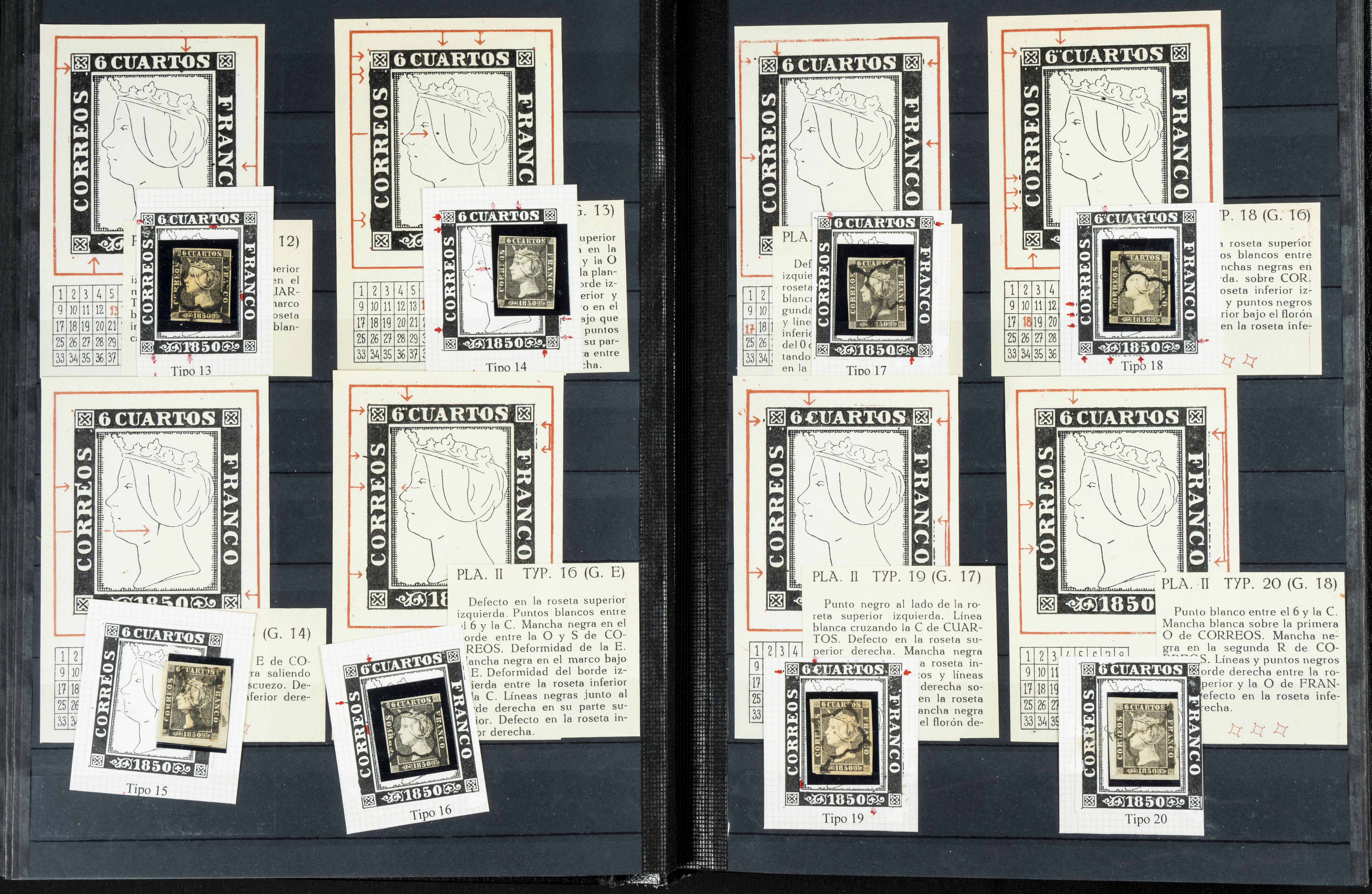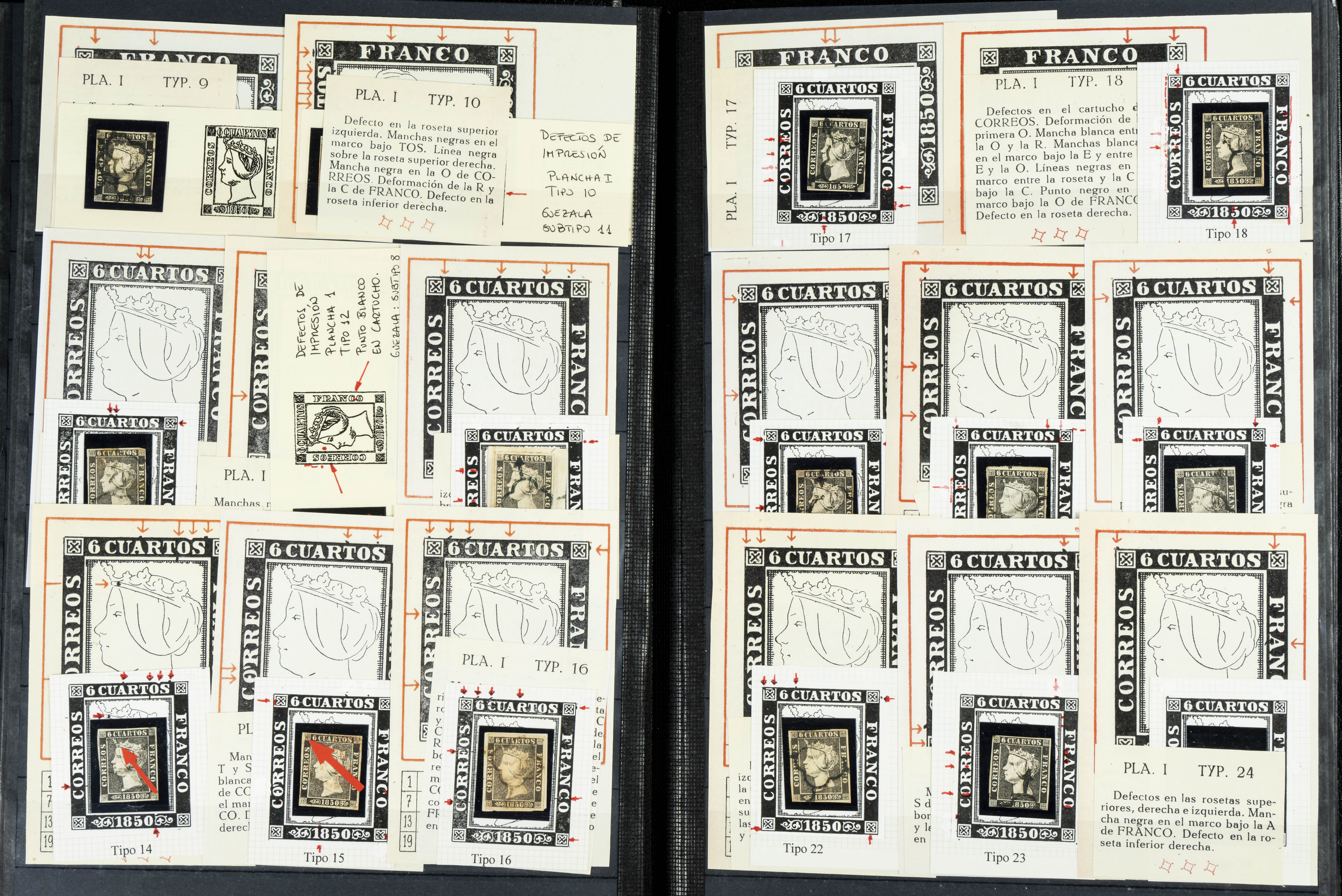 1, 1A. 1850. Interesante conjunto de más de doscientos ochenta sellos del 6 cuartos negro de 1850, en usado y algunos con matasello baeza y otros, incluye un intento de reconstrucción de la Plancha I (faltan tres sellos) con baeza, ocho con araña, dos reconstrucciones de la Plancha II (una a falta de dos sellos) con matasello araña y decenas de variedades de cliché con dibujos de las mismas, además de alguna carta. IMPRESCINDIBLE EXAMINAR.