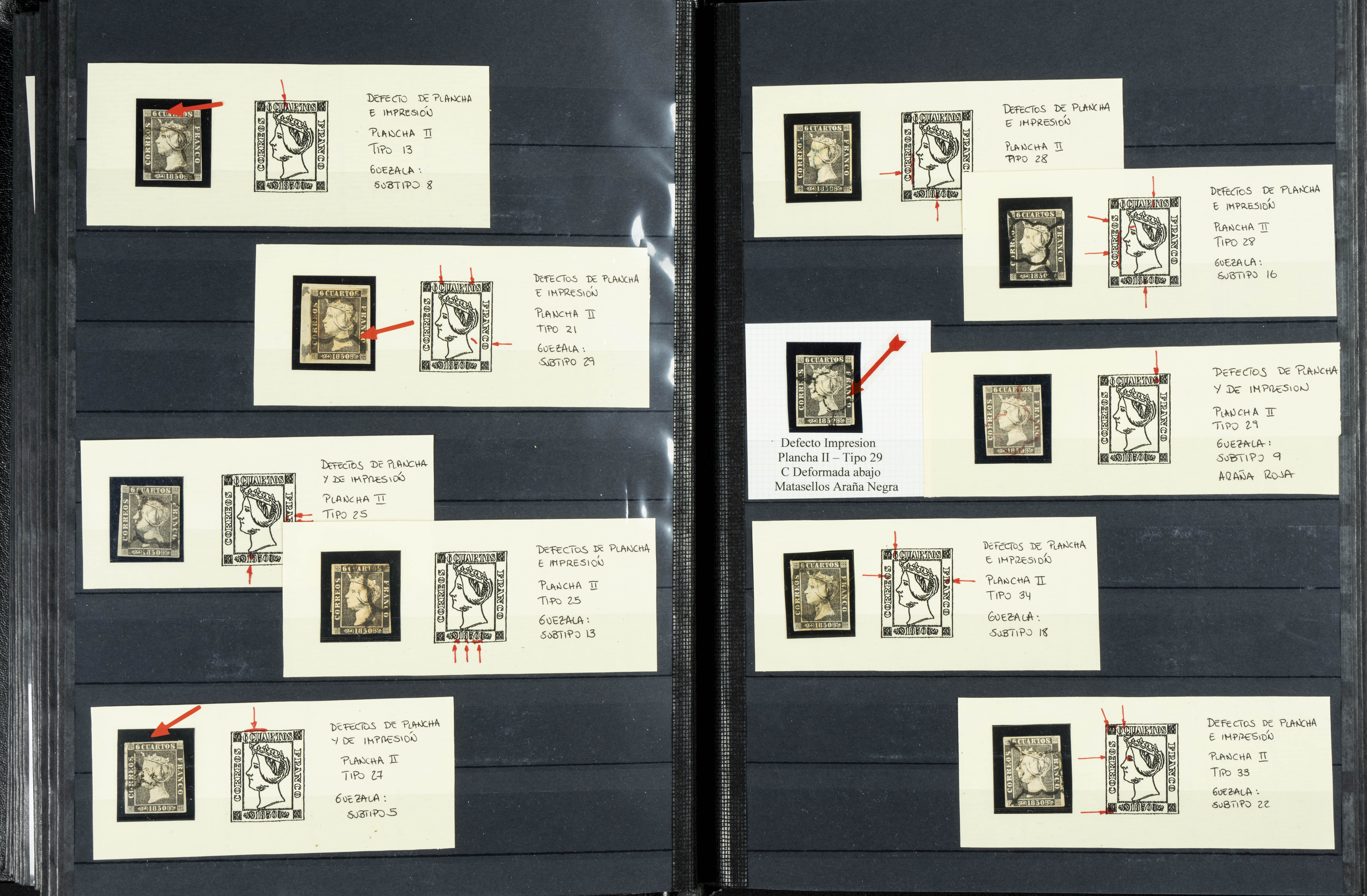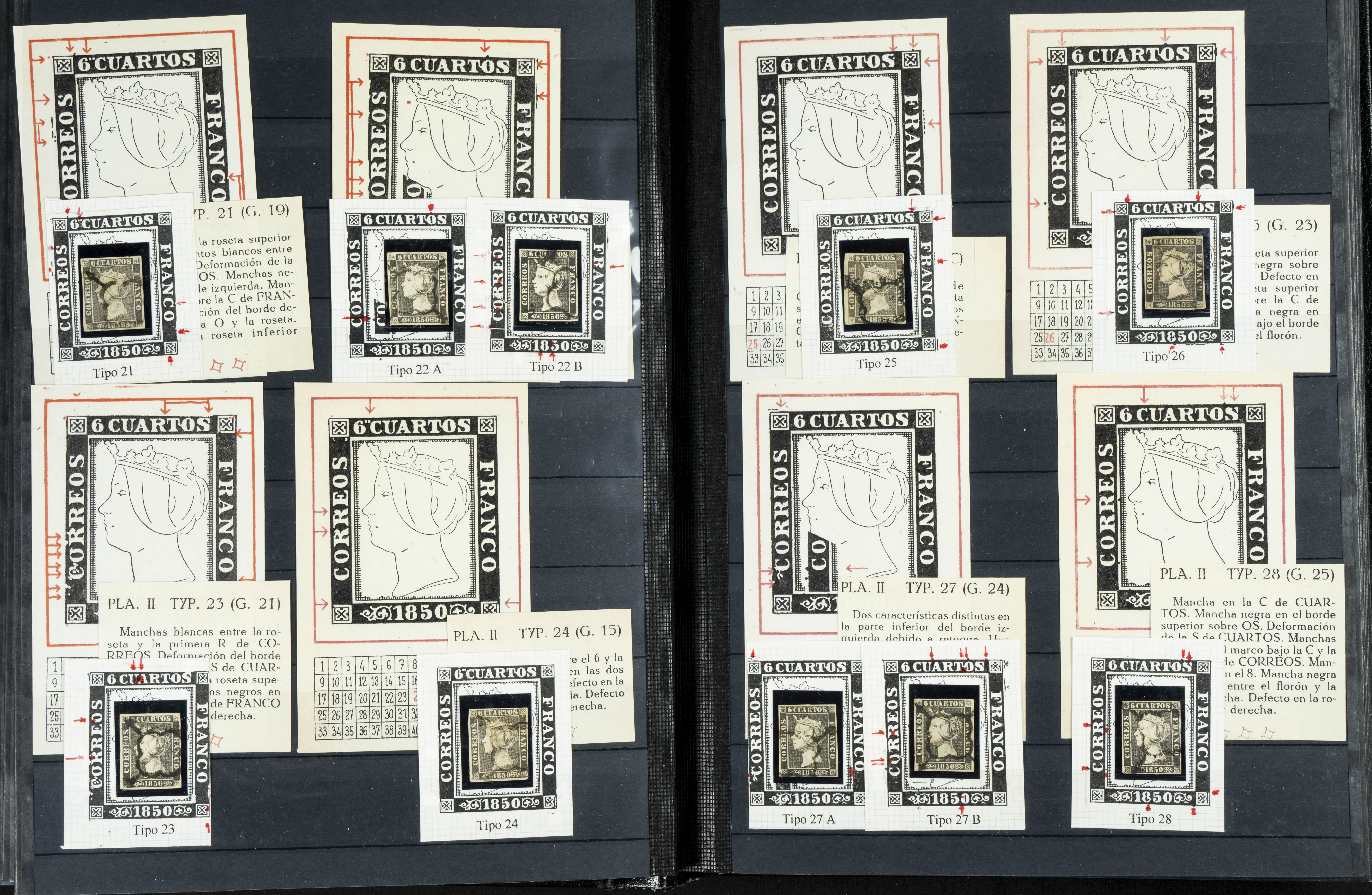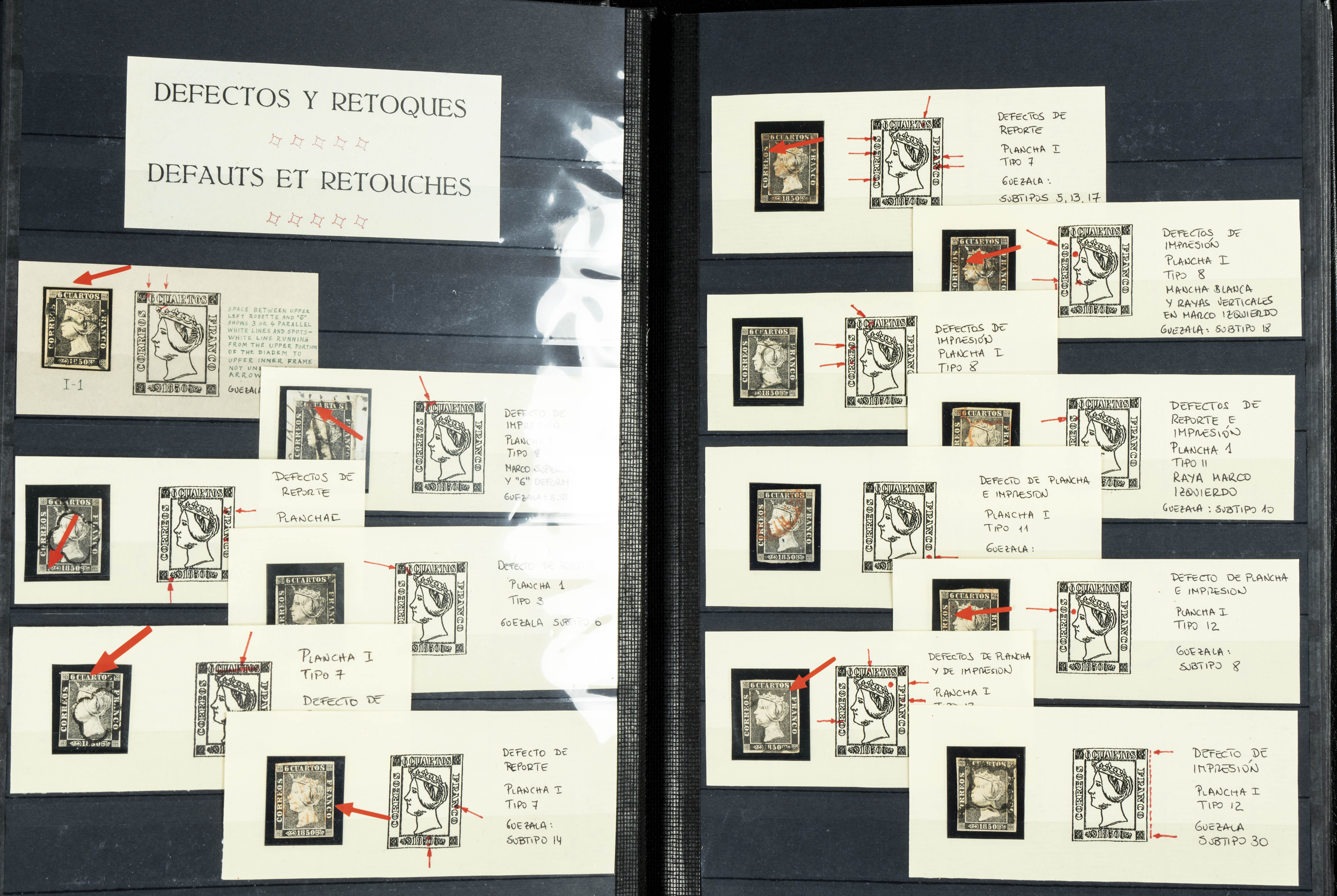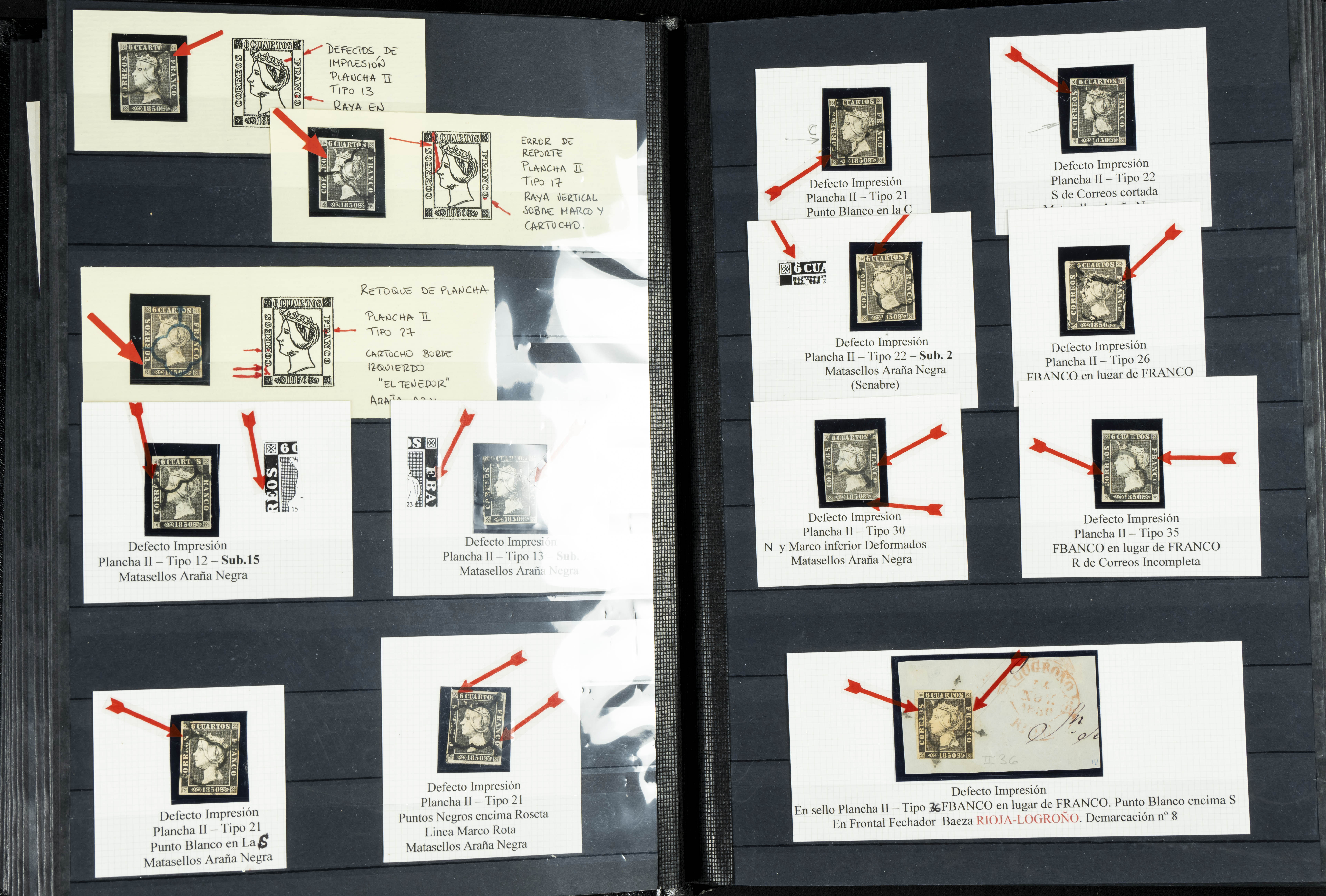 1, 1A. 1850. Interesante conjunto de más de doscientos ochenta sellos del 6 cuartos negro de 1850, en usado y algunos con matasello baeza y otros, incluye un intento de reconstrucción de la Plancha I (faltan tres sellos) con baeza, ocho con araña, dos reconstrucciones de la Plancha II (una a falta de dos sellos) con matasello araña y decenas de variedades de cliché con dibujos de las mismas, además de alguna carta. IMPRESCINDIBLE EXAMINAR.