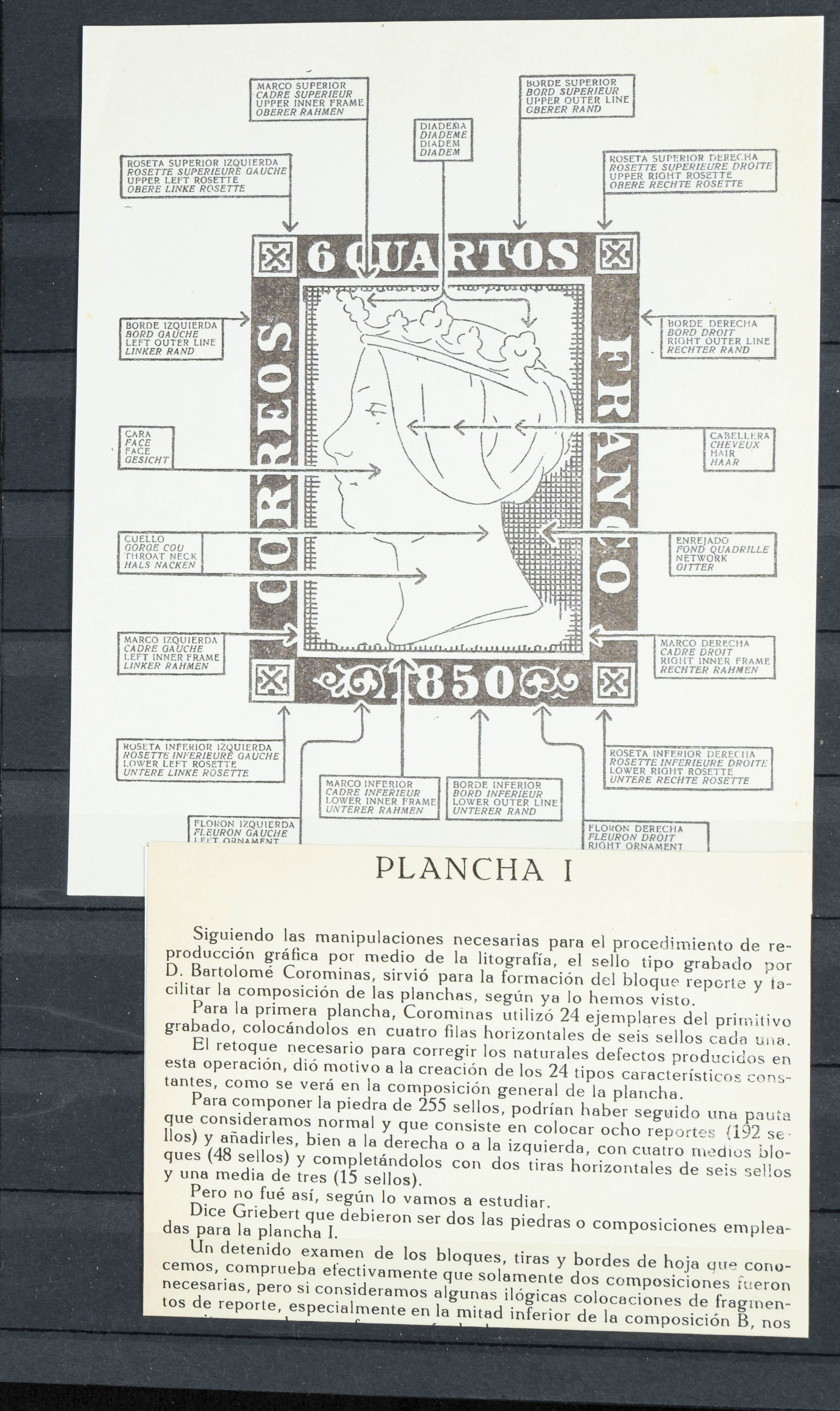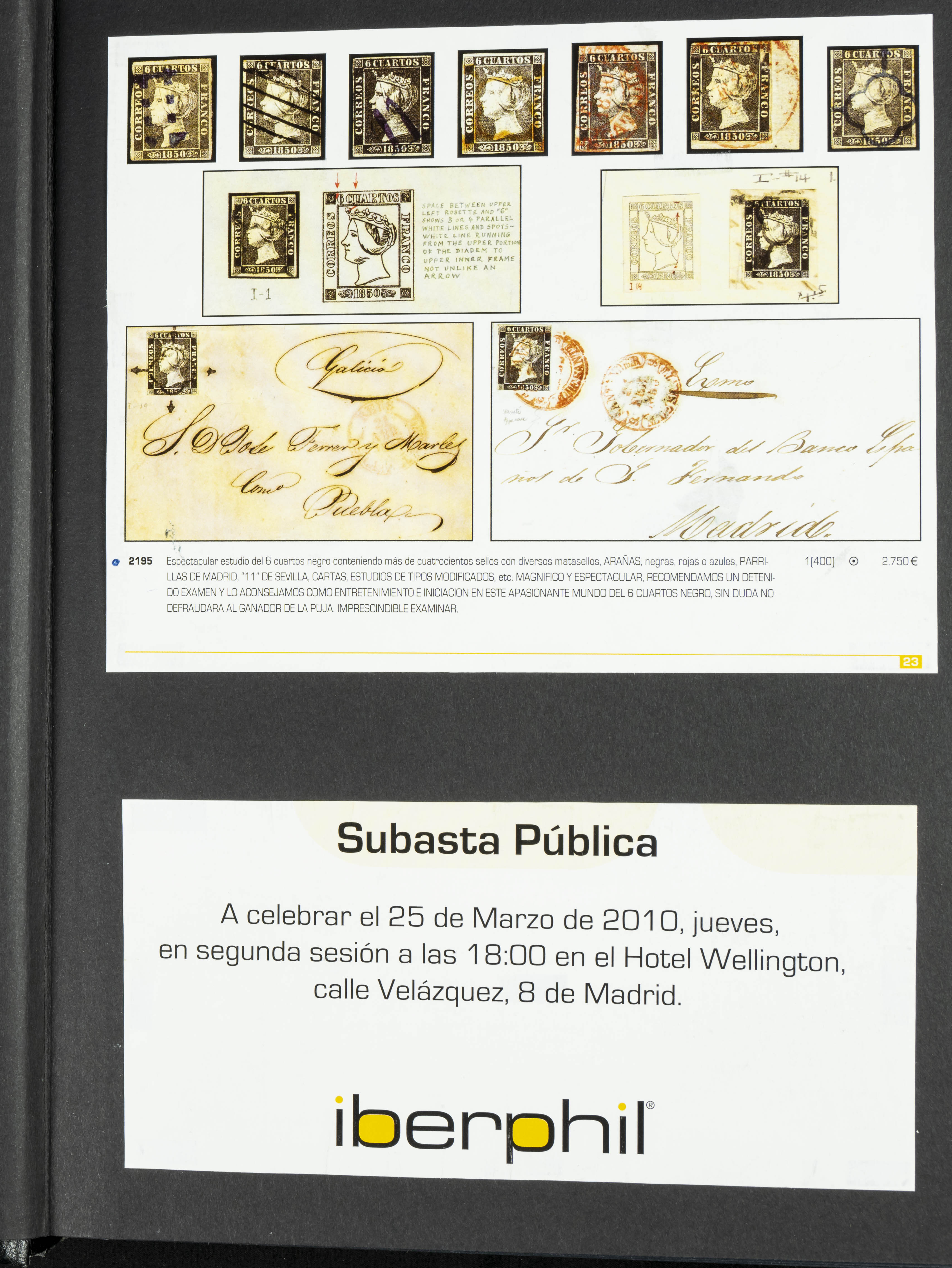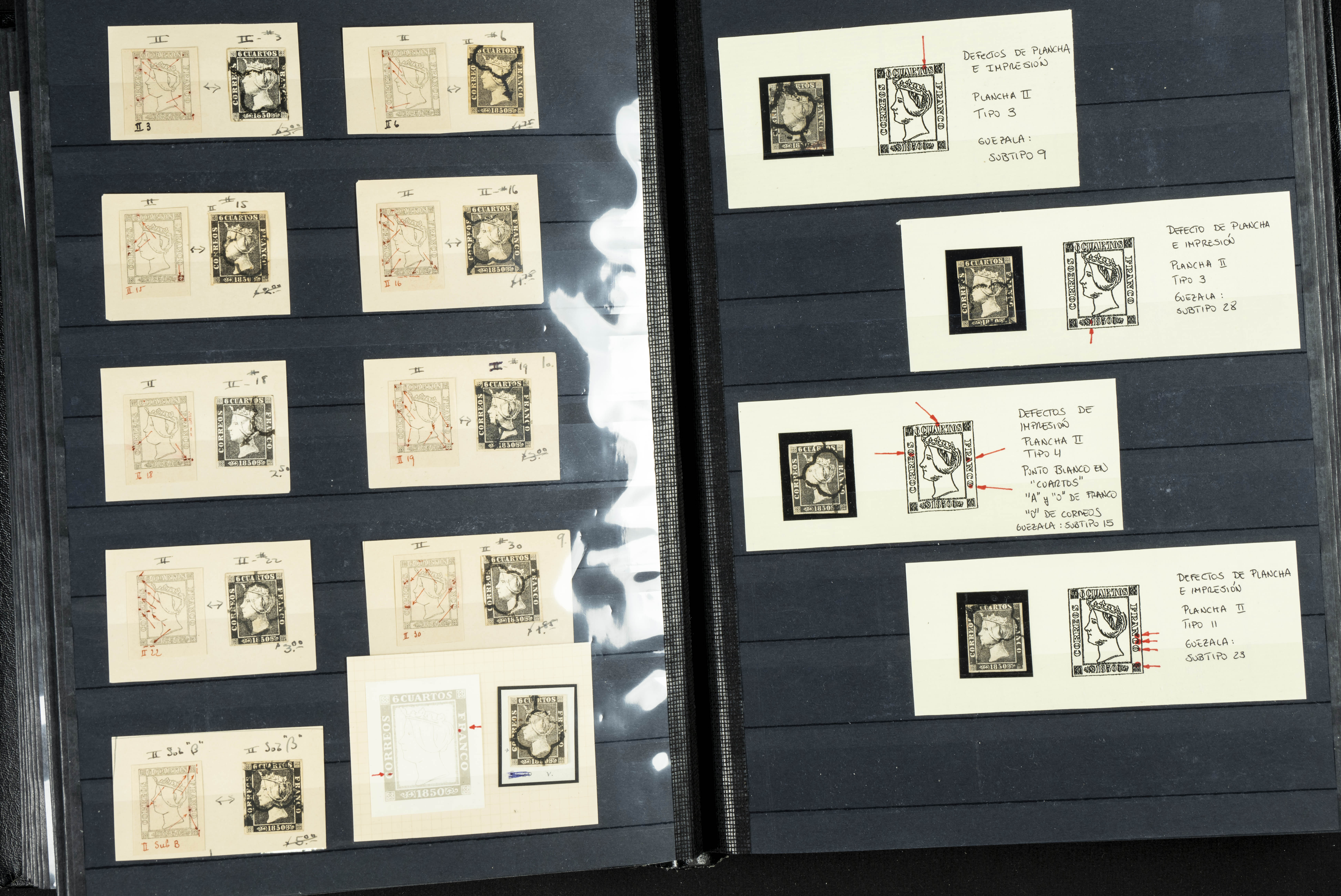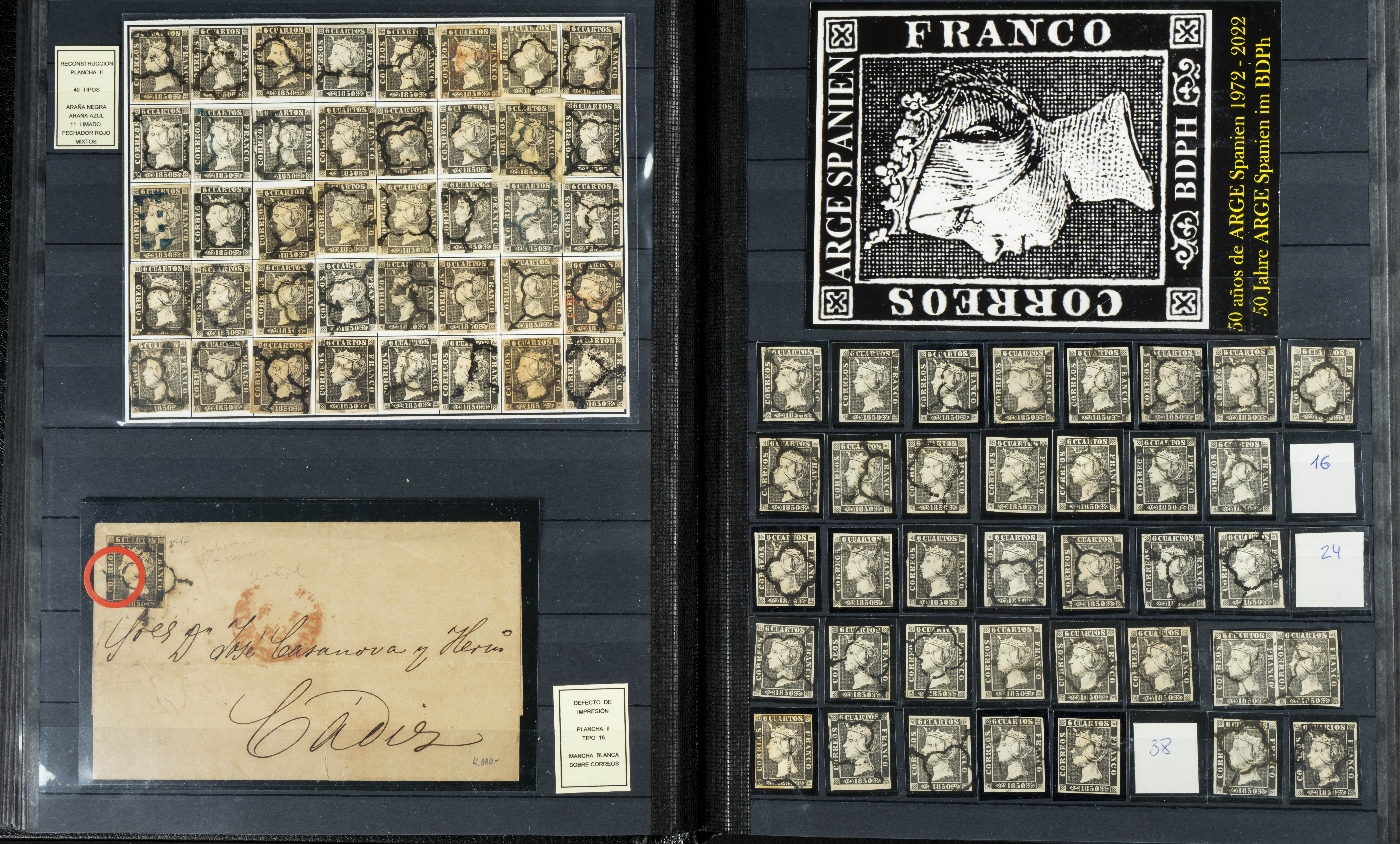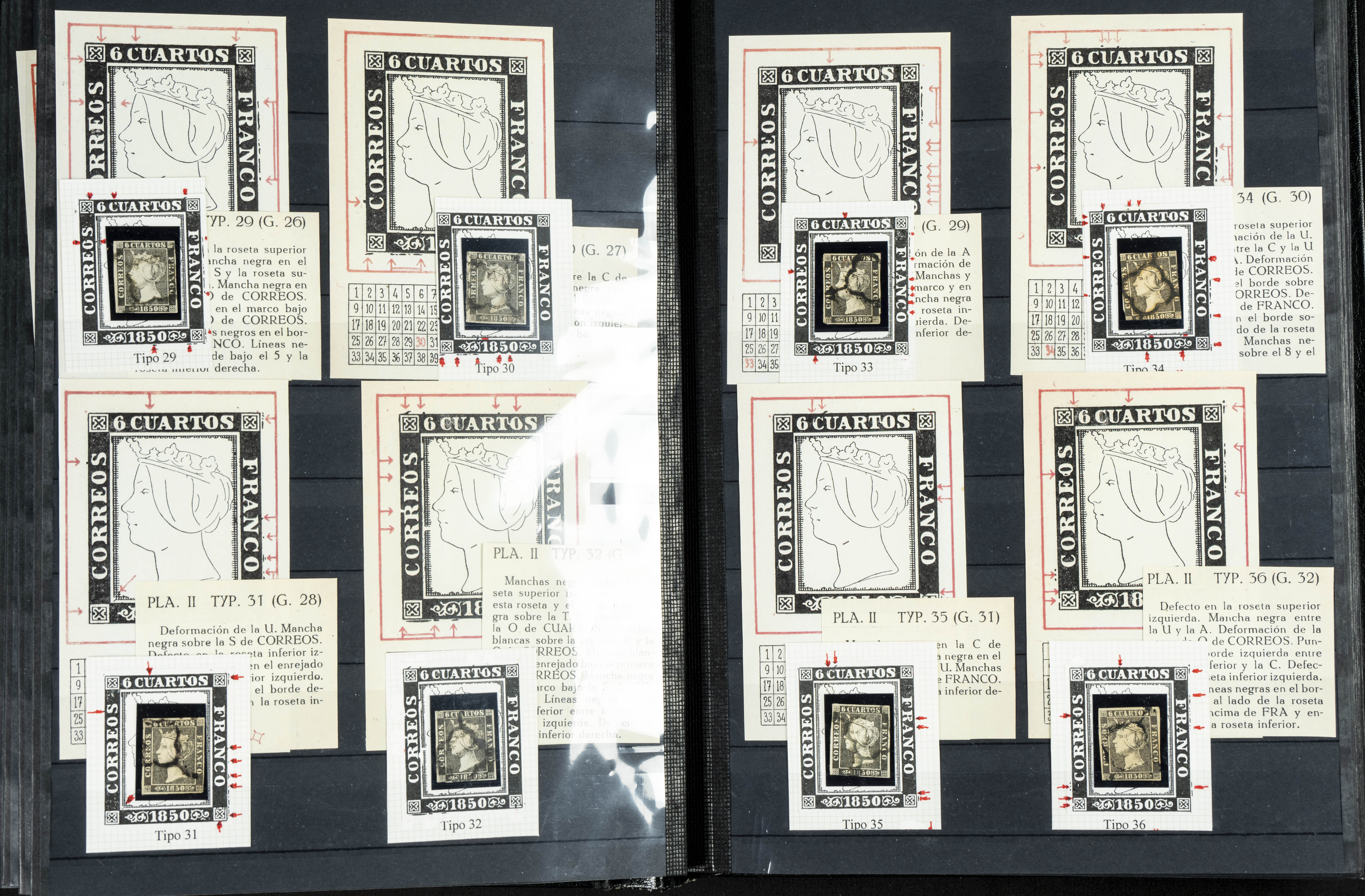 1, 1A. 1850. Interesante conjunto de más de doscientos ochenta sellos del 6 cuartos negro de 1850, en usado y algunos con matasello baeza y otros, incluye un intento de reconstrucción de la Plancha I (faltan tres sellos) con baeza, ocho con araña, dos reconstrucciones de la Plancha II (una a falta de dos sellos) con matasello araña y decenas de variedades de cliché con dibujos de las mismas, además de alguna carta. IMPRESCINDIBLE EXAMINAR.
