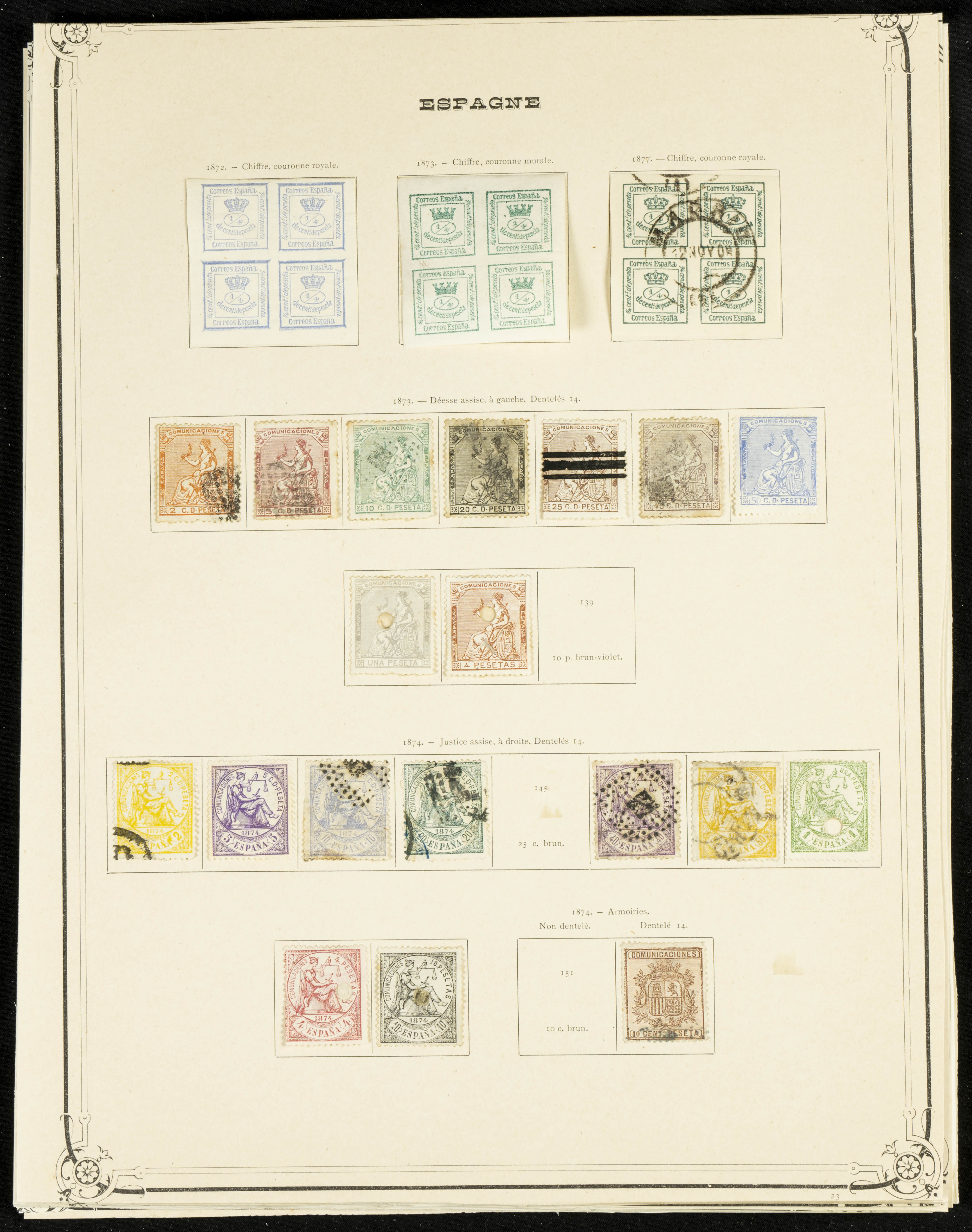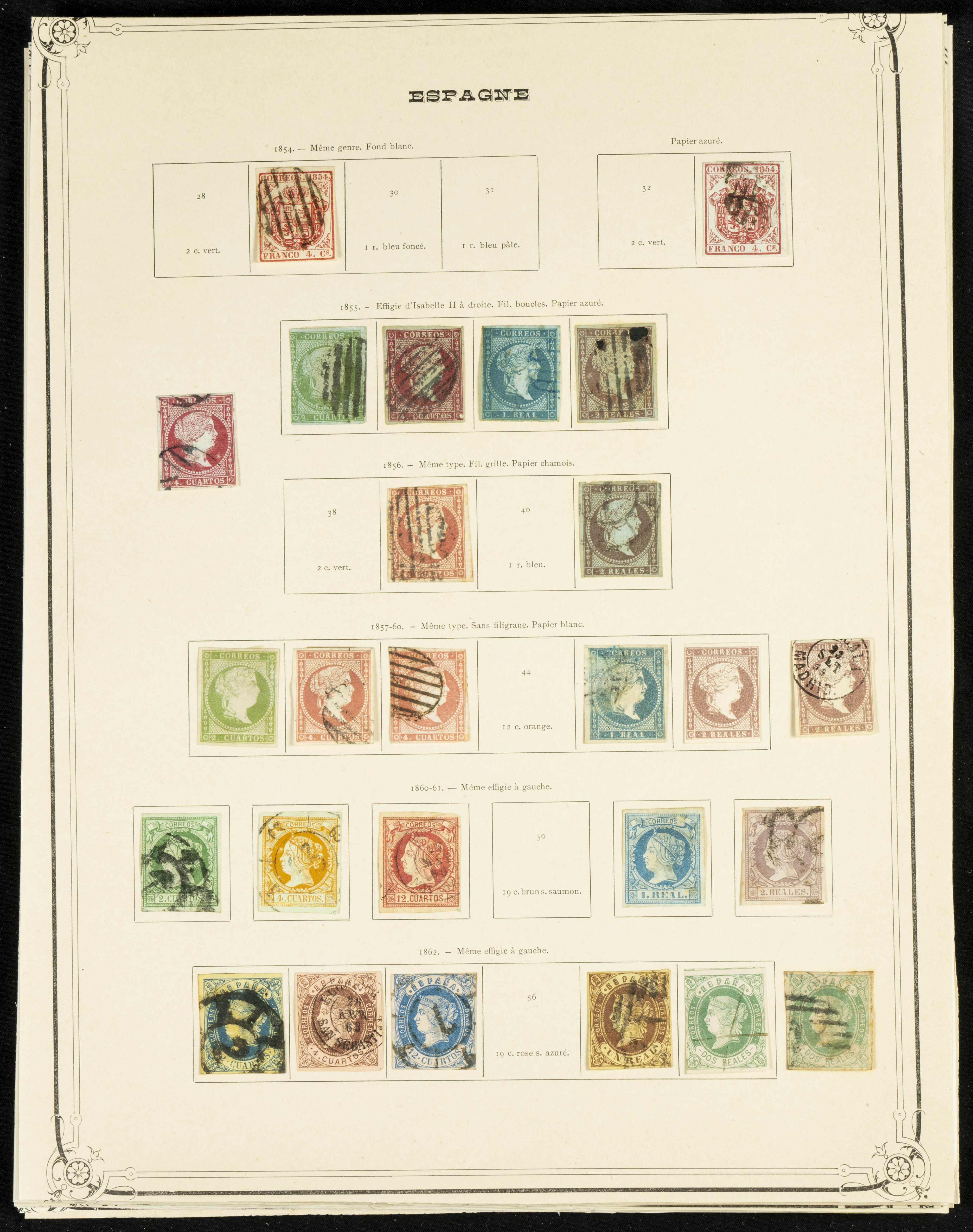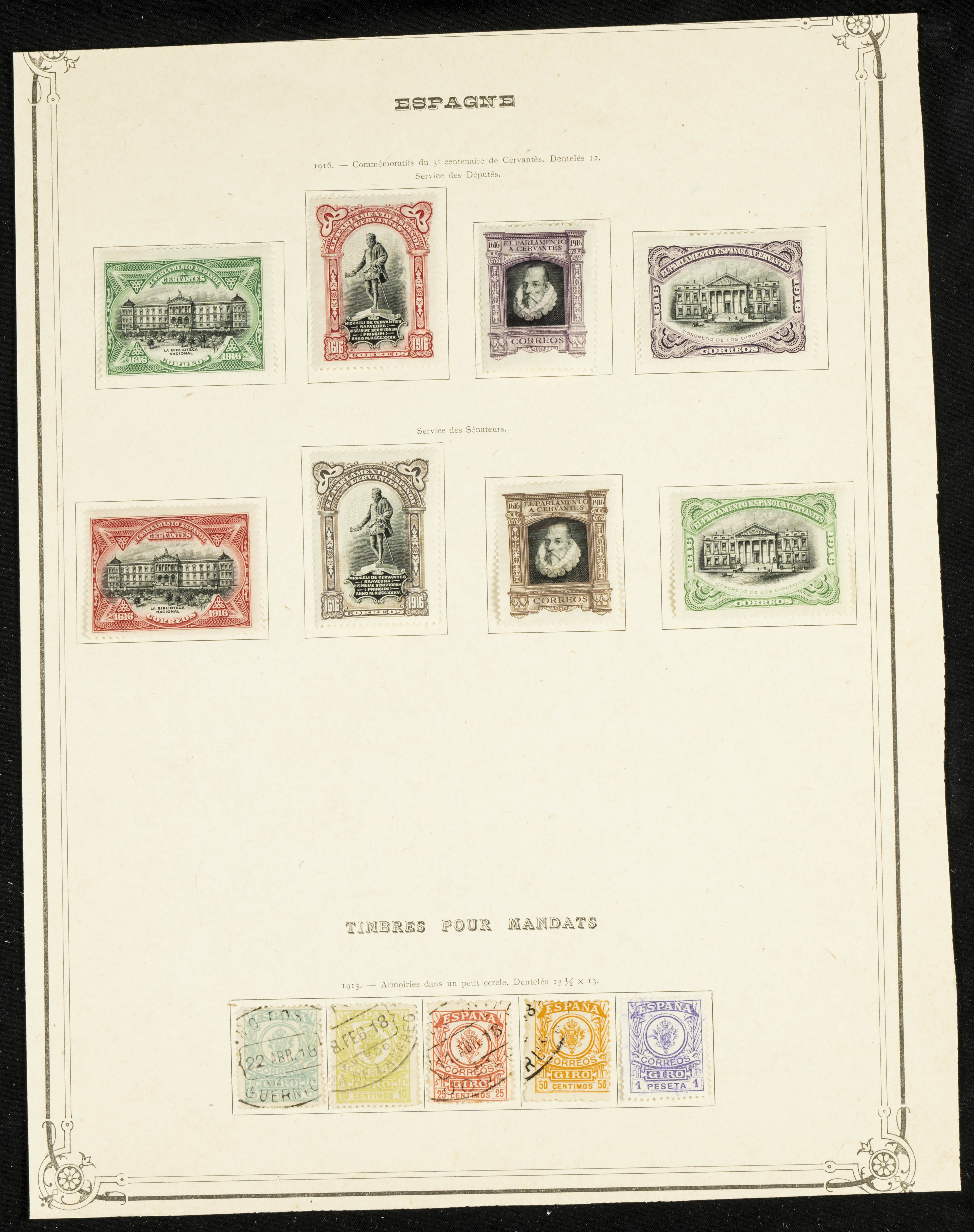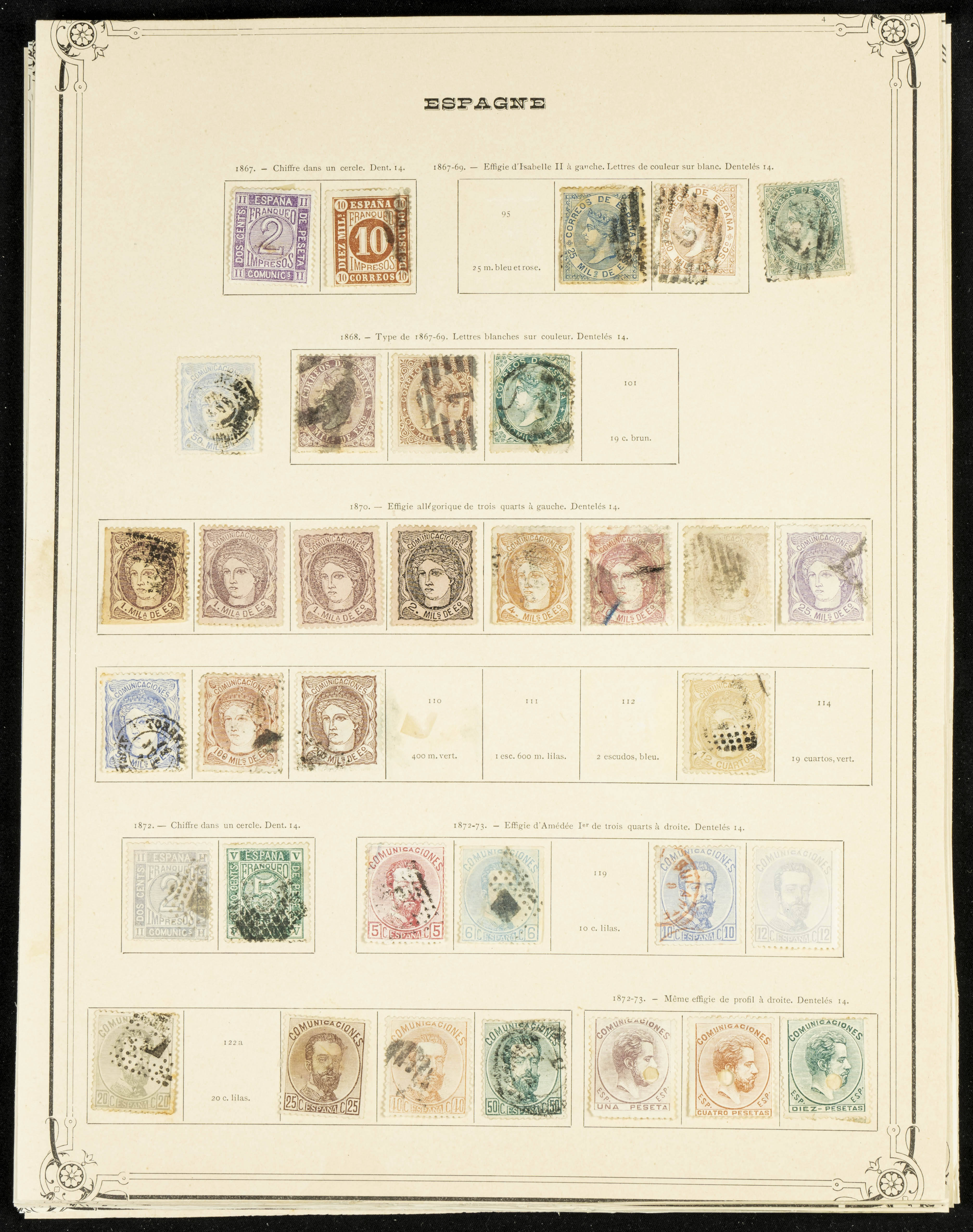 ★/(1850ca). Interesante resto de colección entre 1850 y 1930, en nuevo y usado, de la parte clásica destacan el 19 cuartos de 1865 sin dentar, 1866 y 1867, además de algún sello nuevo, incluye la serie matasellada de Quijote entre otras. A EXAMINAR. Edifil 2026: +10.000 Euros