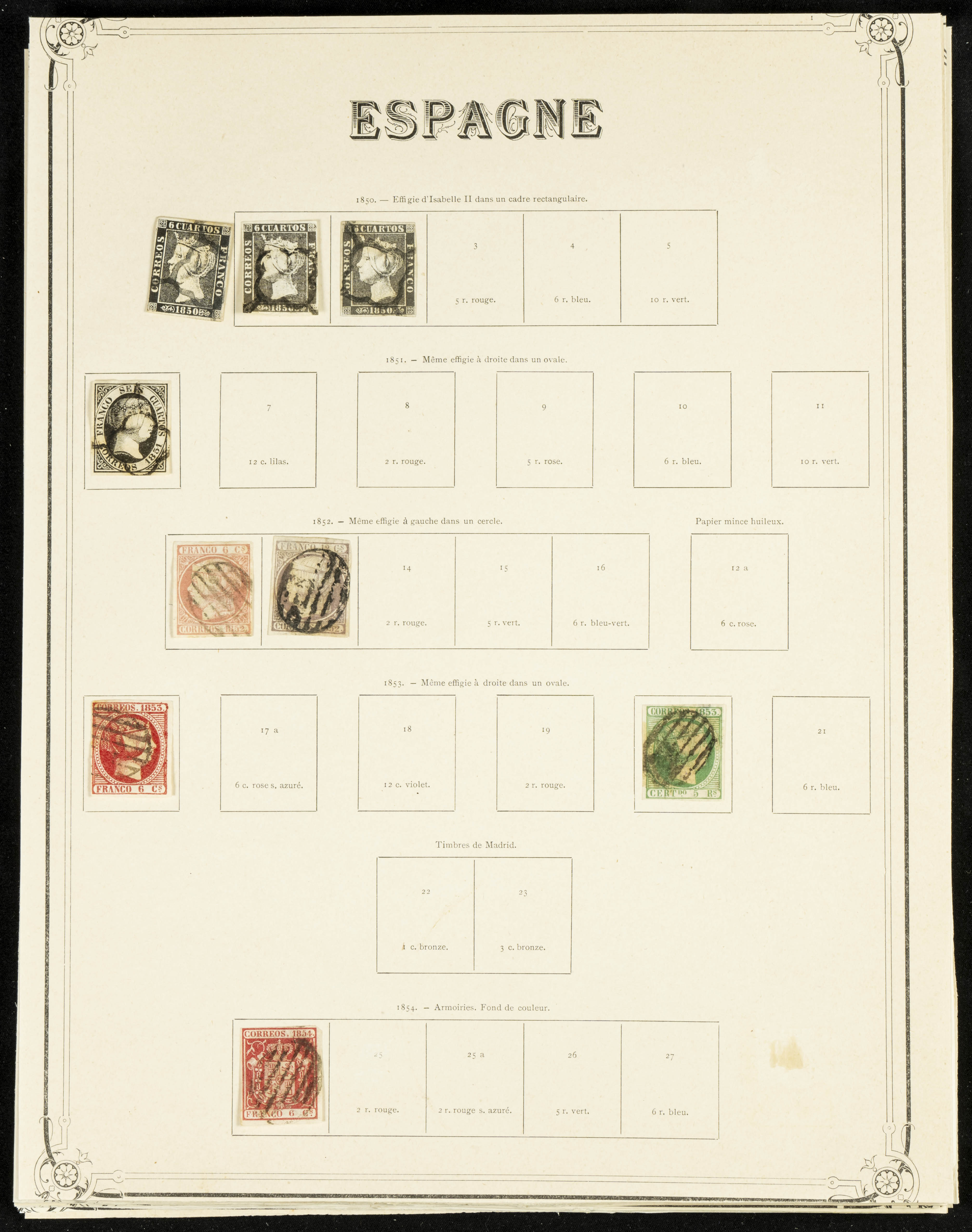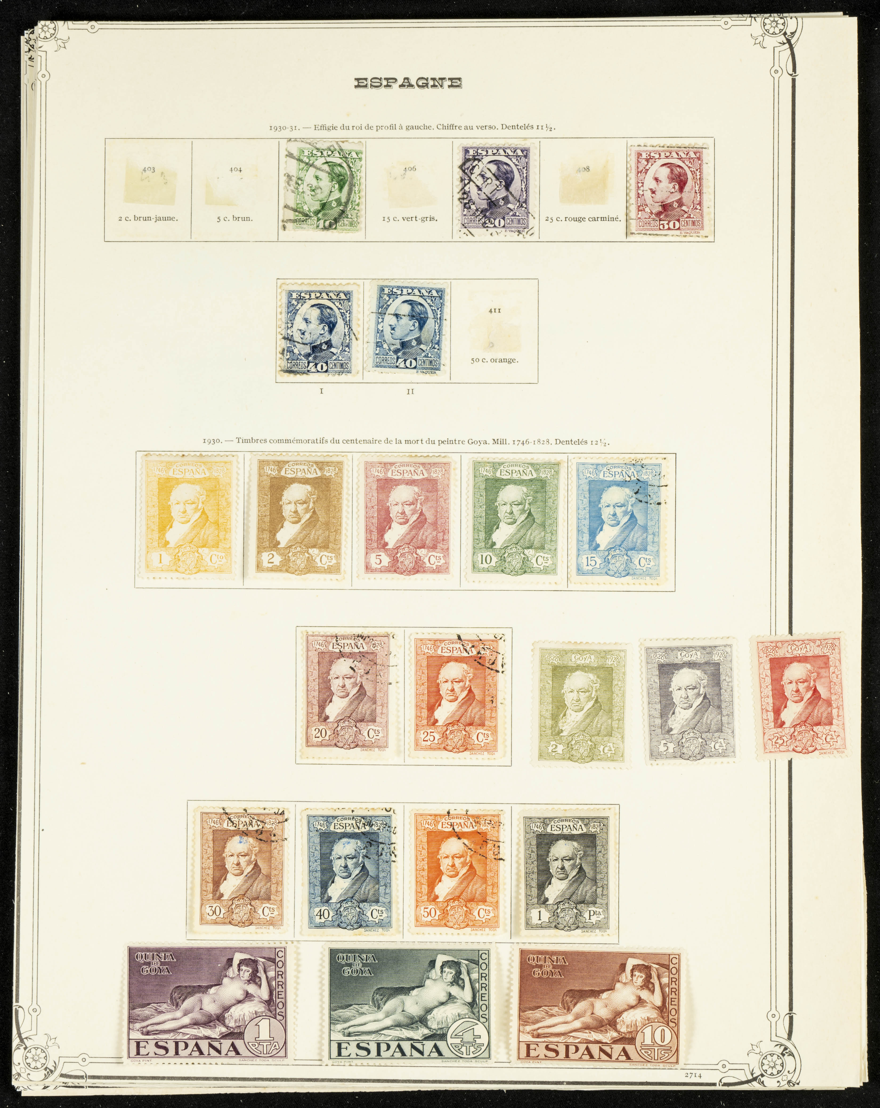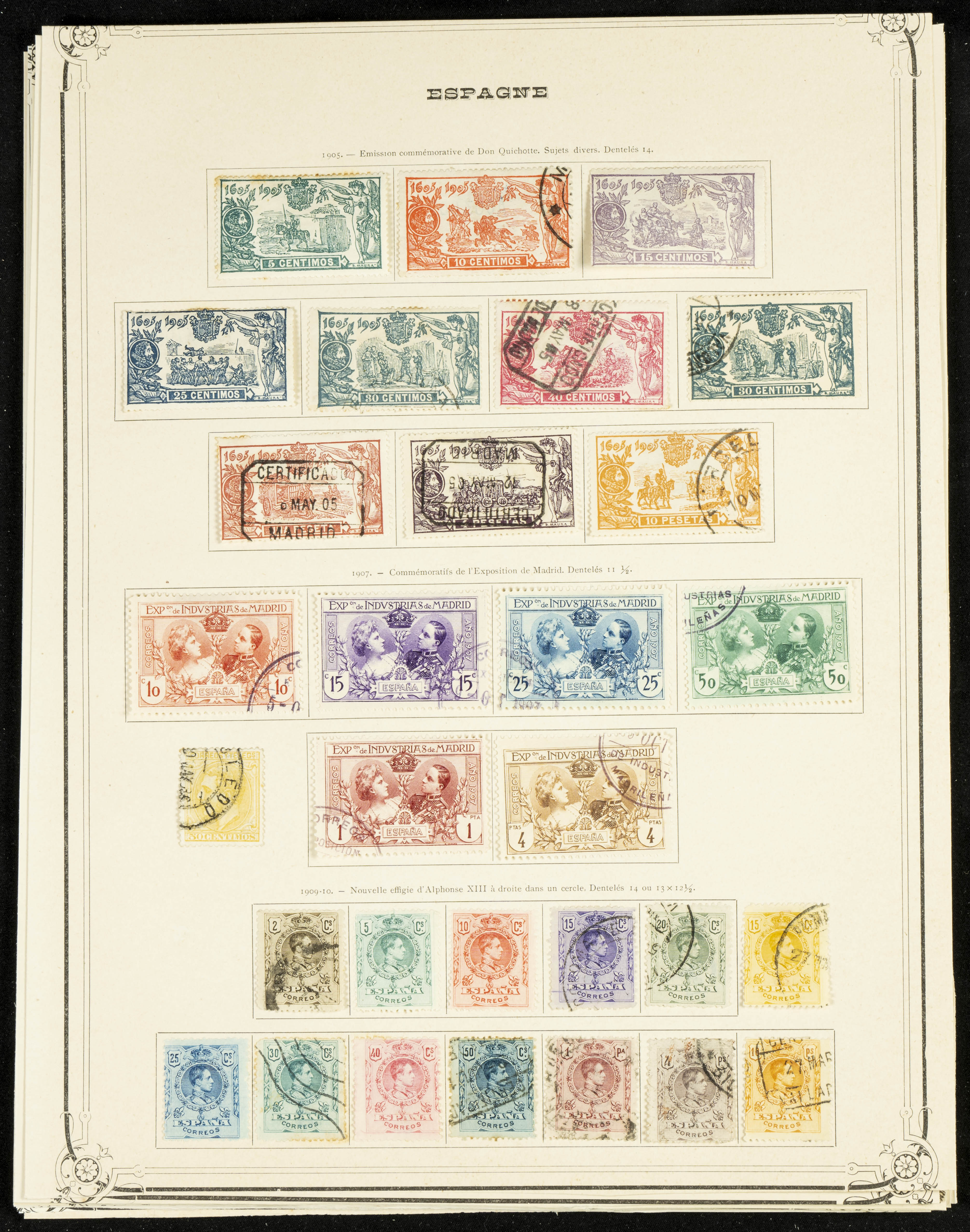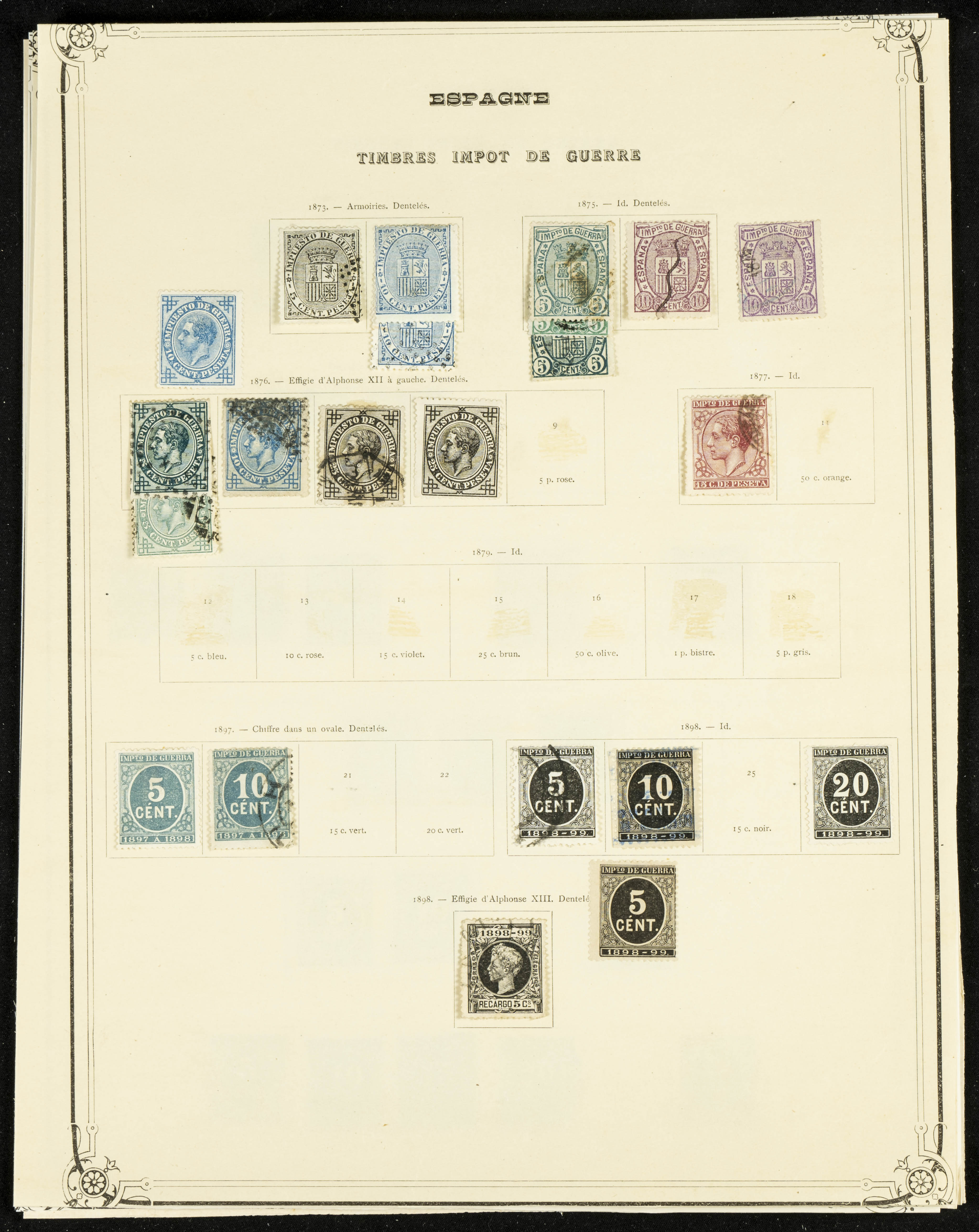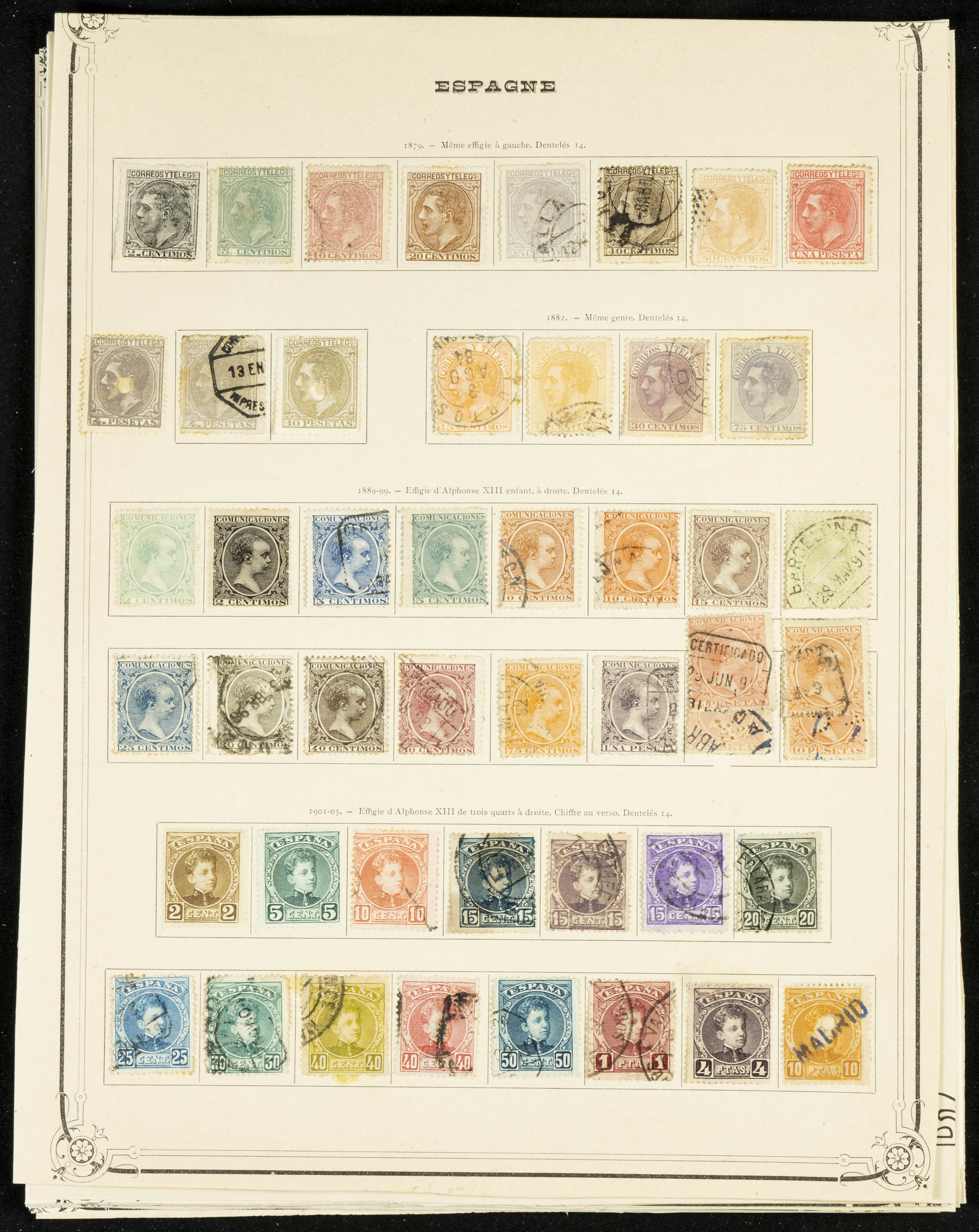 ★/(1850ca). Interesante resto de colección entre 1850 y 1930, en nuevo y usado, de la parte clásica destacan el 19 cuartos de 1865 sin dentar, 1866 y 1867, además de algún sello nuevo, incluye la serie matasellada de Quijote entre otras. A EXAMINAR. Edifil 2026: +10.000 Euros