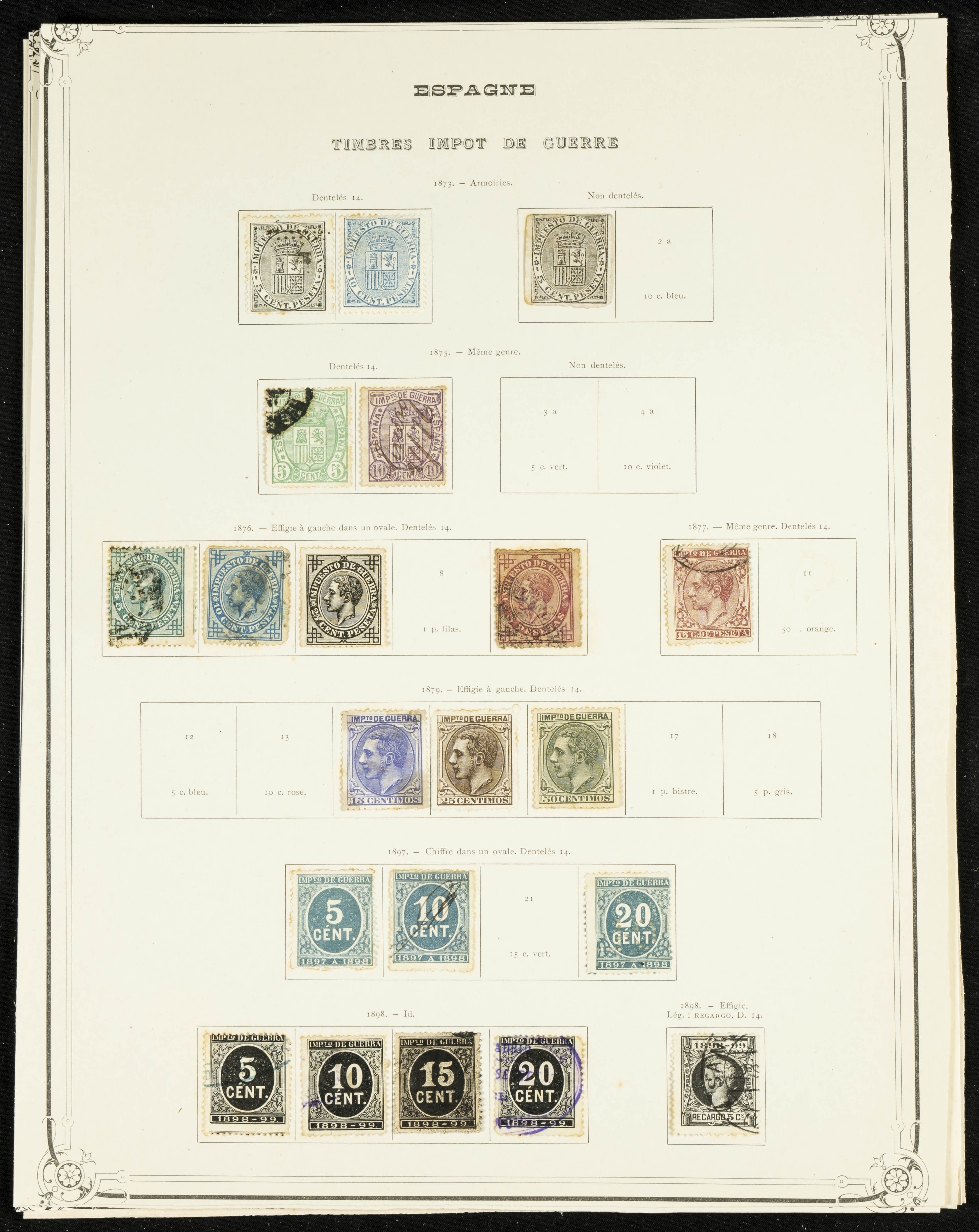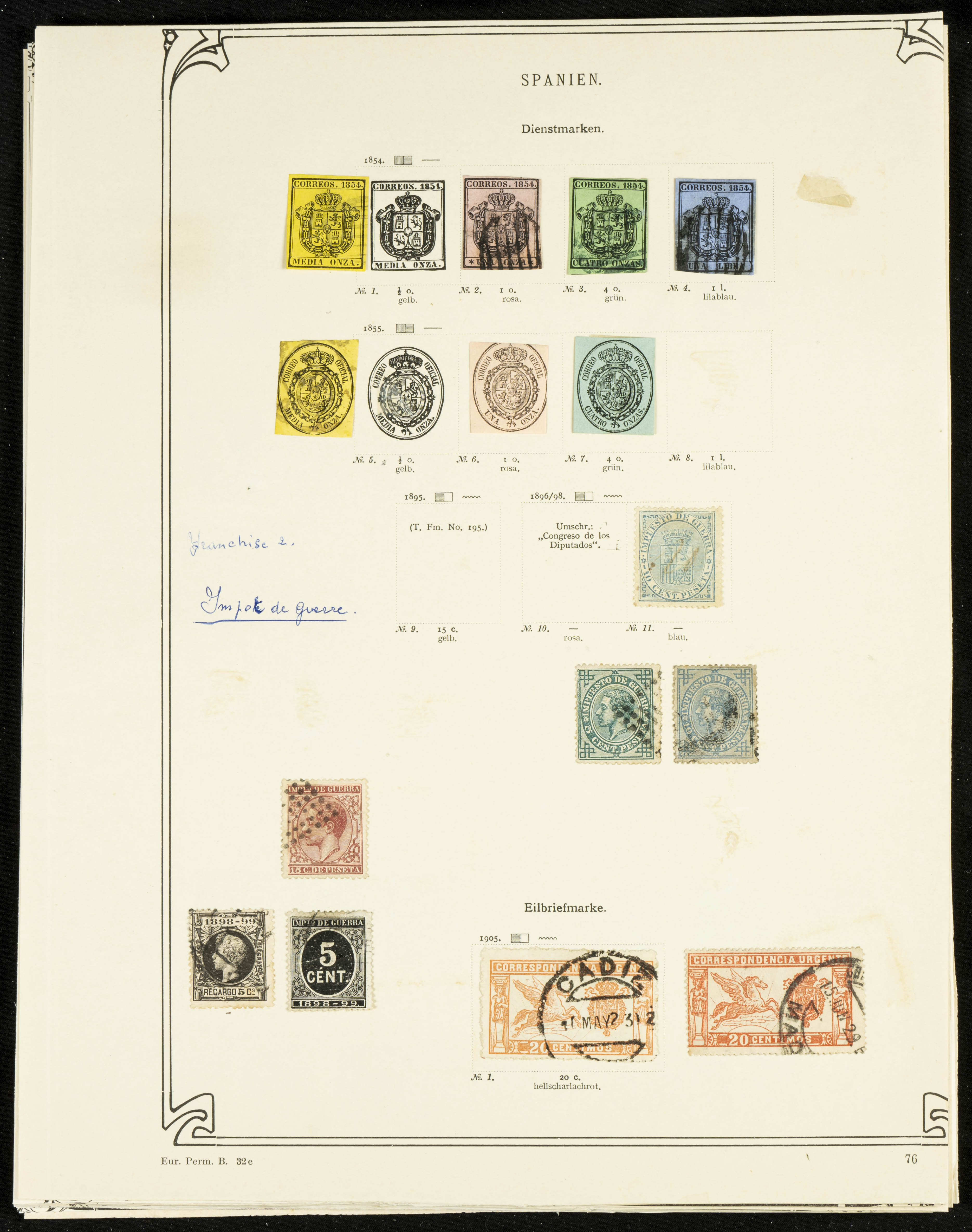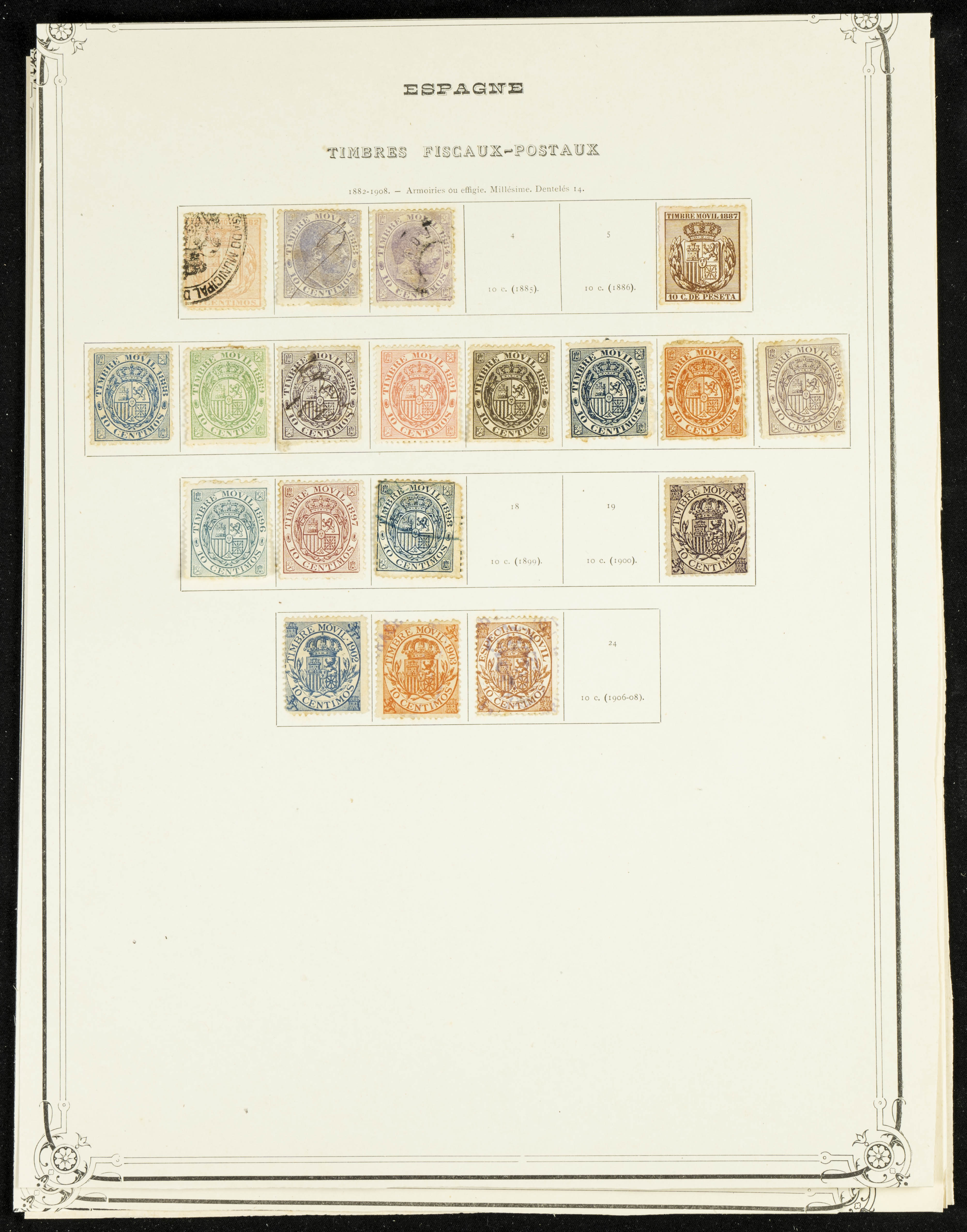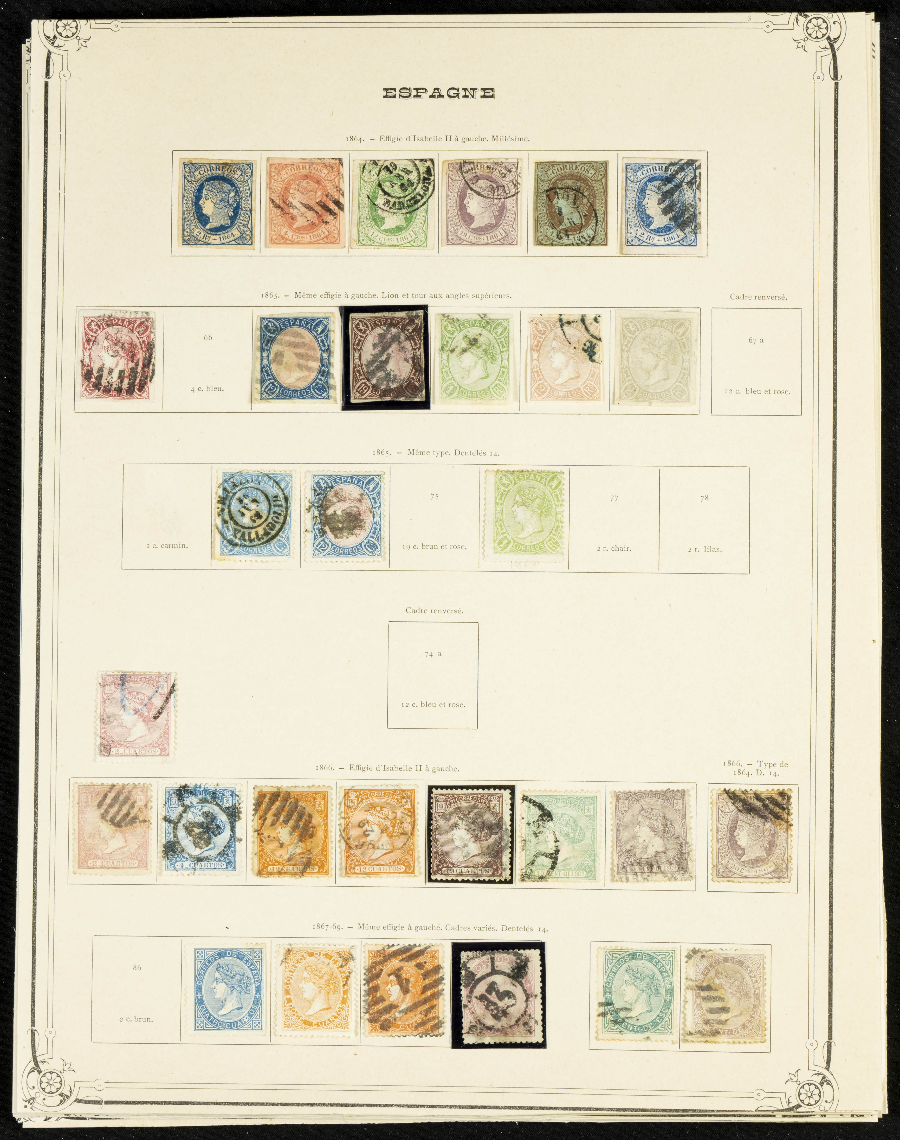 ★/(1850ca). Interesante resto de colección entre 1850 y 1930, en nuevo y usado, de la parte clásica destacan el 19 cuartos de 1865 sin dentar, 1866 y 1867, además de algún sello nuevo, incluye la serie matasellada de Quijote entre otras. A EXAMINAR. Edifil 2026: +10.000 Euros
