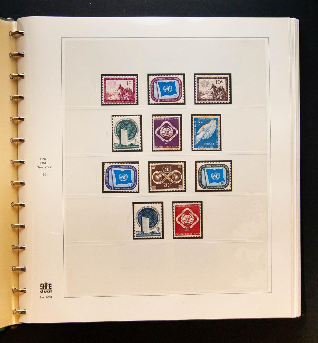 ★★/★(1951ca). Colección prácticamente completa de Naciones Unidas entre 1951 y 2012, en nuevo e incluyendo hojas bloque y la mayoría de carnets emitidos en este periodo, además de las oficinas de Ginebra y Viena (todo montado en álbumes Safe seminuevos). ALTO VALOR CATALOGO. A EXAMINAR.