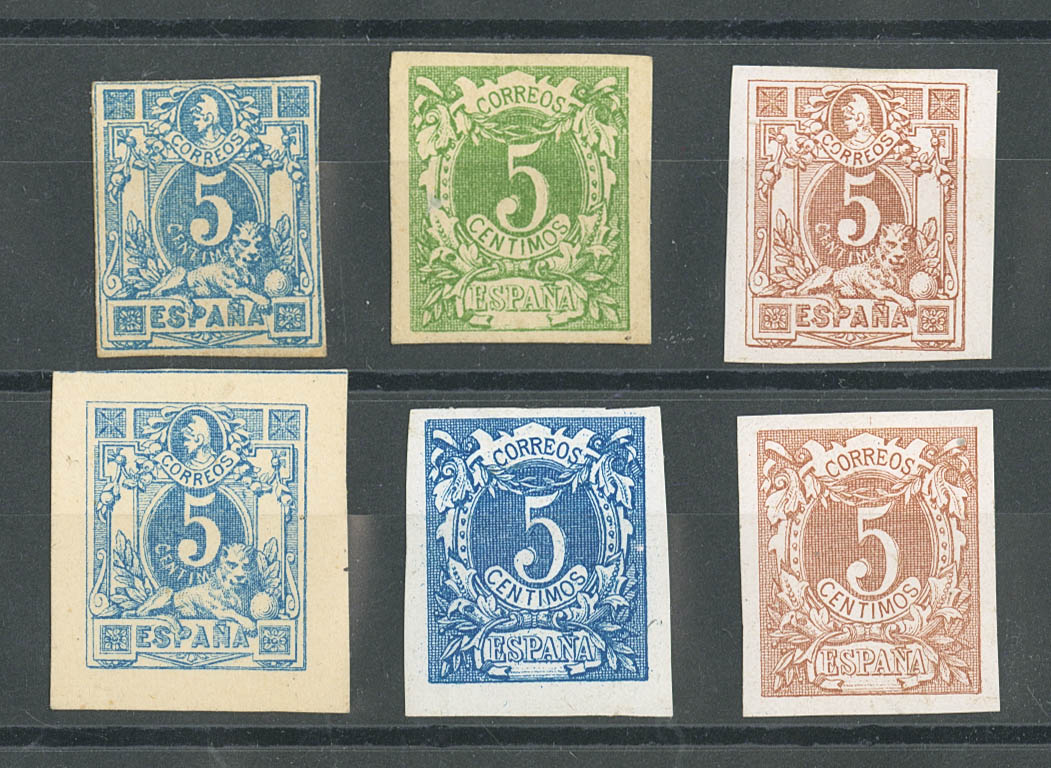 (★)1873. Conjunto de seis ENSAYOS DE COLOR, en azul (3), verde y castaño claro (2), sobre cartulina fina o gruesa, con diseños diferentes, del sello de 5 cts de 1873. A EXAMINAR.