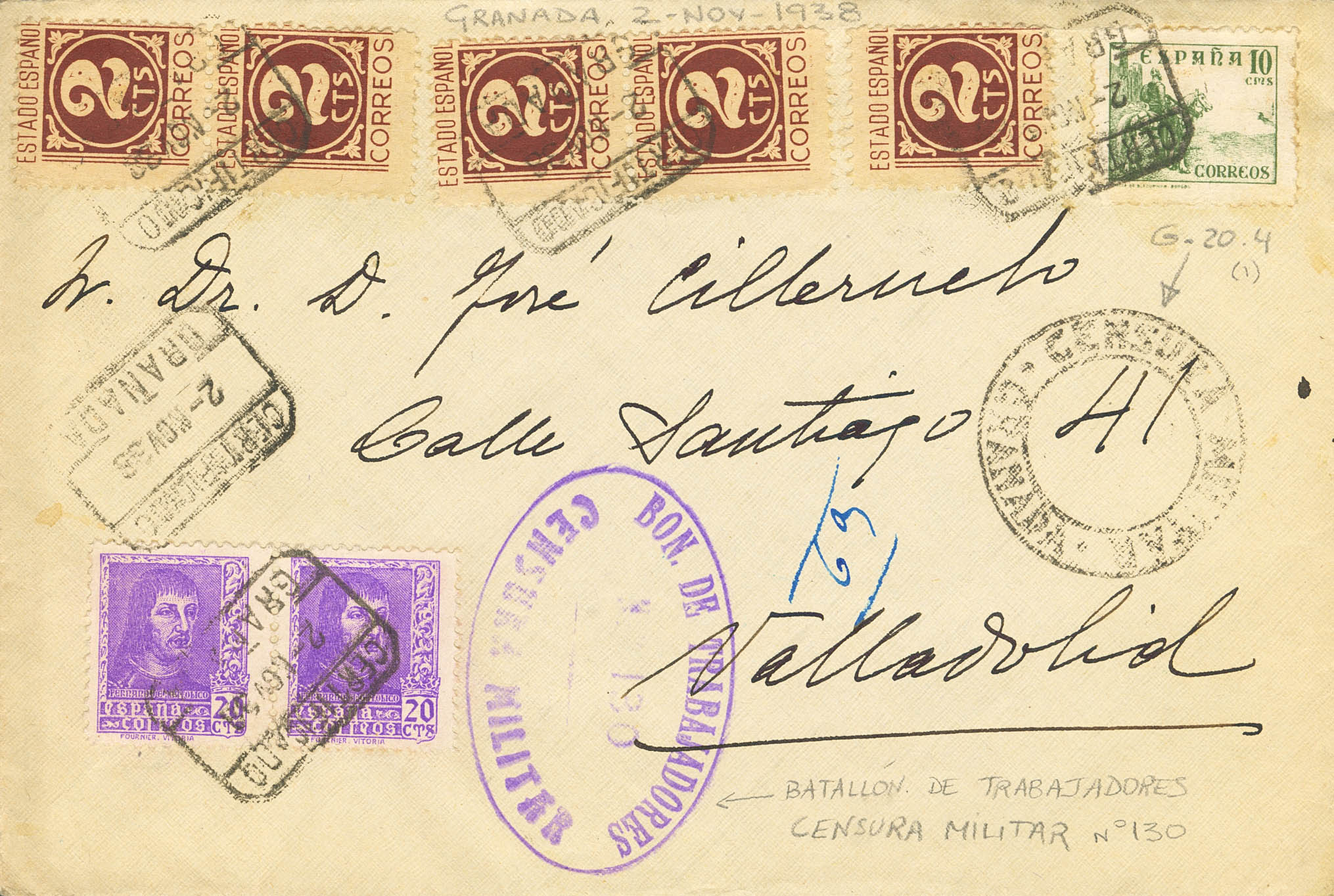 842(2), 815(5), 817. 1938. 20 cts violeta, pareja, 2 cts castaño, cinco sellos y 10 cts verde. Certificado de GRANADA a VALLADOLID. En el frente marca BON DE TRABAJADORES / Nº130 / CENSURA MILITAR, en violeta (este batallón de trabajadores se ubicó entre Badajoz y Córdoba pero esta carta demuestra que también estuvieron en Granada). MAGNIFICA Y MUY RARA.
