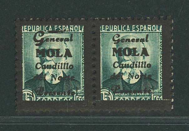 ★1938. 15 cts verde gris NO EMITIDO, pareja. CAUDILLO CON TRES "L" y un sello "G" GRANDE. MAGNIFICA Y EXTRAORDINARIAMENTE RARA, SELLO MENCIONADO COMO TIRADA SECUNDARIA POR REGUANT AL COMIENZO DE LAS EMISIONES DE BILBAO, INDICANDO LA NUMERACION A.139266 QUE COINCIDE CON LA DE ESTE SELLO.