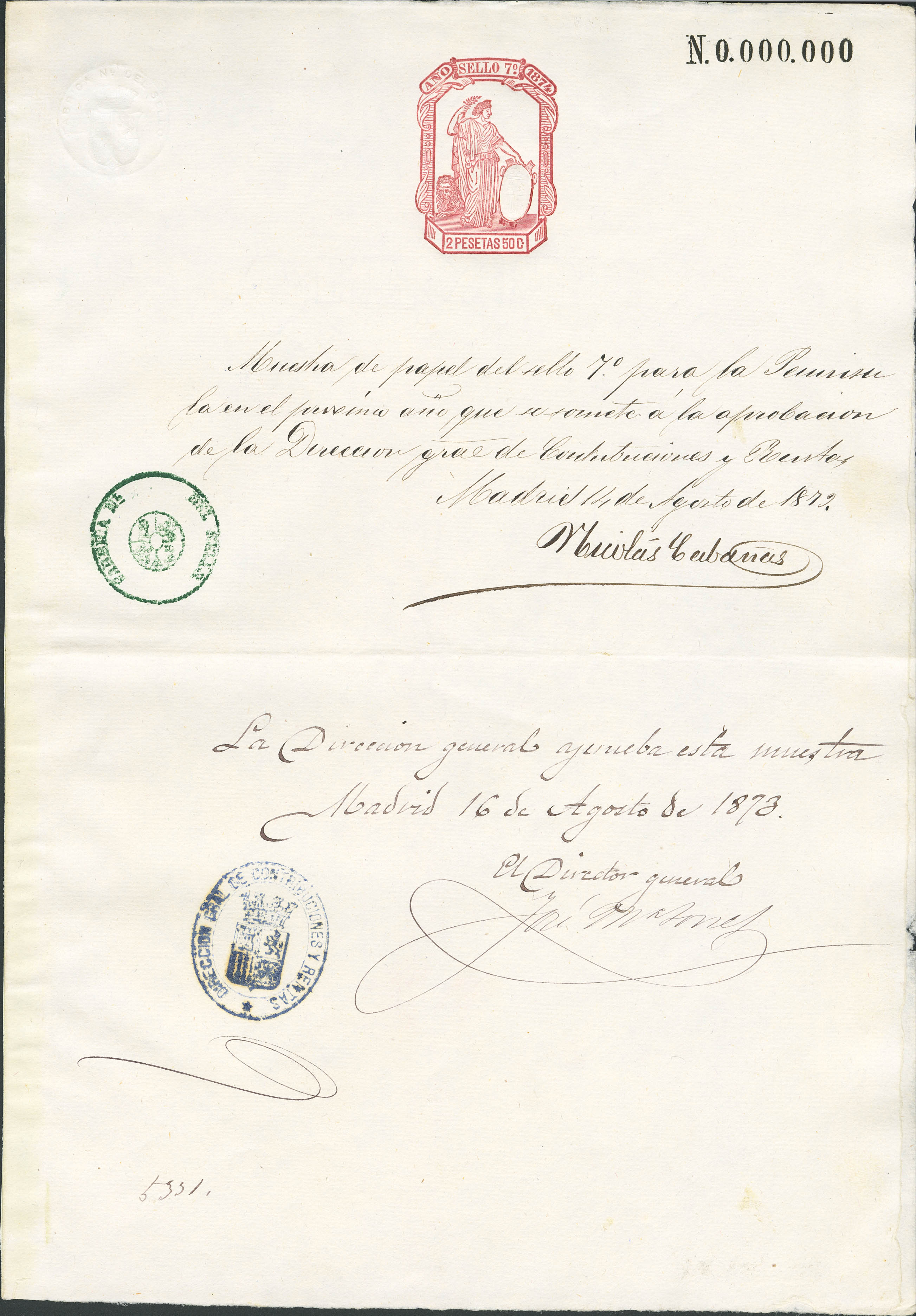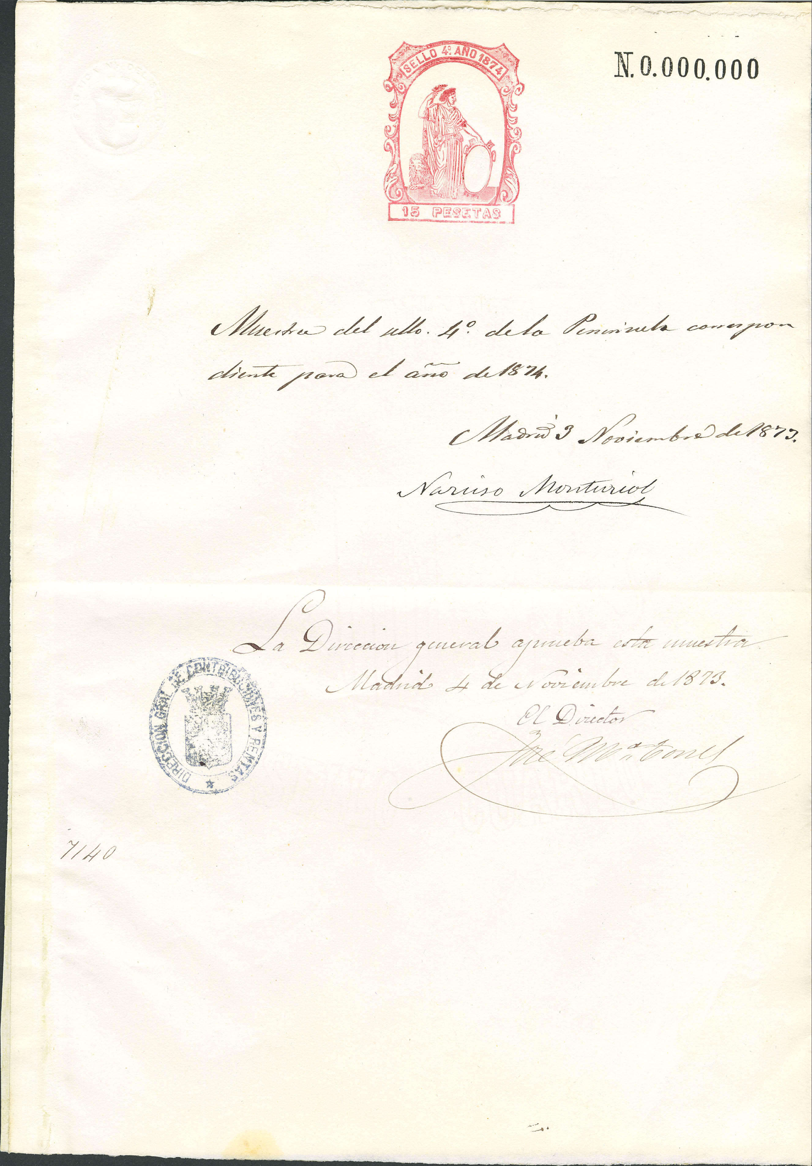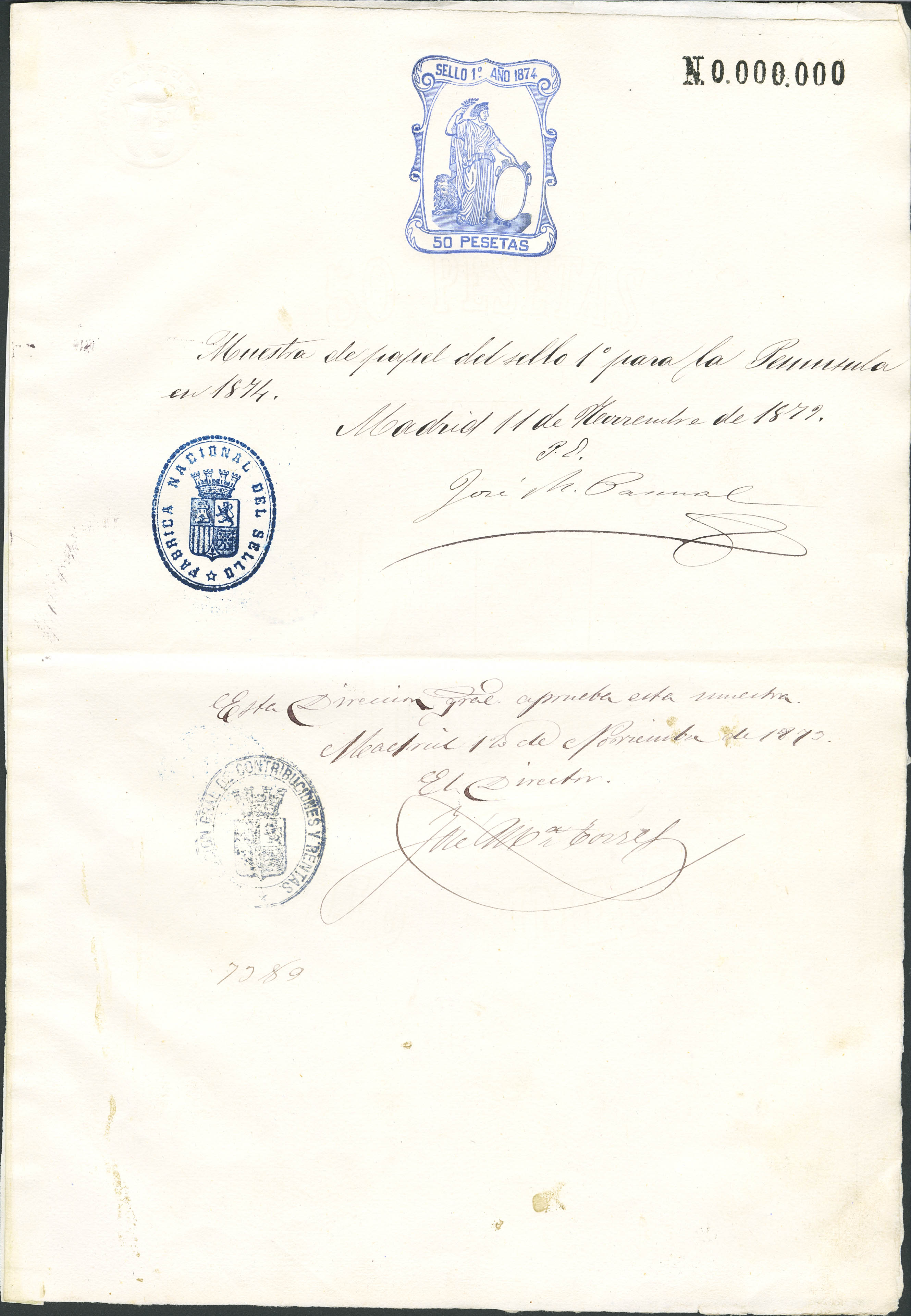 (★)1874. Siete documentos completos de POLIZAS de 2´50 pts carmín, 4 pts castaño, 8 pts castaño rojo, 15 pts carmín, 25 pts castaño amarillo, 37´50 pts violeta y 50 pts azul. Nº0.000.000 y anotaciones manuscritas "Muestra del papel del sello..." y "Esta dirección gral. aprueba esta muestra". MAGNIFICO Y RARISIMO CONJUNTO.