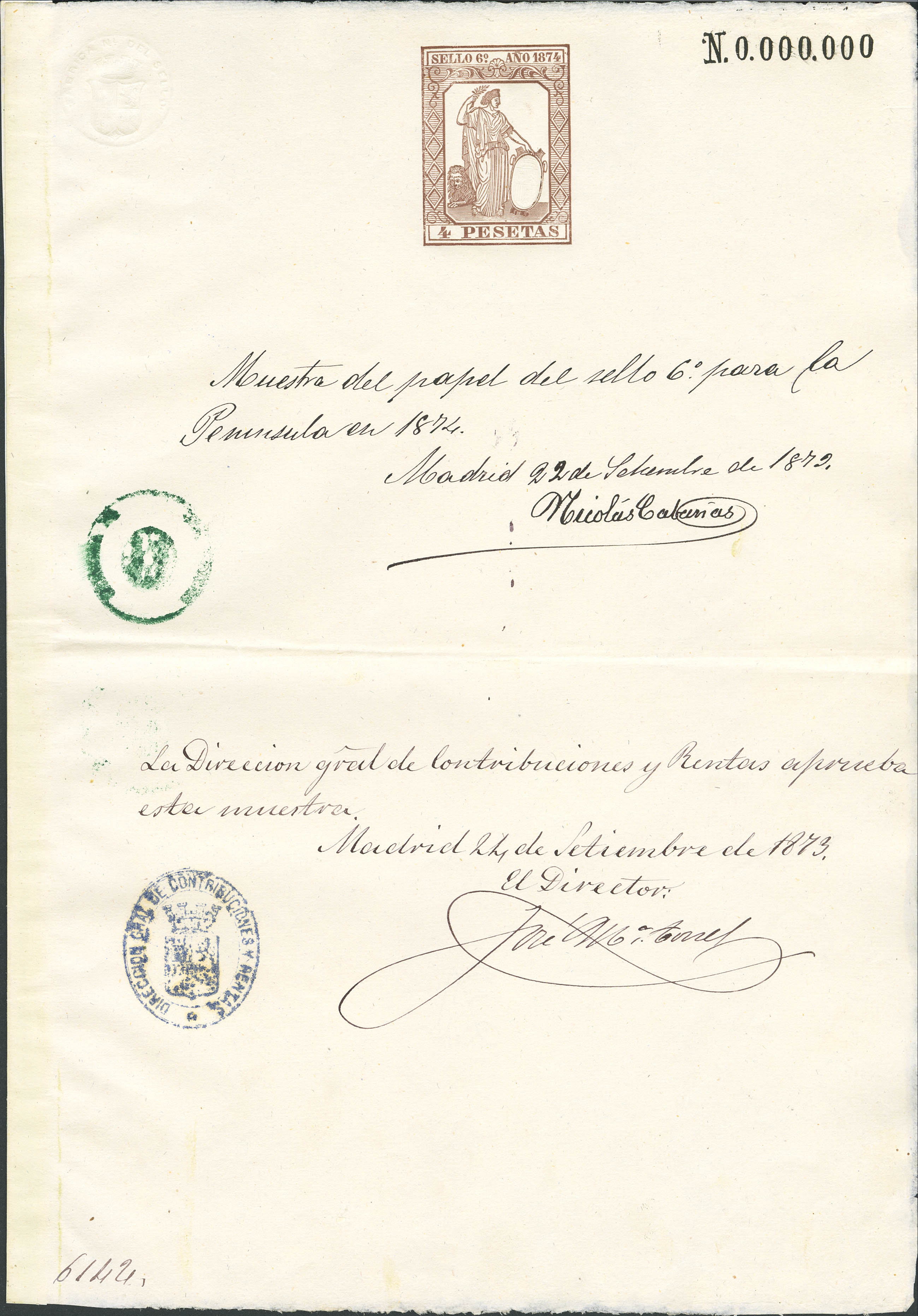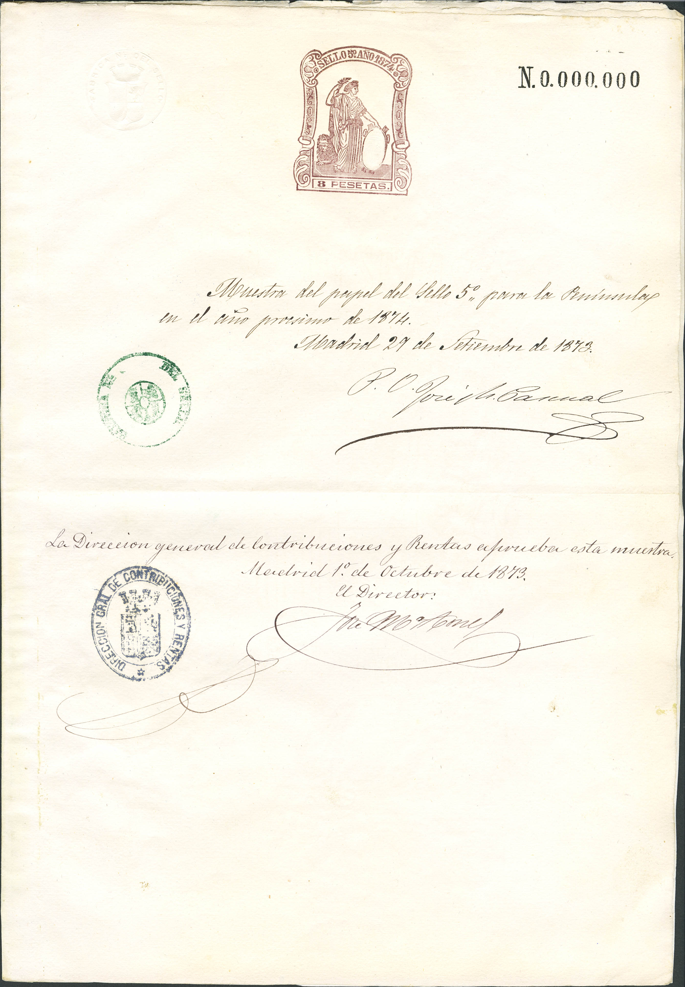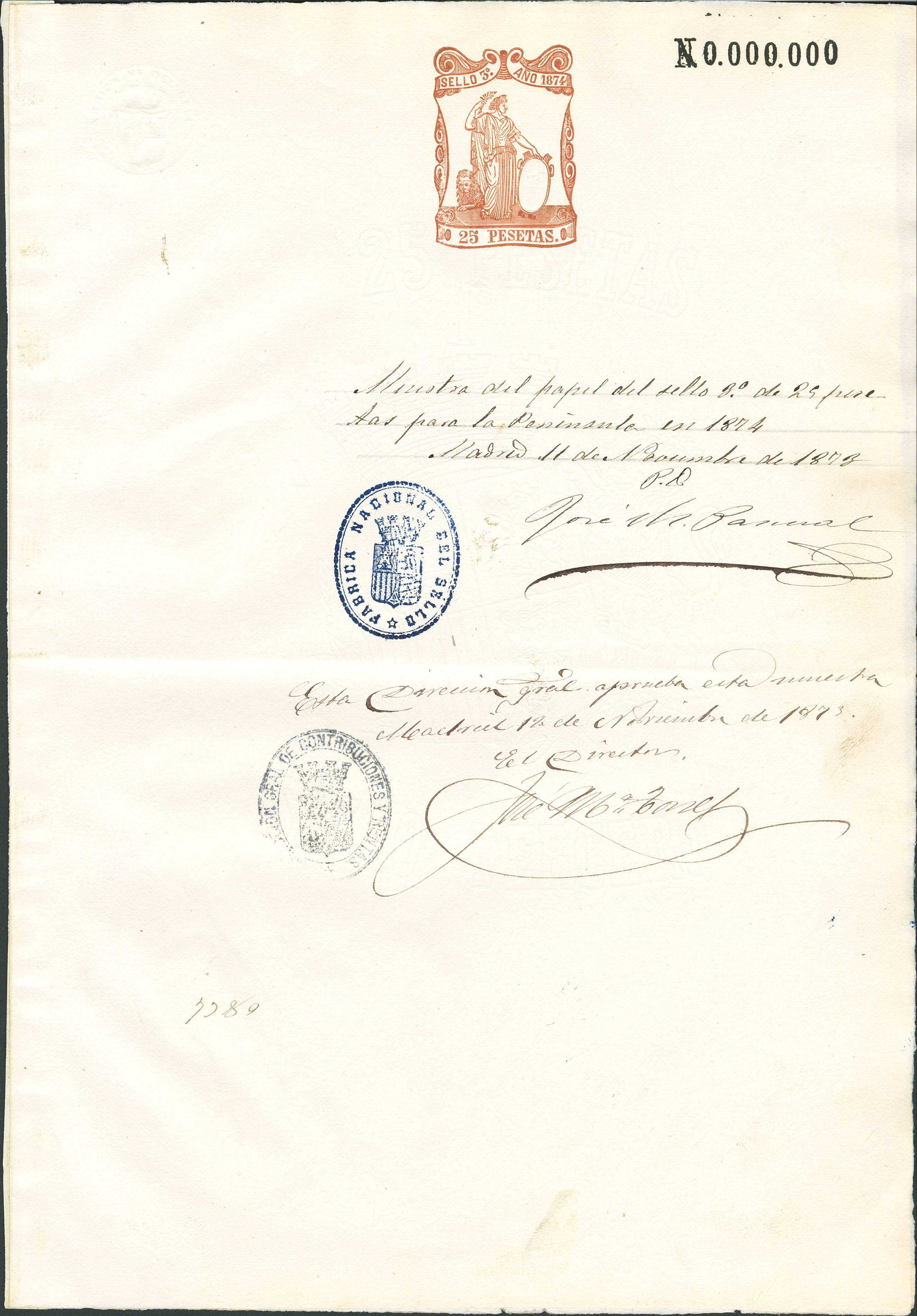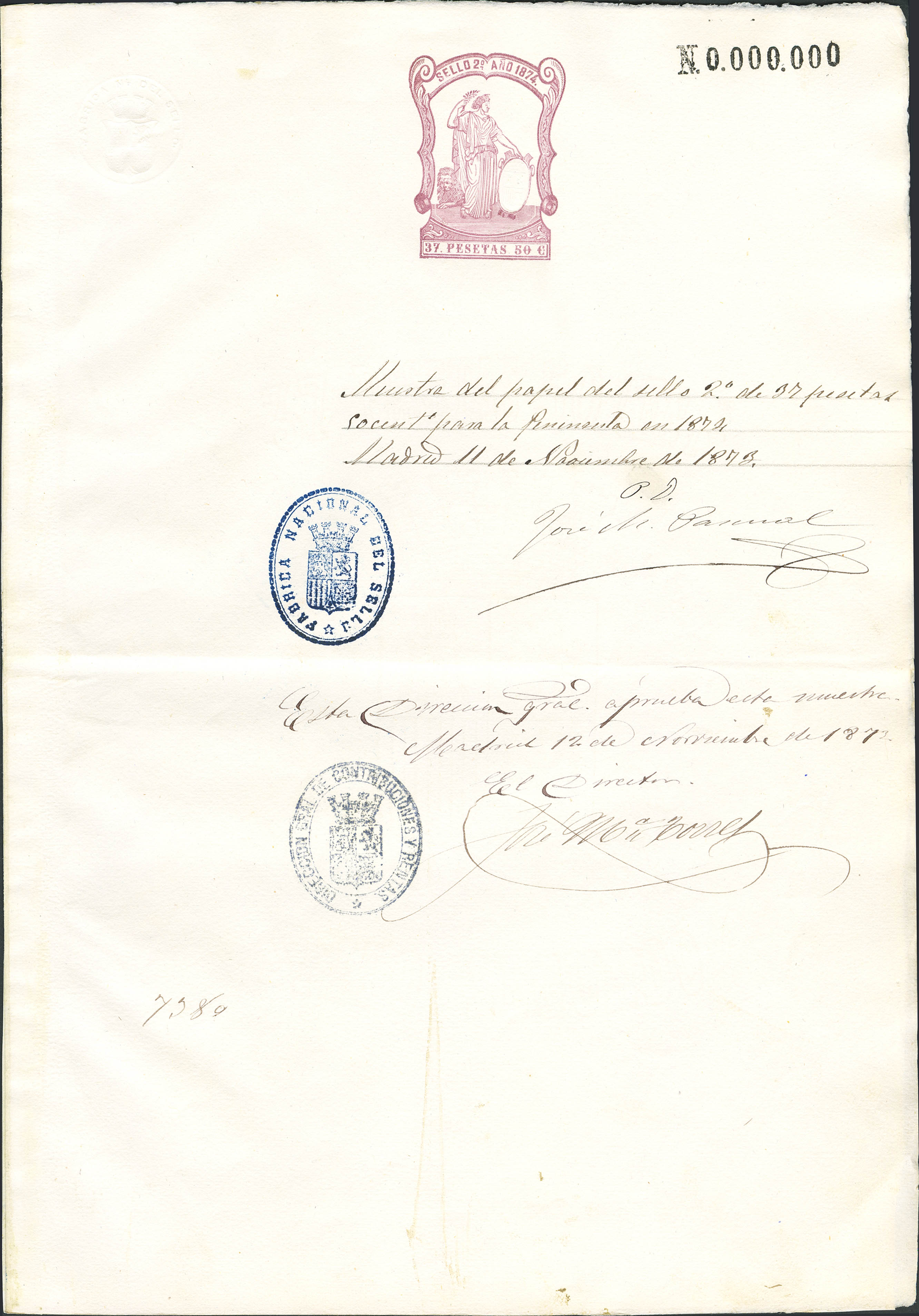 (★)1874. Siete documentos completos de POLIZAS de 2´50 pts carmín, 4 pts castaño, 8 pts castaño rojo, 15 pts carmín, 25 pts castaño amarillo, 37´50 pts violeta y 50 pts azul. Nº0.000.000 y anotaciones manuscritas "Muestra del papel del sello..." y "Esta dirección gral. aprueba esta muestra". MAGNIFICO Y RARISIMO CONJUNTO.