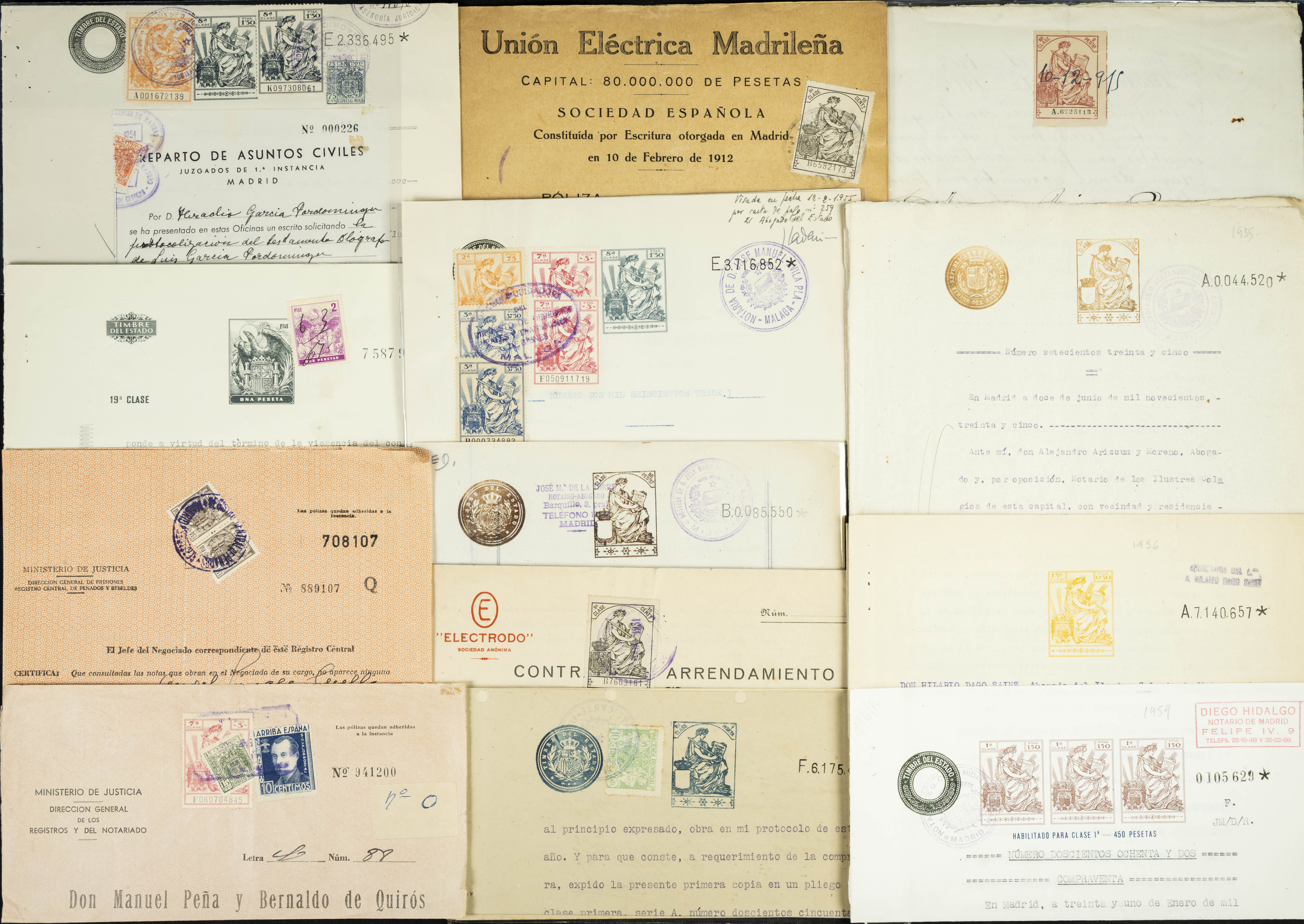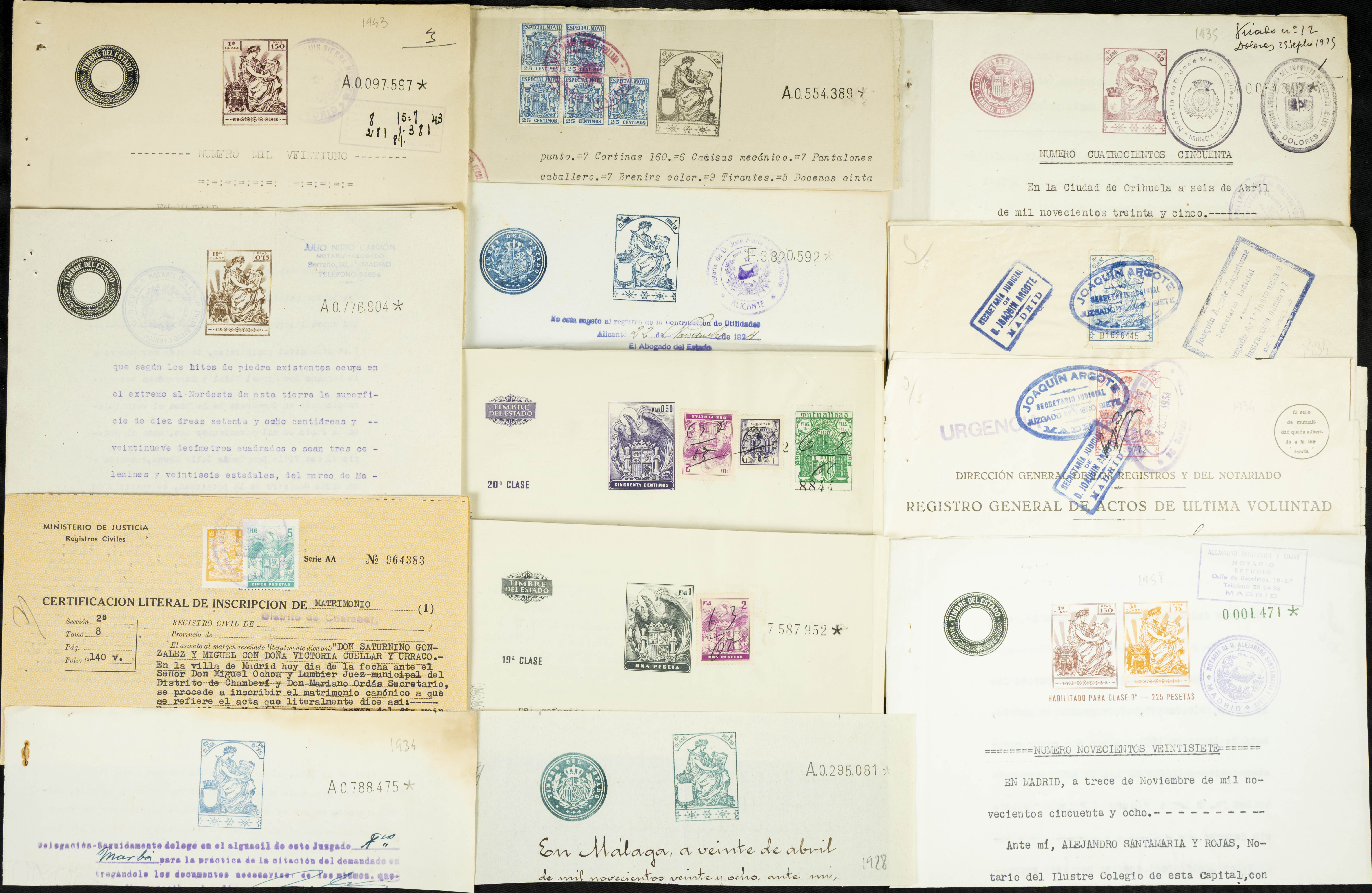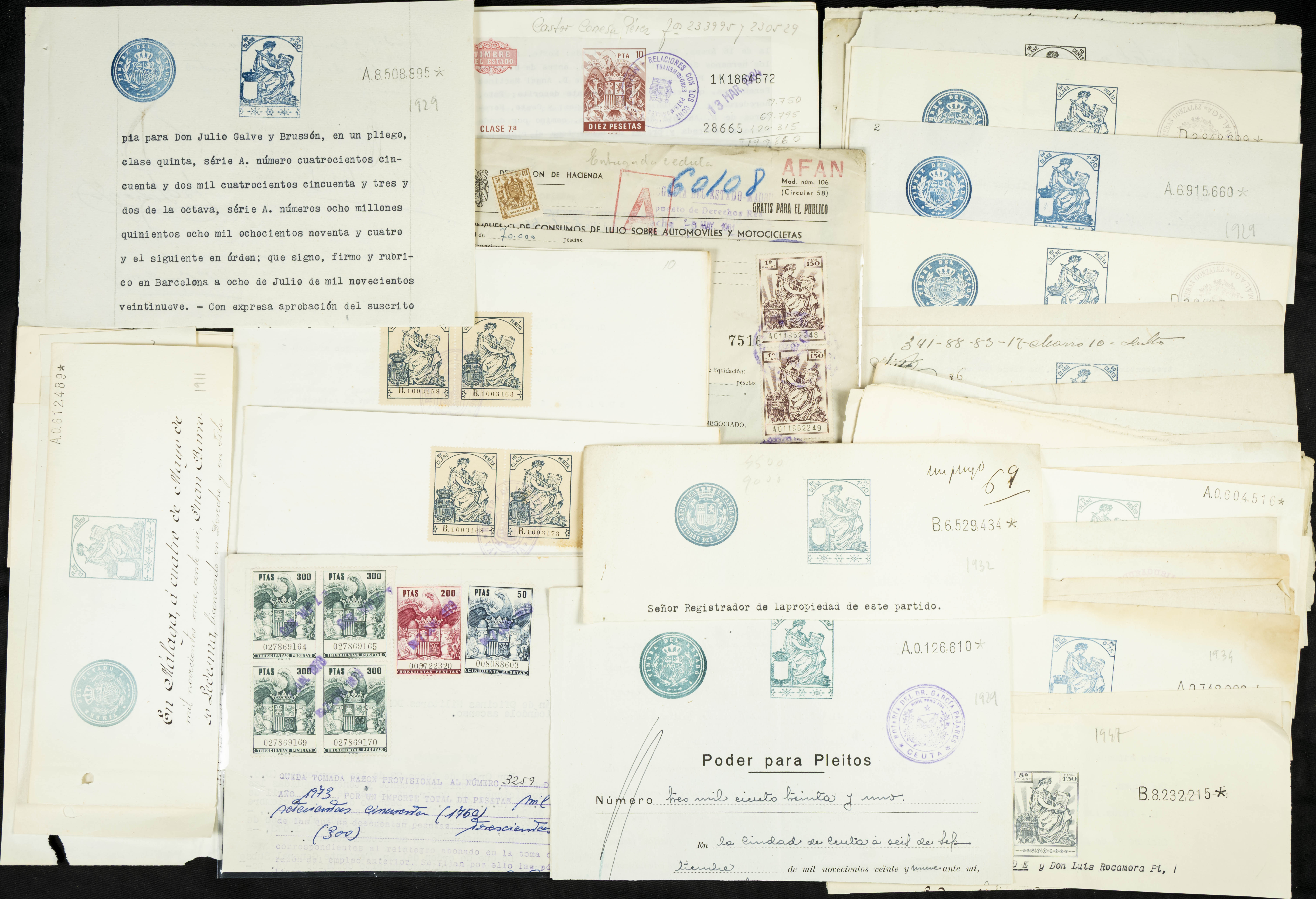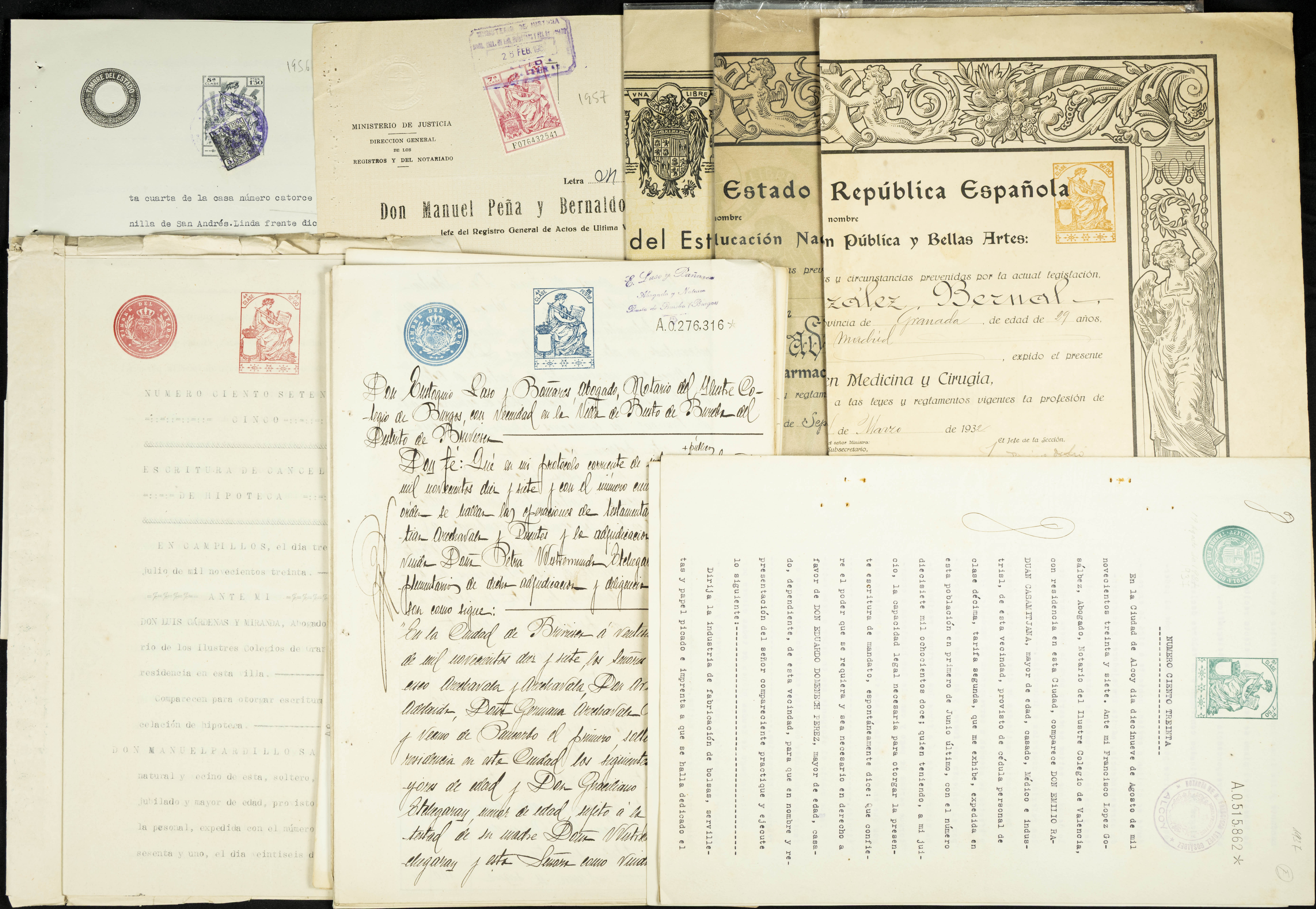 (1900ca). Espectacular conjunto de cientos de documentos fiscales con sellos de POLIZA entre 1900 y 1985, incluye escrituras, títulos universitarios, actas de matrimonio, contratos de arrendamiento, testamentos, actas de nacimiento, cancelación de hipotecas, etc, algunos muy interesantes. IMPRESCINDIBLE EXAMINAR. Ex-Alemany.