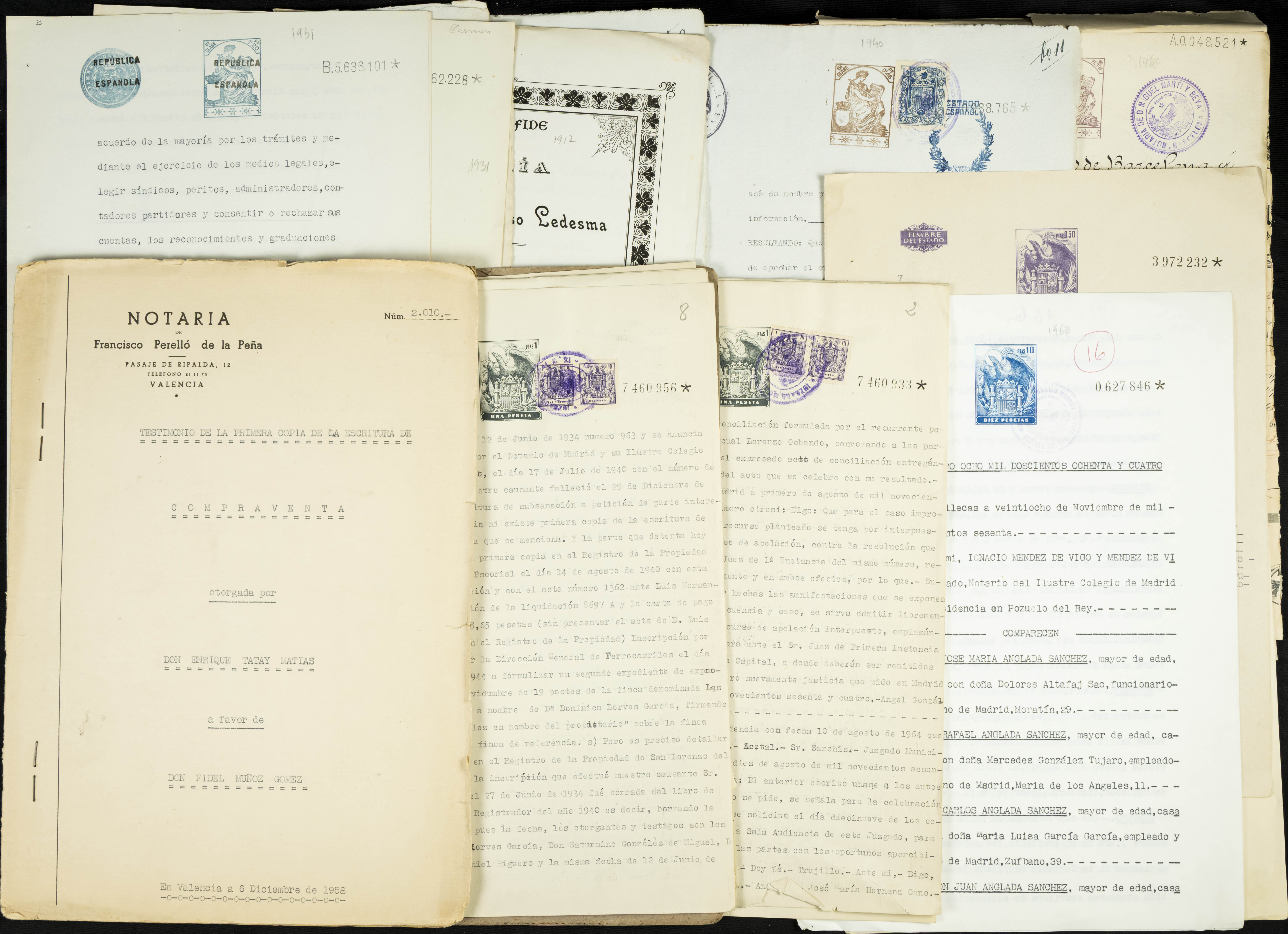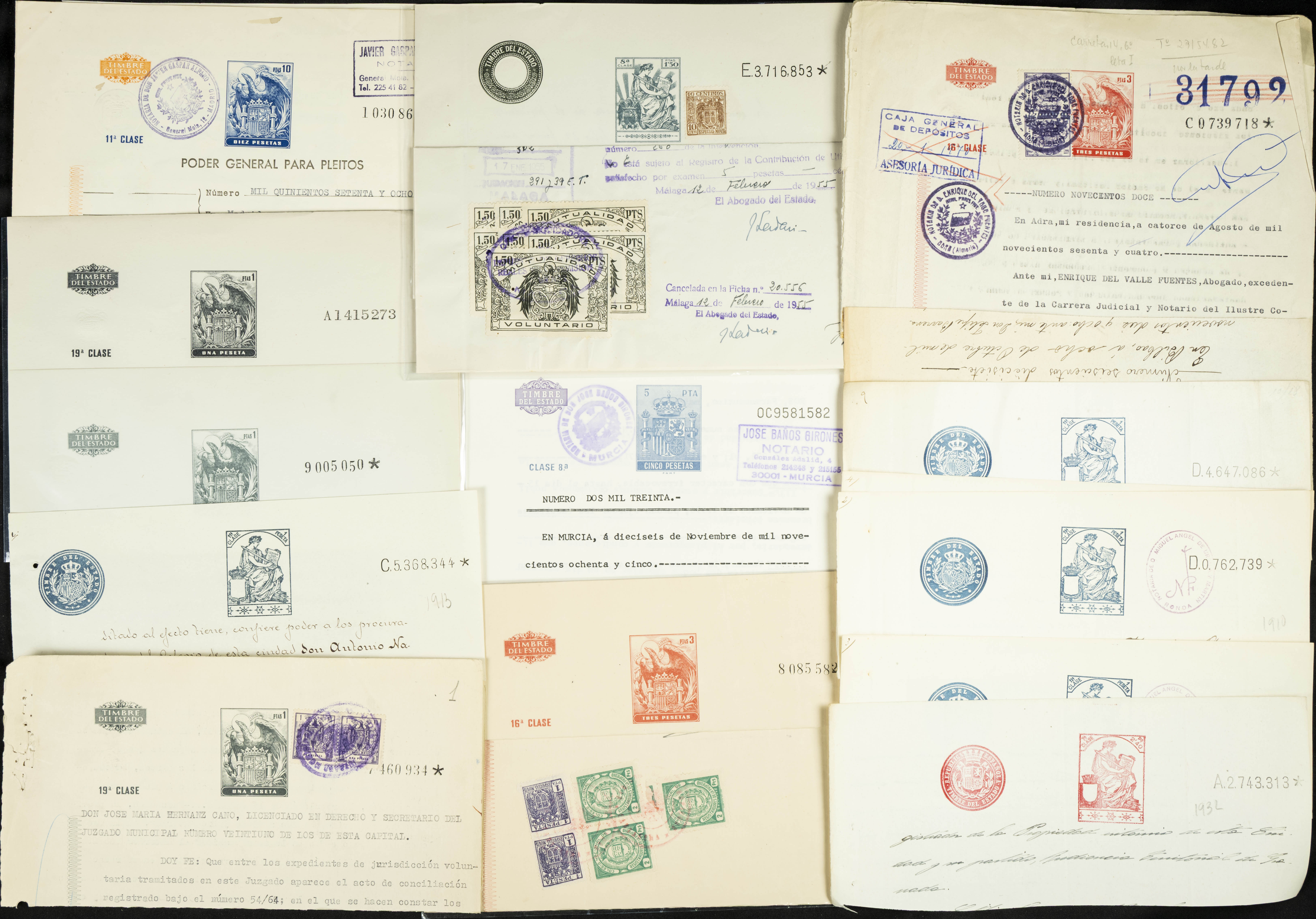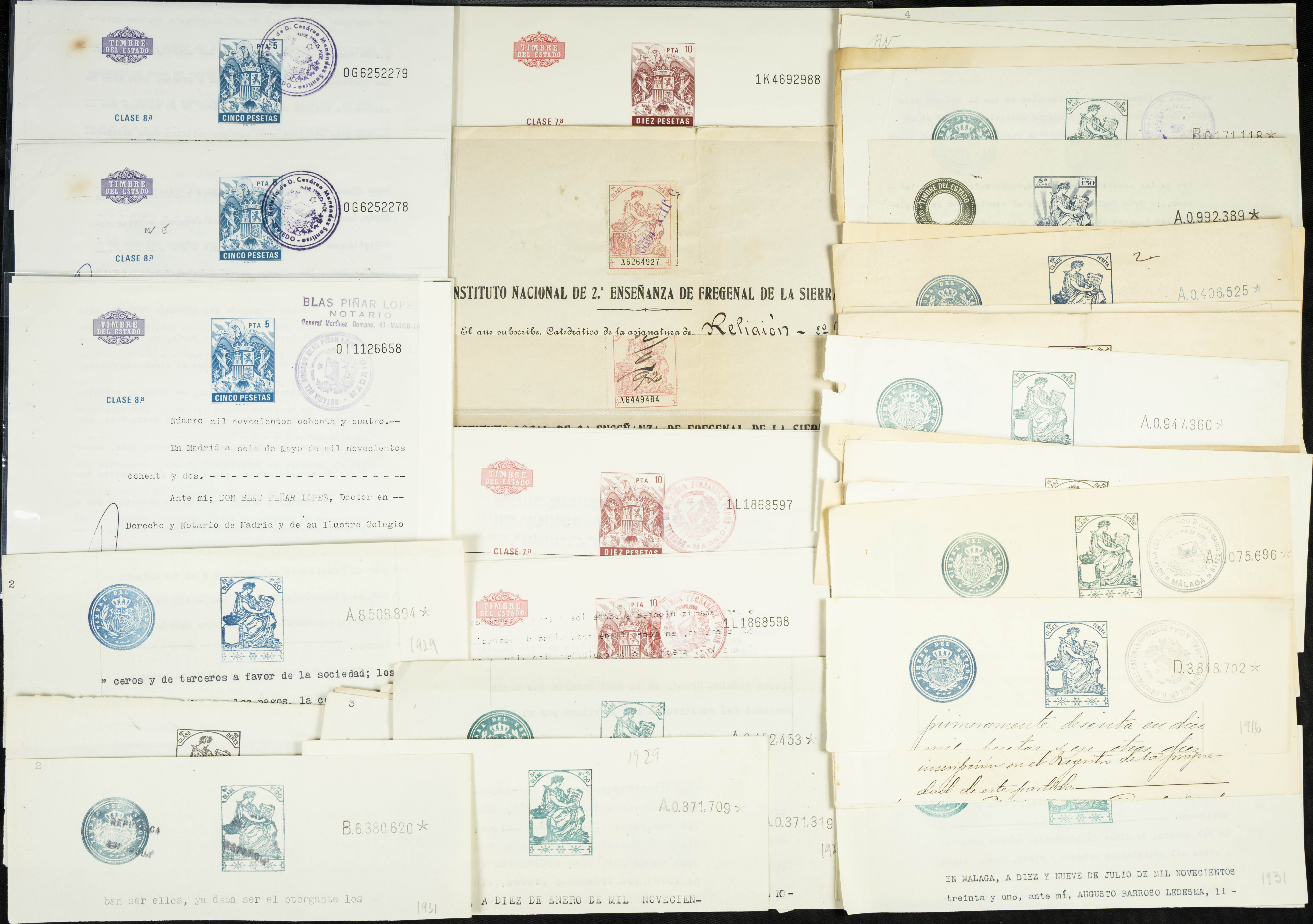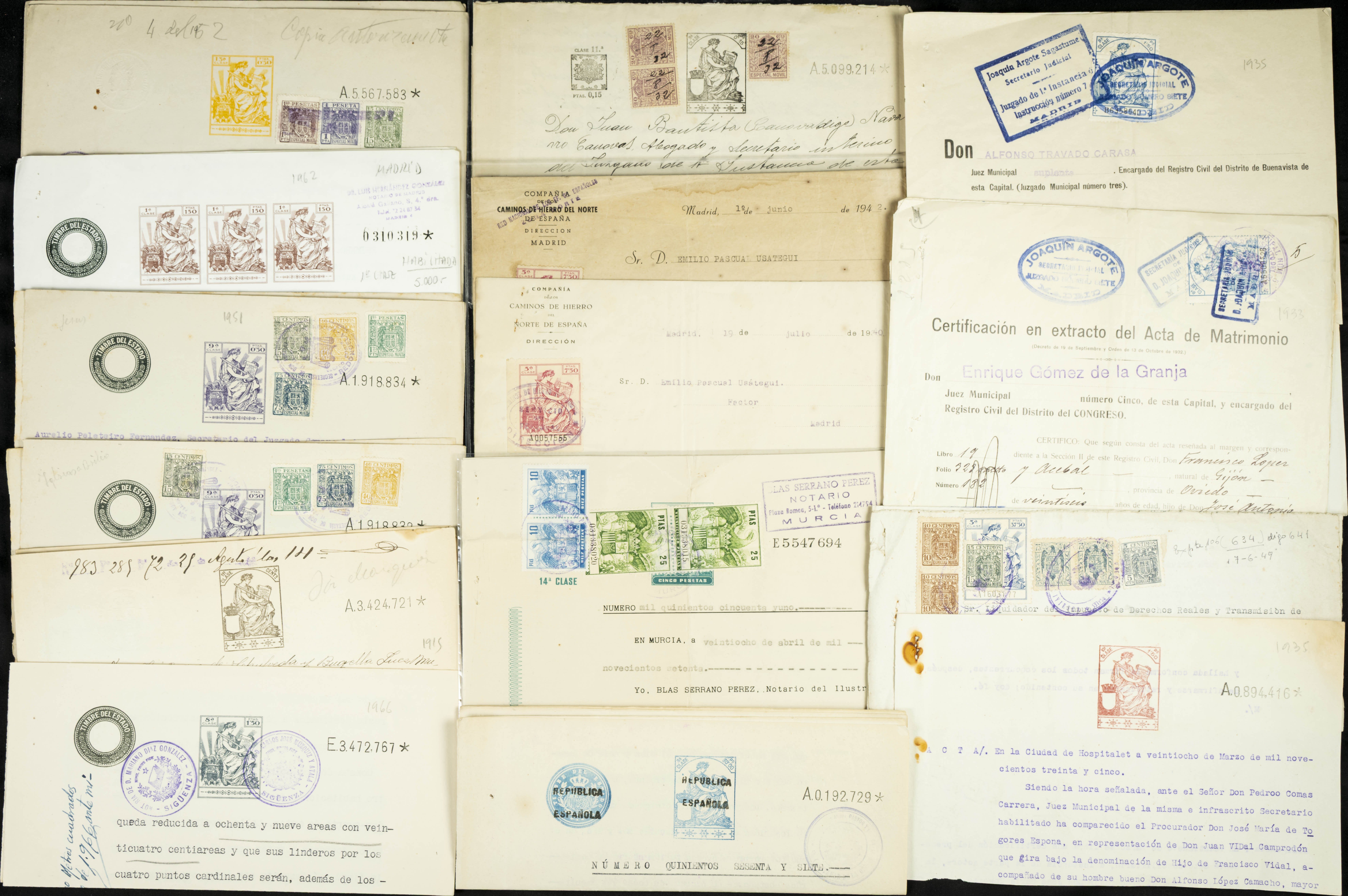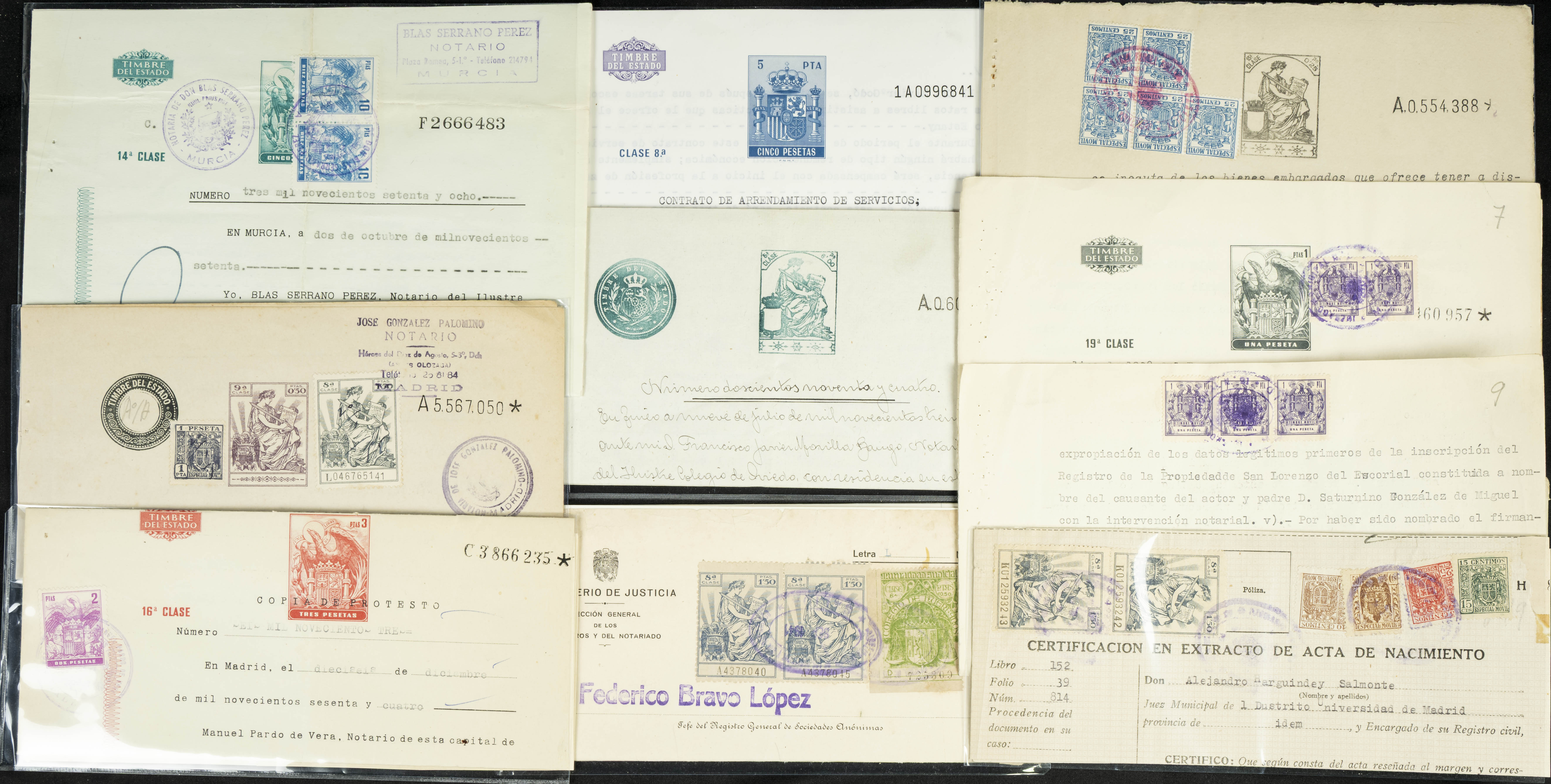 (1900ca). Espectacular conjunto de cientos de documentos fiscales con sellos de POLIZA entre 1900 y 1985, incluye escrituras, títulos universitarios, actas de matrimonio, contratos de arrendamiento, testamentos, actas de nacimiento, cancelación de hipotecas, etc, algunos muy interesantes. IMPRESCINDIBLE EXAMINAR. Ex-Alemany.