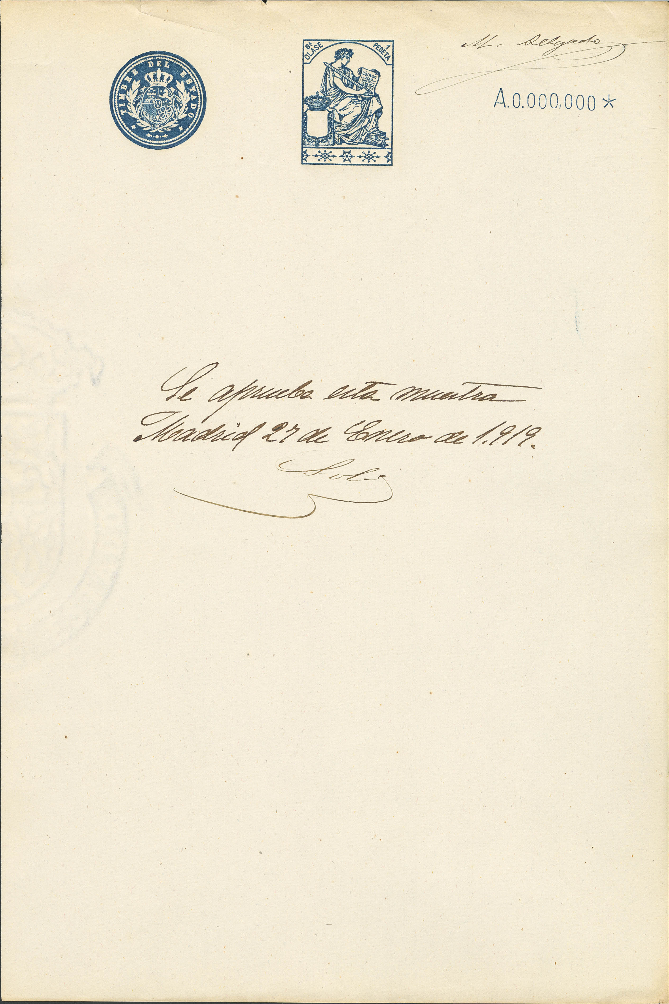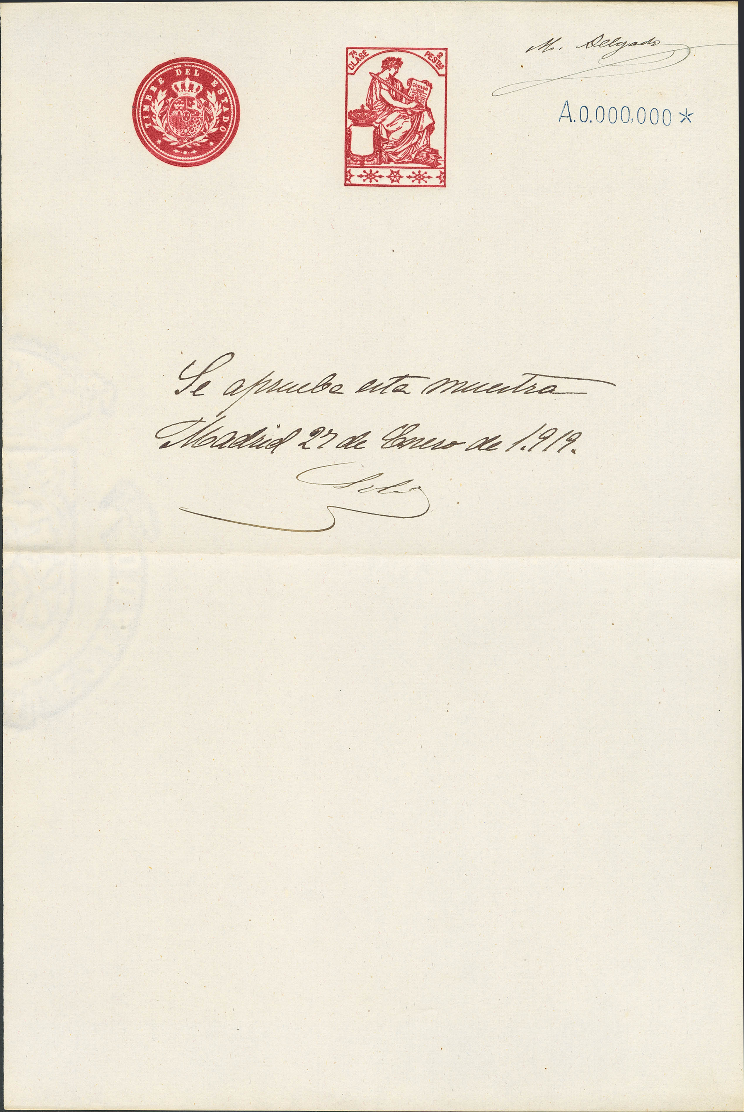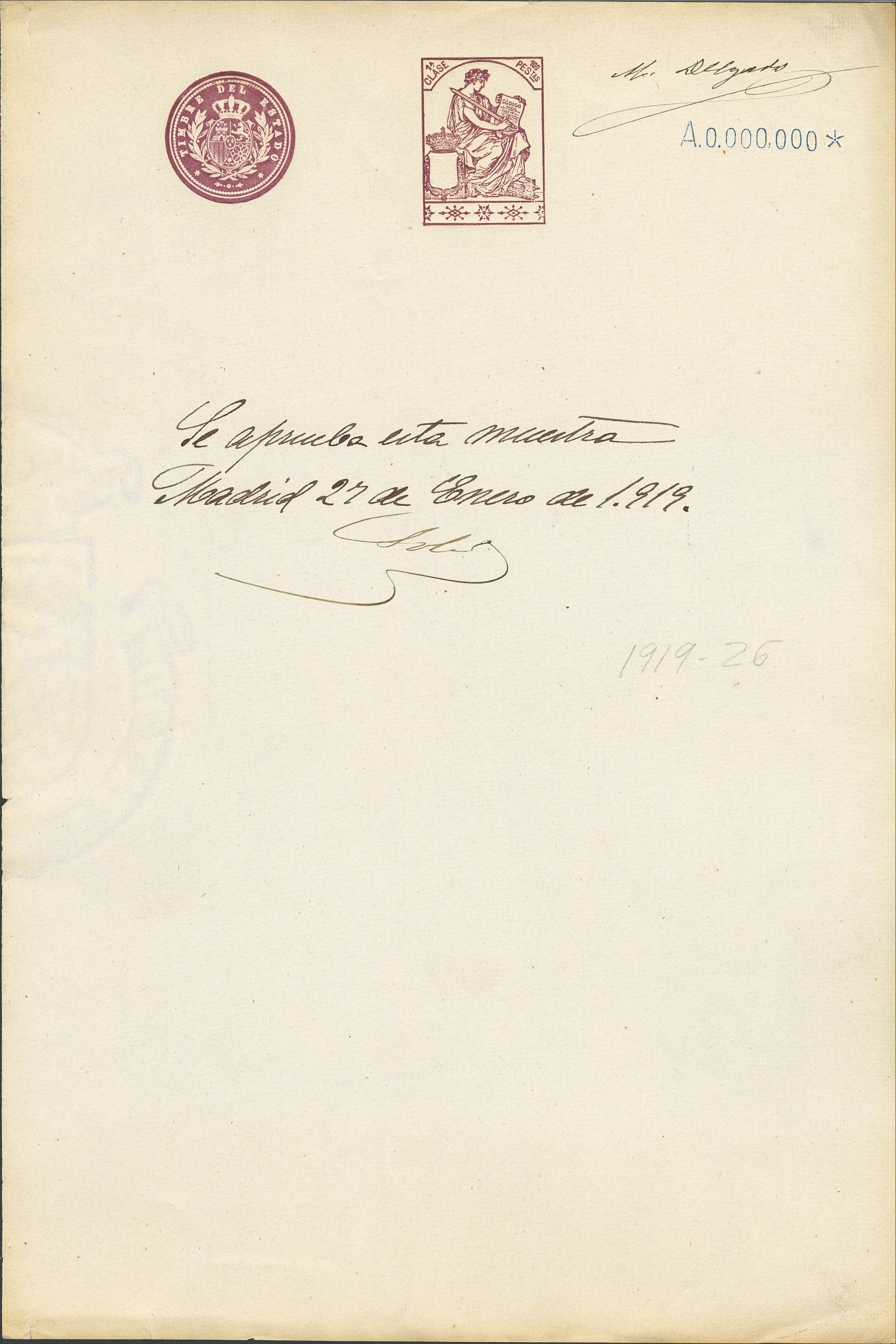 (★)1919. 1 pts azul, 2 pts carmín, 3 pts lila, 5 pts verde, 10 pts rosa rojo, 25 pts azul, 50 pts castaño y 100 pts castaño lila POLIZAS. Hojas completas de TIMBRE DE ESTADO, con numeración A000.000 y anotación manuscrita "Se aprueba esta Muestra" y firma M. Delgado. MAGNIFICAS Y RARISIMO CONJUNTO, POSIBLEMENTE UNICO.