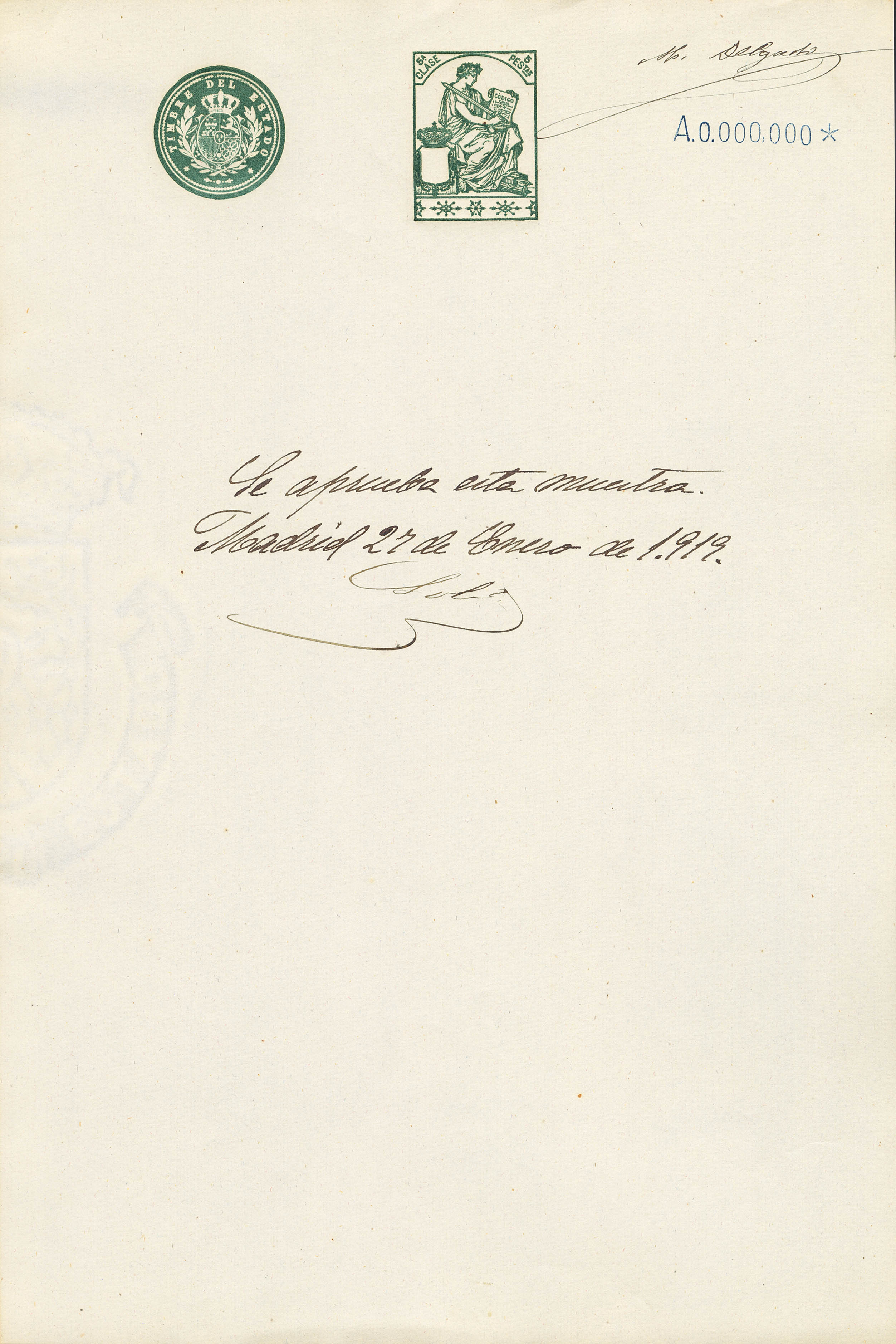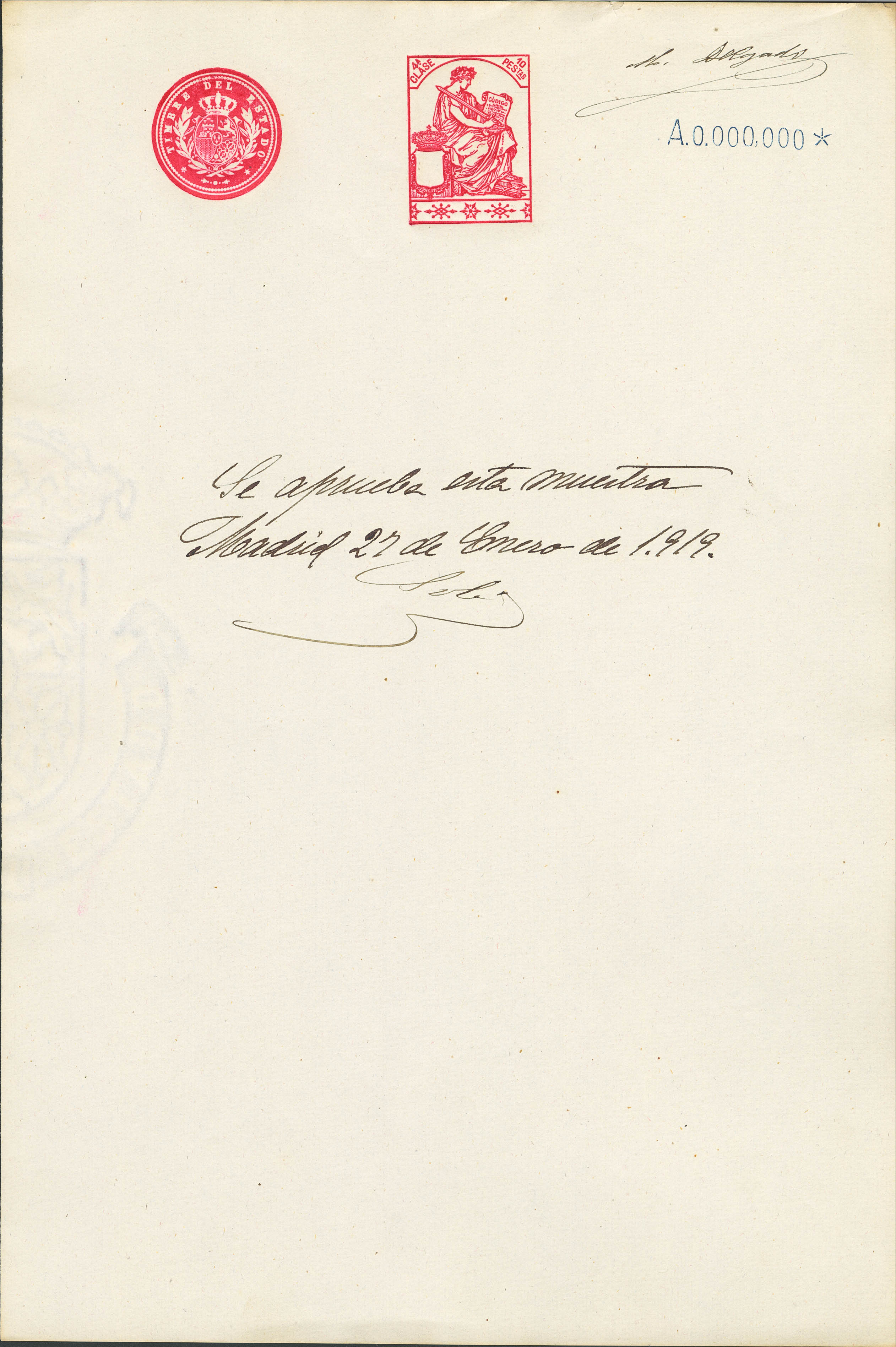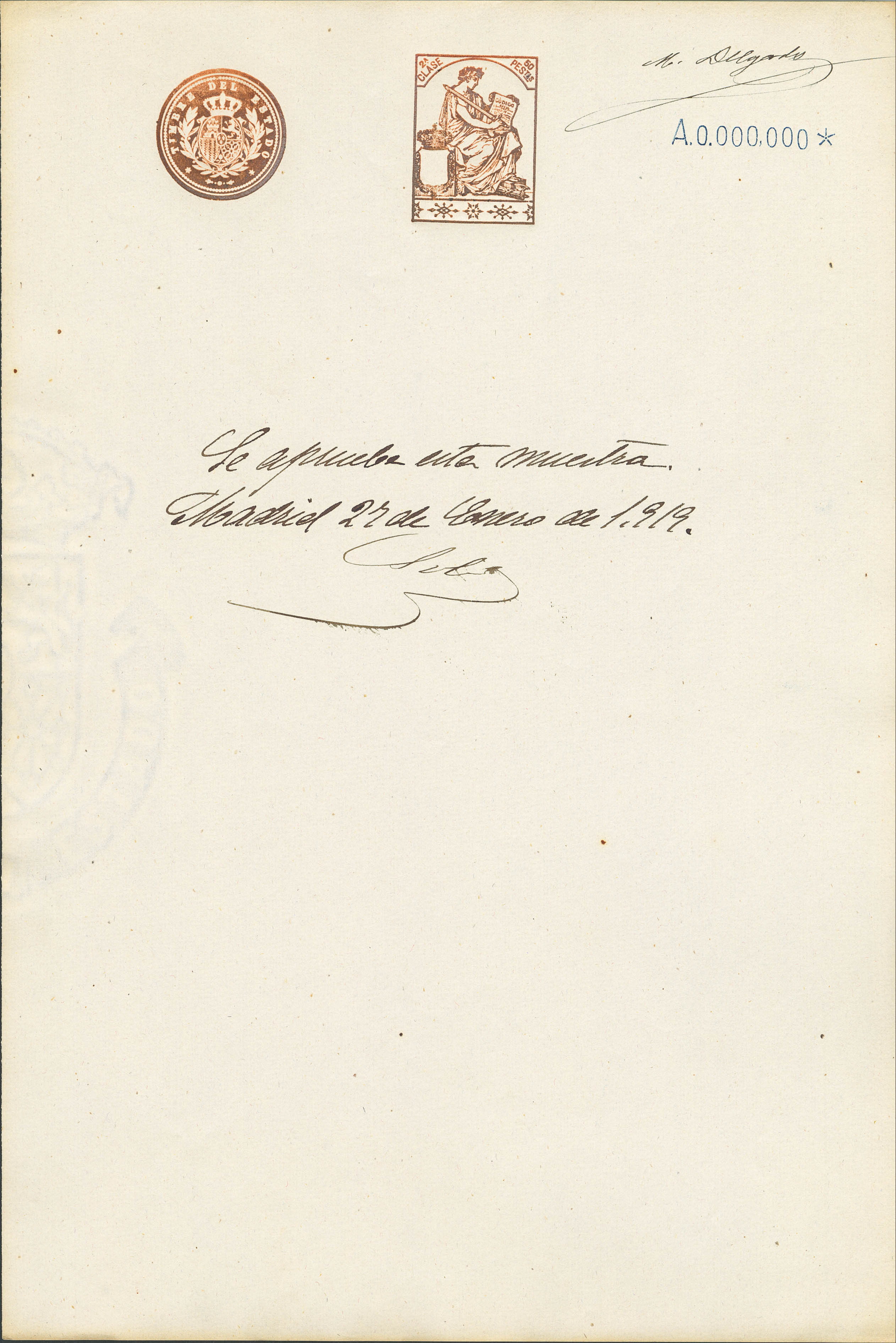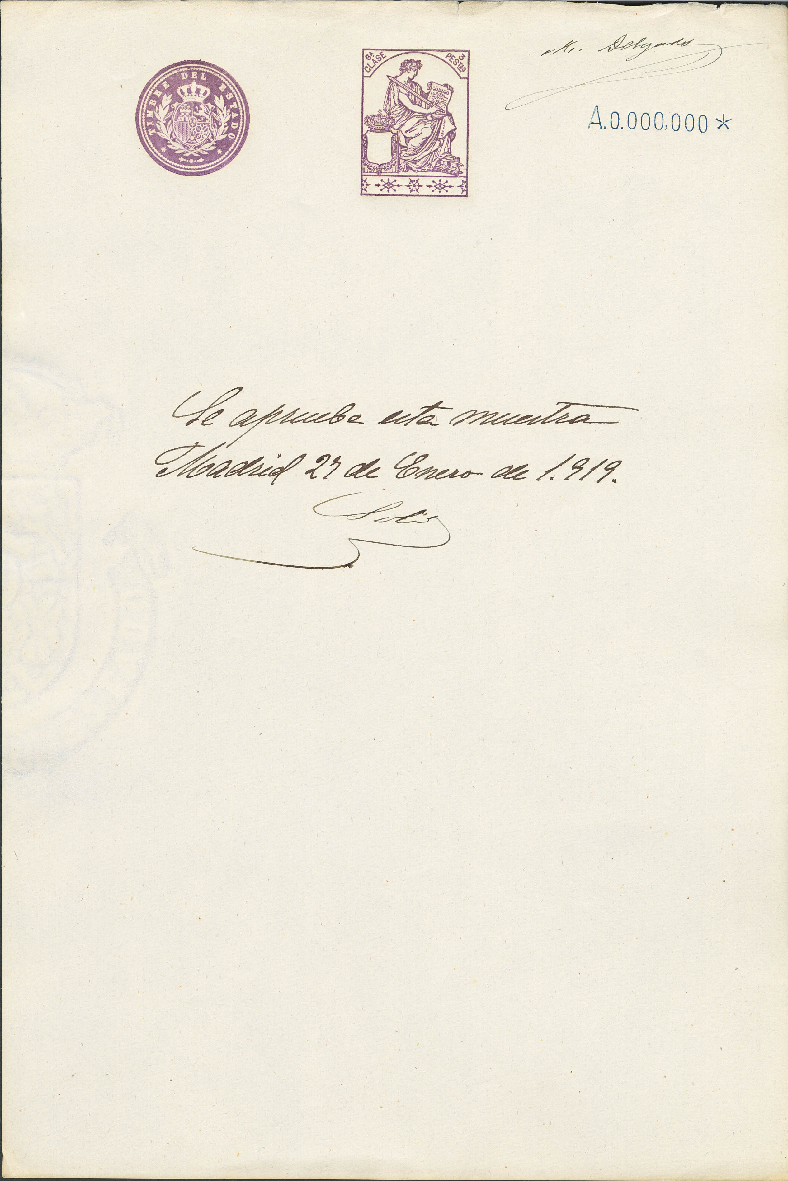 (★)1919. 1 pts azul, 2 pts carmín, 3 pts lila, 5 pts verde, 10 pts rosa rojo, 25 pts azul, 50 pts castaño y 100 pts castaño lila POLIZAS. Hojas completas de TIMBRE DE ESTADO, con numeración A000.000 y anotación manuscrita "Se aprueba esta Muestra" y firma M. Delgado. MAGNIFICAS Y RARISIMO CONJUNTO, POSIBLEMENTE UNICO.