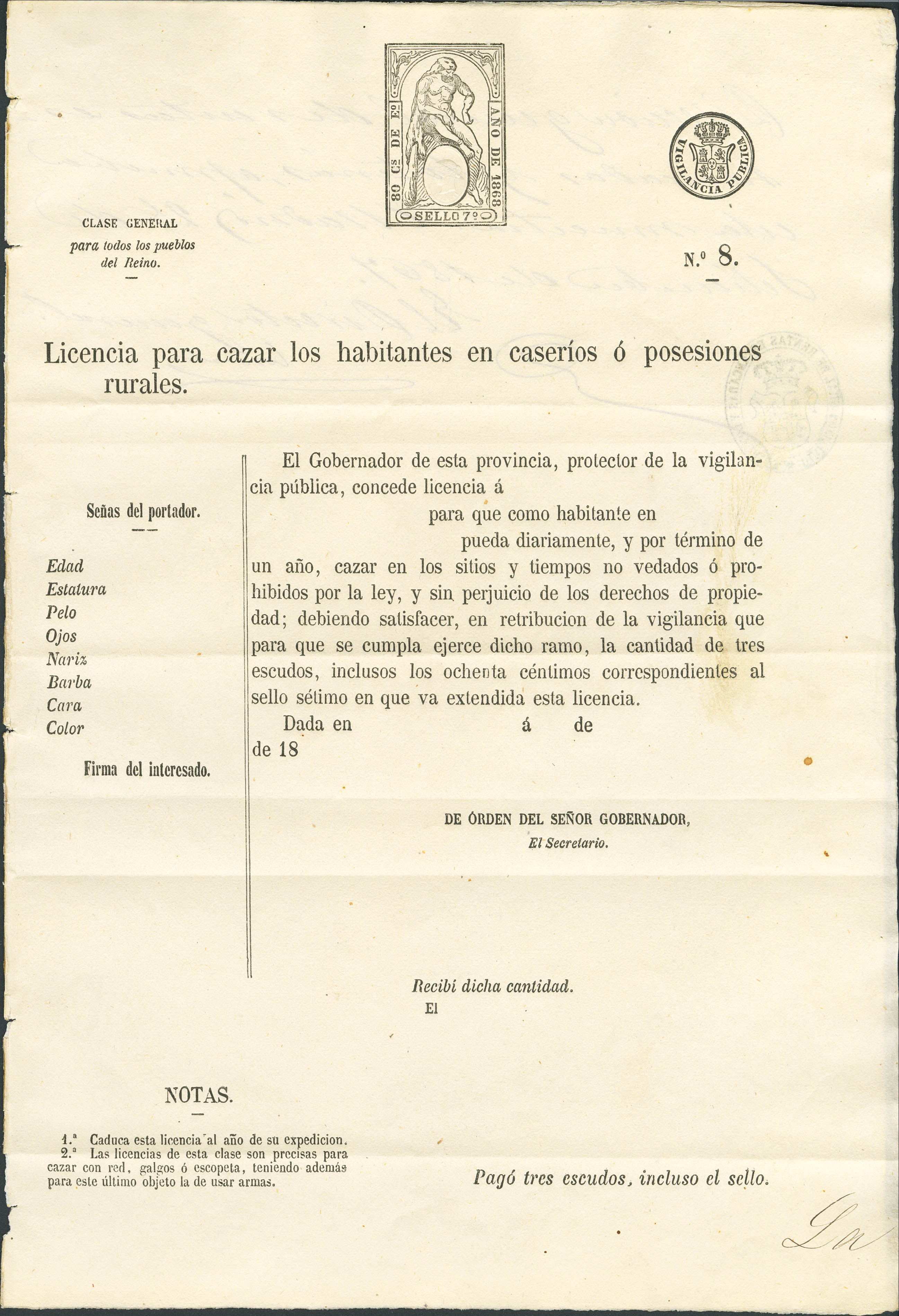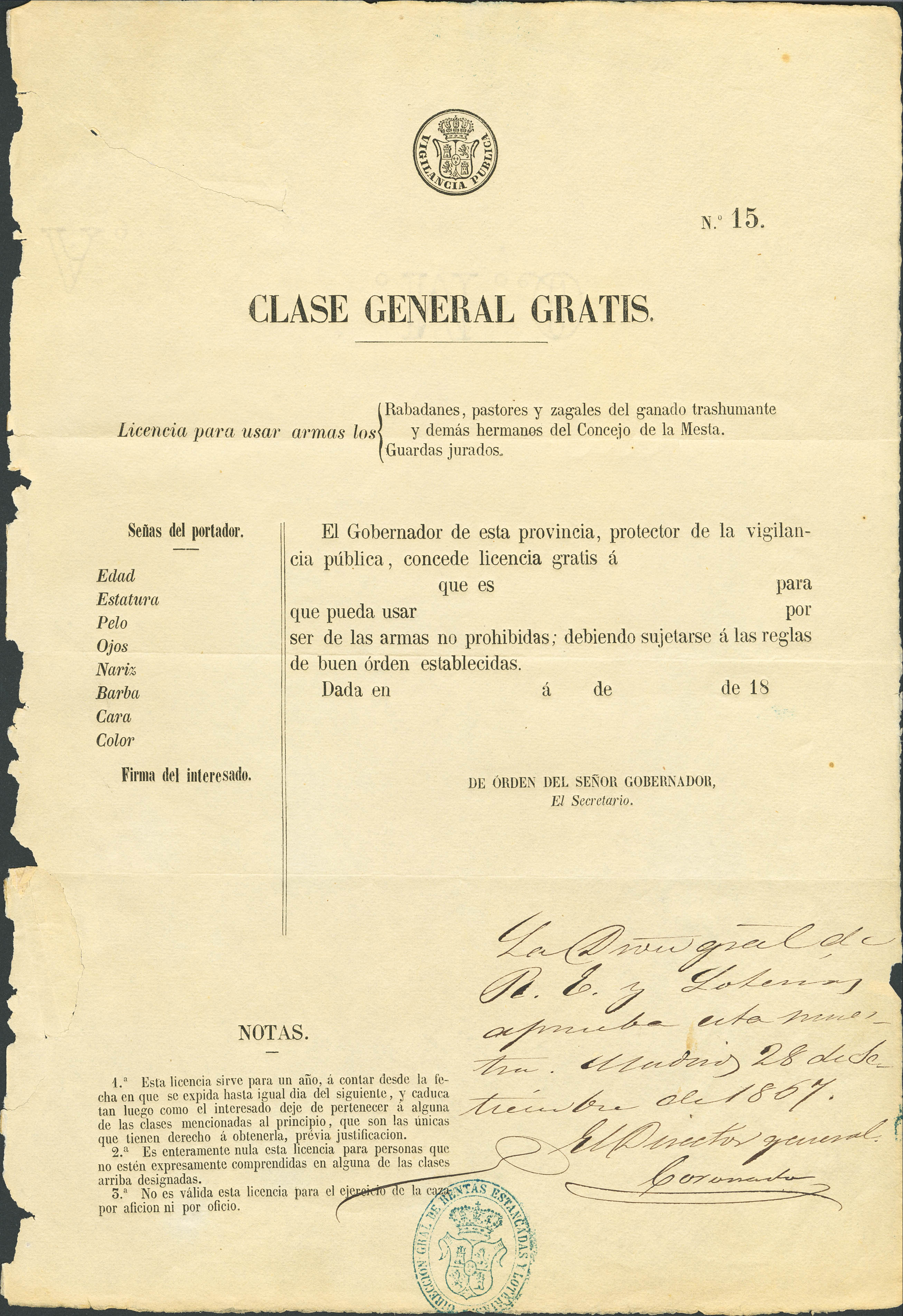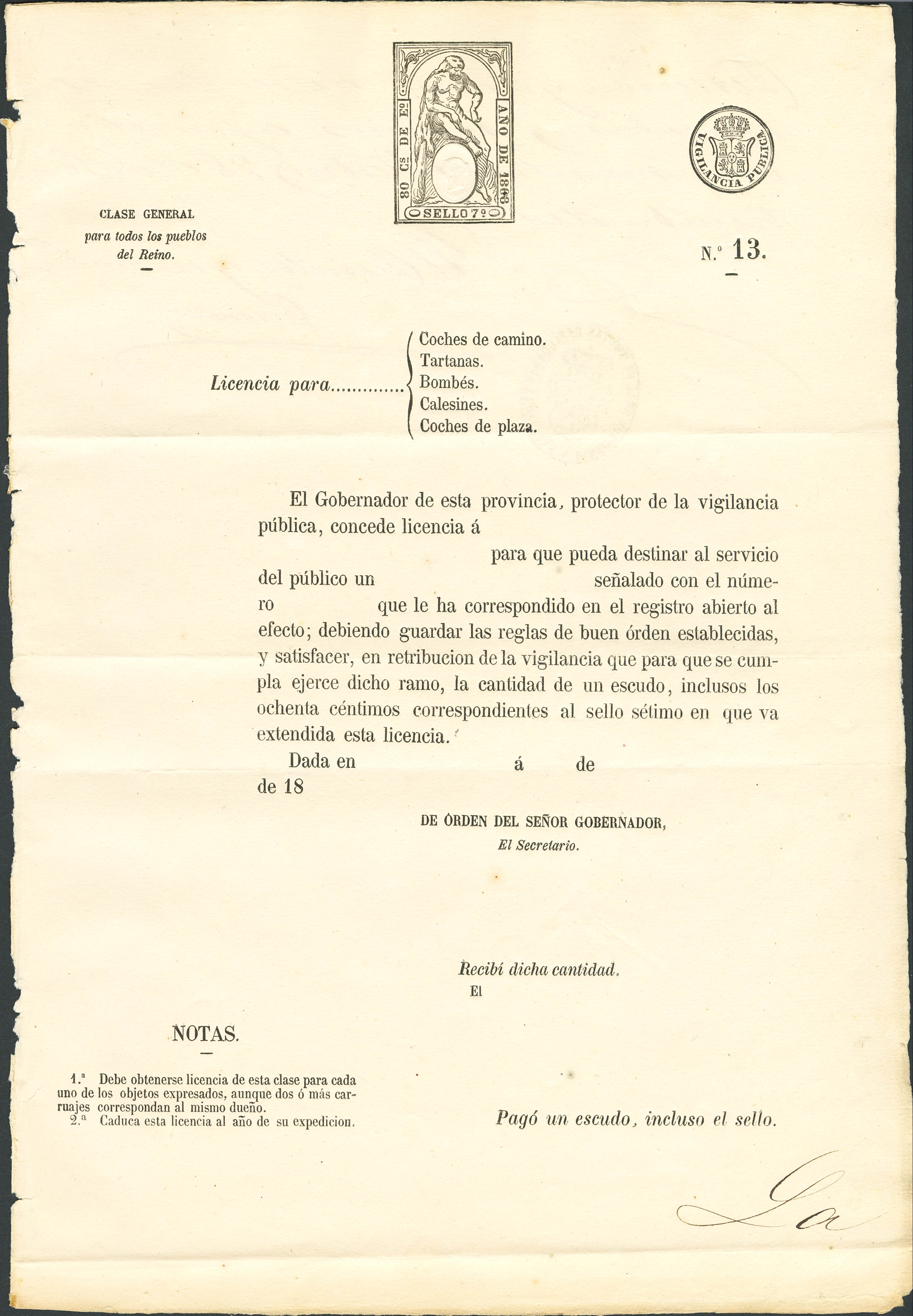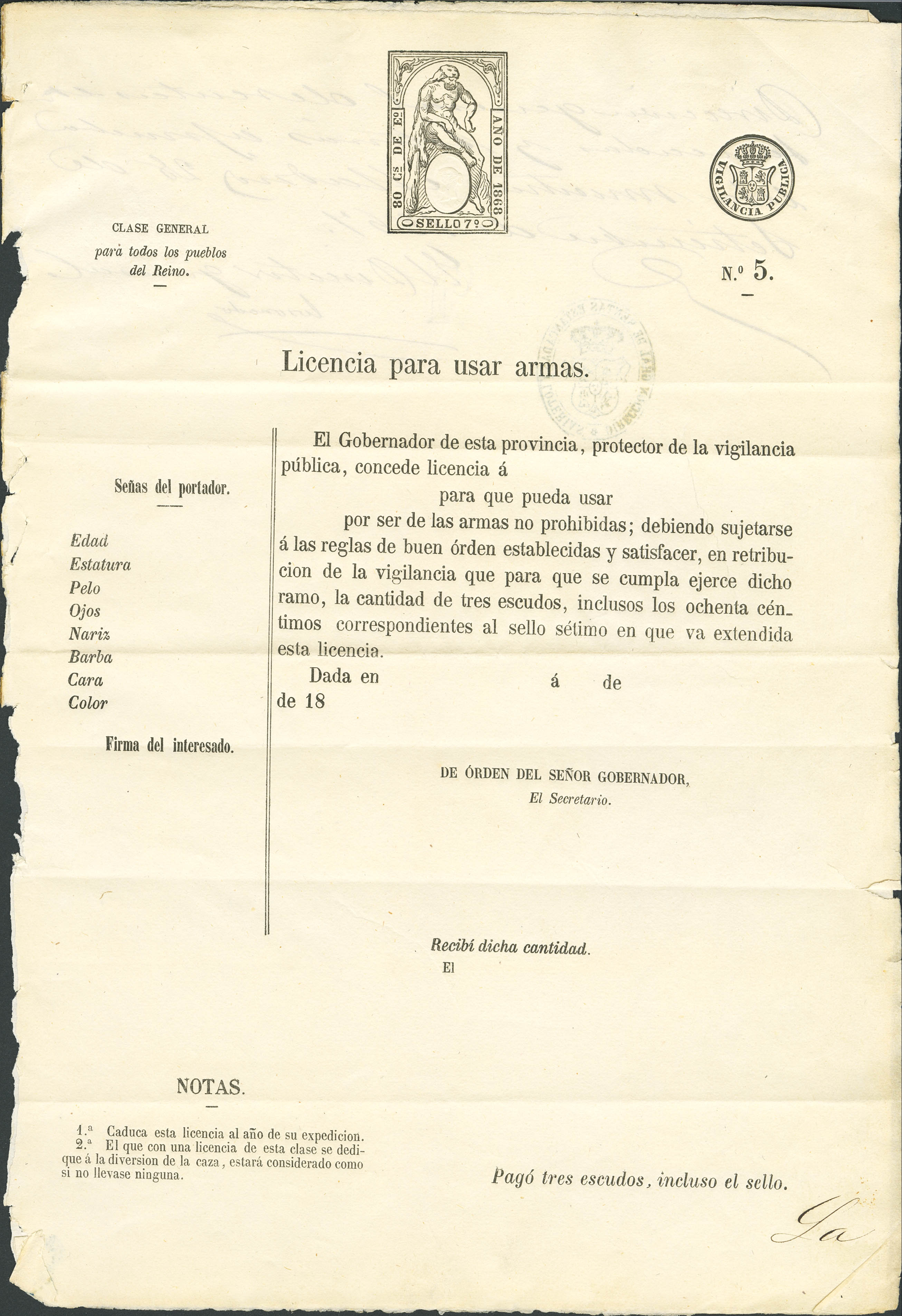 (★)1868. Espectacular conjunto de catorce documentos (trece dobles) de Papel Sellado POLIZAS de VIGILANCIA PUBLICA con Licencias de diversos tipos (Armas, Caza, Pesca, Fondas y Posadas, Coches de Plaza, Caballo o Corredores de Cuatropea) numerados entre el Nºº5 y el Nº15 y texto manuscrito de aprobación de Muestras. MAGNIFICO Y RARISIMO CONJUNTO.
