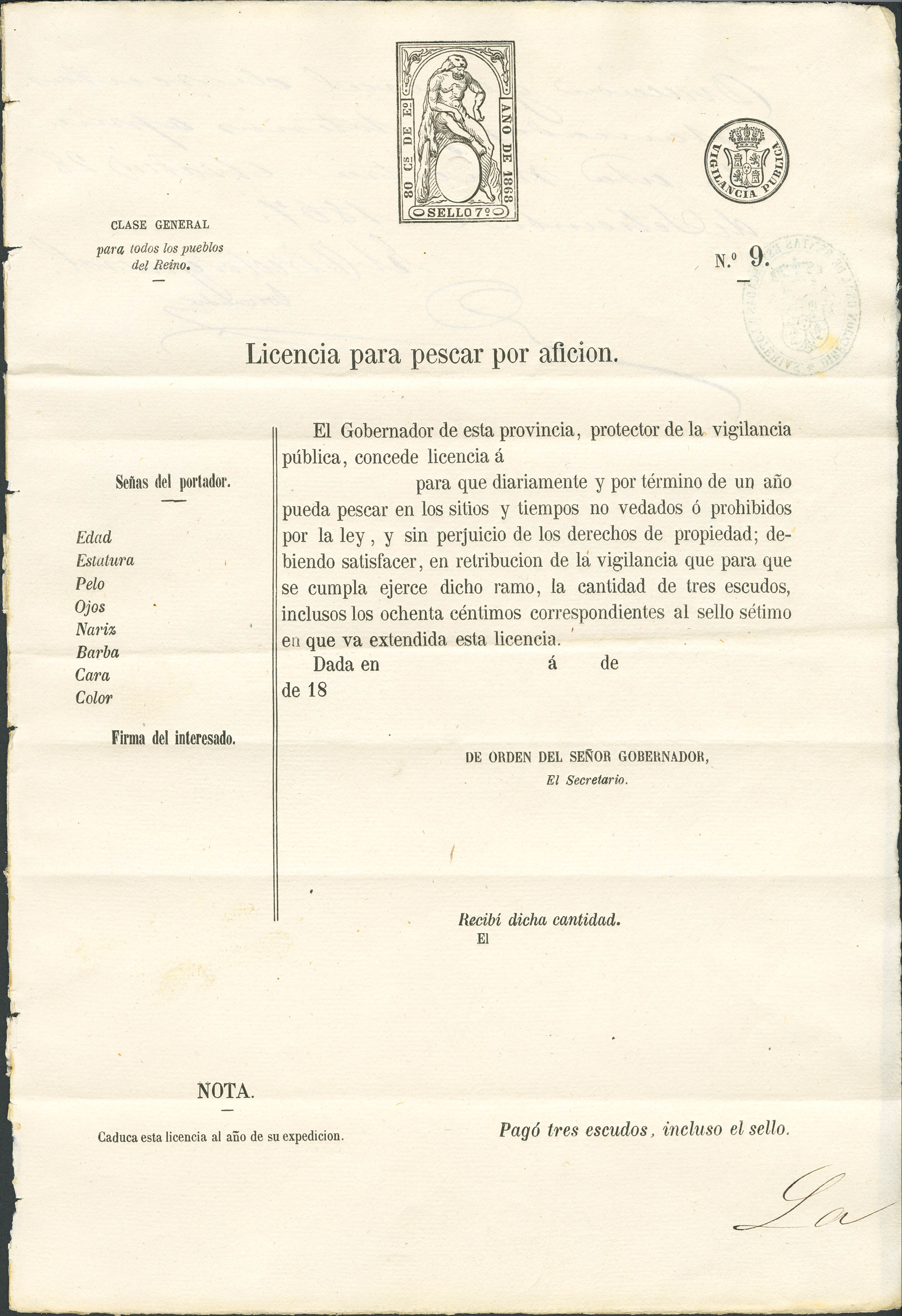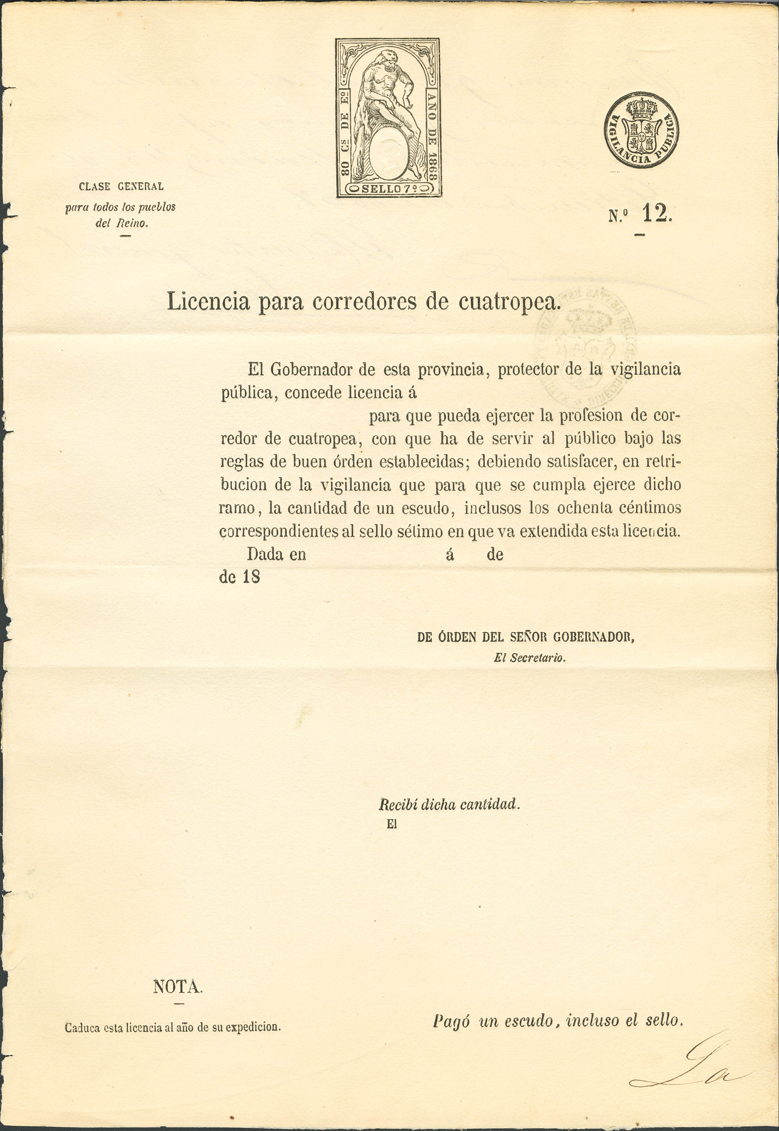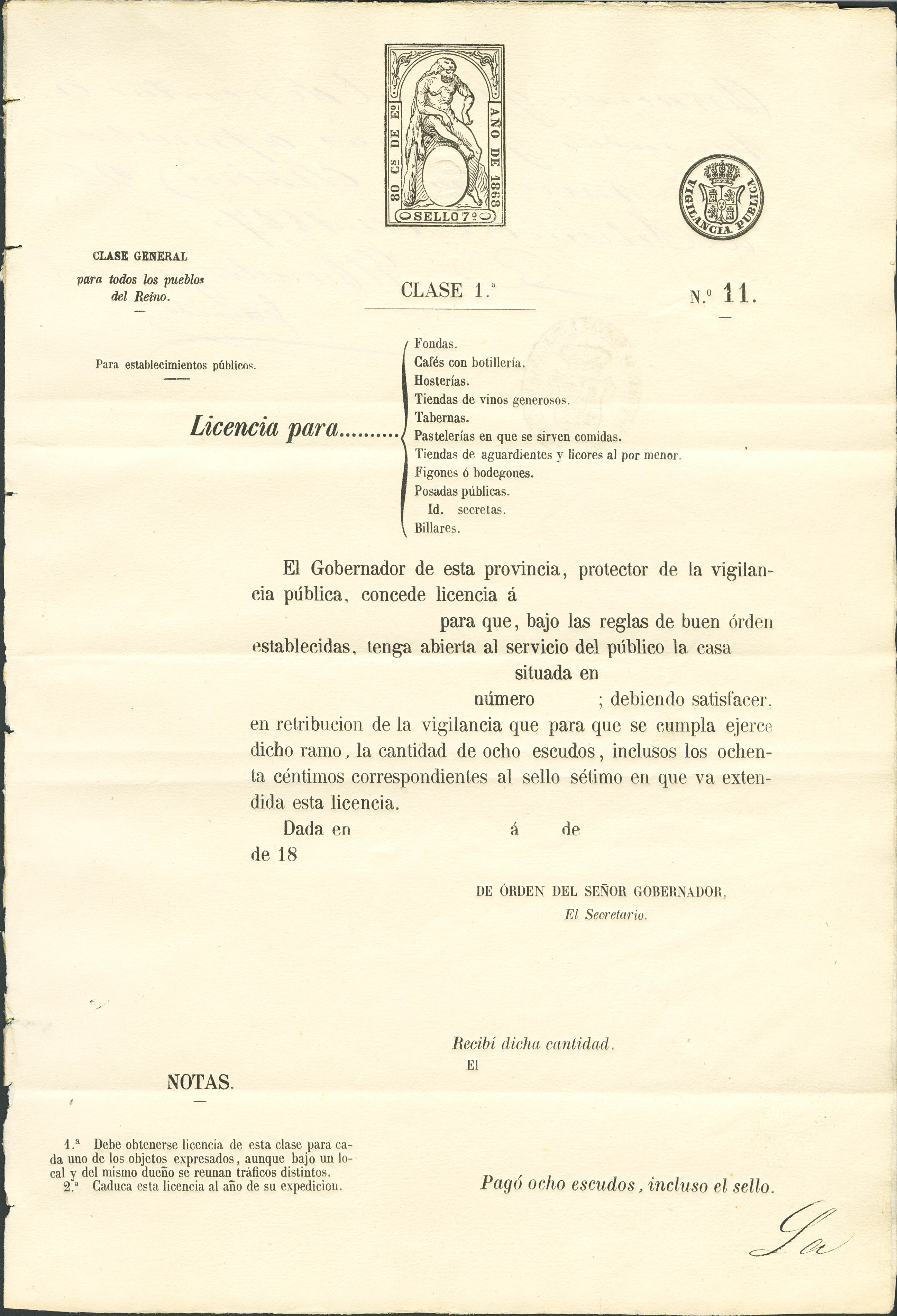 (★)1868. Espectacular conjunto de catorce documentos (trece dobles) de Papel Sellado POLIZAS de VIGILANCIA PUBLICA con Licencias de diversos tipos (Armas, Caza, Pesca, Fondas y Posadas, Coches de Plaza, Caballo o Corredores de Cuatropea) numerados entre el Nºº5 y el Nº15 y texto manuscrito de aprobación de Muestras. MAGNIFICO Y RARISIMO CONJUNTO.