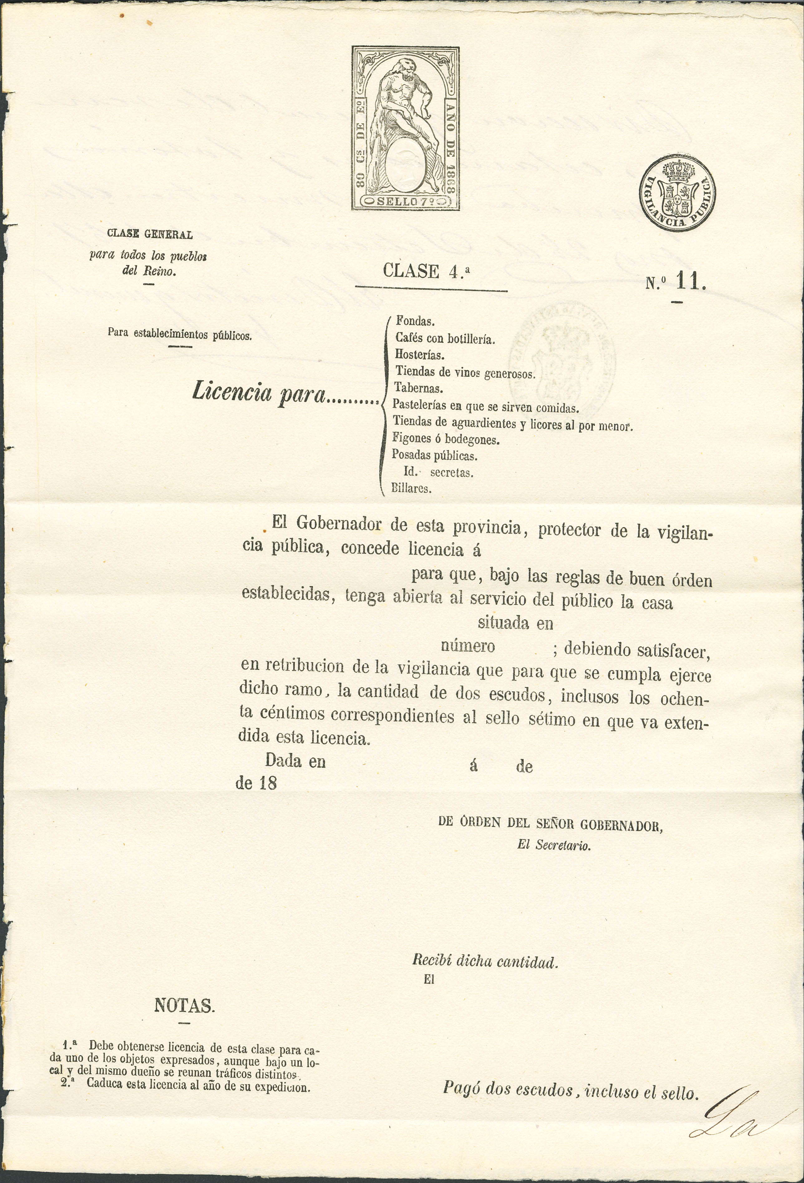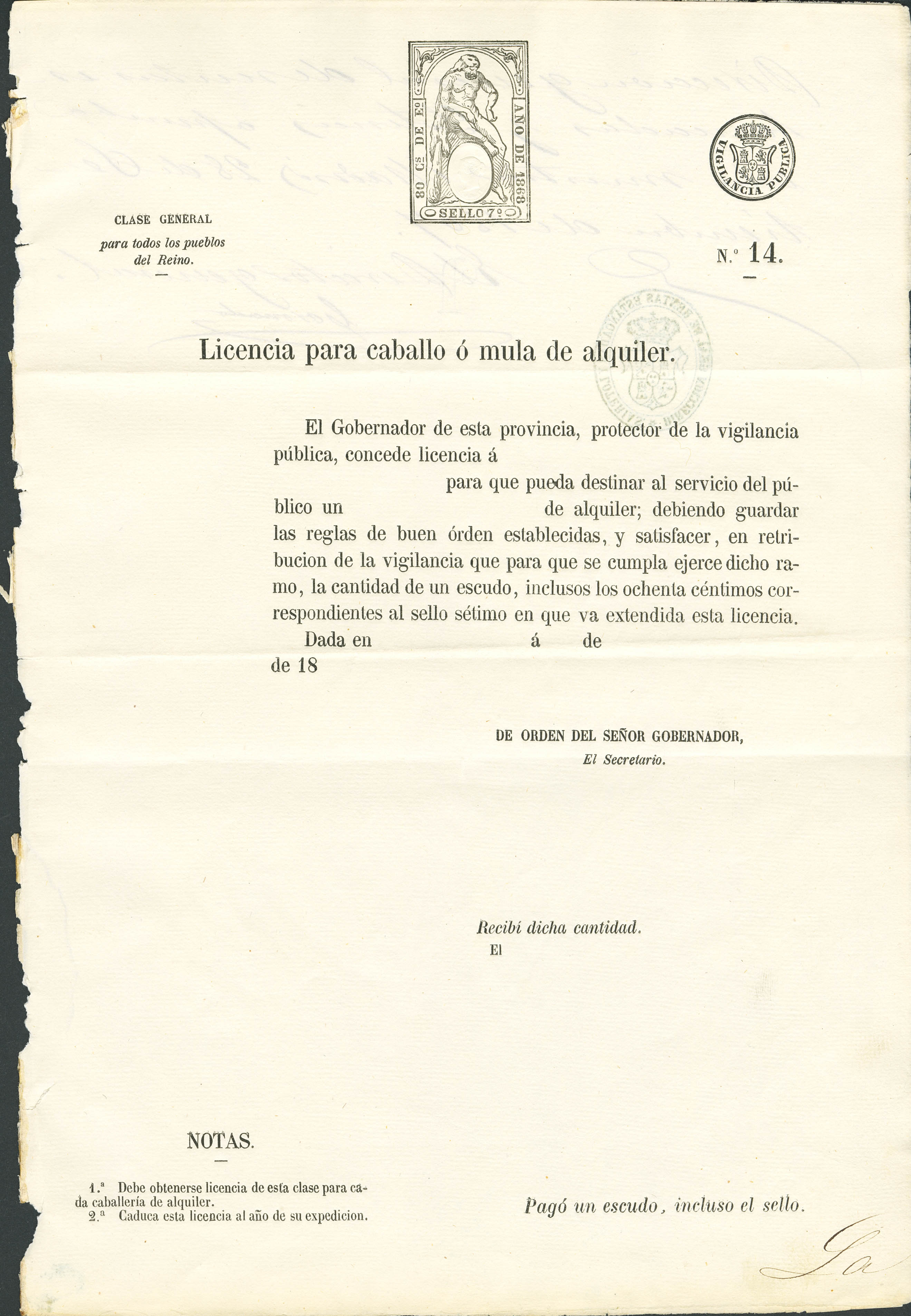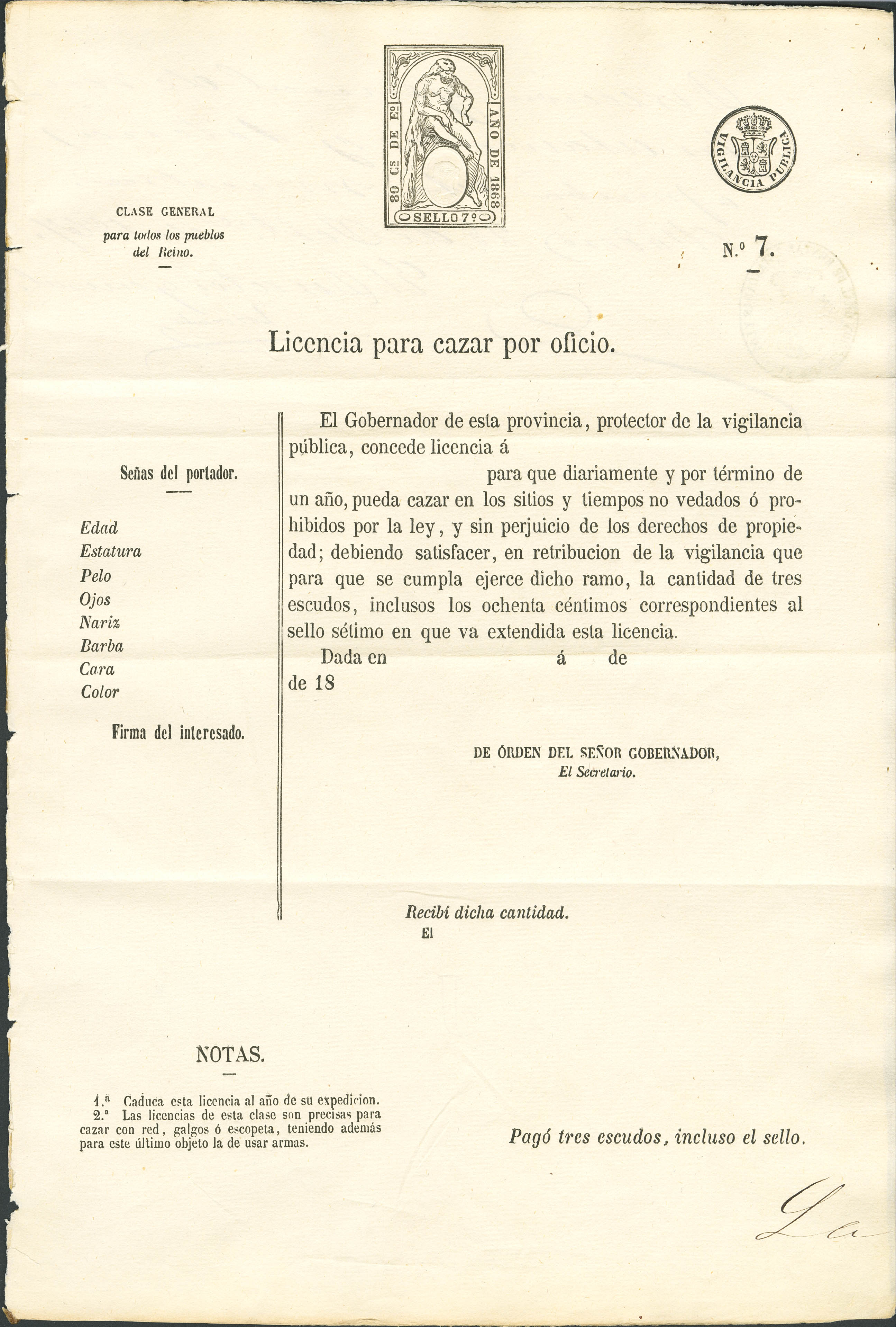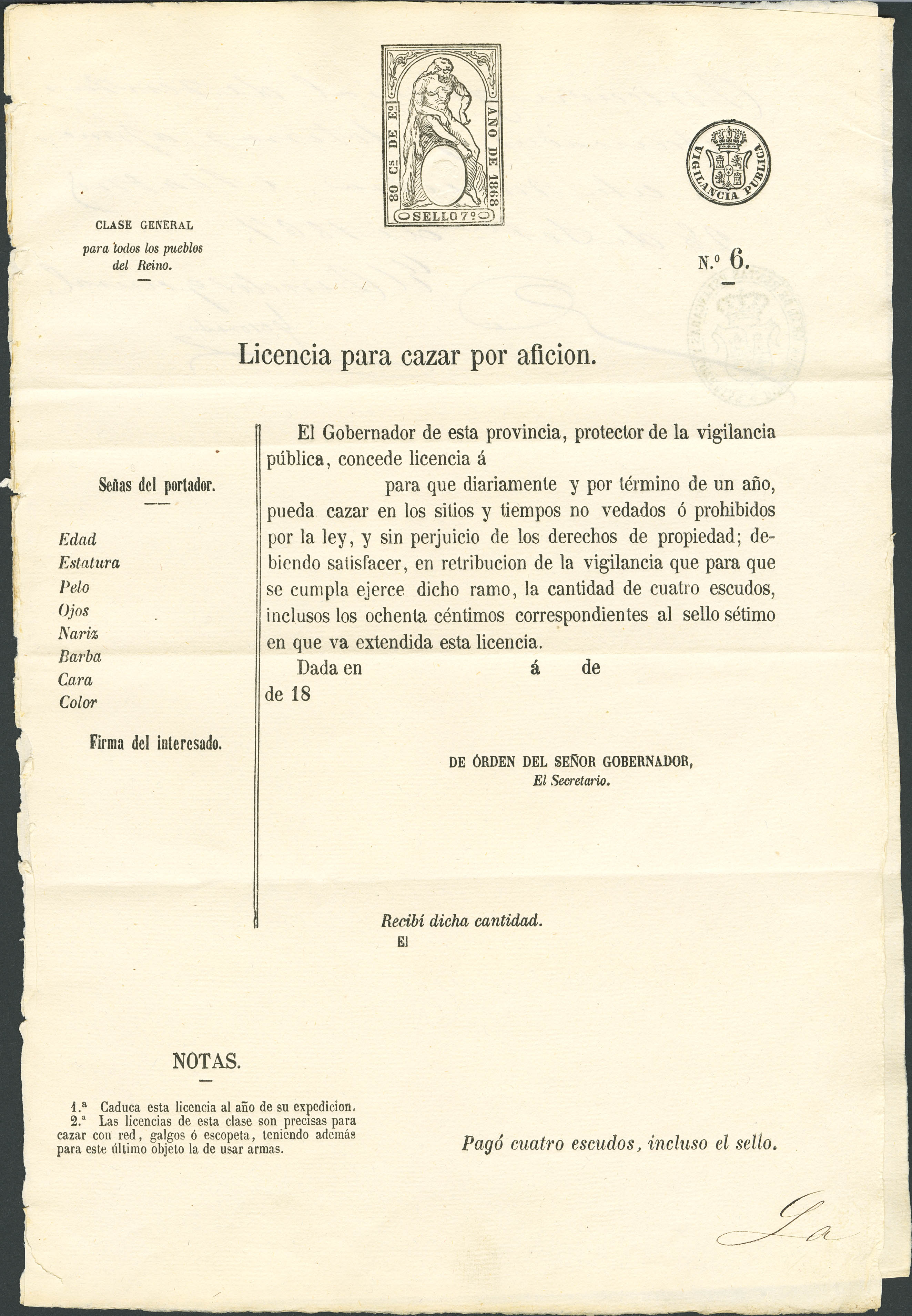 (★)1868. Espectacular conjunto de catorce documentos (trece dobles) de Papel Sellado POLIZAS de VIGILANCIA PUBLICA con Licencias de diversos tipos (Armas, Caza, Pesca, Fondas y Posadas, Coches de Plaza, Caballo o Corredores de Cuatropea) numerados entre el Nºº5 y el Nº15 y texto manuscrito de aprobación de Muestras. MAGNIFICO Y RARISIMO CONJUNTO.