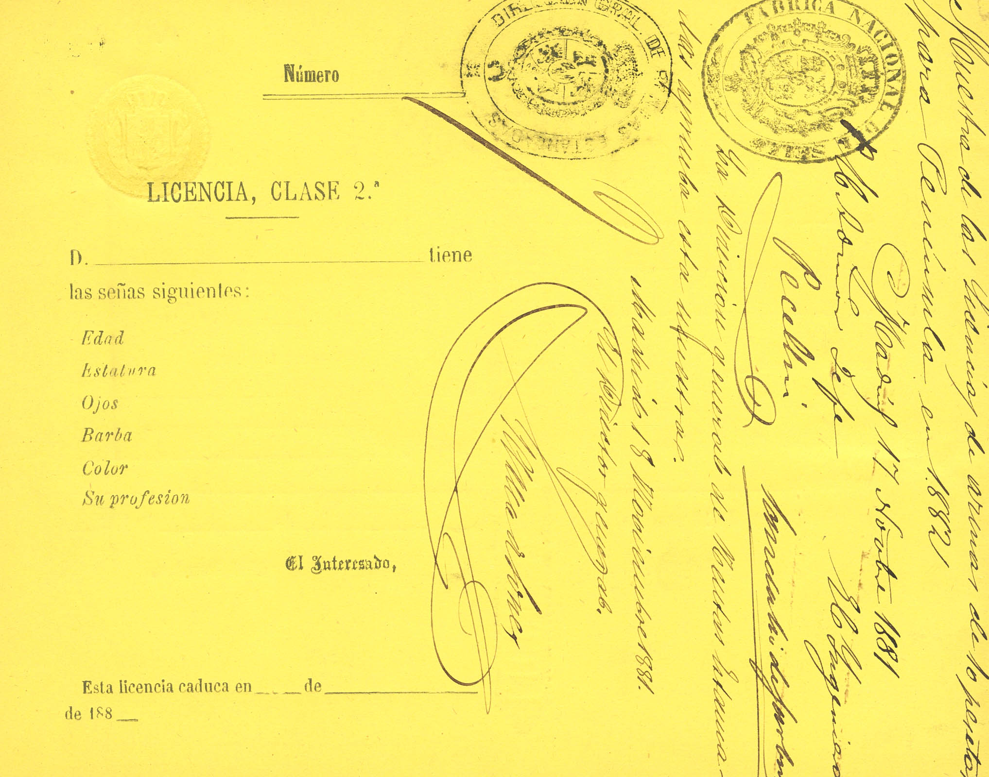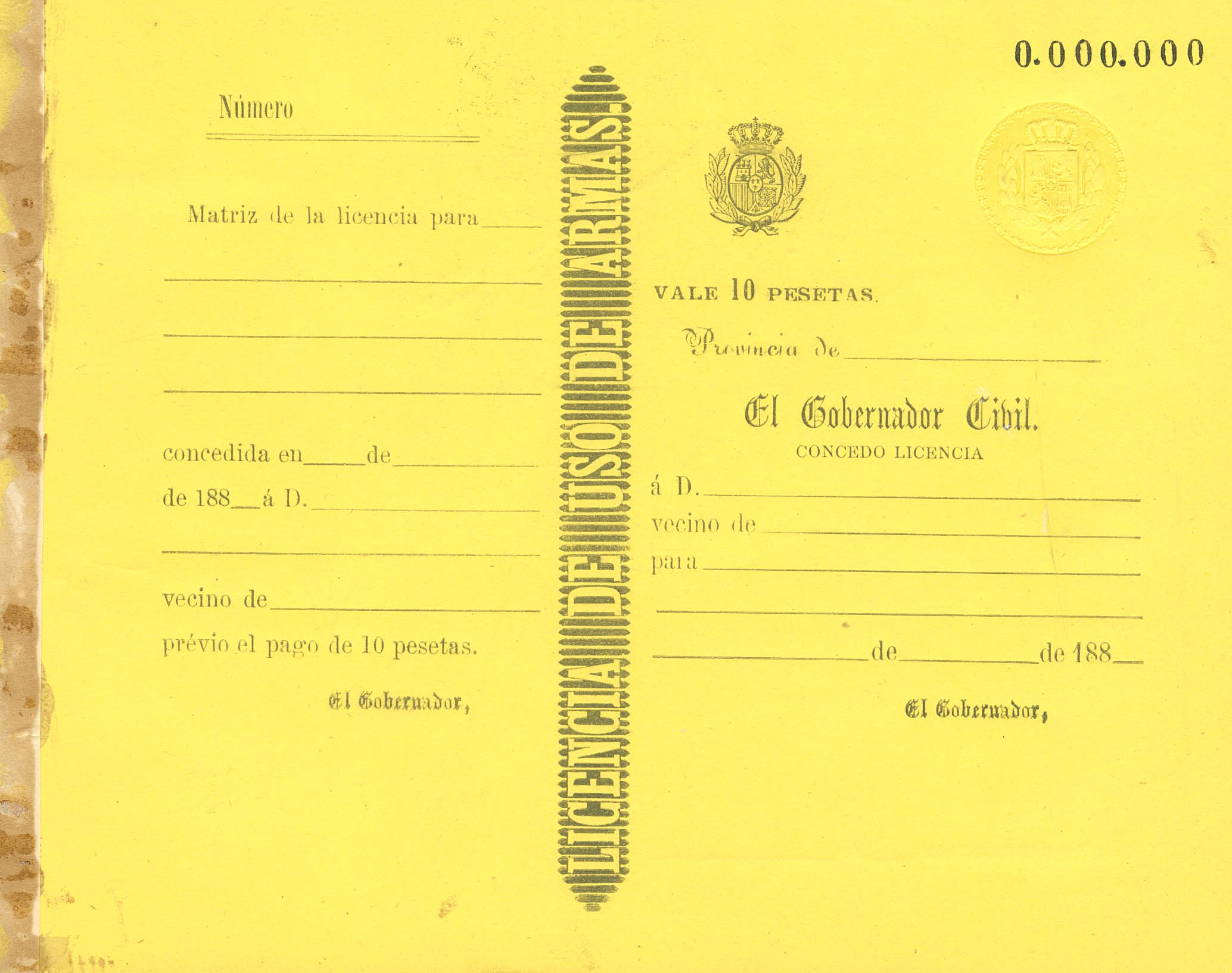 (★)1881. 10 pts. Tarjeta de LICENCIA DE USO DE ARMAS. Nº0.000.000 y al dorso "Muestra de las Licencias de armas de 10 pts", "La Dirección General de Rentas Estancadas aprueba esta muestra" y sellos de la Fábrica Nacional del Timbre y Dirección General de Rentas Estancadas. MAGNIFICA Y RARA.