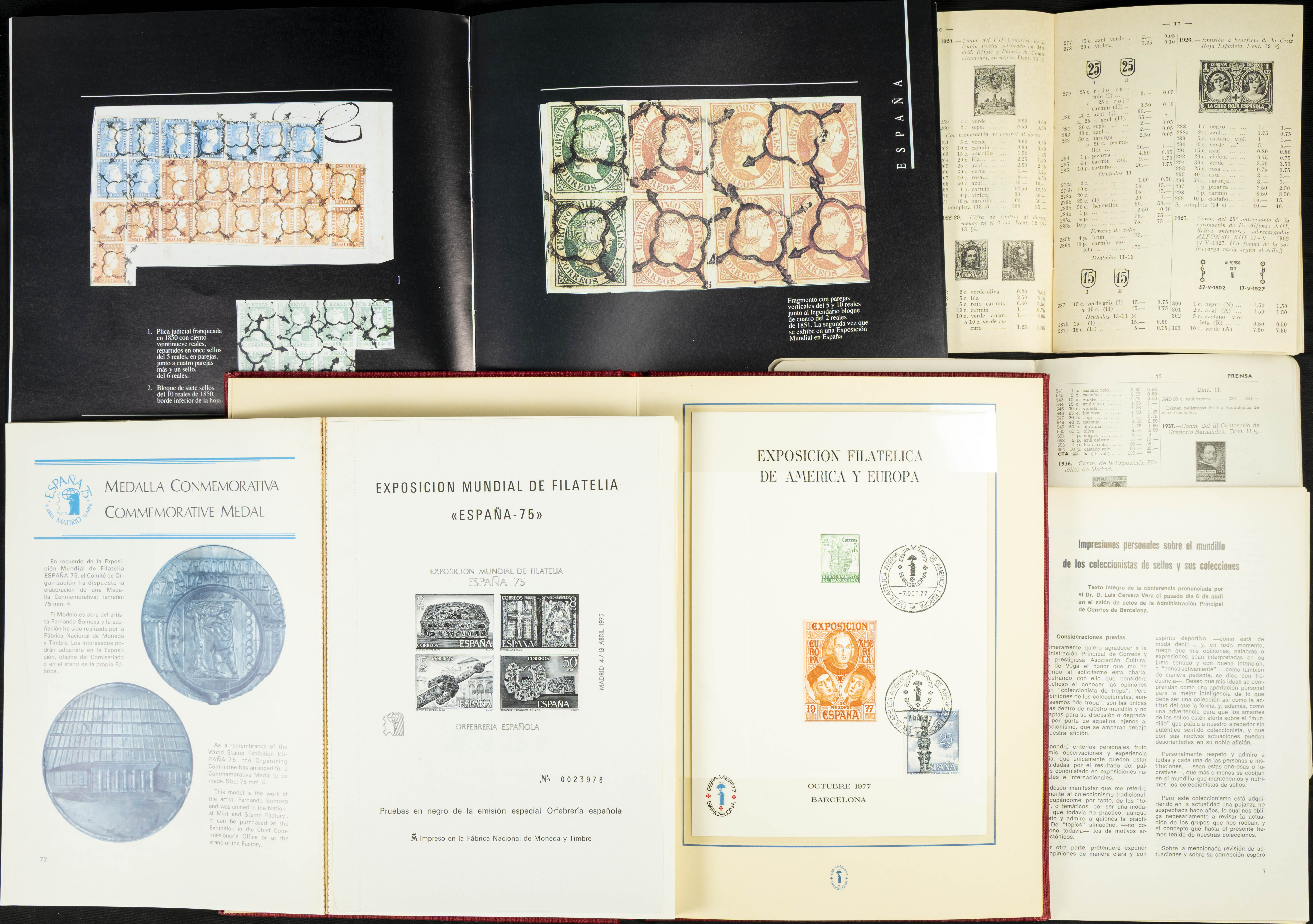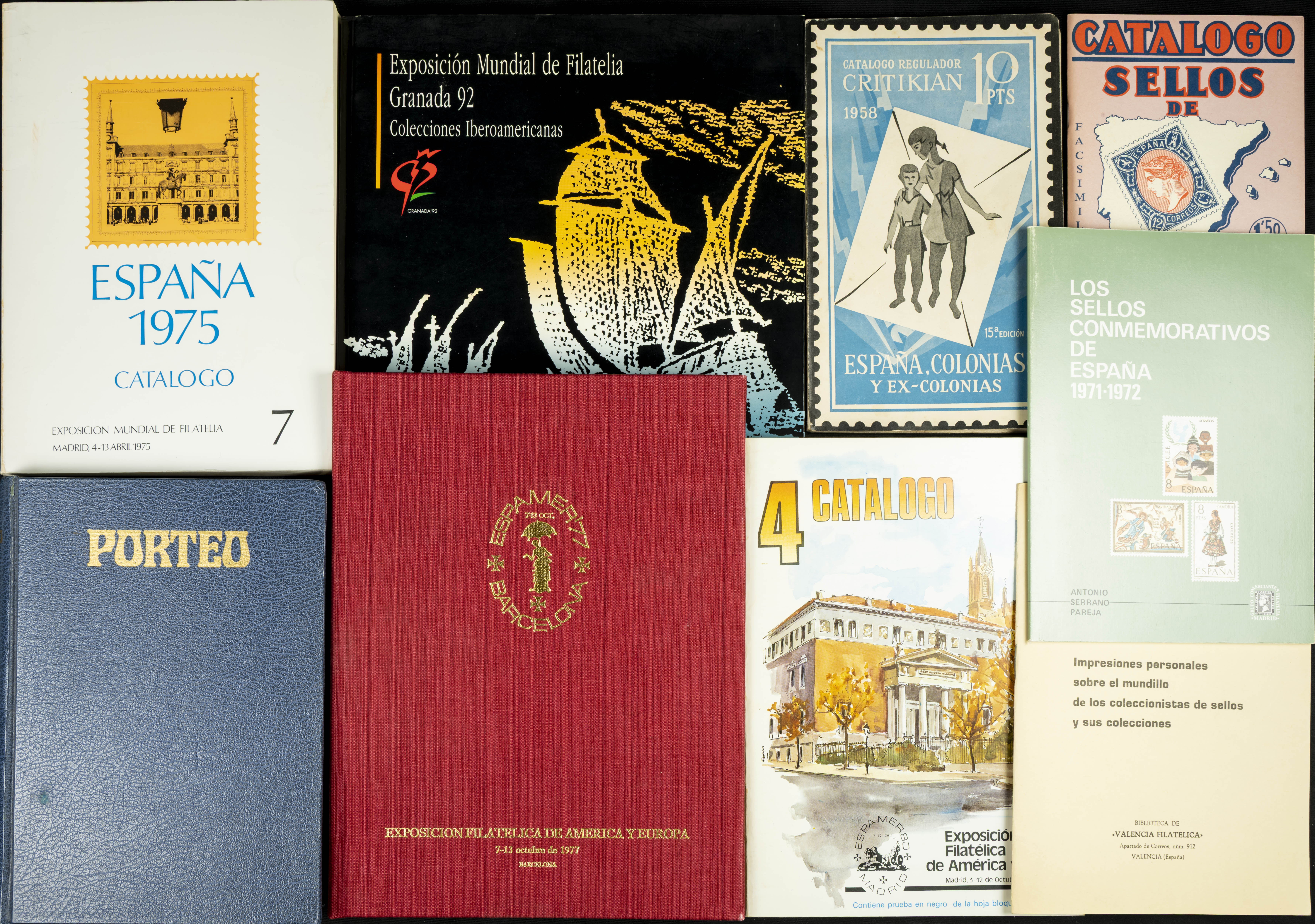 (1941ca). Conjunto de catálogos de Exposiciones Filatélicas y catálogos de consulta de diversos periodos, destacando el catálogo de Espamer 77 con hojas recuerdo, España 75 y Espamer 80 con Pruebas de Lujo y catálogos de España de Ricardo de Lama 1941 y Critikian 1958. A EXAMINAR.