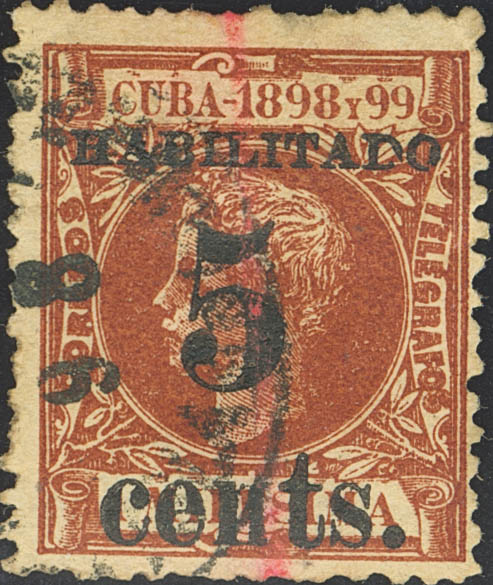 4. 1898. 5 ctvos sobre 1 mils castaño rojo. 1ª tirada, posición 5. MAGNIFICO Y RARISIMO ERROR DE IMPRESION SOBRE EL SELLO DE 1 MILS EN LUGAR DE SOBRE EL 5 MILS, SEGUN ECHENAGUSIA DE ESTE ERROR SOLO SE CONOCEN TRES SELLOS QUE SIEMPRE LO SON CON LA HABILITACION INVERTIDA, ESTE SERIA HASTA LA FECHA EL UNICO CONOCIDO SIN SOBRECARGA INVERTIDA, PIEZA DE ENORME IMPORTANCIA. Cert. ECHENAGUSIA.