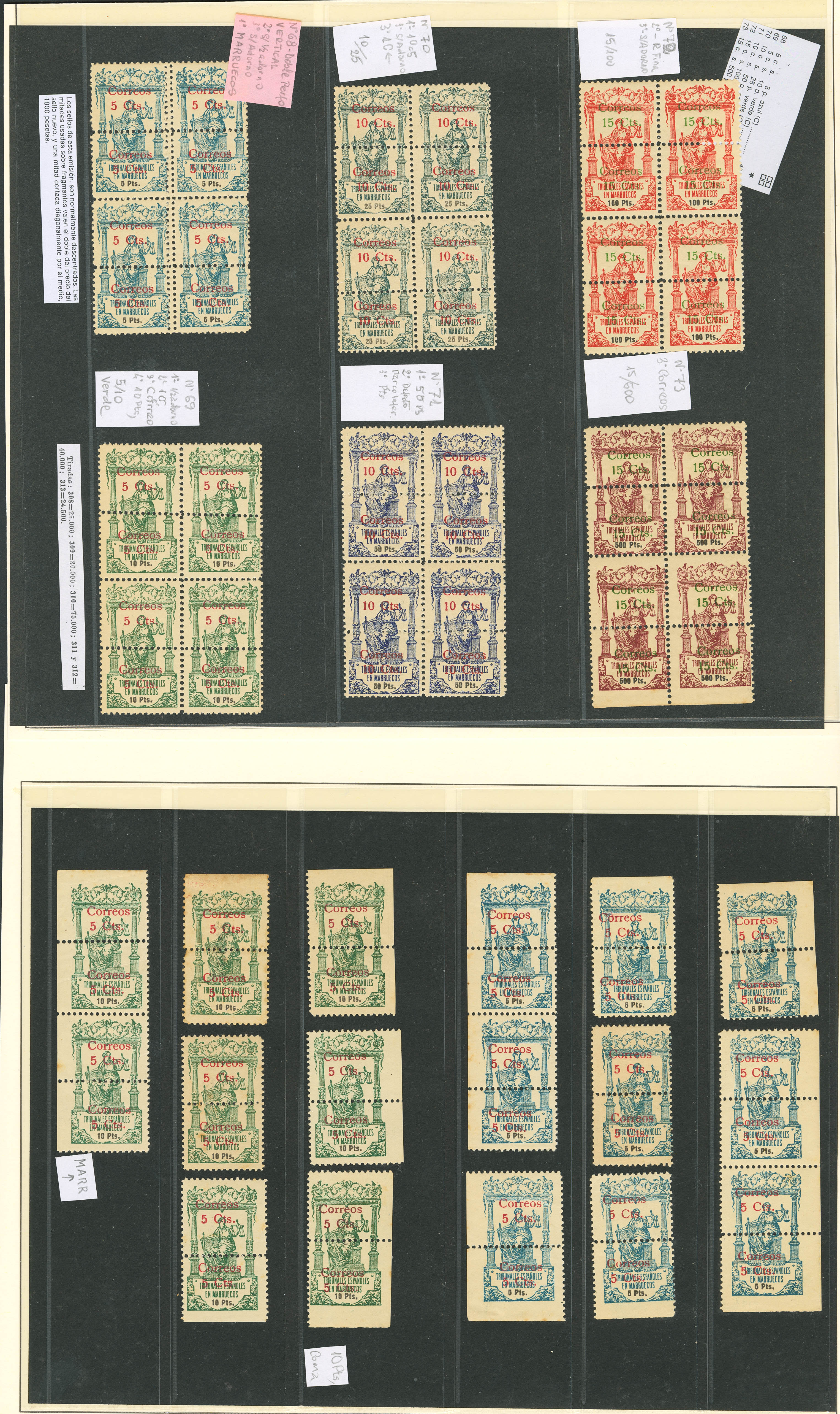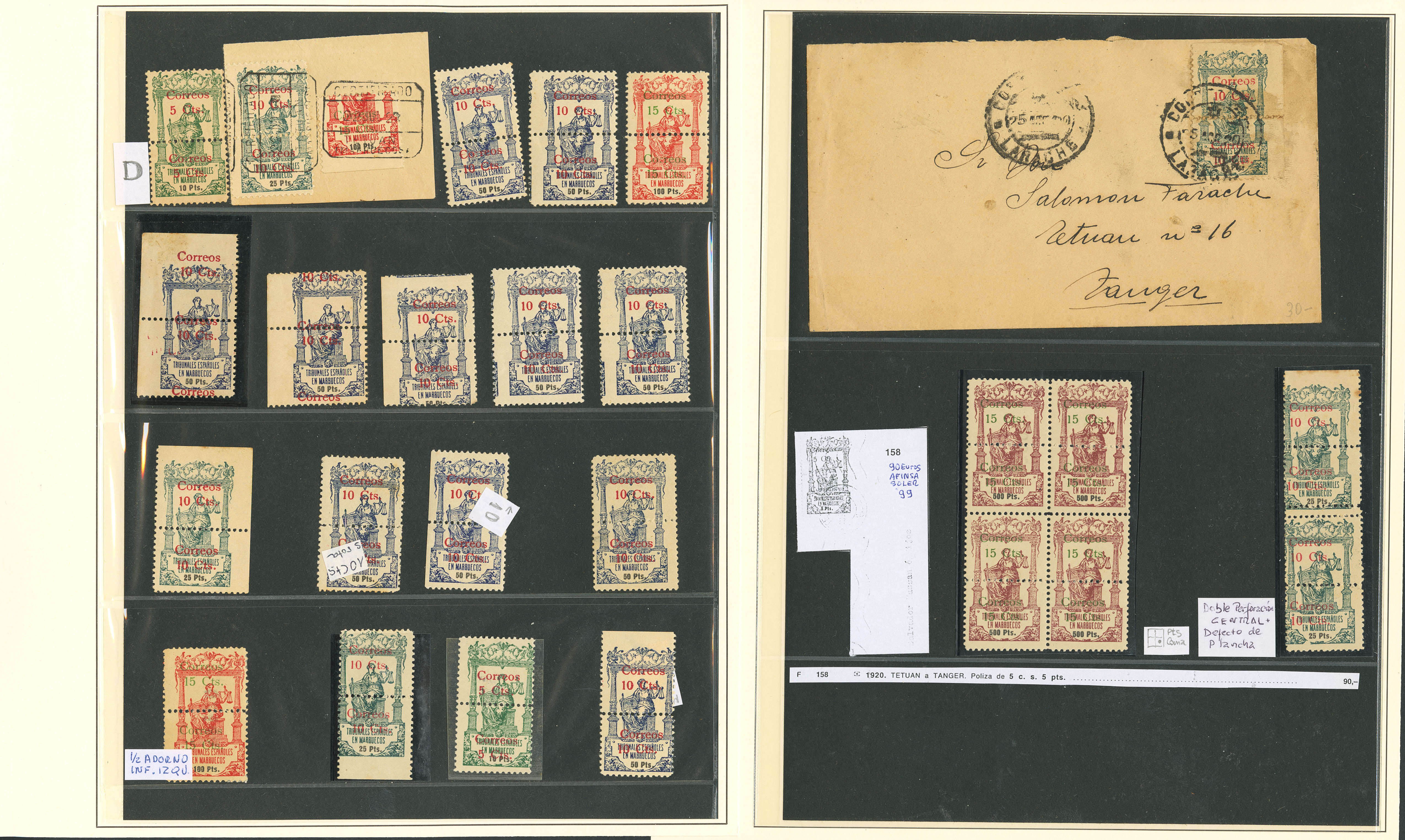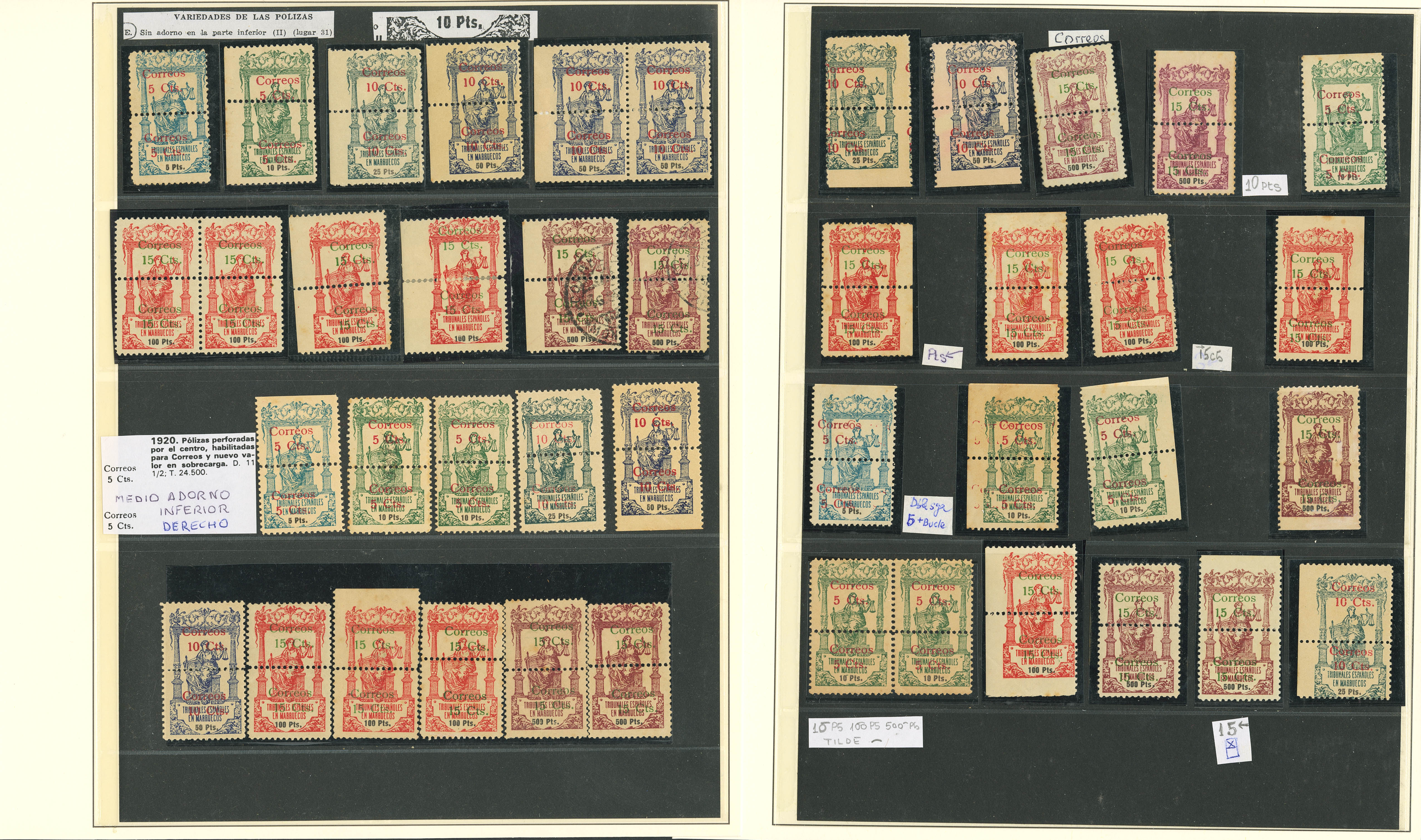(★)/1920. Interesantísimo conjunto de la emisión de Pólizas habilitadas para correo de 1920 incluyendo bloques, variedades de sobrecarga, de perforación y alguna carta, además de los cambios de color de sobrecarga y dos parejas sin dentado vertical del 5 cts sobre 10 pts verde. MAGNIFICO Y RARO CONJUNTO.