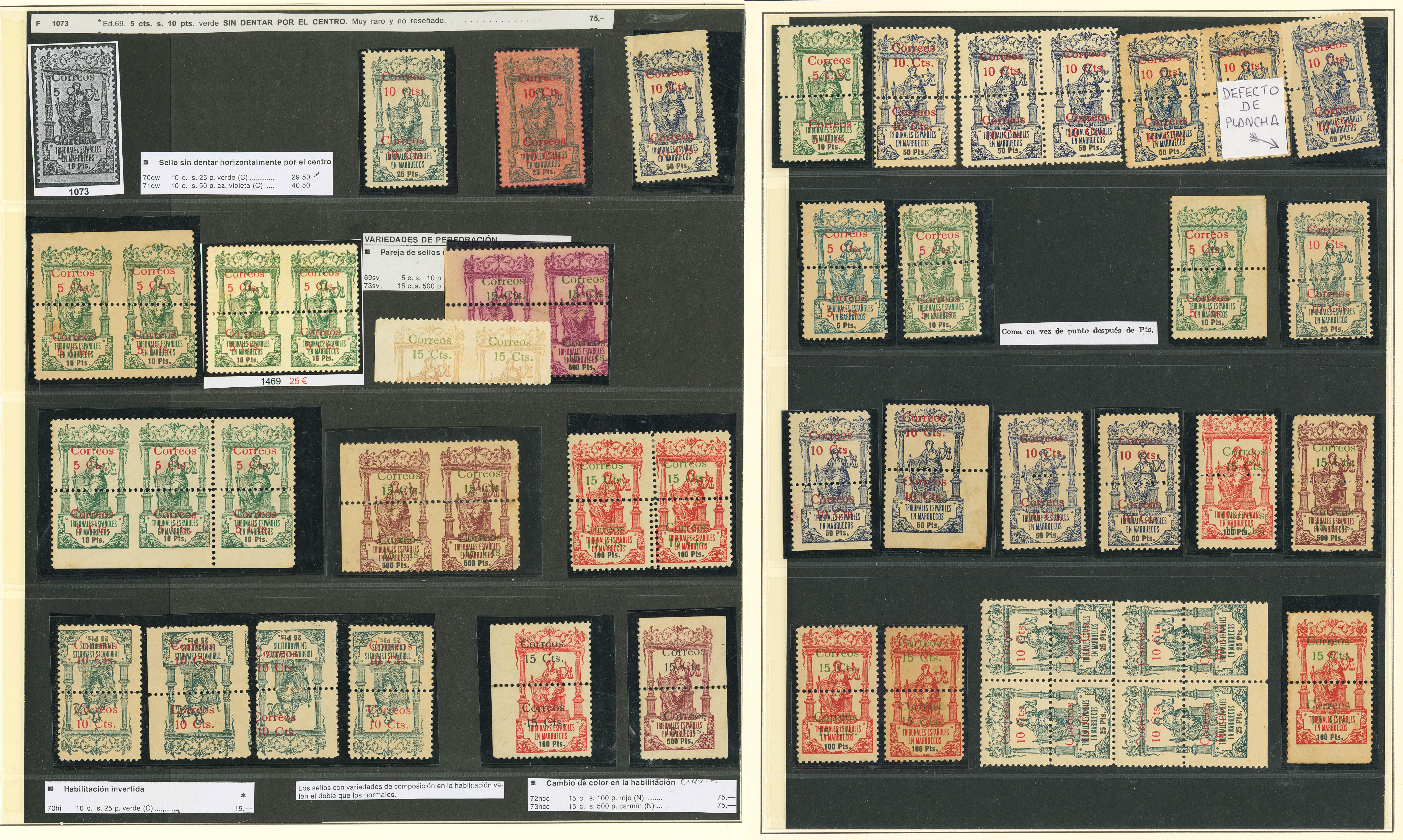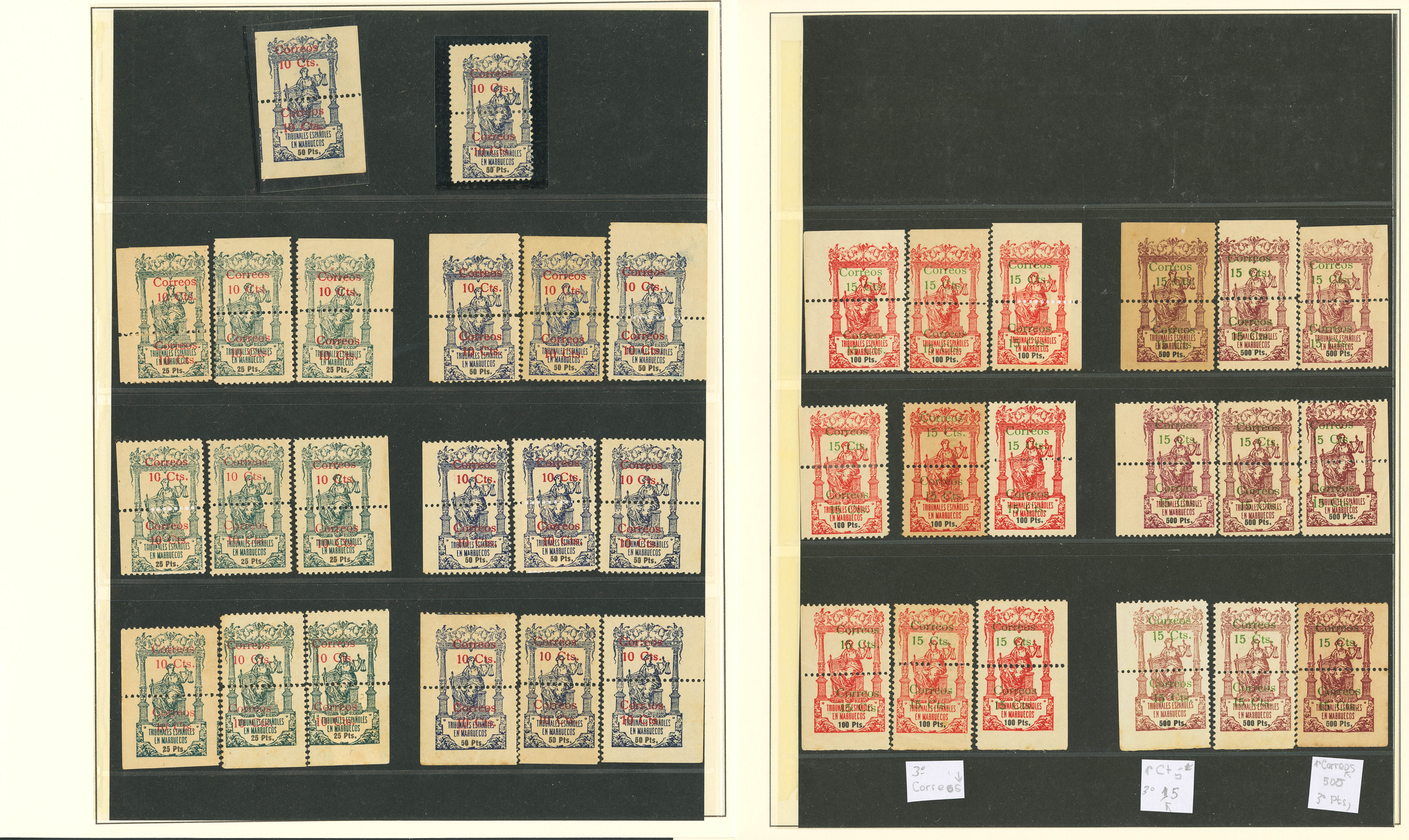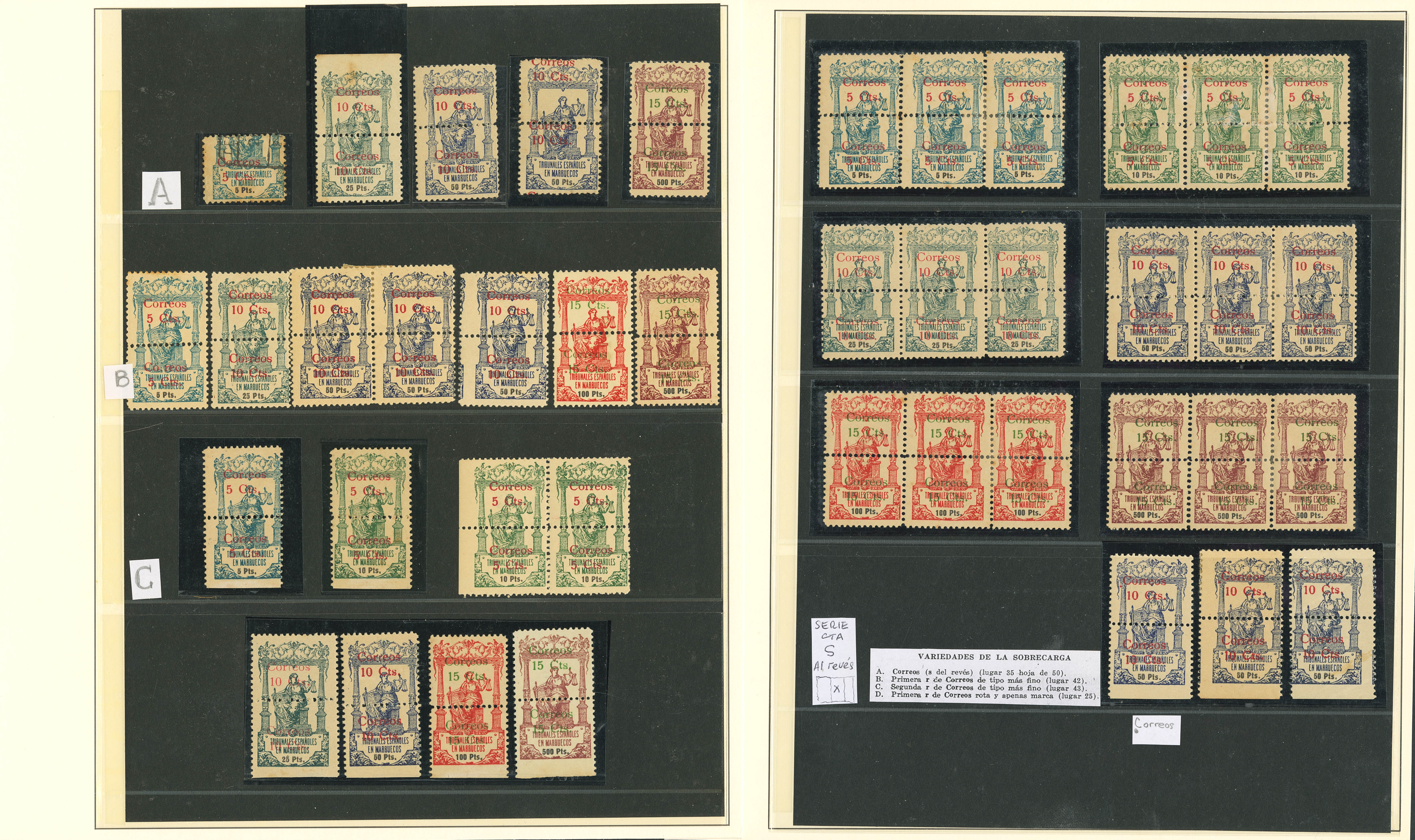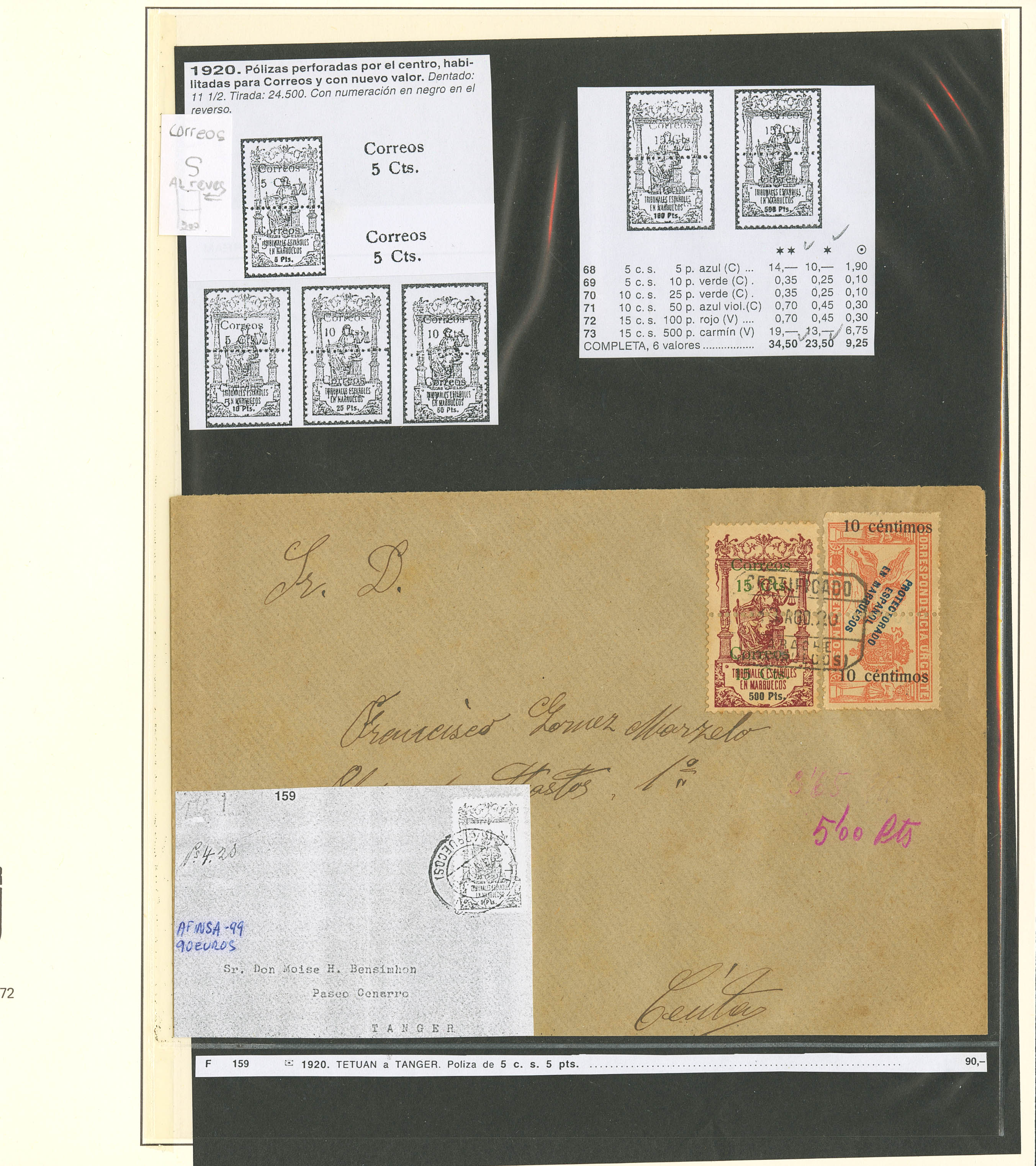 (★)/1920. Interesantísimo conjunto de la emisión de Pólizas habilitadas para correo de 1920 incluyendo bloques, variedades de sobrecarga, de perforación y alguna carta, además de los cambios de color de sobrecarga y dos parejas sin dentado vertical del 5 cts sobre 10 pts verde. MAGNIFICO Y RARO CONJUNTO.