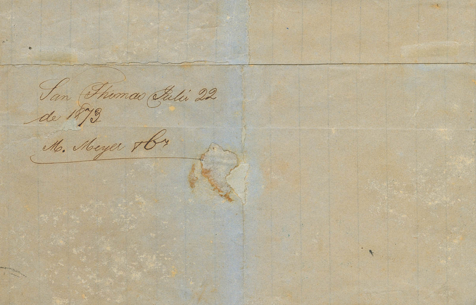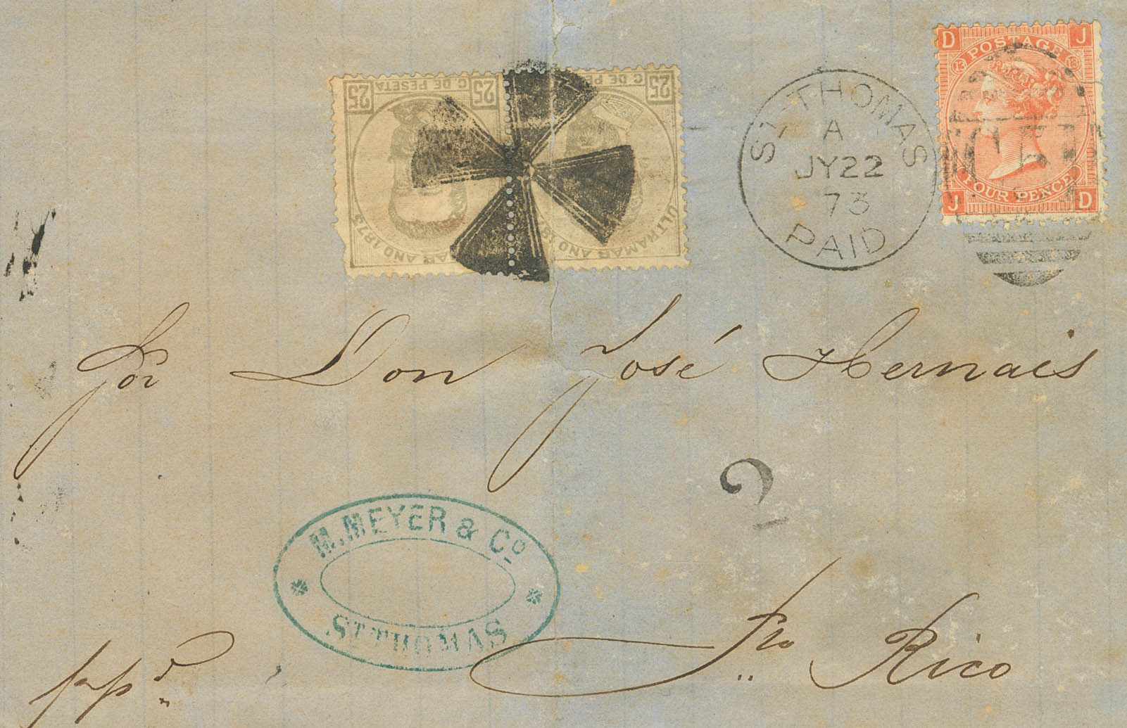 25(2). 1873. 25 cts gris, pareja y 4 p naranja. SAINT THOMAS a PUERTO RICO. Matasello numeral C51, de la oficina postal británica sobre el sello británico y sobre el sello de Puerto Rico matasello CRUZ DE ASPAS. MAGNIFICA Y EXTRAORDINARIAMENTE RARO FRANQUEO MIXTO PUERTO RICO-GRAN BRETAÑA. Cert. CEM.