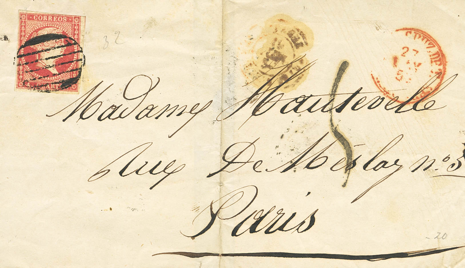 44. 1855. 4 cuartos rojo. SANTA CRUZ DE TENERIFE (CANARIAS) a PARIS. MAGNIFICA Y ESPECTACULAR FRANQUEO, ANTES DE ENTRAR EN VIGOR LA TARIFA DE 12 CUARTOS A FRANCIA, POSIBLEMENTE UNICA CARTA CONOCIDA CON ESTA CIRCUNSTANCIA DESDE LAS ISLAS CANARIAS, RECORDEMOS LA EXTREMA RAREZA DEL USO DEL 4 CUARTOS EN CANARIAS, PIEZA DE ENORME IMPORTANCIA.