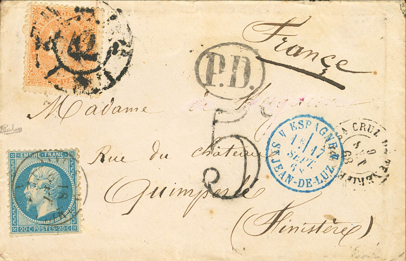 89A. 1867. 12 cuartos naranja y 20 cts azul, sello francés (en nuestra opinión el sello fue añadido en origen para reforzar el franqueo, el correo español no lo reconoció y a la llegada a Francia fue inutilizado). SANTA CRUZ DE TENERIFE a QUIMPERLE (FRANCIA). MAGNIFICO Y RARISIMO FRANQUEO MIXTO ESPAÑA-FRANCIA.