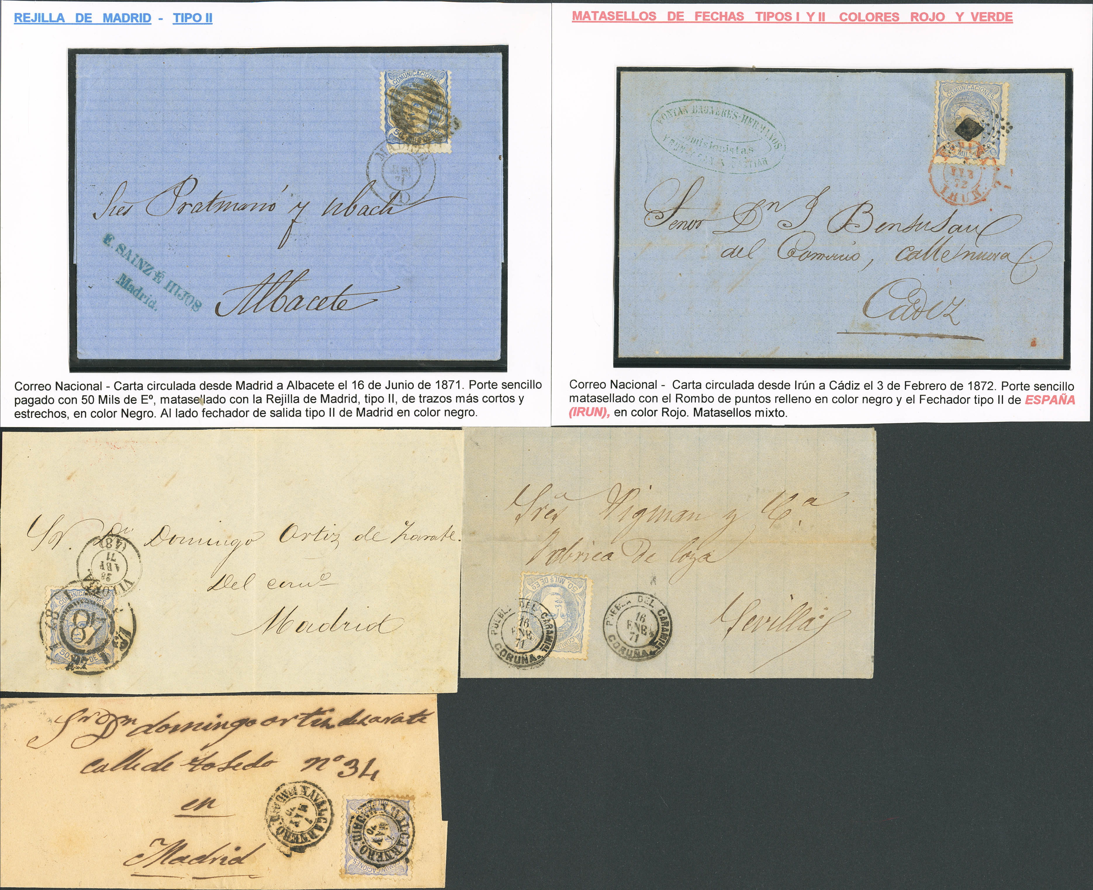107(5). (1870ca). Conjunto de cuatro cartas y un frontal franqueadas con el 50 mils ultramar de 1870, todas con matasellos inusuales. A EXAMINAR.