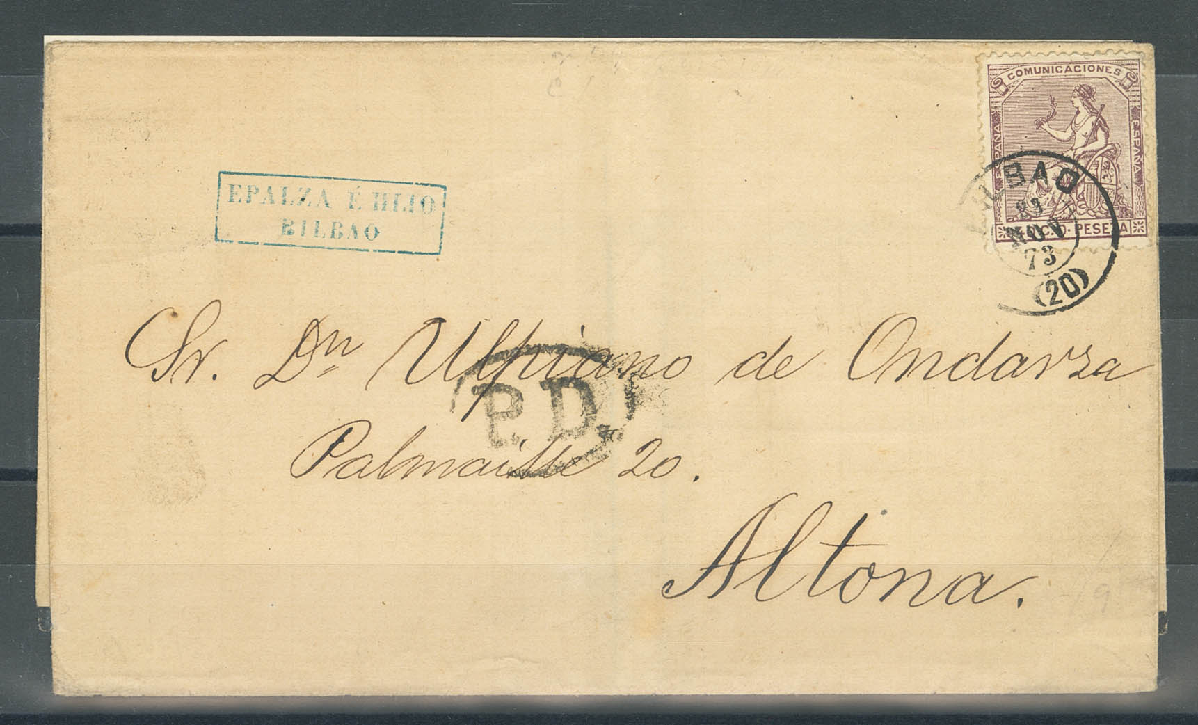 136. 1873. (23 de Noviembre). 40 cts castaño. BILBAO a ALTONA (ALEMANIA). Matasello BILBAO / (20), circulada durante el Sitio de Bilbao, al no llevar estampada la marca POR VAPOR, se retrasó su entrega hasta Enero de 1874, franqueada con la tarifa de 40 cts, según convenio con Alemania de Octubre de 1872. MAGNIFICA Y UNICA CONOCIDA DEL SITIO DE BILBAO DIRIGIDA A DINAMARCA, SIN DUDA UNA DE LAS PIEZAS CUMBRES DE ESTE PERIODO.